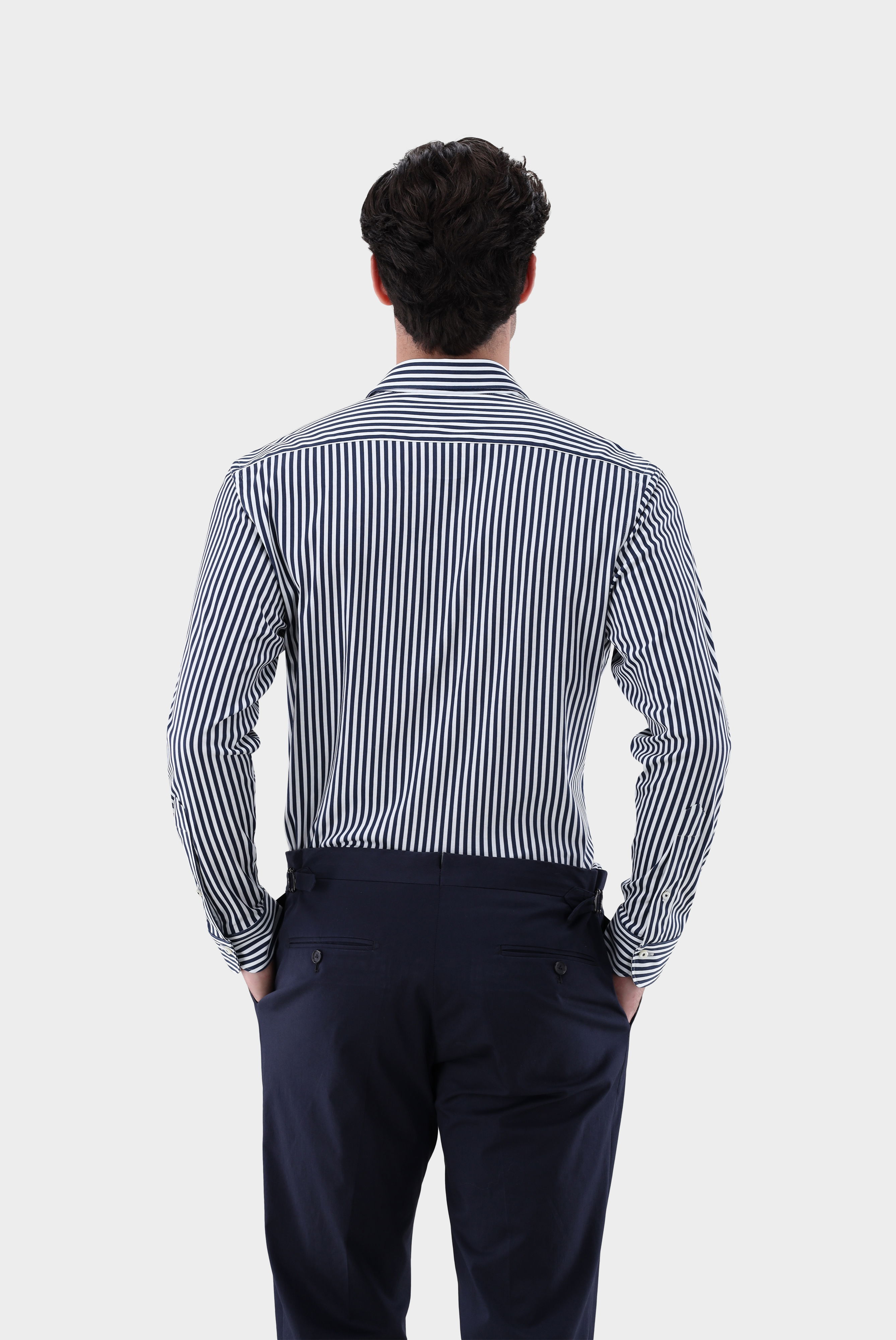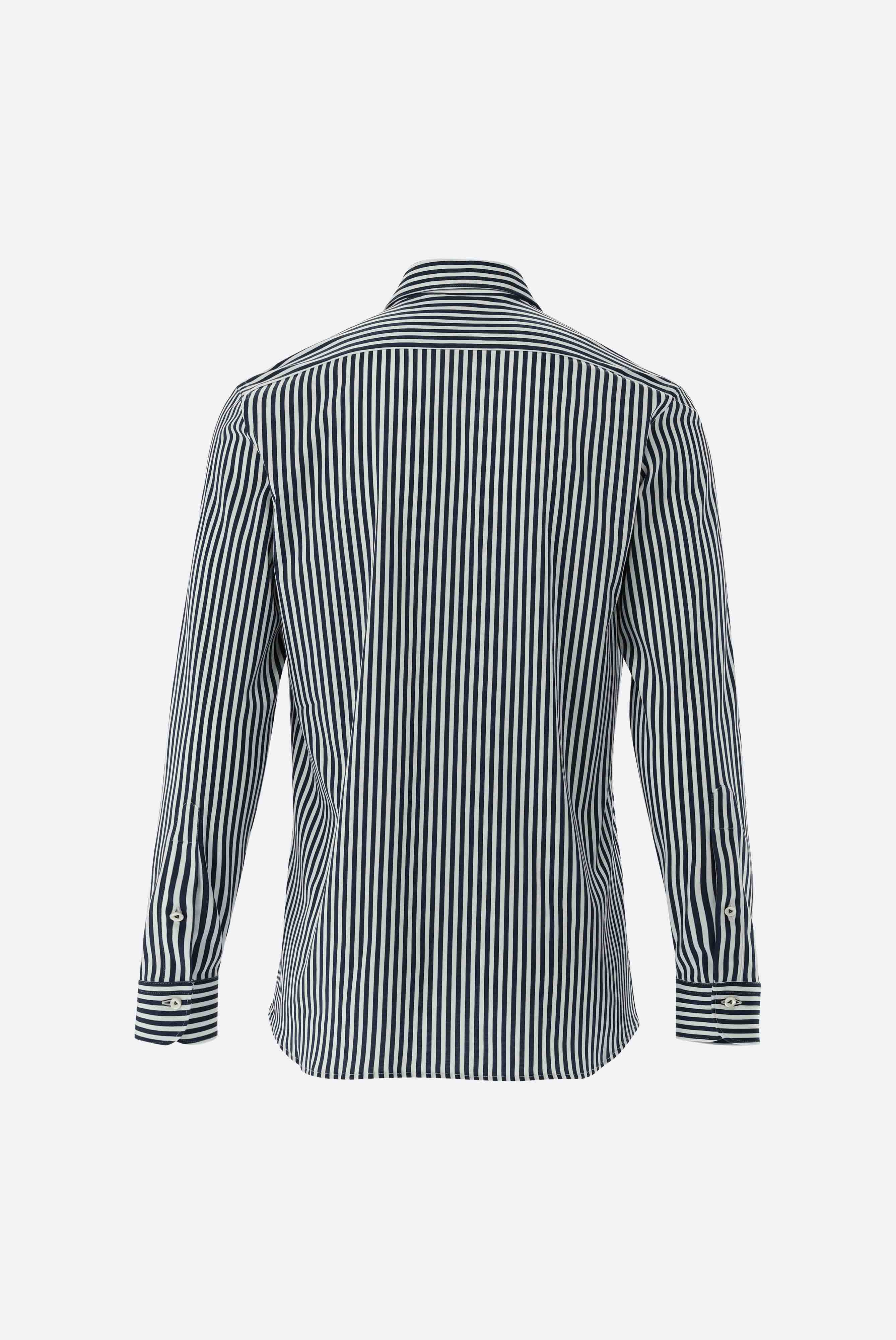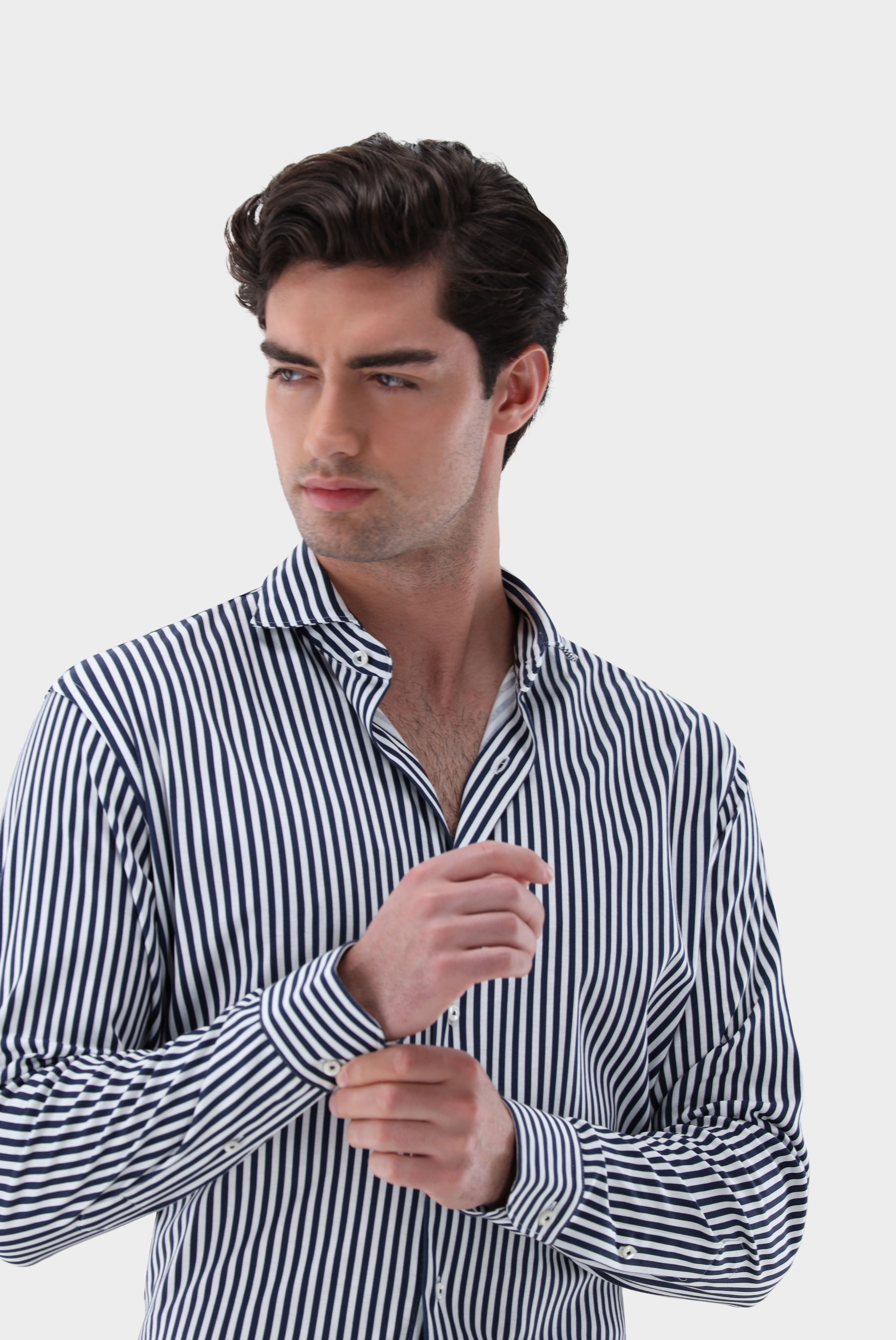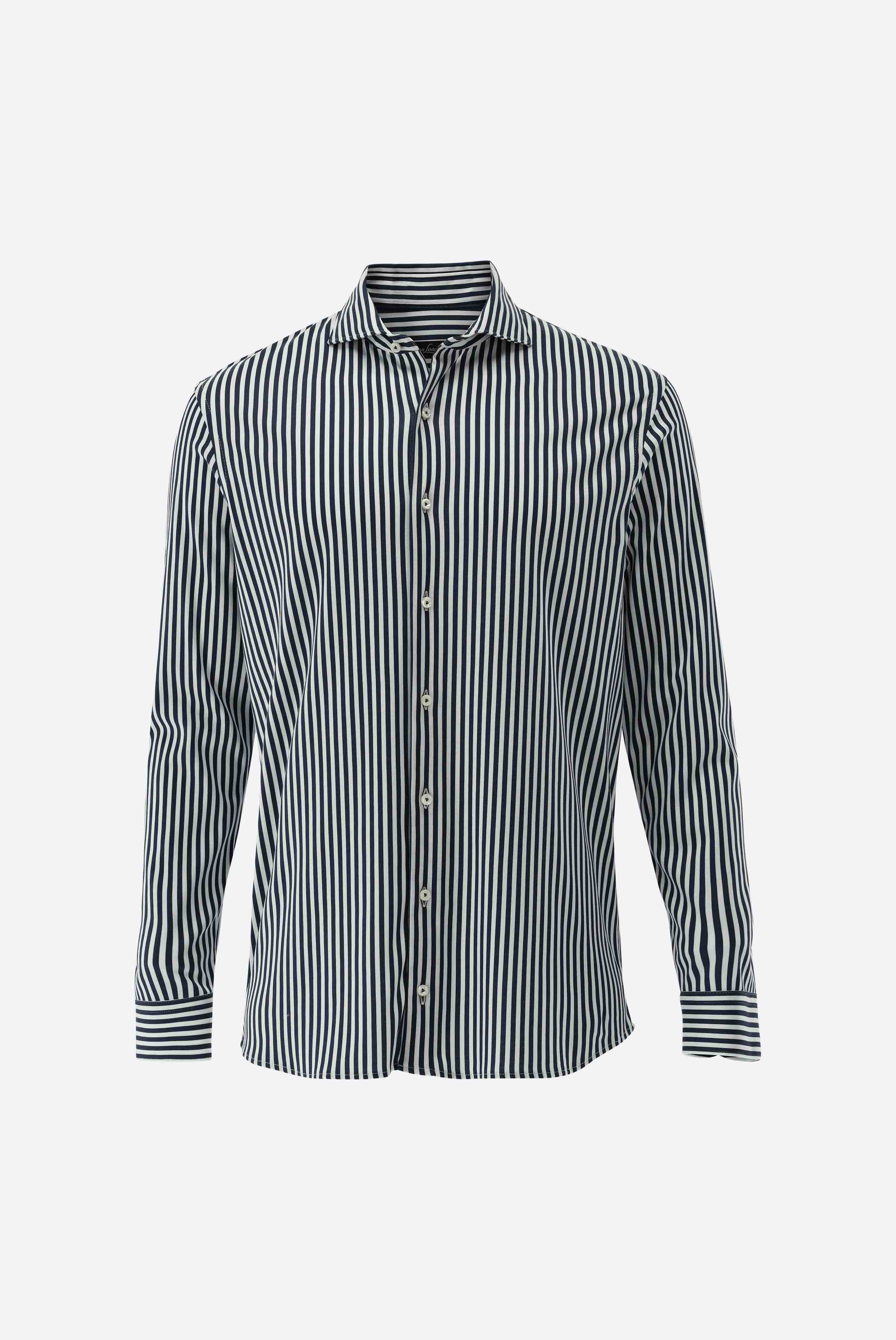 Das Jerseyhemd aus hochwertiger Schweizer Baumwolle überzeugt mit einem auffälligen Streifendruck und einem modernen Haifischkragen. Die weiche, atmungsaktive Jersey-Qualität sorgt für ein angenehmes Tragegefühl, während das schlichte, aber stilvolle Design das Hemd zu einem vielseitigen Begleiter für Freizeit- und Businessoutfits macht.