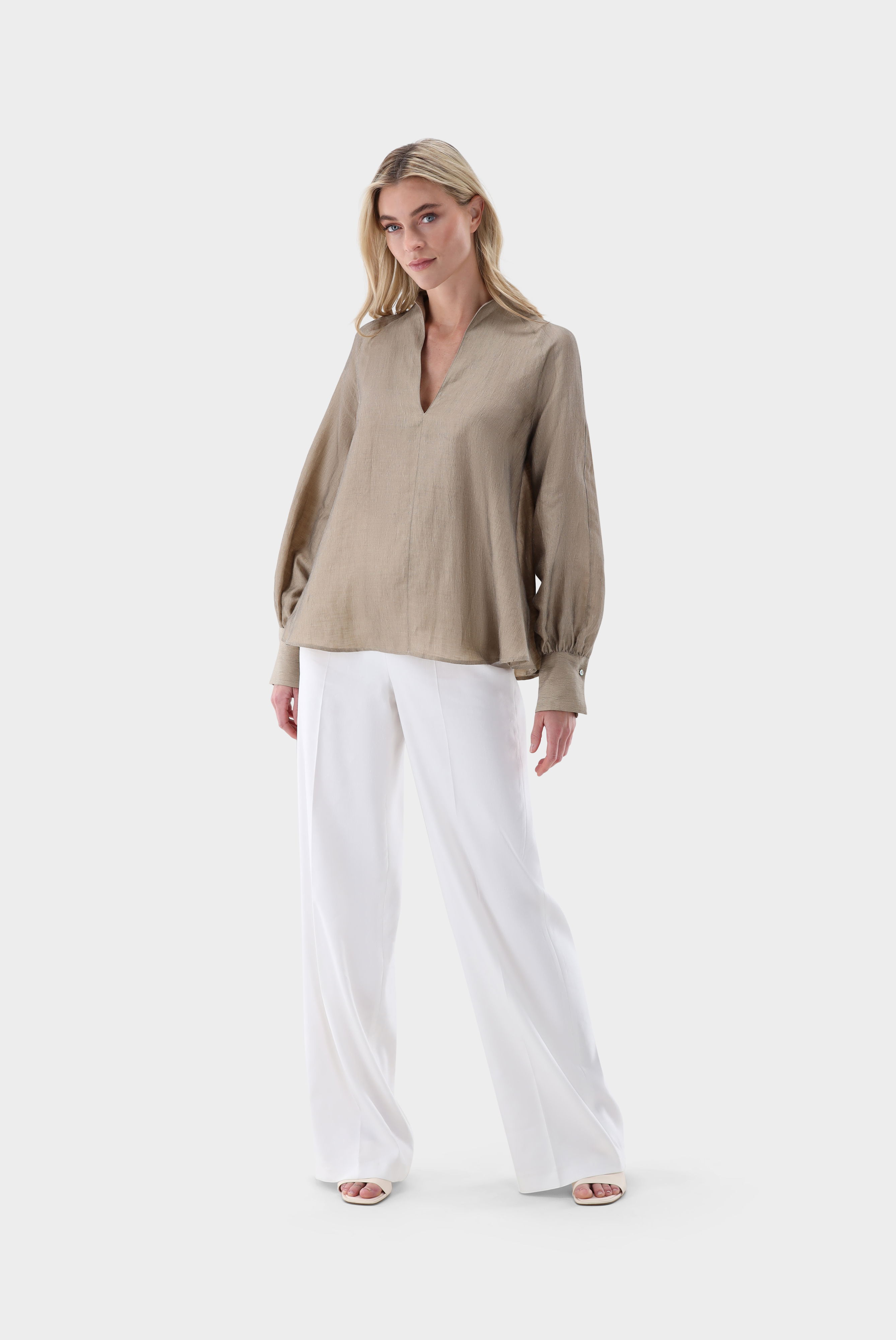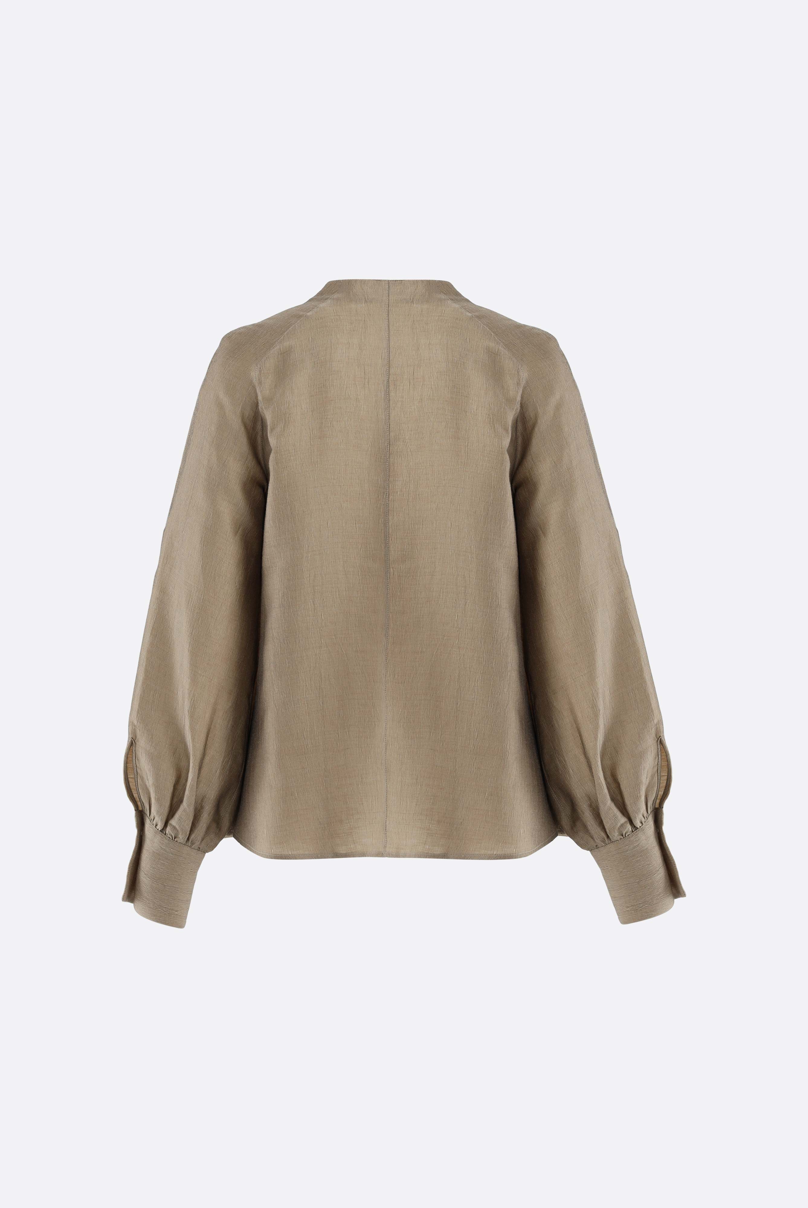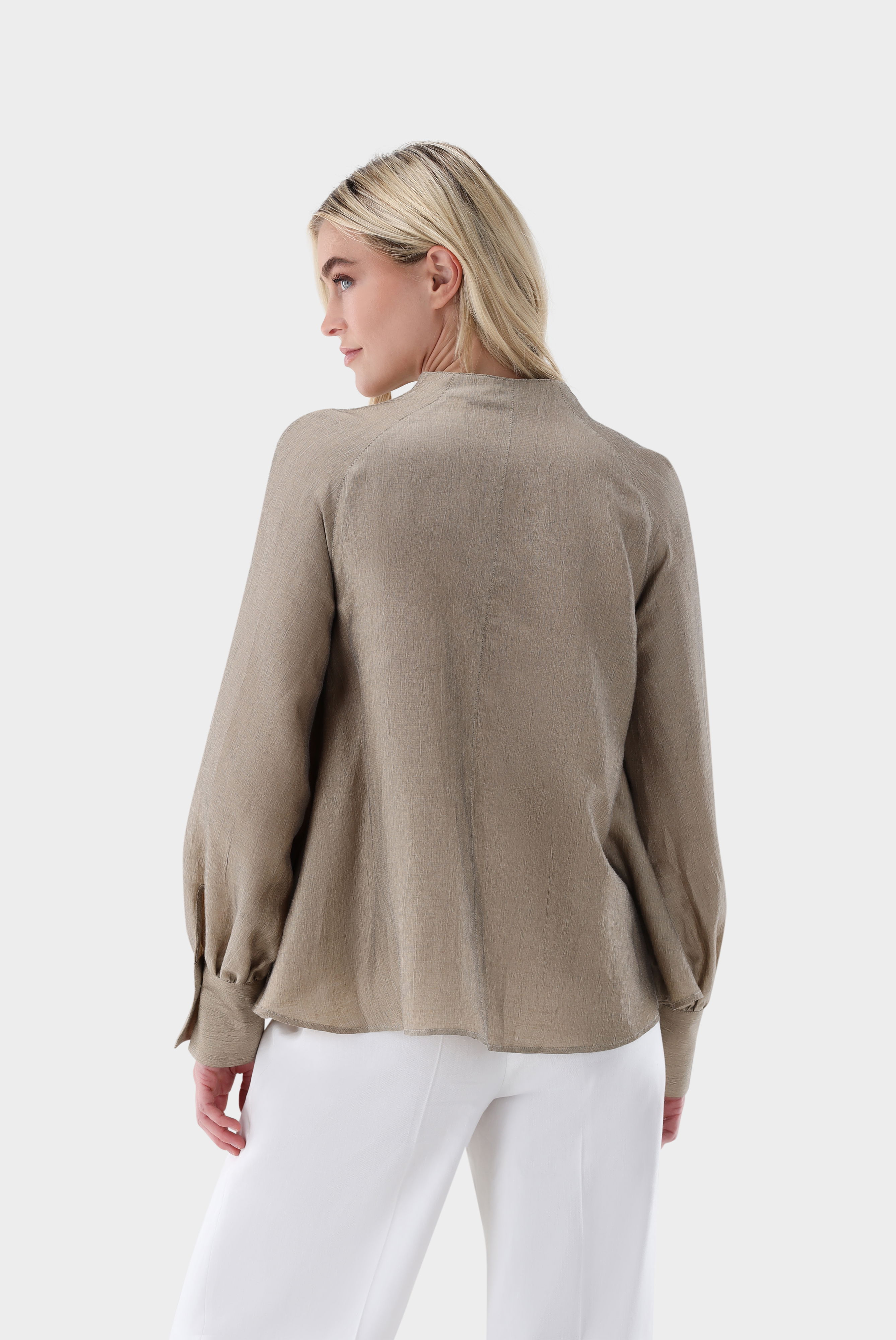 Diese A-Linien-Bluse überzeugt durch ihre lockere, feminine Silhouette und stilvolle Details. Der Cup-Kragen und lange Raglanärmel, die an den Bündchen für Volumen gerafft sind, verleihen dem Modell elegante Struktur. Praktische Seitentaschen ergänzen die Funktionalität, während die hochwertige Mischung mit Leinen für angenehme Haptik und hohen Tragekomfort sorgt. Vielseitig kombinierbar für Casual- und Smart-Casual-Looks.