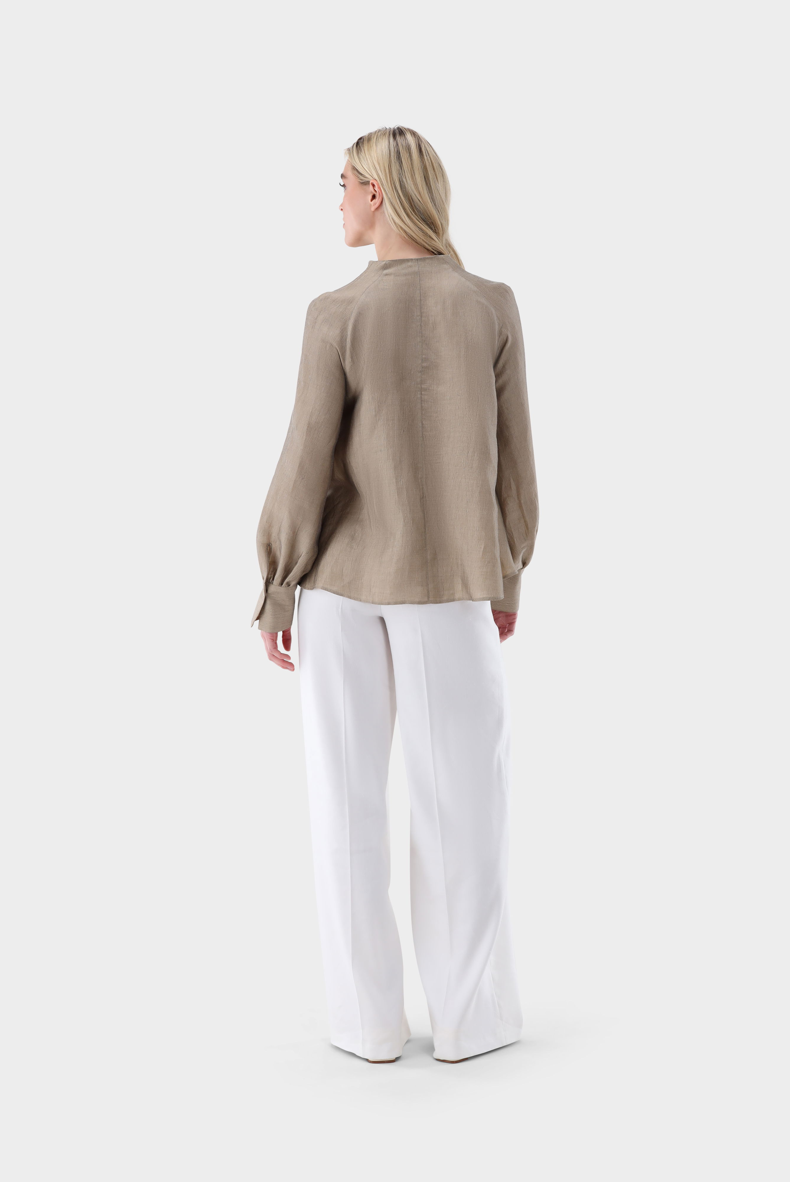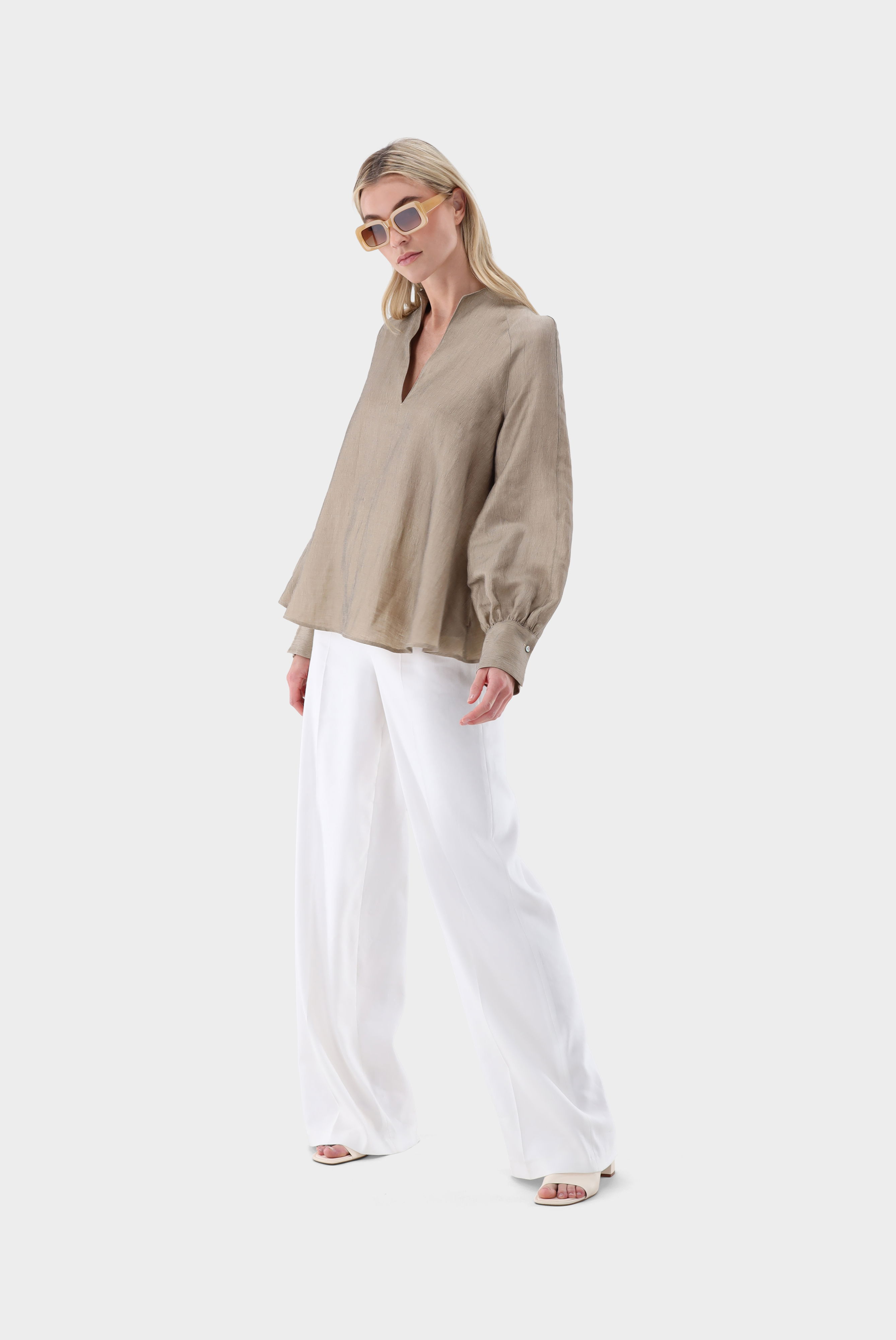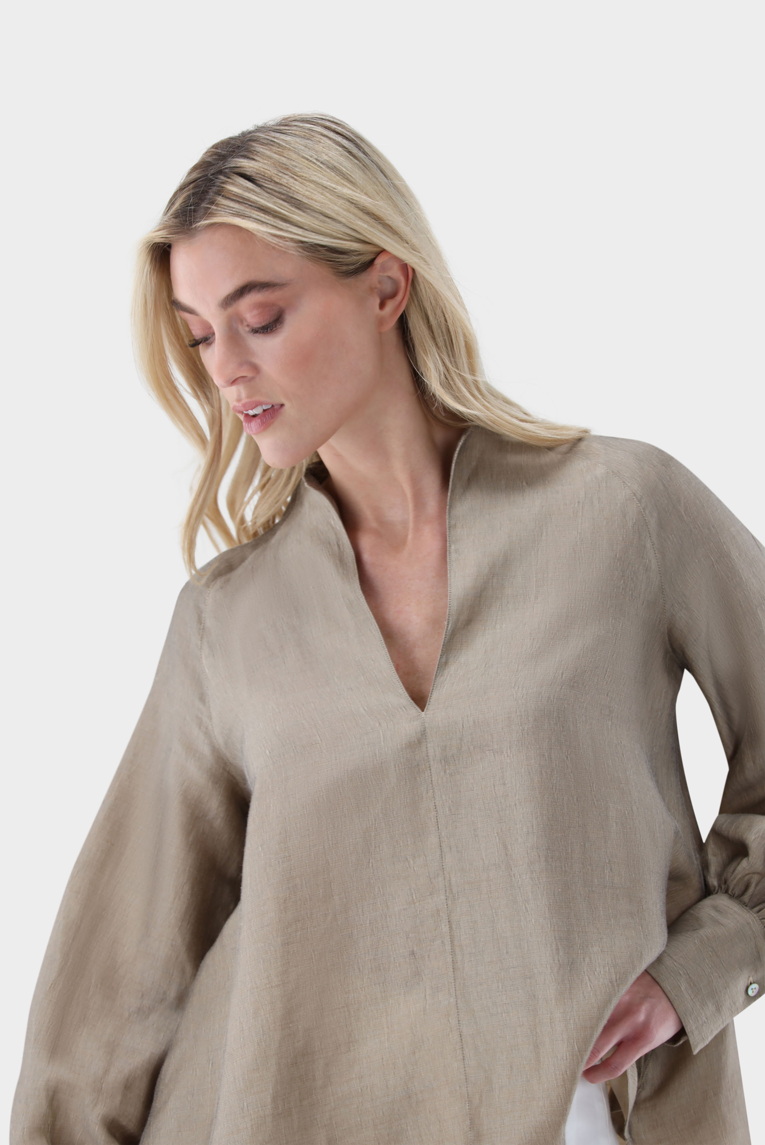 Diese A-Linien-Bluse überzeugt durch ihre lockere, feminine Silhouette und stilvolle Details. Der Cup-Kragen und lange Raglanärmel, die an den Bündchen für Volumen gerafft sind, verleihen dem Modell elegante Struktur. Praktische Seitentaschen ergänzen die Funktionalität, während die hochwertige Mischung mit Leinen für angenehme Haptik und hohen Tragekomfort sorgt. Vielseitig kombinierbar für Casual- und Smart-Casual-Looks.