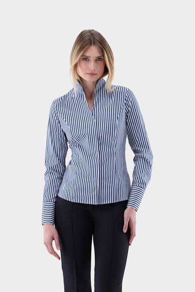 Charmante Kelchkragenbluse mit klassischem Streifendesign, die Eleganz und Raffinesse vereint.