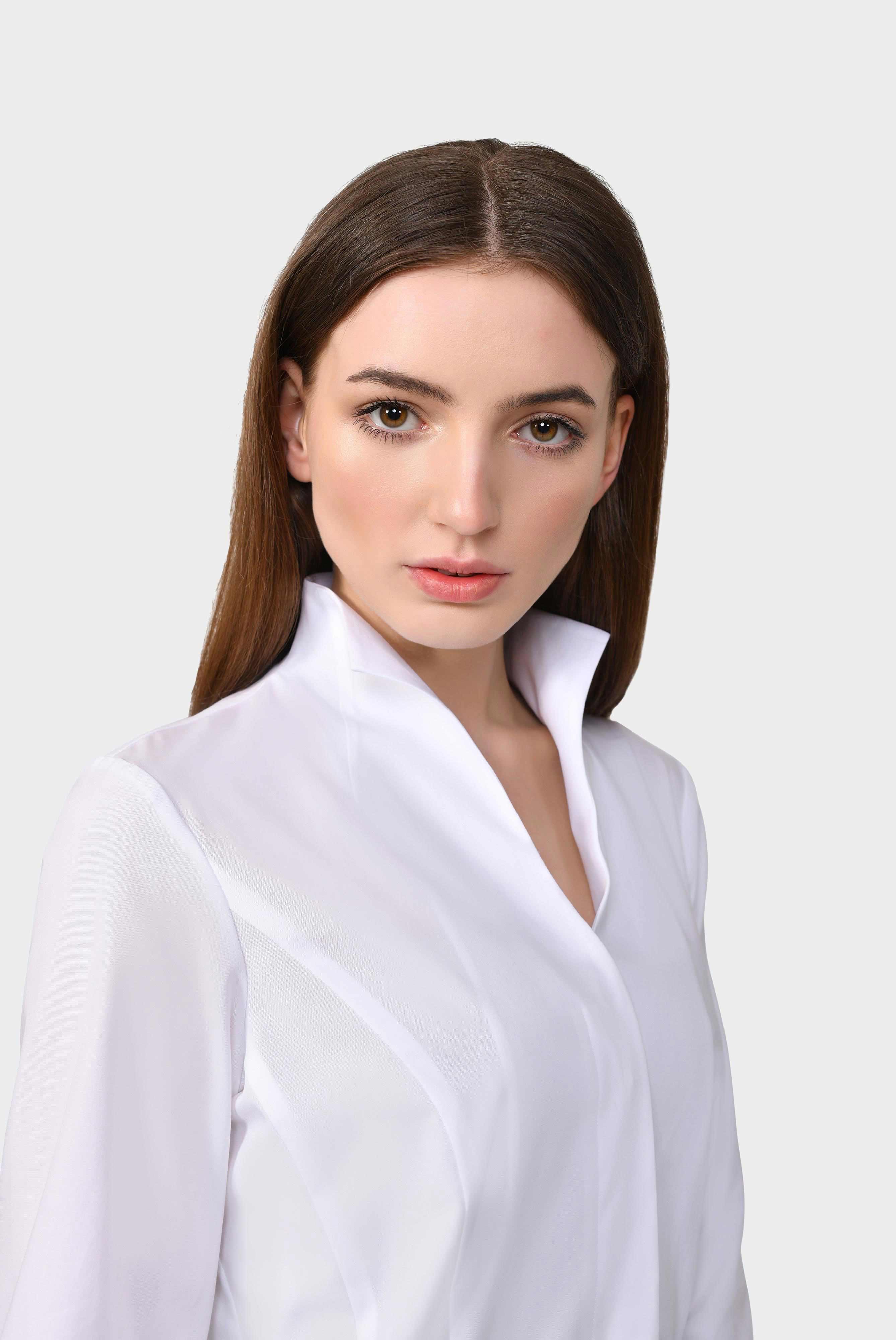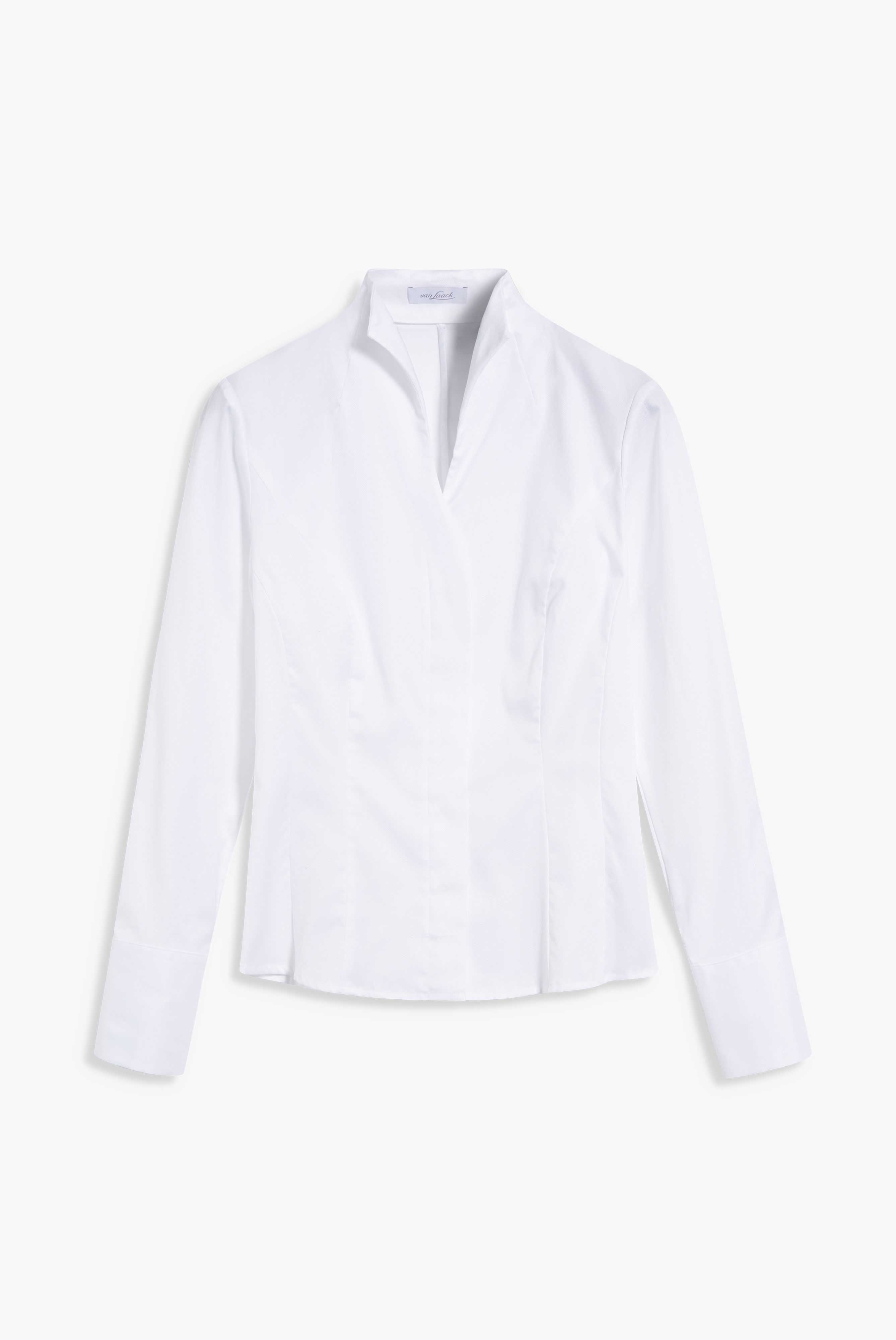 Diese Kelchkragenbluse aus Baumwolle mit Elasthan bietet Komfort und Stil zugleich. Mit verdeckter Knopfleiste und gerader Manschette verleiht sie Ihrem Outfit eine elegante Note.