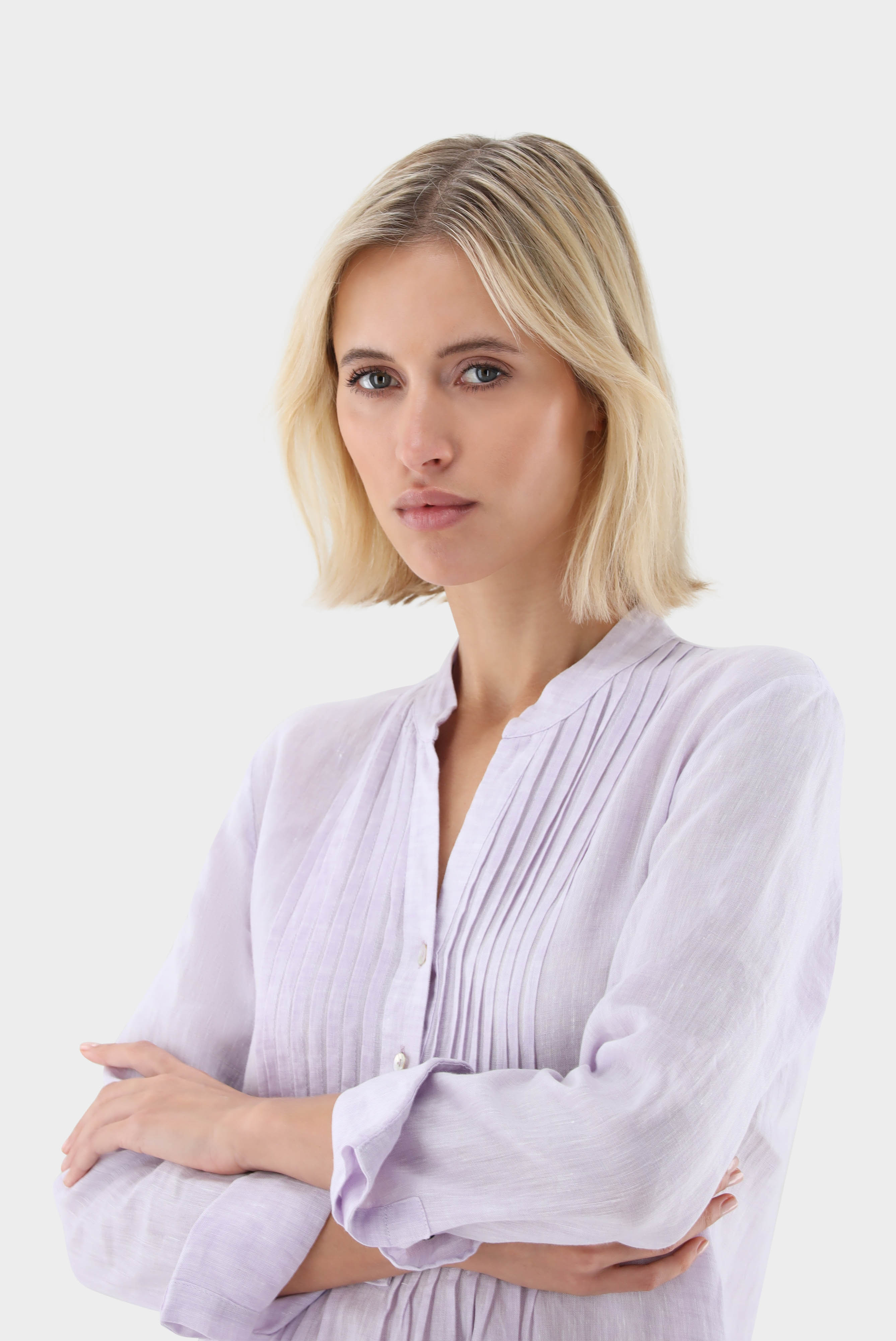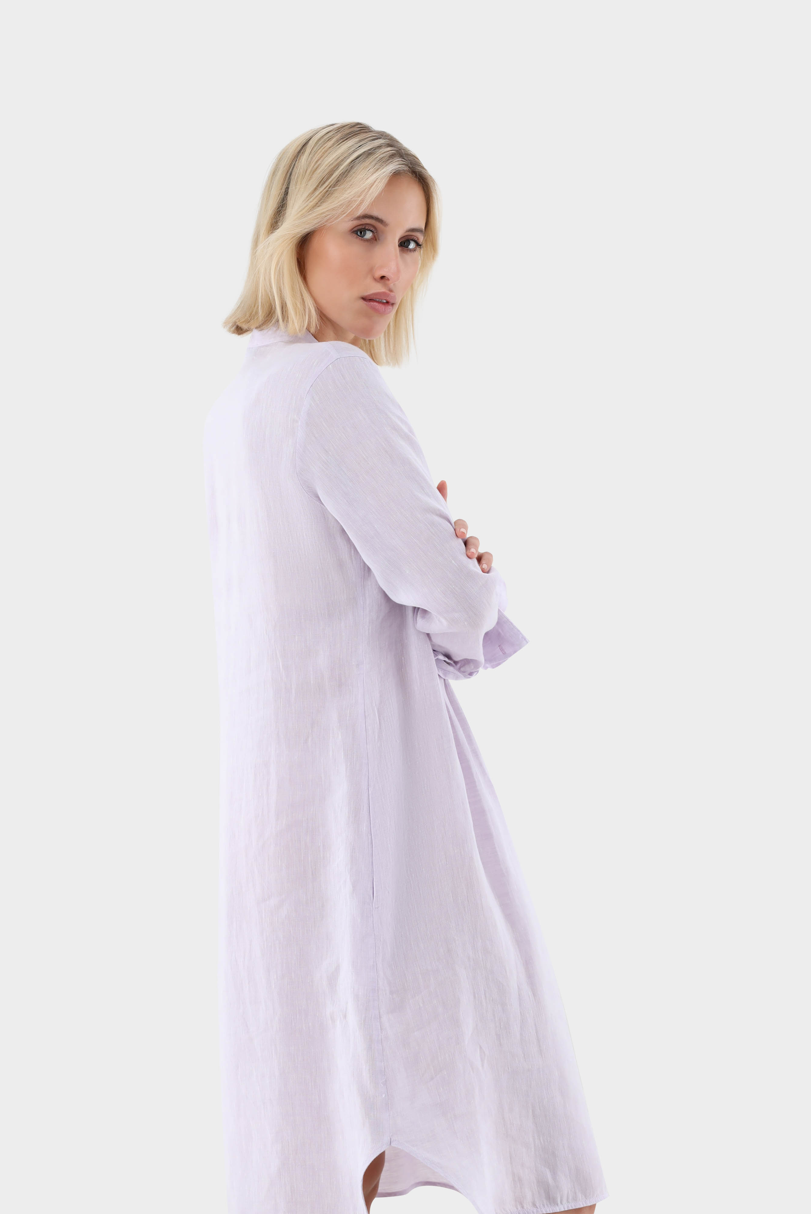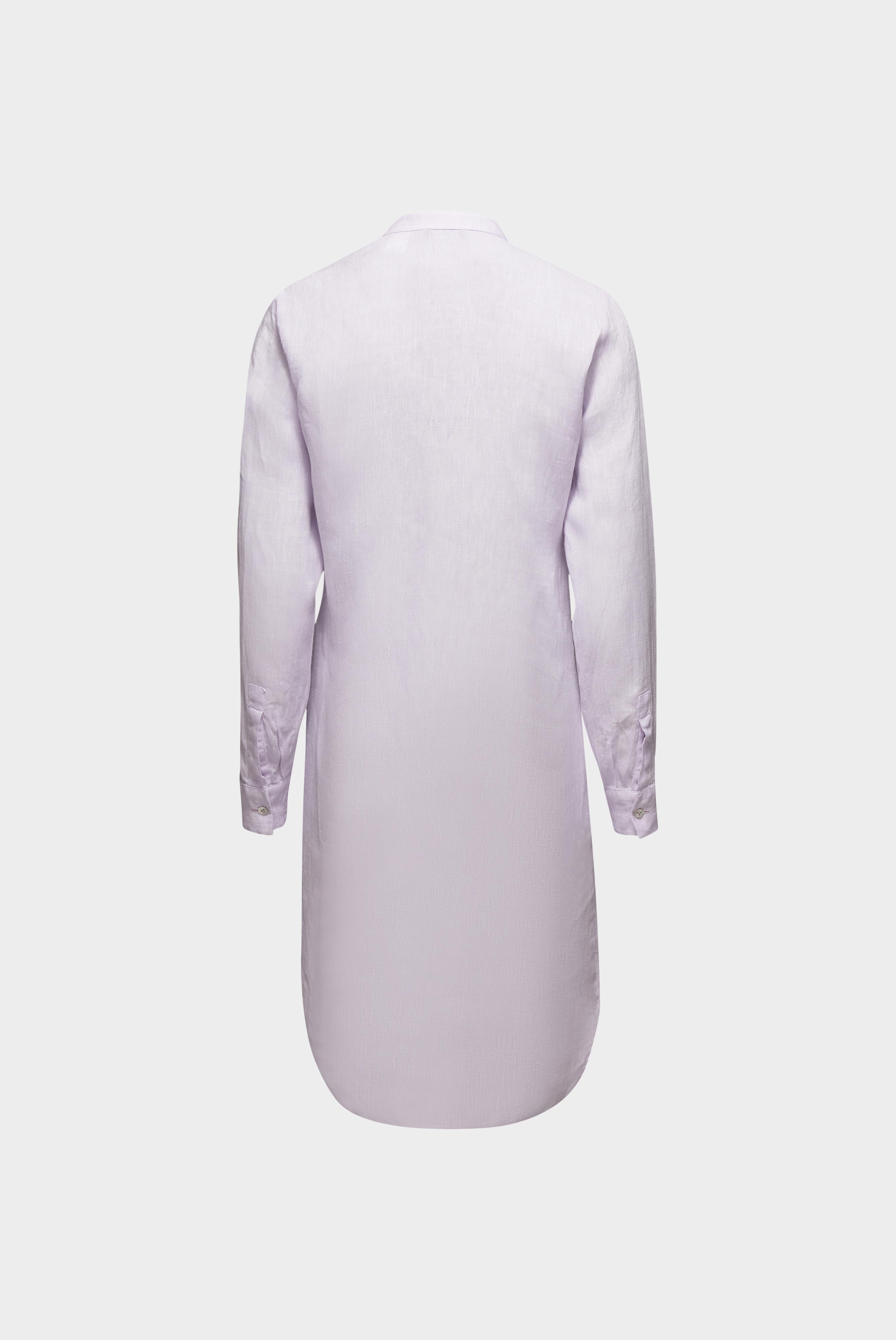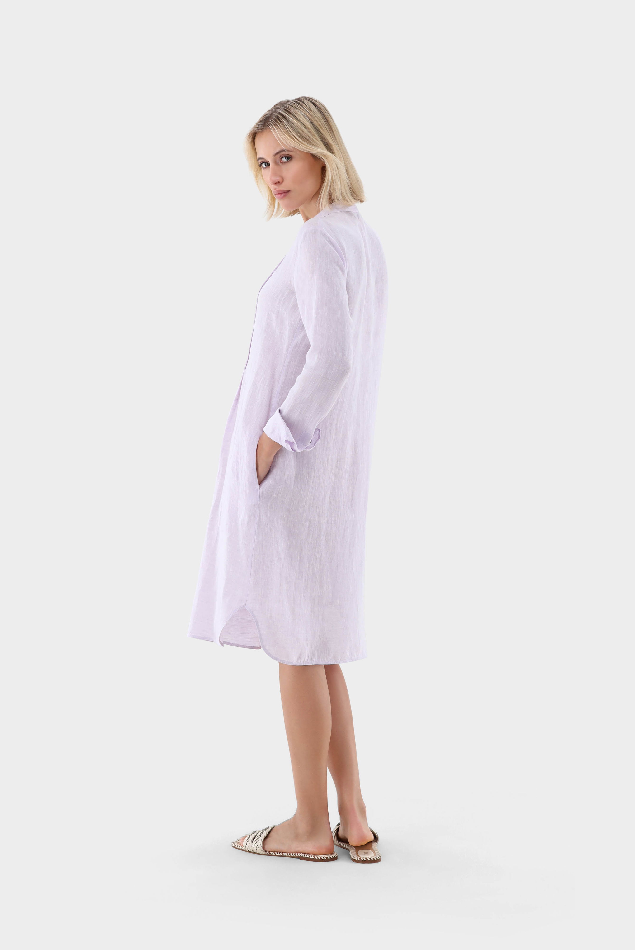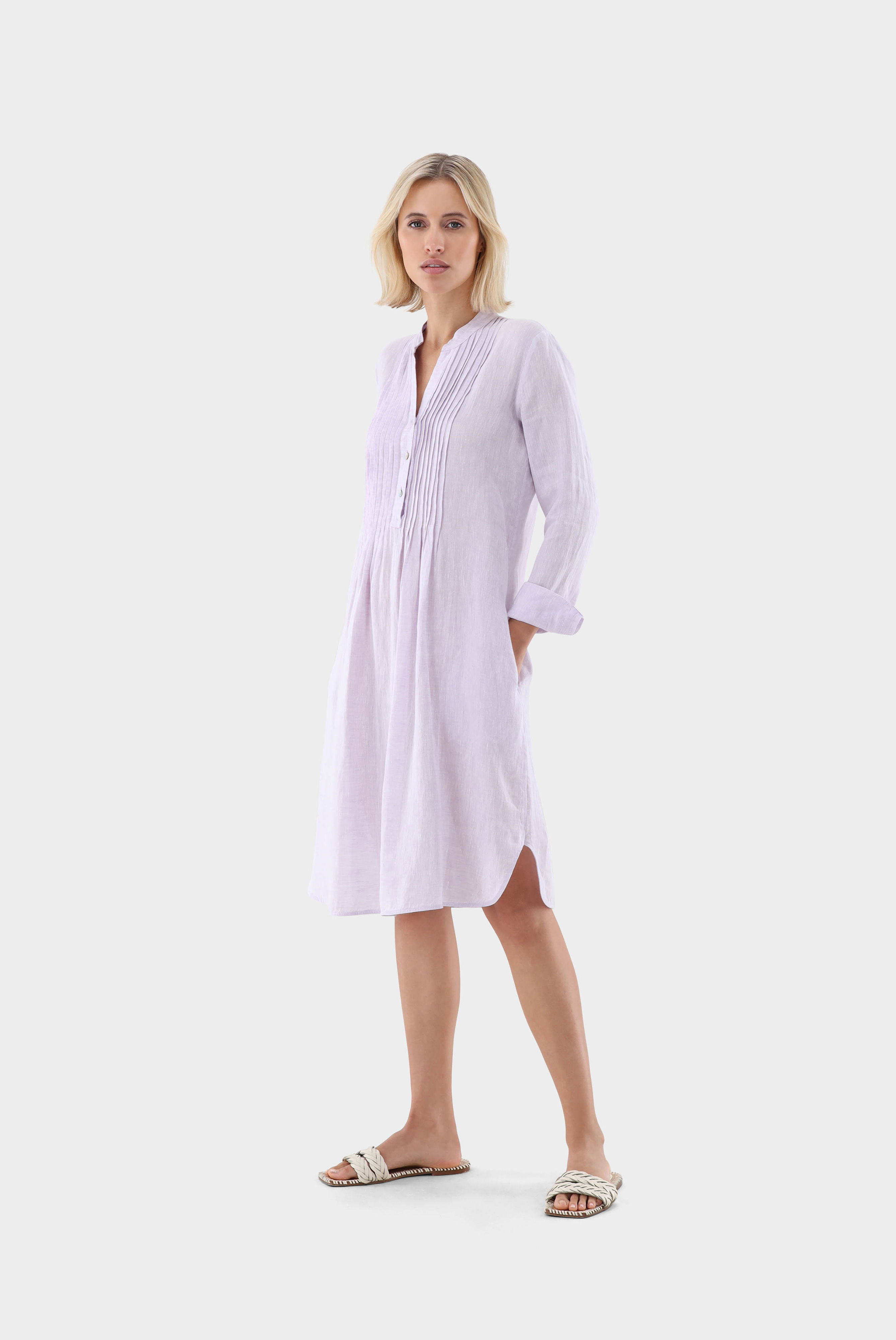 Das knielange Tunika-Kleid mit halblangen Ärmeln, einem flachen Stehkragen, und aus garngefärbtem Leinen bietet einen lässigen Look. Das garngefärbte Leinen wird vor dem Weben des Stoffes gefärbt, und in Kombination mit weißem Garn entsteht ein Melangeeffekt. Das Kleid hat Biesen auf beiden Seiten neben der Leiste, Seitennahttaschen und wird im Fertigteil gewaschen, um eine entspannte Optik zu erreichen. Es wird mit Perlmutt Knöpfen geschlossen.