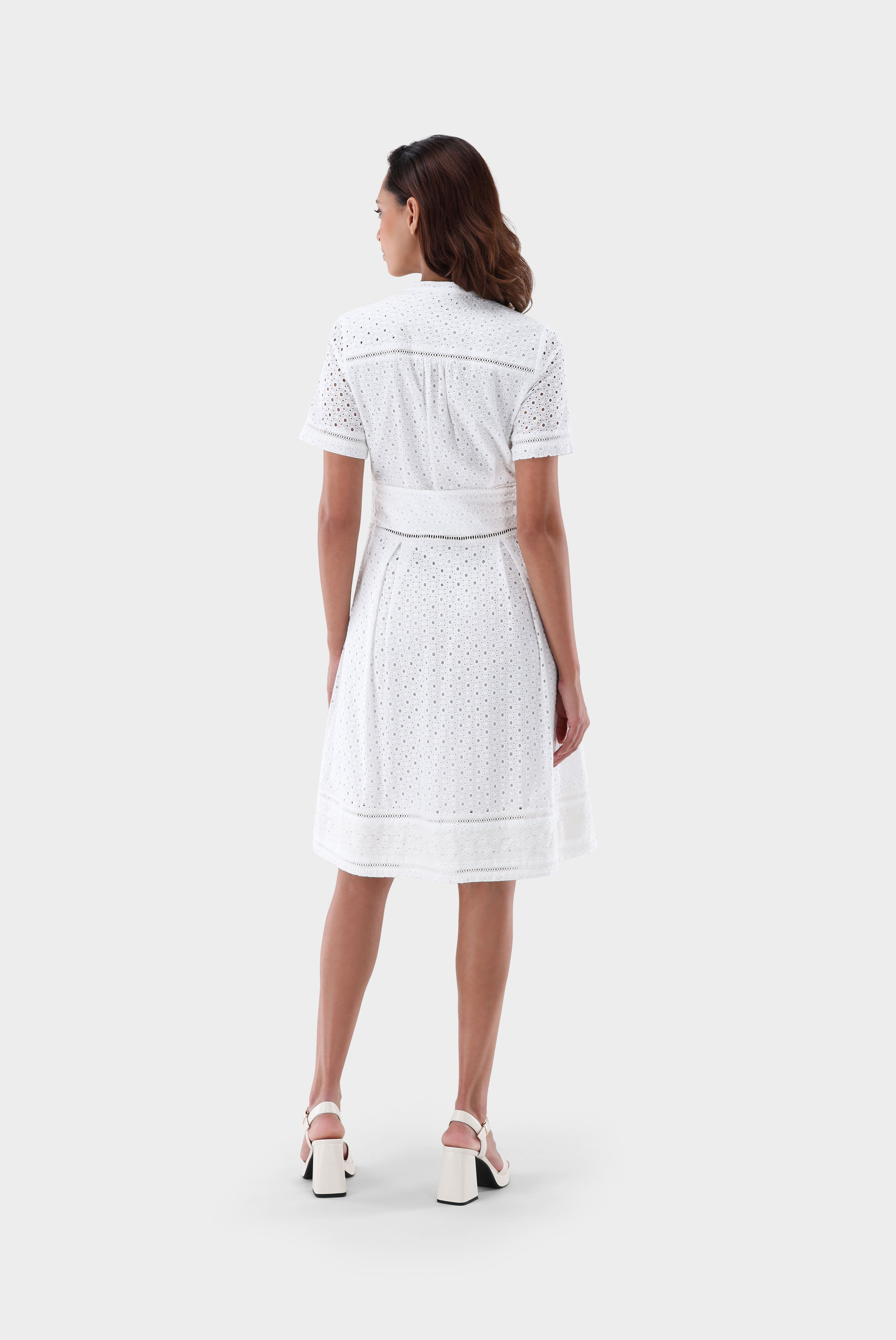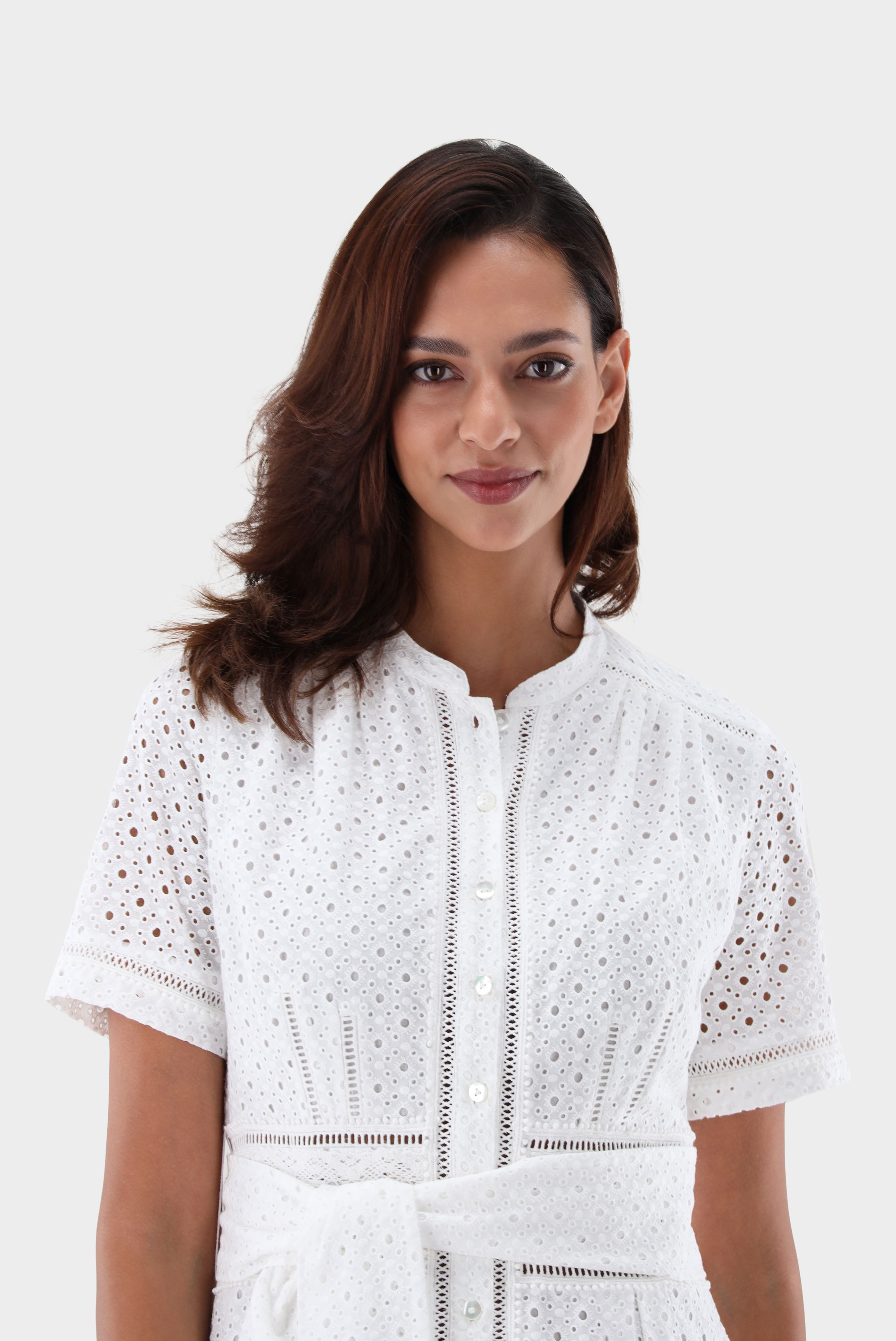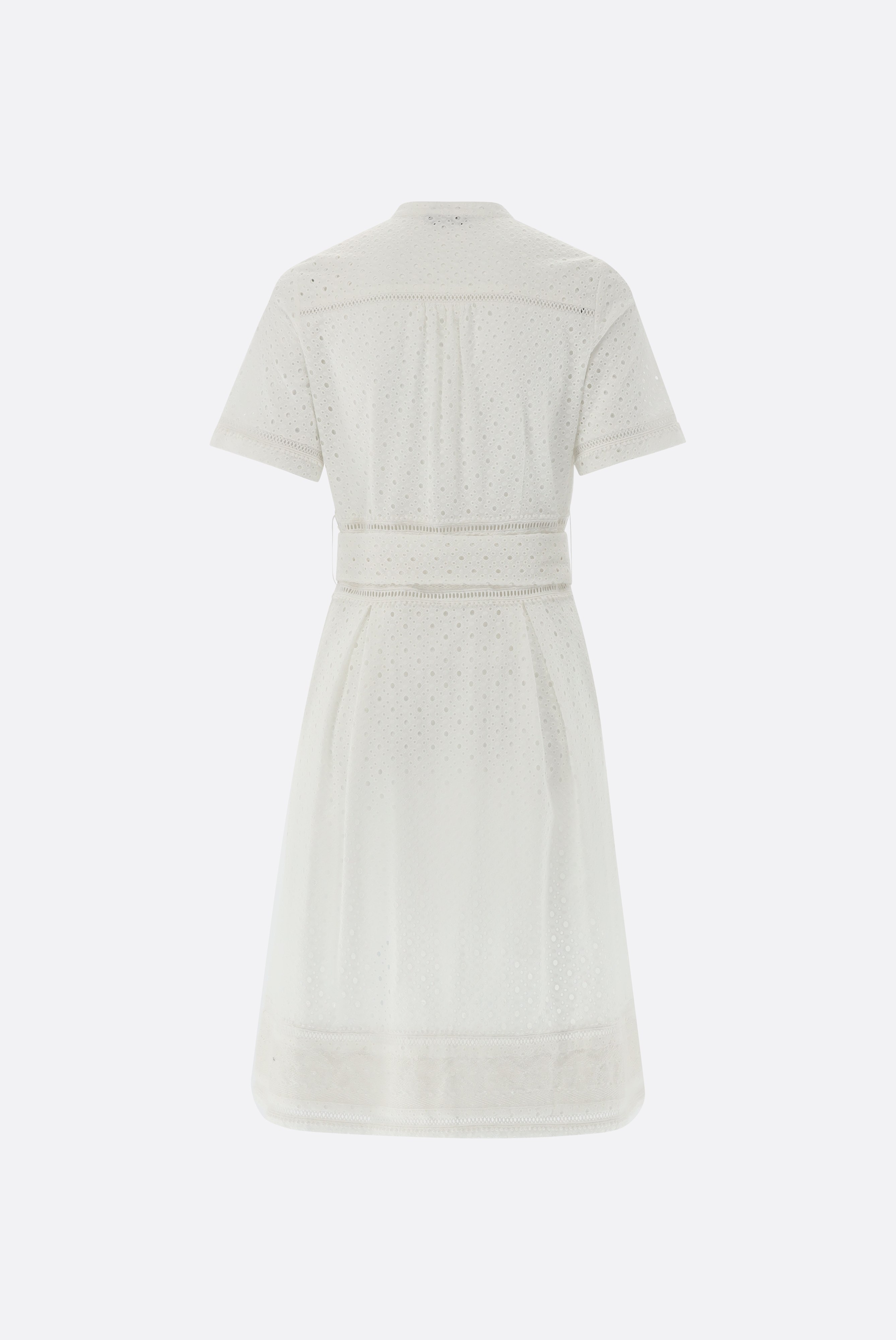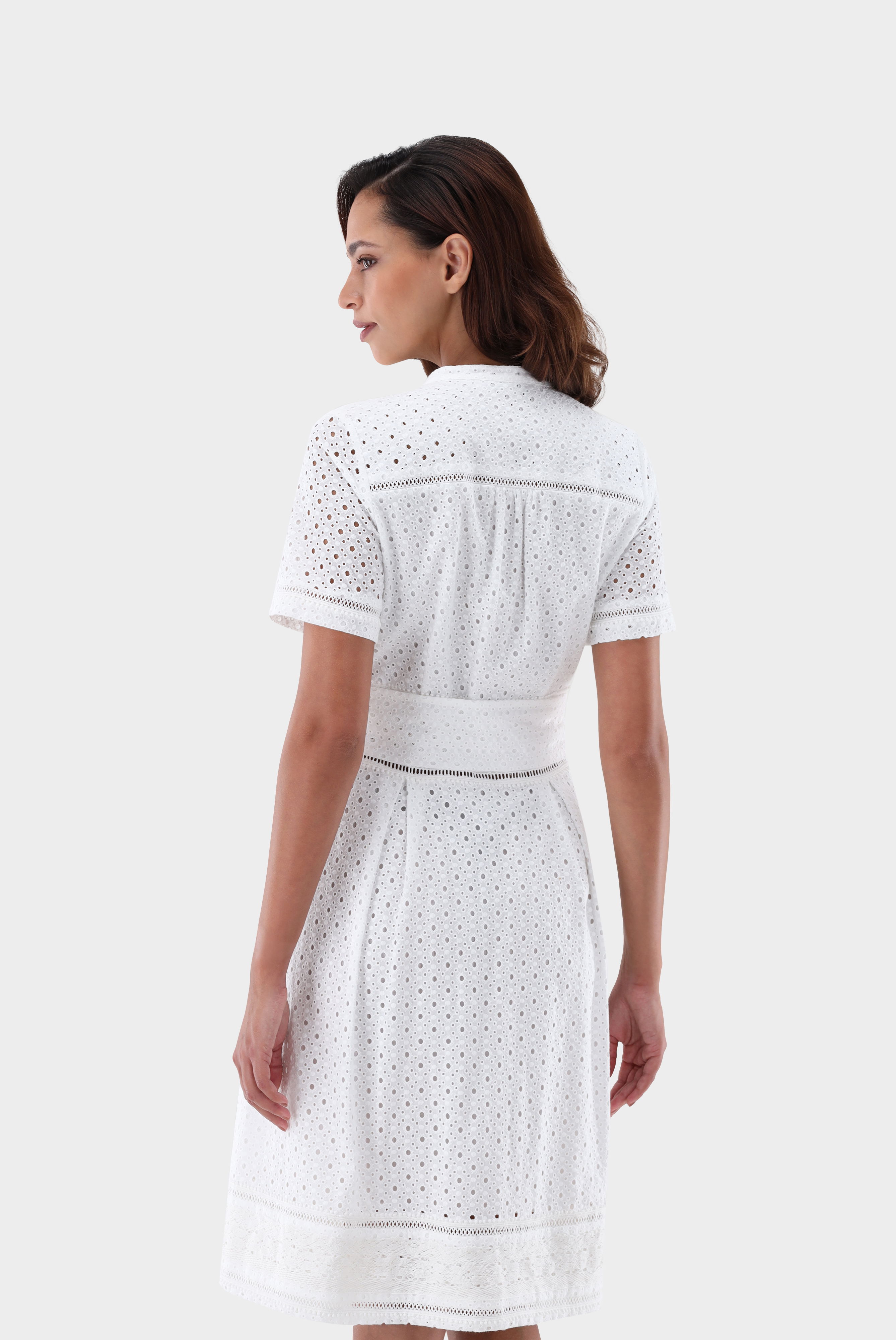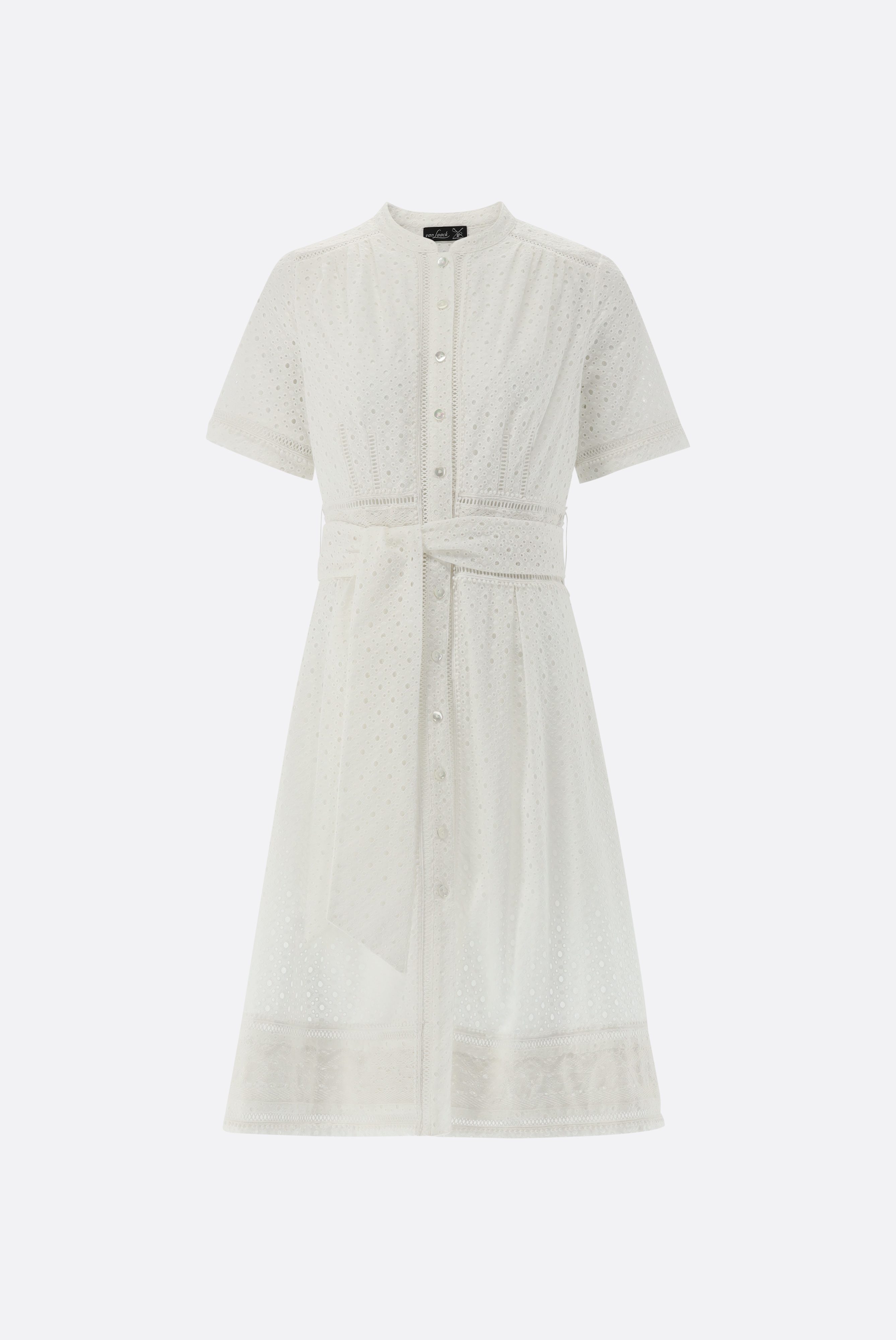 Dieses elegante, knielange Kleid aus hochwertiger Baumwolle besticht durch eine geometrische Lochstickerei, ergänzt durch feine Spitzen- und Hohlsaumdetails. Die taillierte Passform wird durch einen selbstbindenden Gürtel unterstrichen, während der Stehkragen und die kurzen Ärmel für eine moderne Optik sorgen. Raffungen und Faltenakzente vorn und hinten verleihen dem Kleid eine feminine Silhouette. Das vollständig gefütterte Design sorgt für optimalen Tragekomfort. Ideal für Business- und Freizeitlooks.