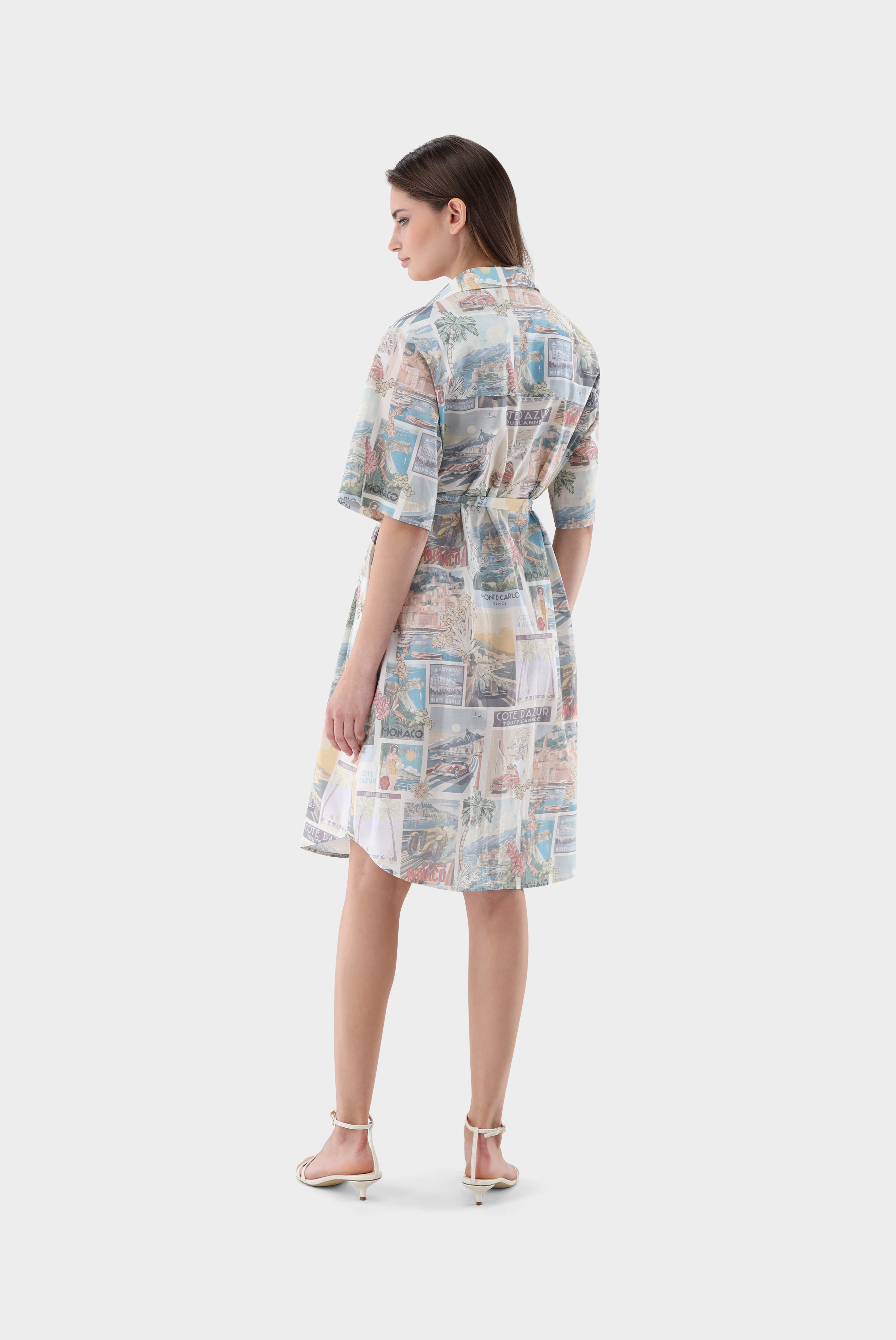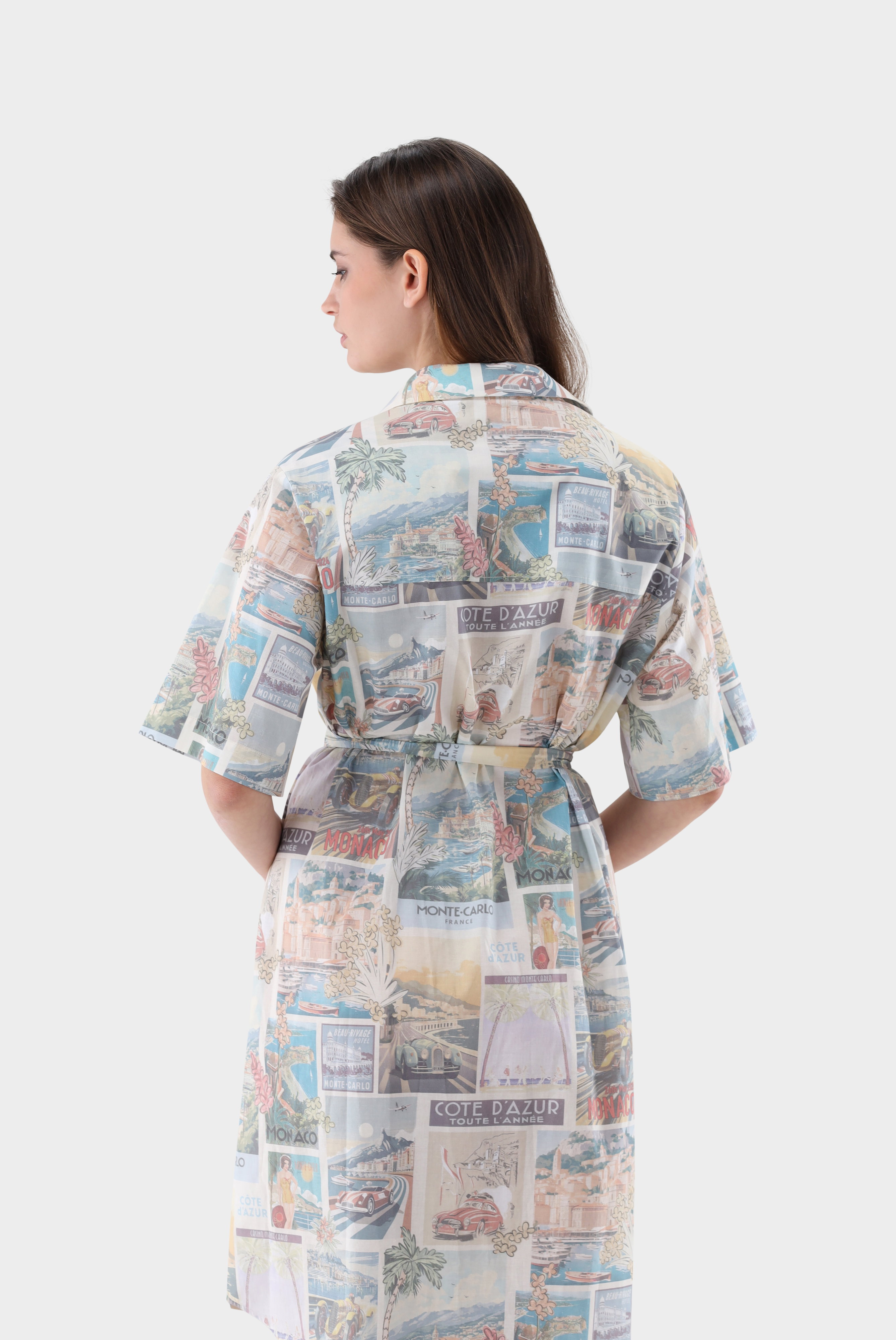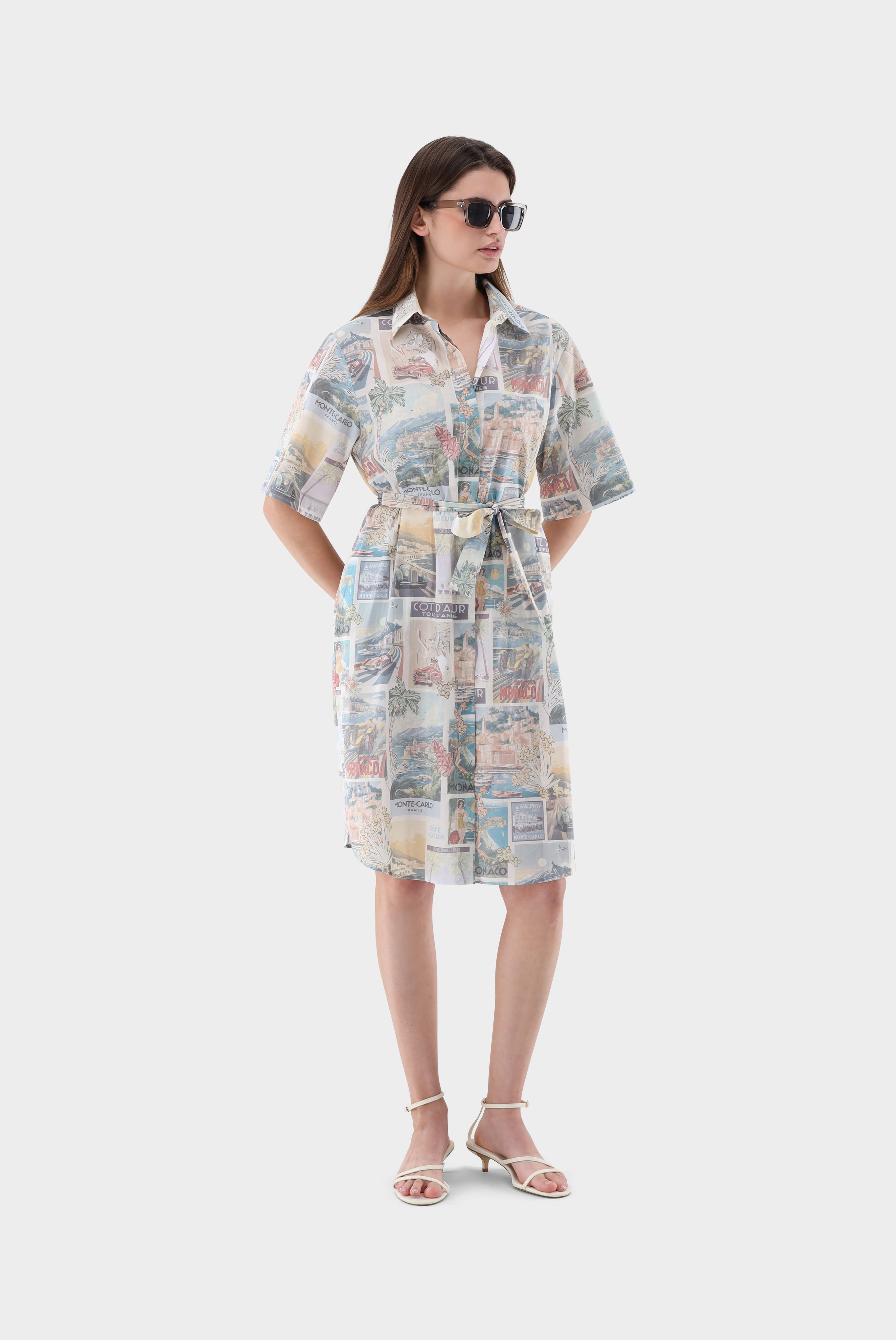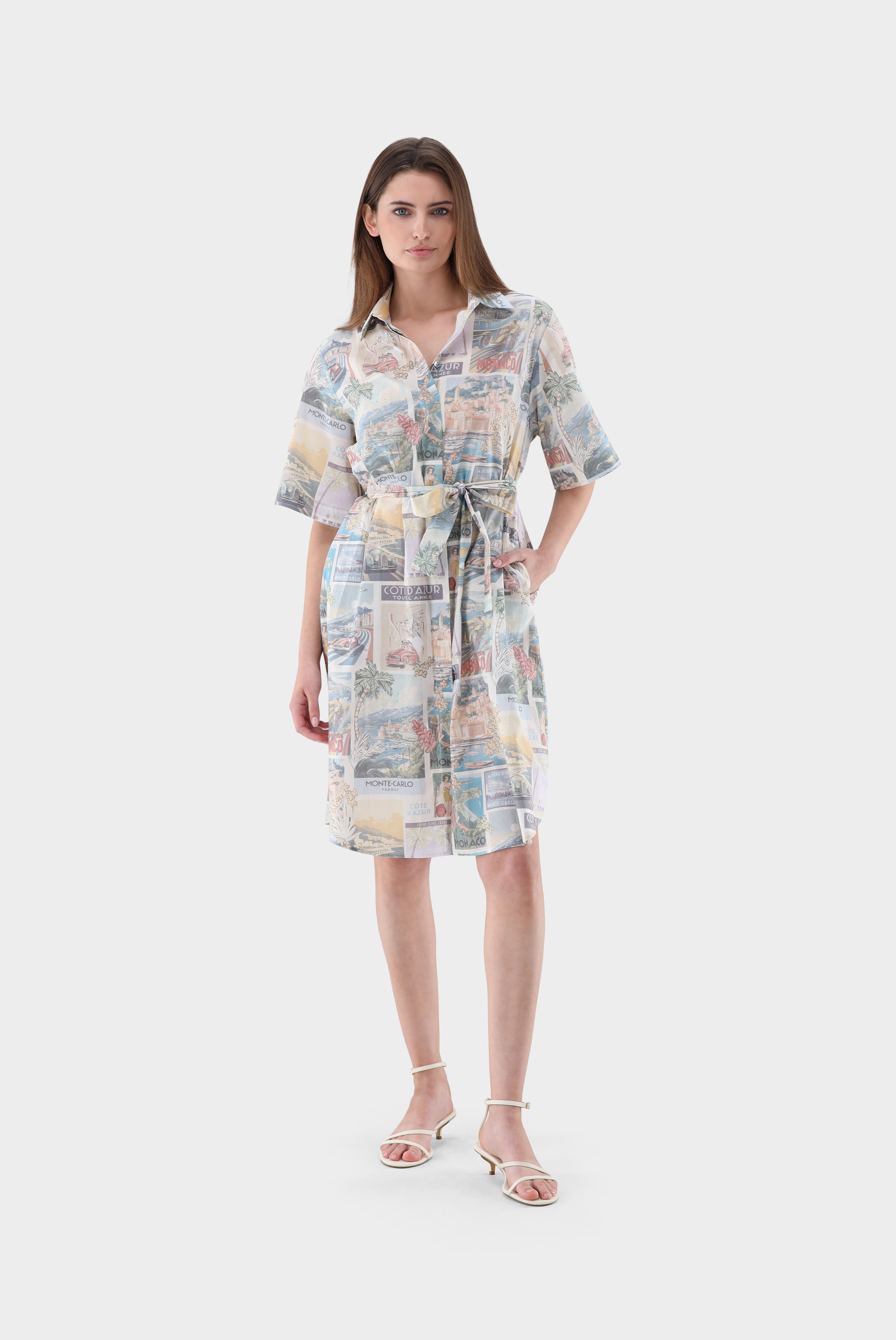 Dieses knielange Hemdblusenkleid überzeugt mit einem charmanten Vintage-Monaco-Postkarten-Print und femininer Ausstrahlung. Der Bindegürtel betont die Taille individuell und sorgt für eine schöne Silhouette. Weite Ärmel verleihen dem Modell eine luftige, entspannte Note. Das Kleid verbindet stilvolle Leichtigkeit mit modischem Charakter und eignet sich ideal für sommerliche Casual- und Freizeit-Looks mit besonderem, nostalgischem Flair.