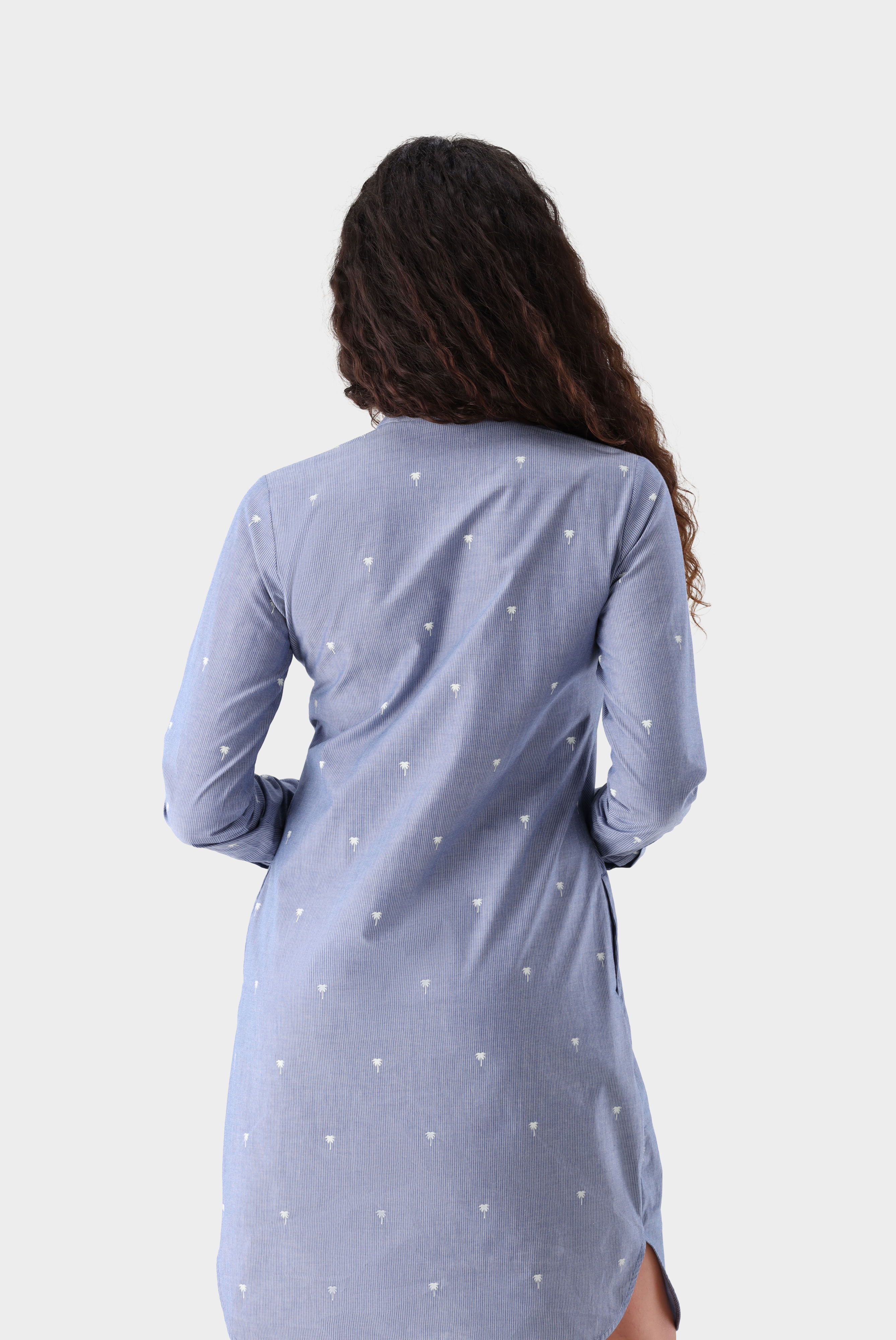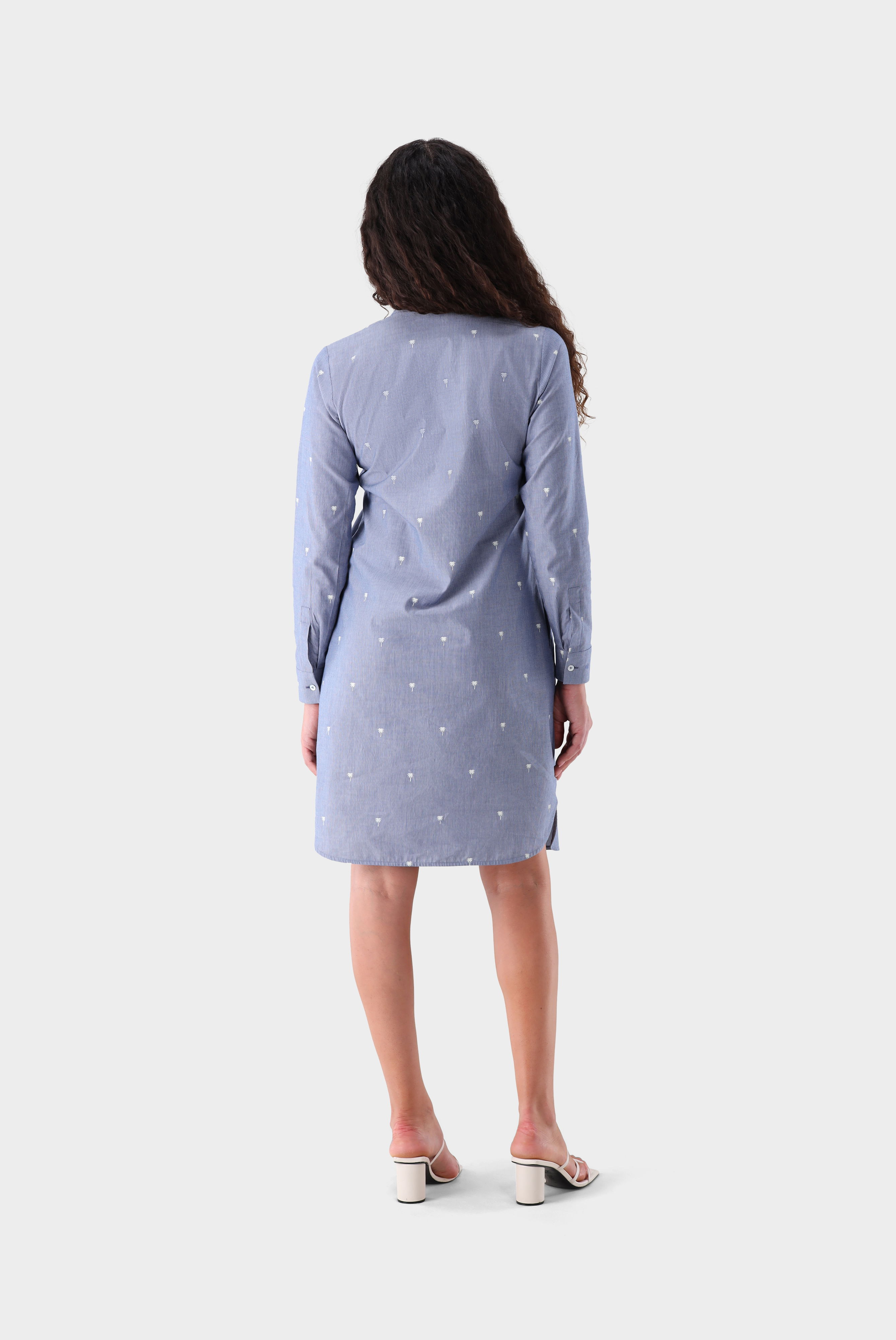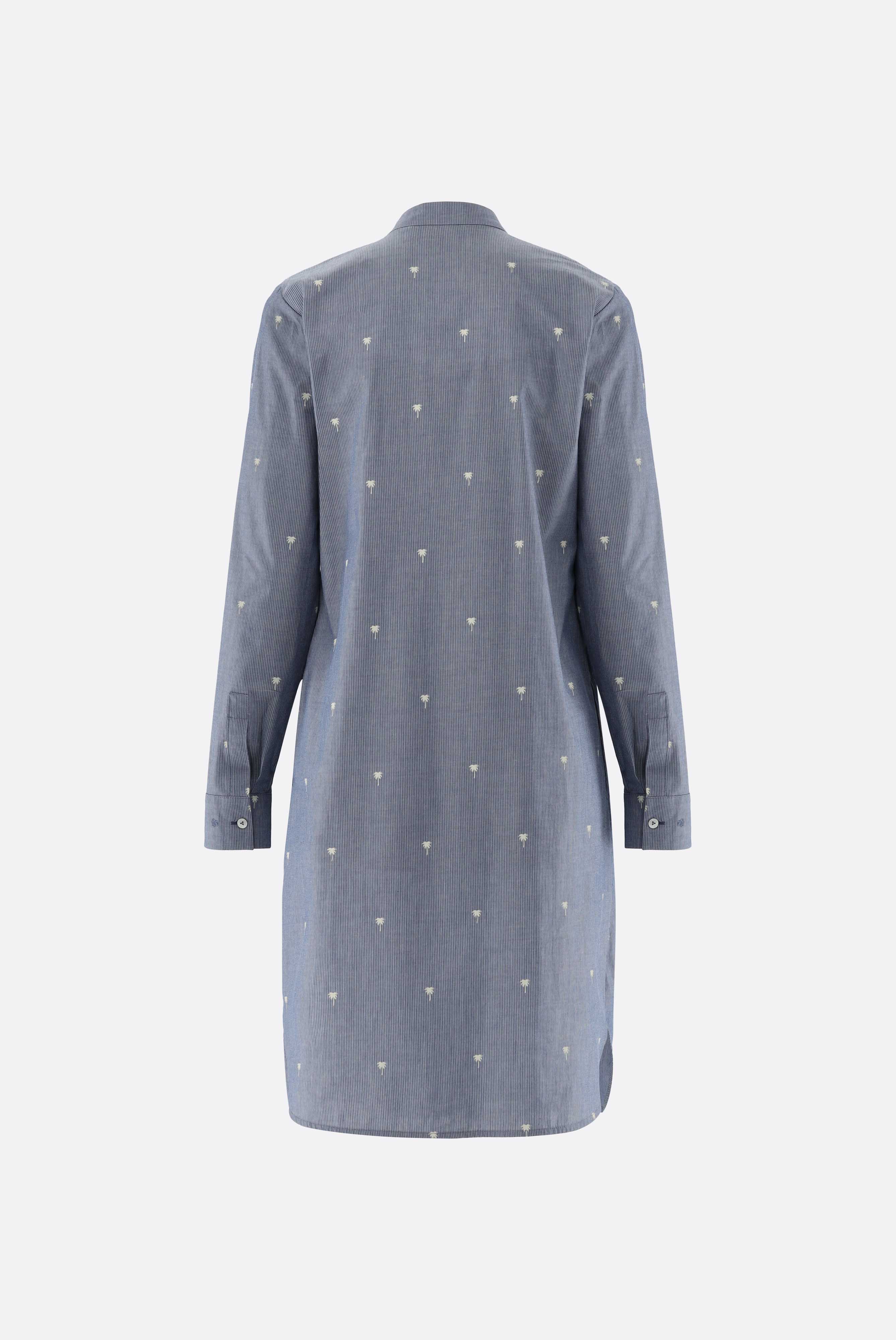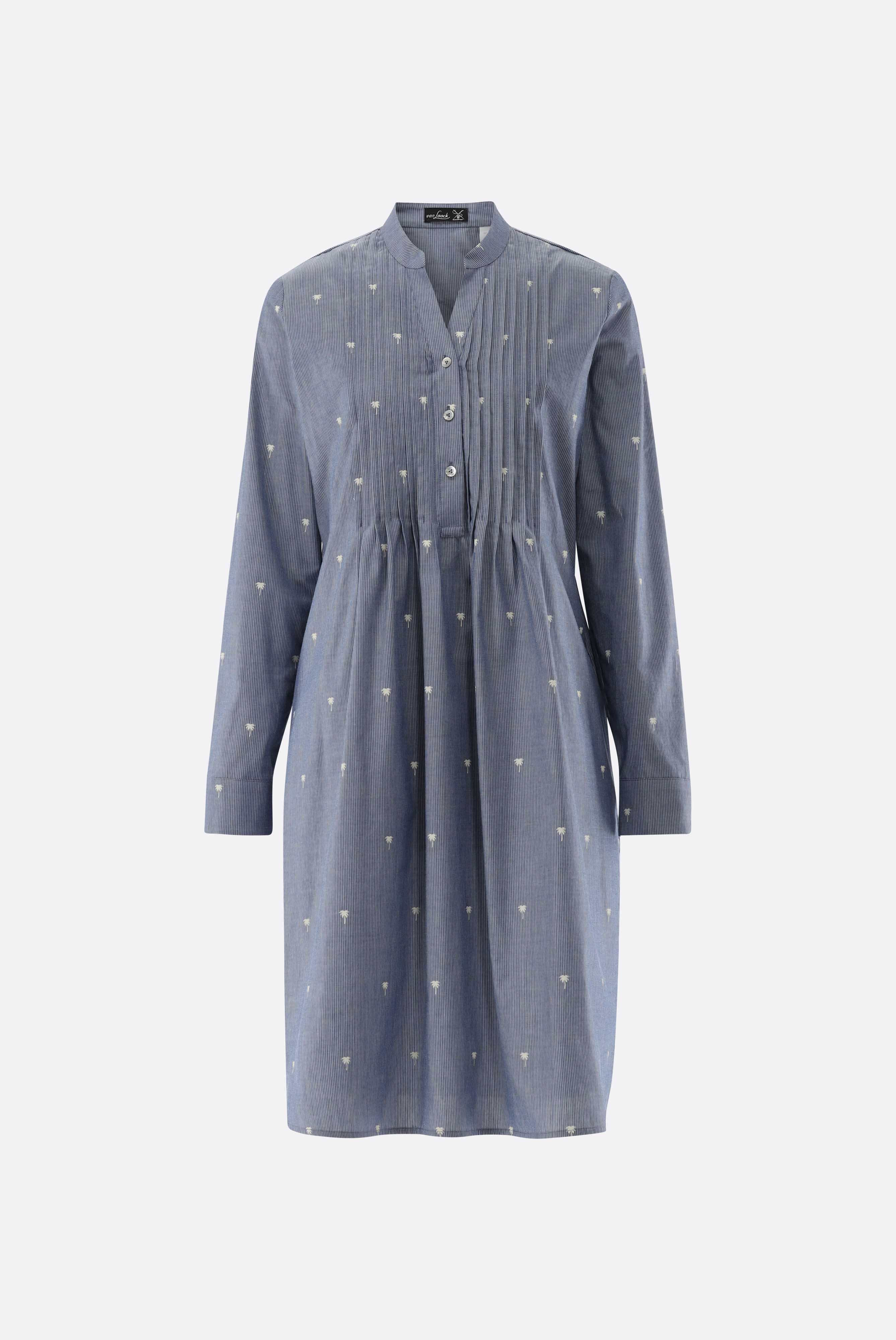 Dieses leicht taillierte Schlupfkleid in knieumspielender Länge verbindet lässigen Denim-Look mit femininen Details. Der Stehkragen und die angesetzte Brustpartie mit feinen Falten verleihen dem Design eine stilvolle Note. Lange Ärmel und praktische Seitentaschen sorgen für Komfort im Alltag. Die Baumwoll-Pinstripe-Qualität mit Palmen-Print wirkt modern und sommerlich. Ein vielseitiges Kleid für entspannte Casual-Looks mit modischem Anspruch.