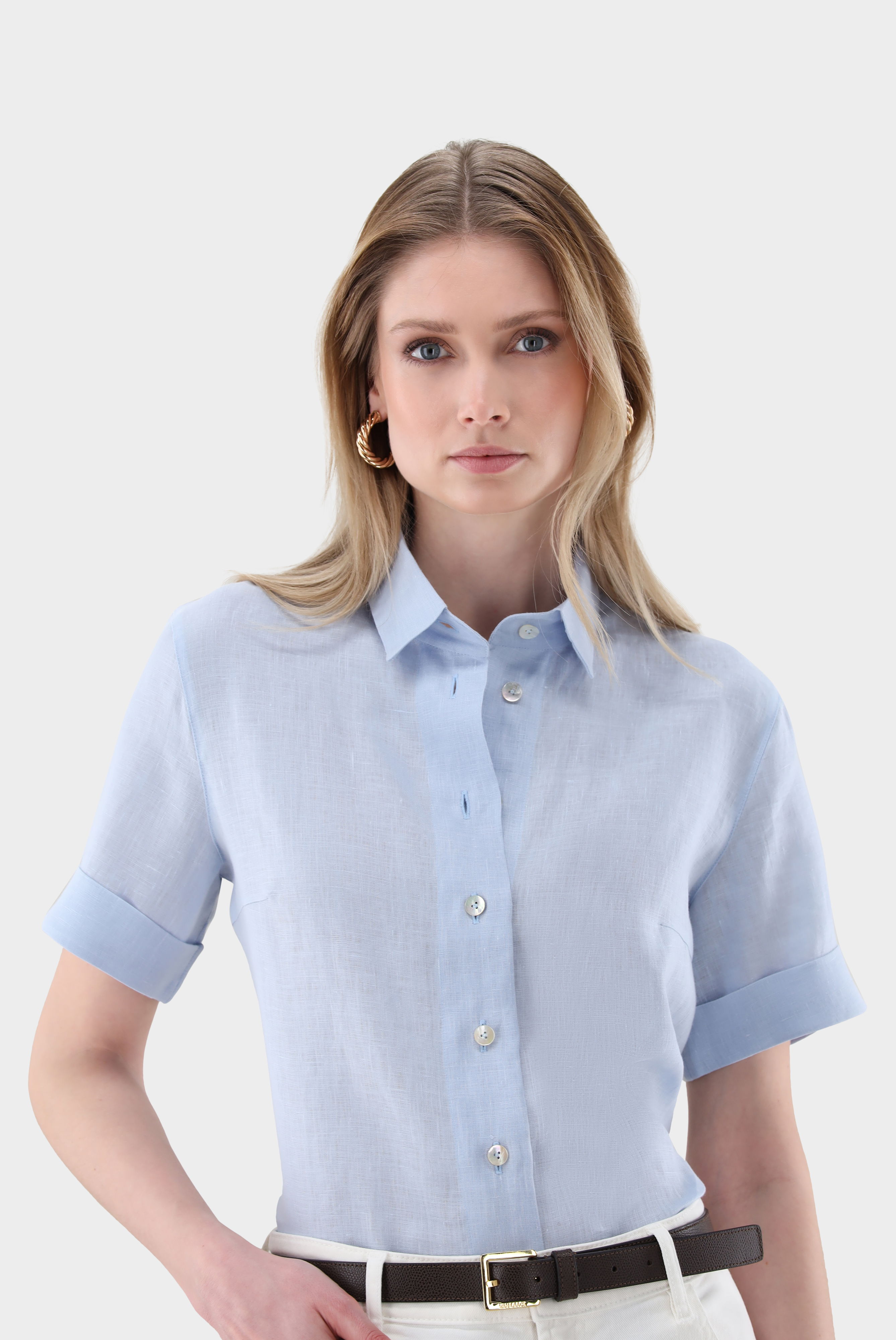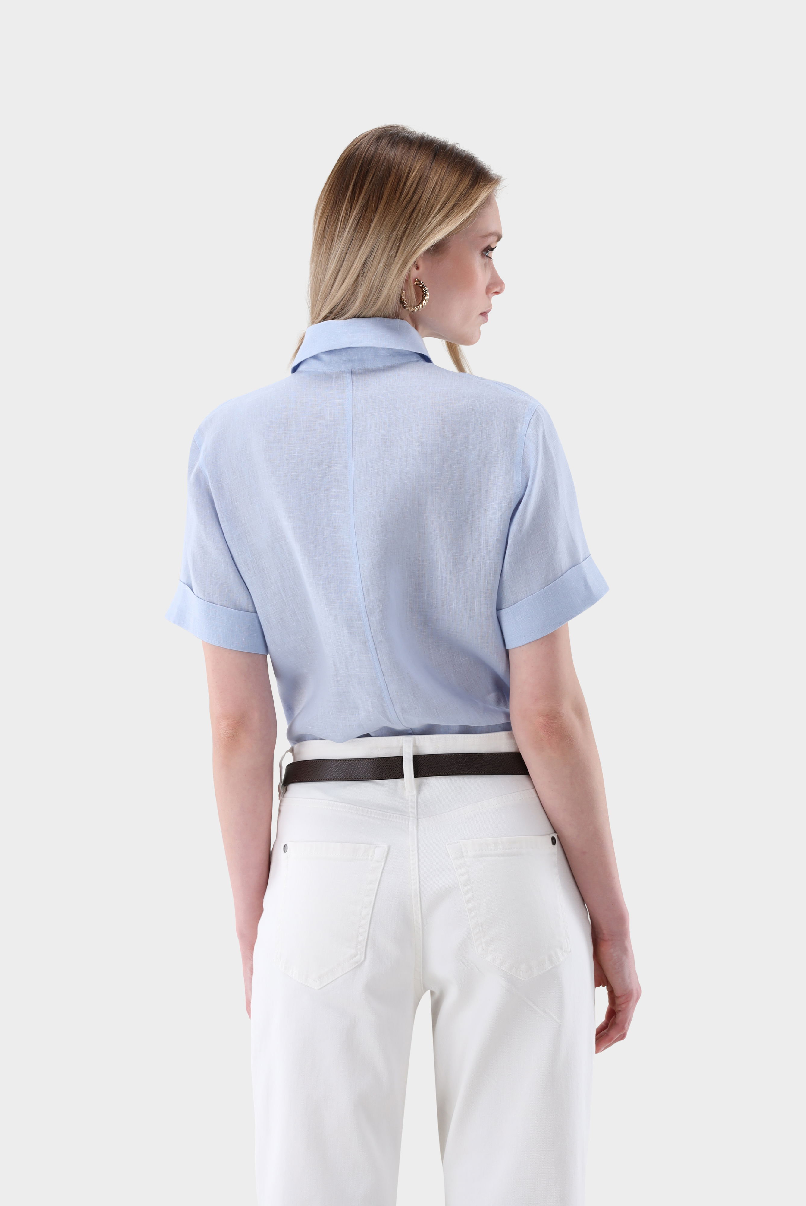 Die locker geschnittene Hemdbluse aus hochwertigem, besonders weichem Leinen vereint Nachhaltigkeit und Stil. Leinen ist eine Naturfaser, die atmungsaktiv, kühlend und umweltfreundlich ist – perfekt für warme Tage. Die kurzen Ärmel mit Umschlag und die Seitenschlitze verleihen der Bluse eine moderne Note, während die Perlmuttknöpfe für einen eleganten Abschluss sorgen. Ideal für Casual- und Business-Looks, die Komfort und Raffinesse verbinden.