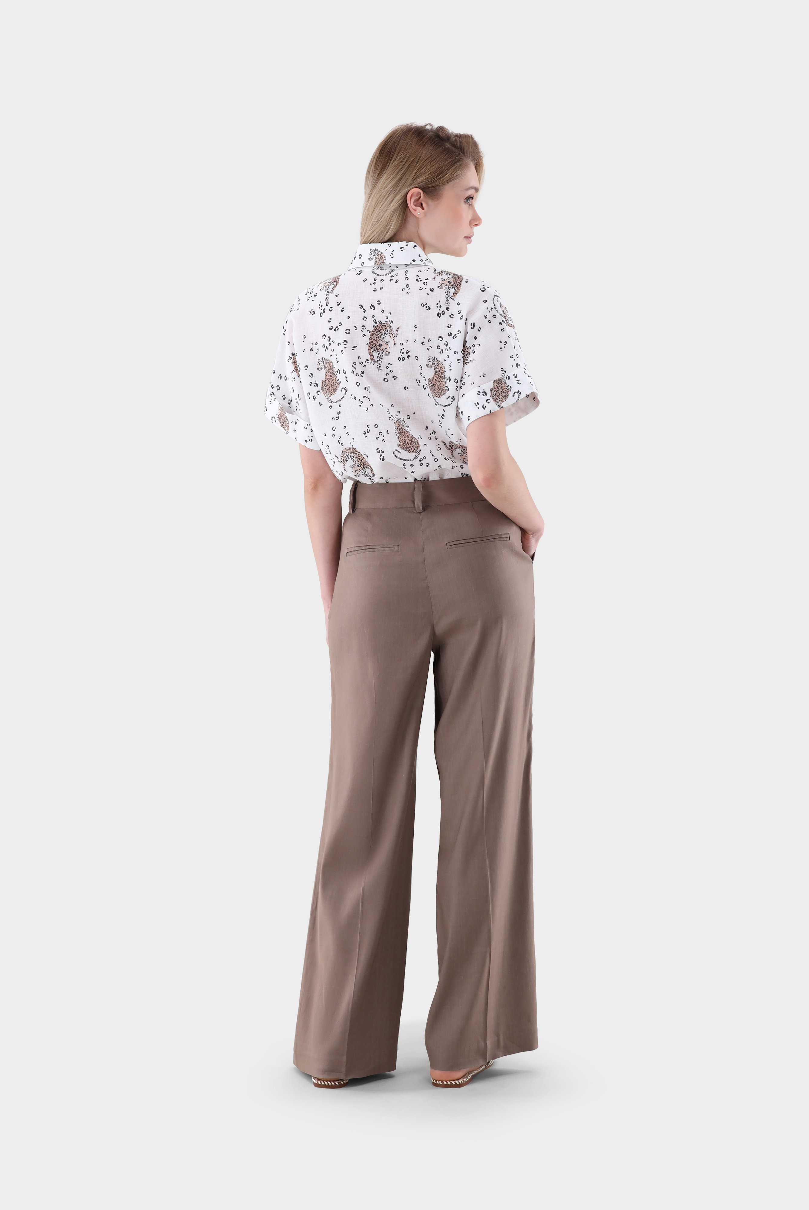 Look aus Kurzarm Hemdbluse aus Leinen mit Print