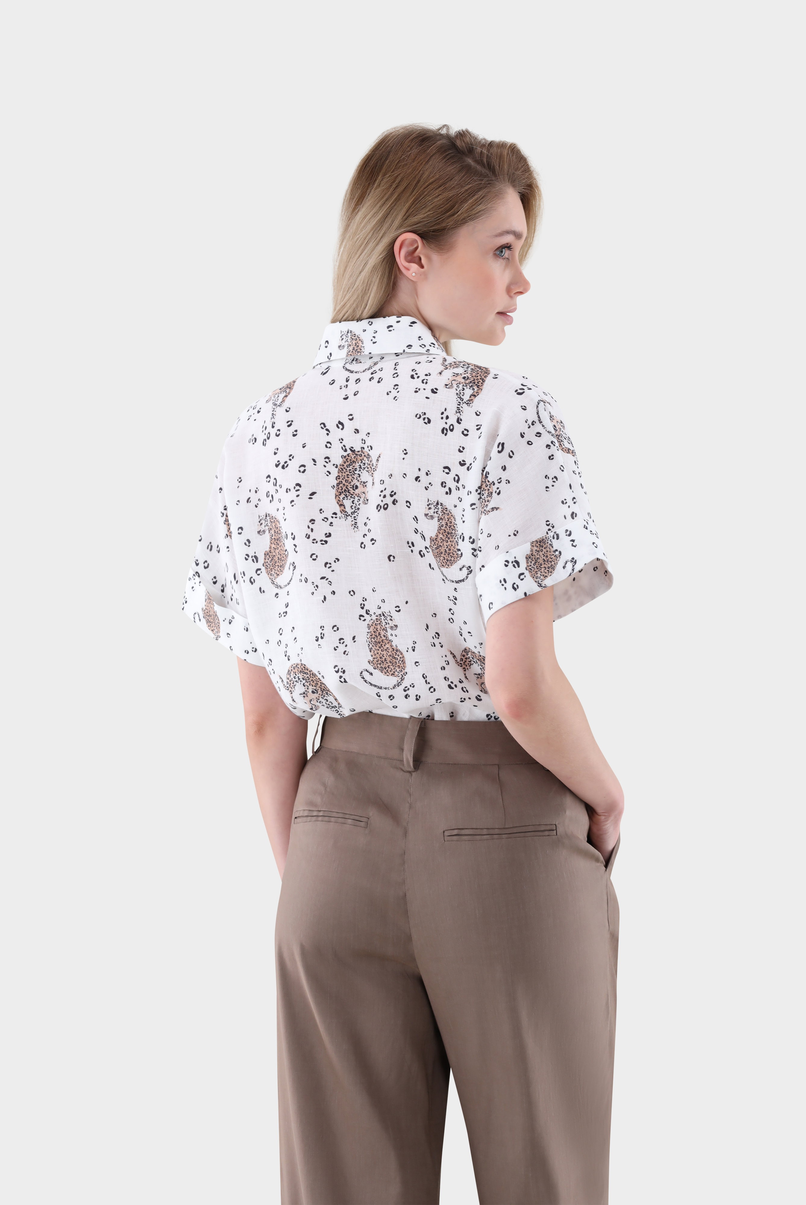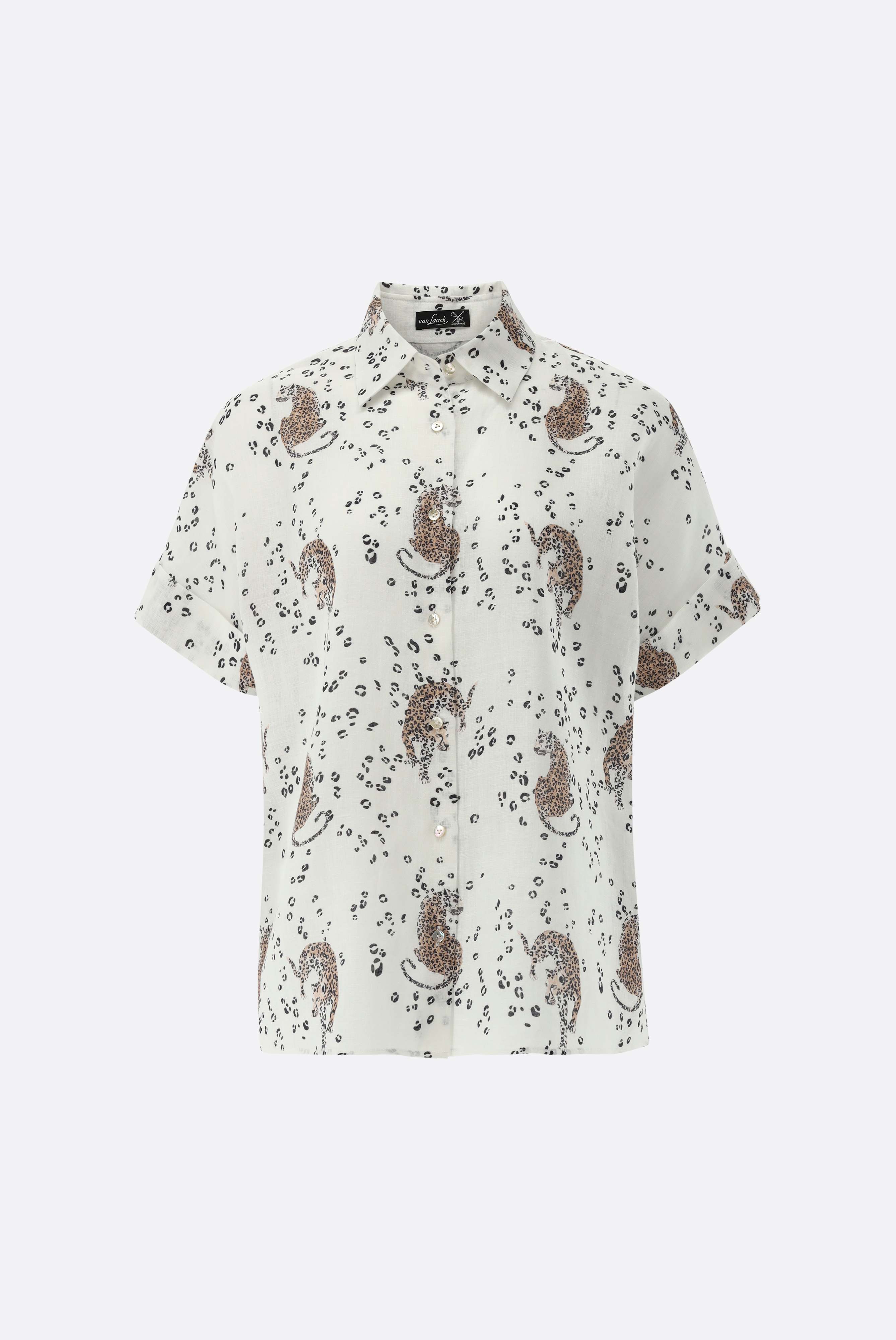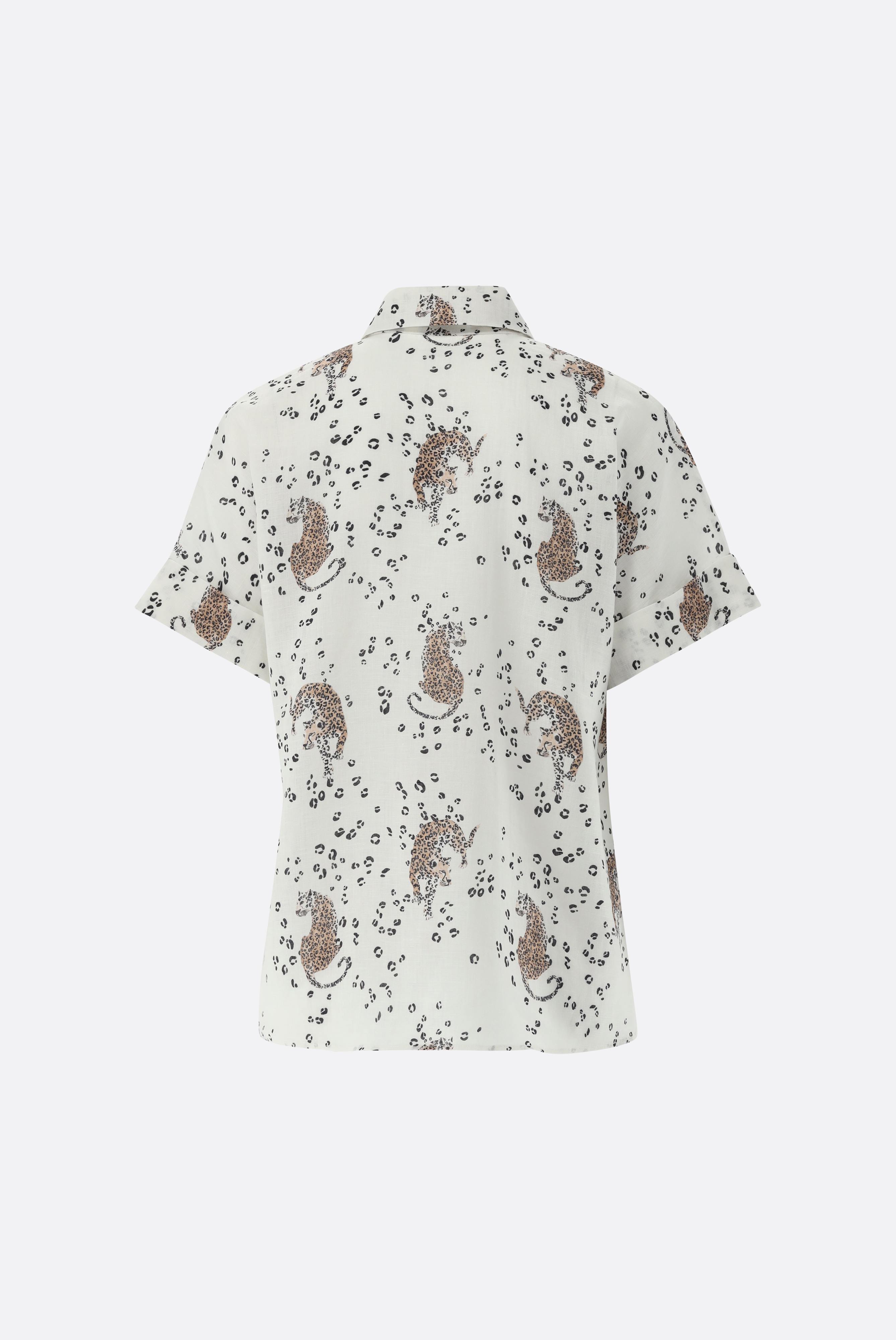 Diese locker geschnittene Hemdbluse besticht durch eine entspannte Silhouette und sommerliches Design. Die angeschnittenen kurzen Ärmel mit Umschlag sorgen für einen legeren Look. Gefertigt aus weichen Leinen bietet die Bluse angenehmen Tragekomfort, Leichtigkeit und fließenden Fall. Ein vielseitiges Kleidungsstück für warme Tage, das sich ideal für Casual- und Urlaubslooks oder legere Freizeit-Outfits kombinieren lässt. Der Print mit Leoparden sorgt für einen besonderen Look.
