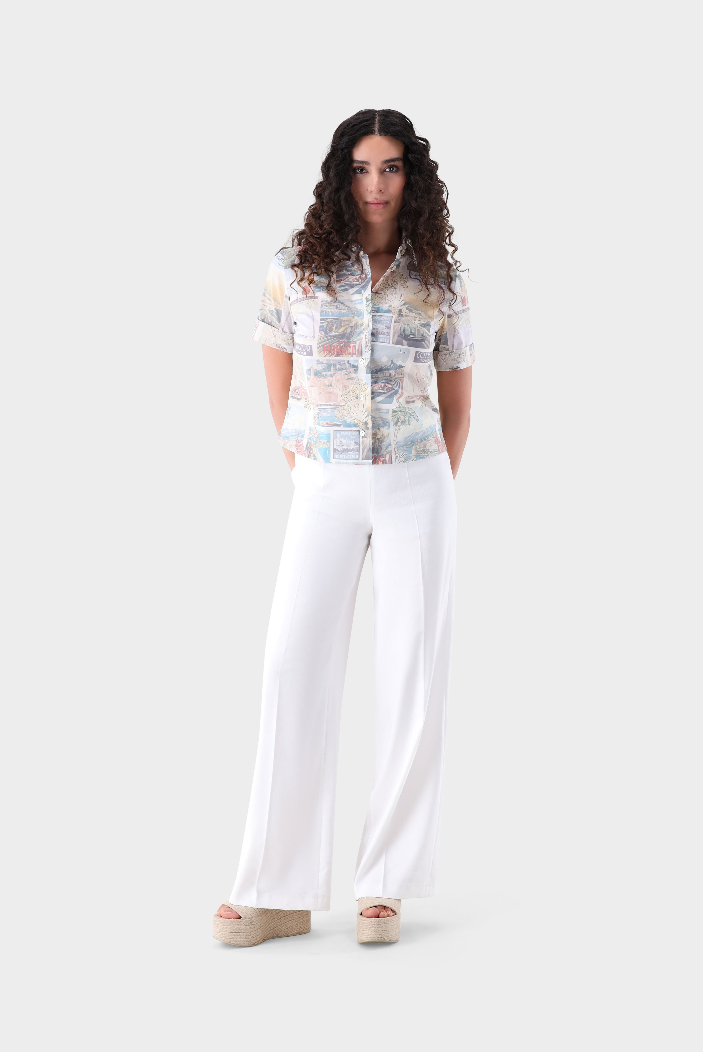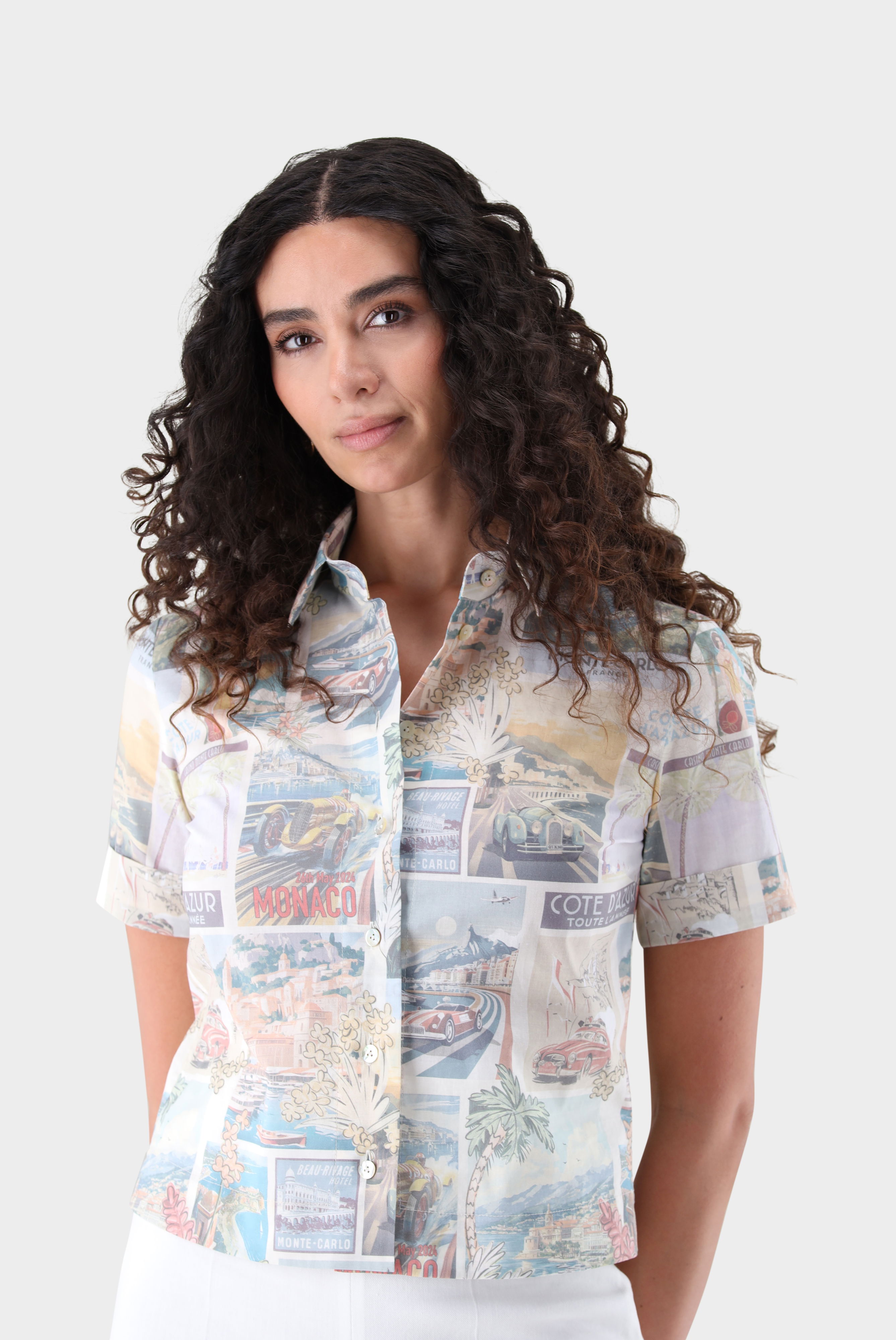 Diese kastenförmige Bluse überzeugt mit einer modernen, entspannten Silhouette und sommerlichem Charme. Kurze Ärmel mit Umschlag verleihen dem Modell einen legeren, zeitgemäßen Look. Das hochwertige Baumwollmaterial sorgt für angenehmen Tragekomfort, Atmungsaktivität und eine weiche Haptik. Ein ausdrucksstarkes Postkartenmuster setzt kreative Akzente und macht die Bluse zu einem besonderen Blickfang. Vielseitig kombinierbar – ideal für stilvolle Casual-, Freizeit- und Urlaubsoutfits..