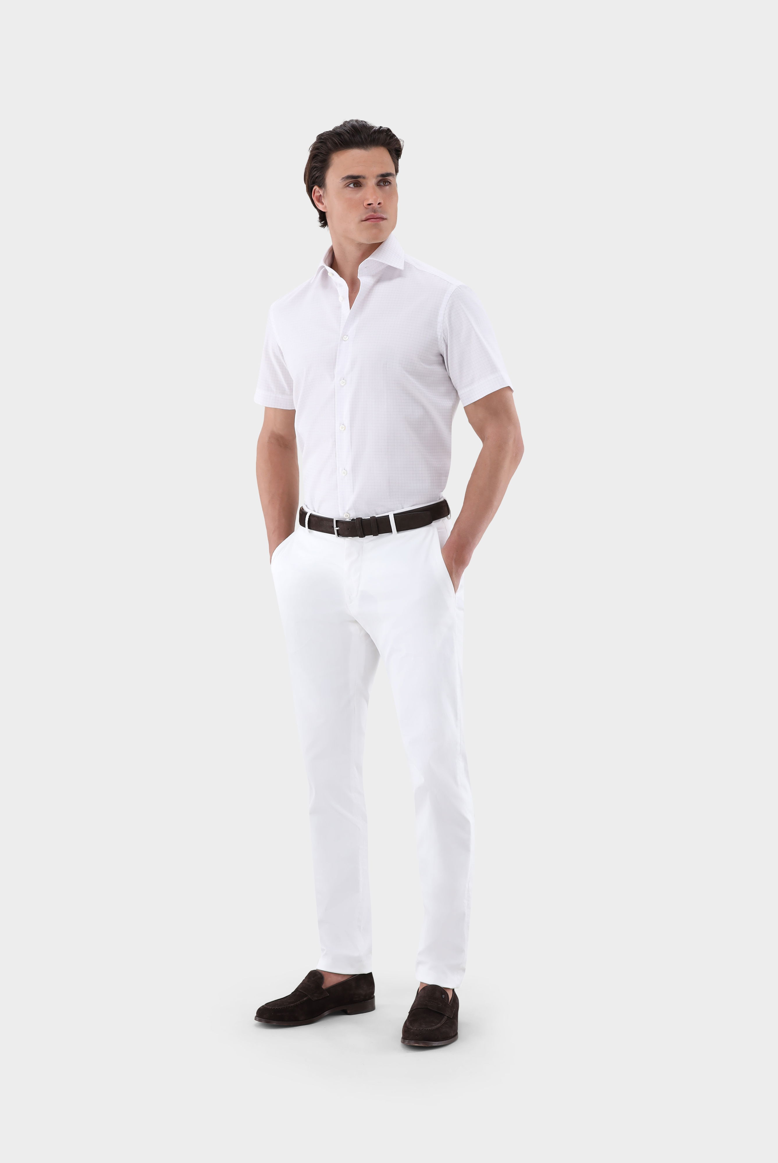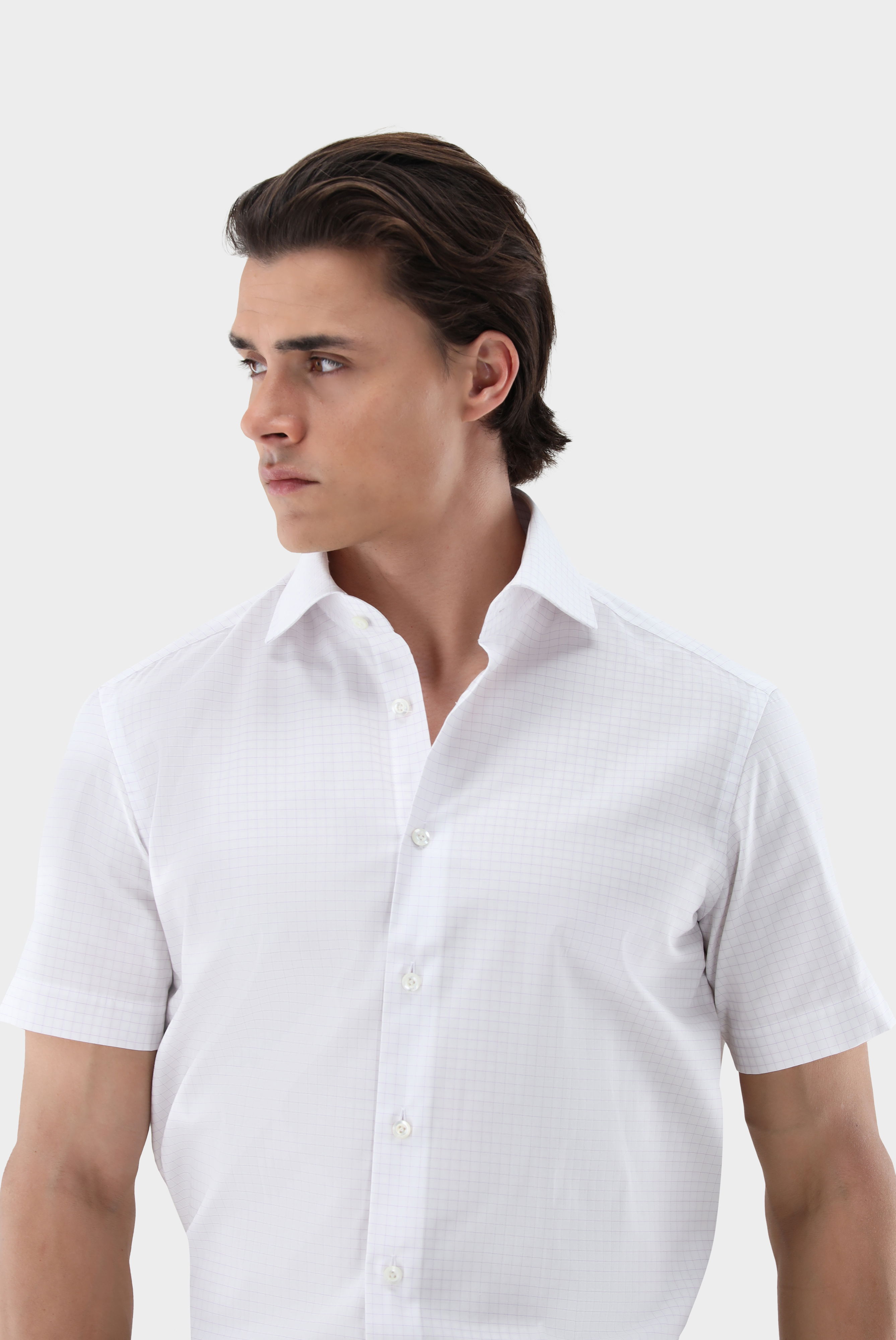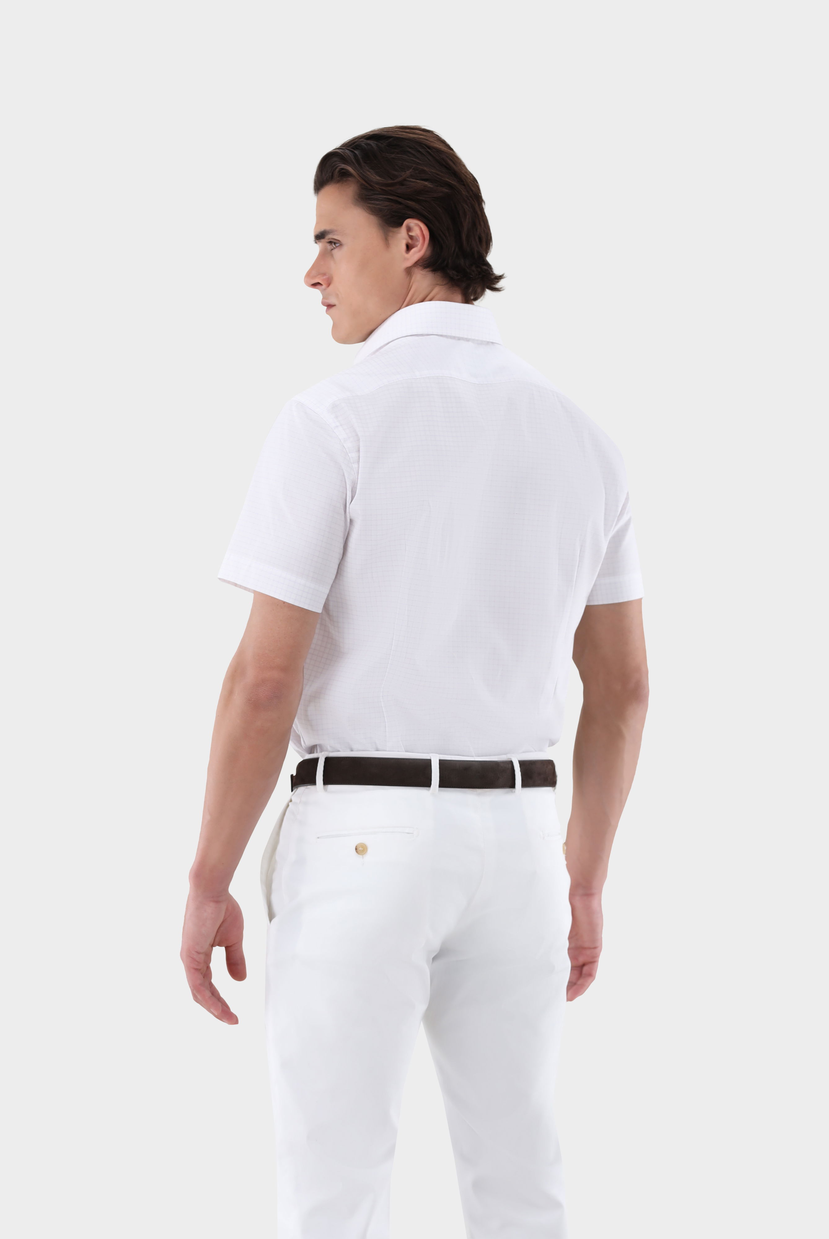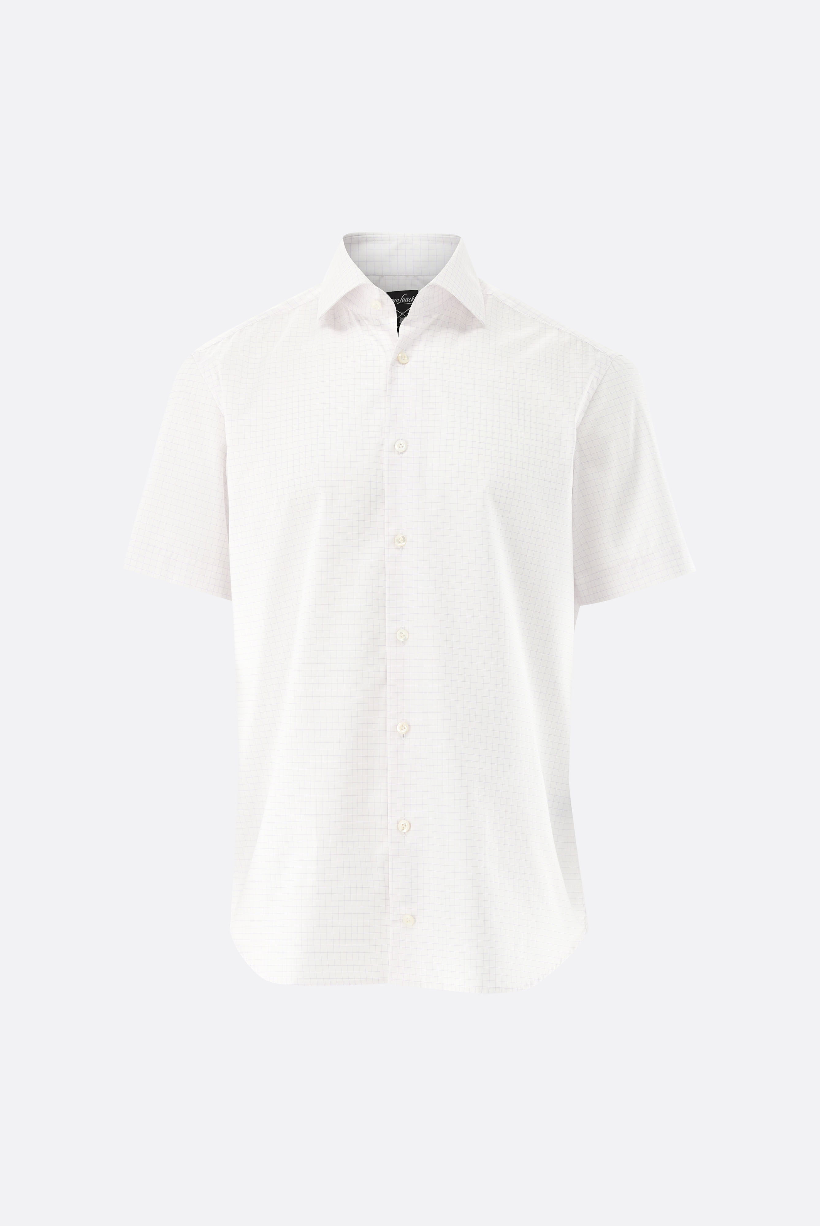 Das karierte Twill-Hemd mit kurzen Ärmeln und Tailor Fit aus unserer "Perfect Look" Kollektion bietet den perfekten Mix aus Stil und Tragekomfort. Das Hemd ist aus strukturiertem Twill-Gewebe mit einem feinen Pinchecked-Muster gefertigt und verfügt über unsere einzigartige "Perfect Look" Verarbeitung. Dank dieser Verarbeitung knittert das Hemd kaum und ist mit minimalem Bügelaufwand tragbar, wobei sich der Stoff zusätzlich durch Körperwärme glättet. Der Stoff wird von einem Lieferanten aus der Schweiz bezogen. Das Hemd ist mit einem gemäßigten Haifischkragen, halben Ärmeln, besonderen van Laack Ecken und einer glatten Knopfleiste ausgestattet. Die hochwertige Verarbeitung umfasst Innennähte, Seitennähte, handgeknüpfte Nähte und Perlmuttknöpfe, was es ideal für Geschäftsreisen macht.