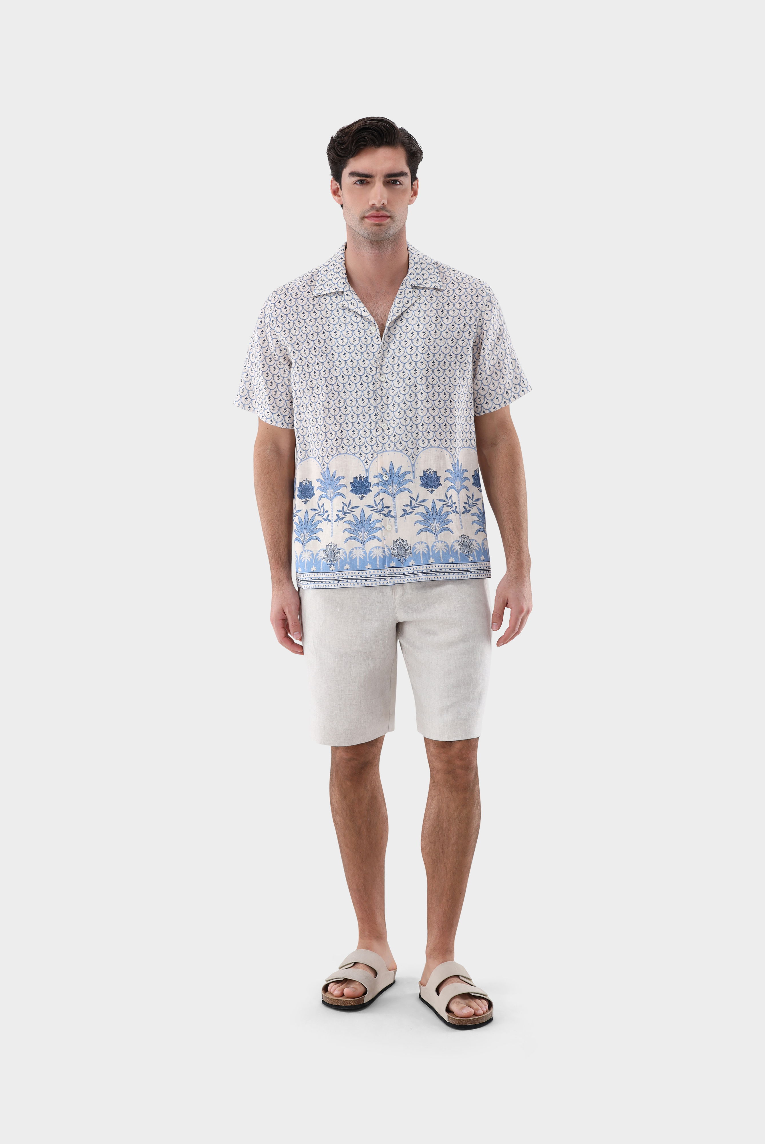 Dieses kurzärmelige Shirt aus weichem Leinen überzeugt durch sommerliche Leichtigkeit und eine hochwertige Verarbeitung. Der platzierte Palmen-Print setzt frische, tropische Akzente, während der klassische Reverskragen dem Design eine elegante, moderne Note verleiht. Edle Perlmuttknöpfe unterstreichen den hochwertigen Anspruch. Das atmungsaktive Leinenmaterial sorgt für hohen Tragekomfort an warmen Tagen. Ideal für stilvolle Freizeit-, Urlaubs- oder sommerliche Casual-Looks mit gepflegter, entspannter Ausstrahlung.