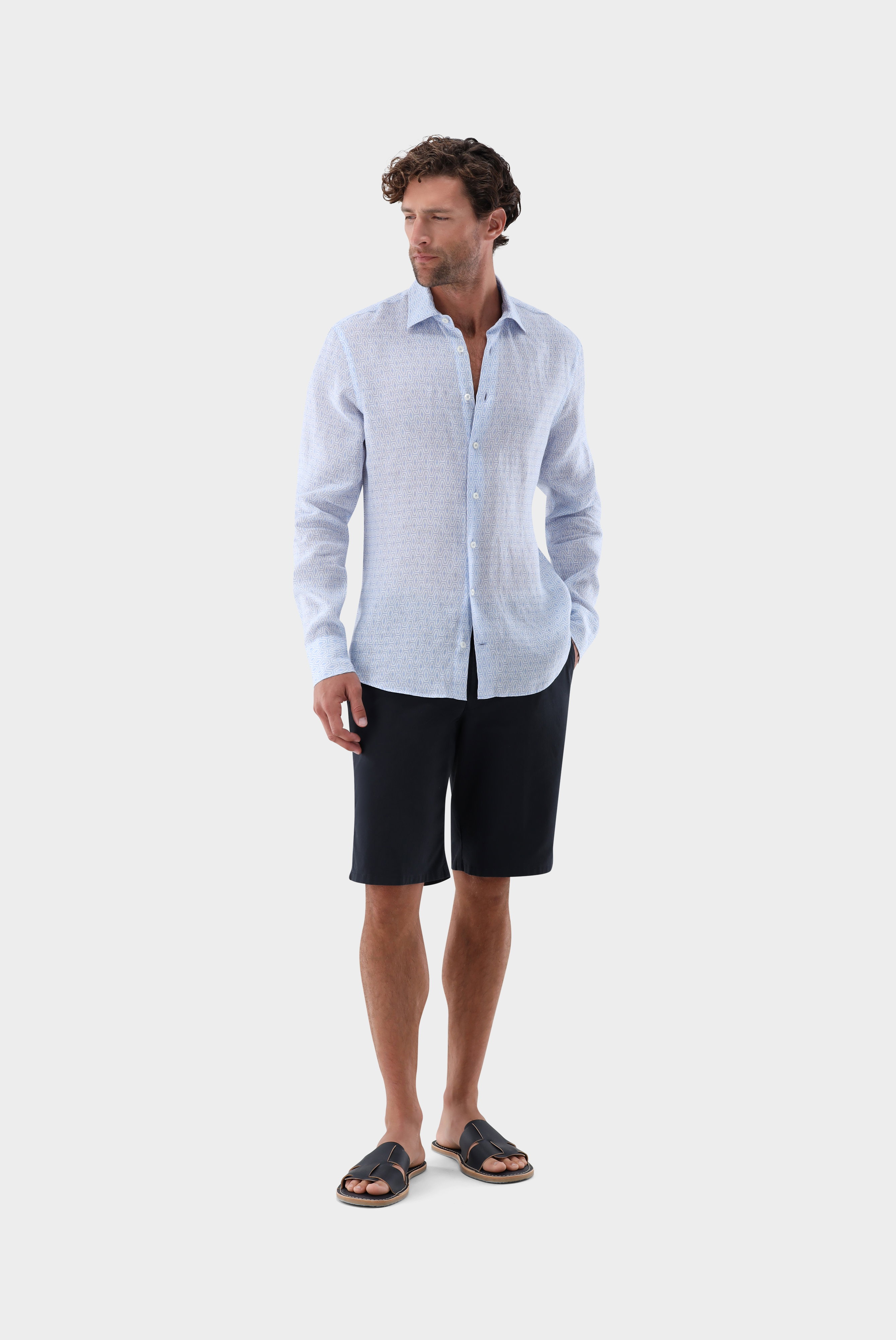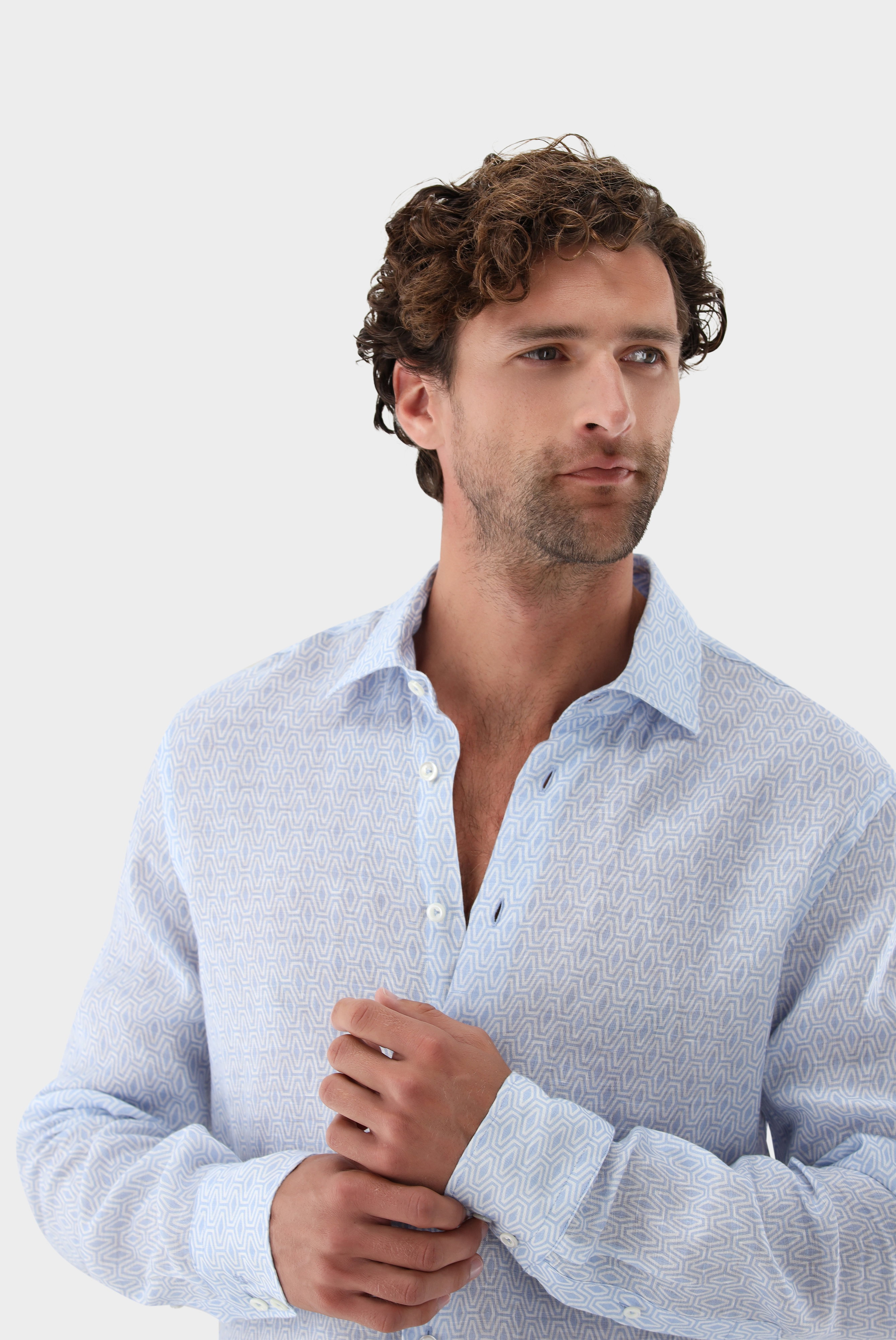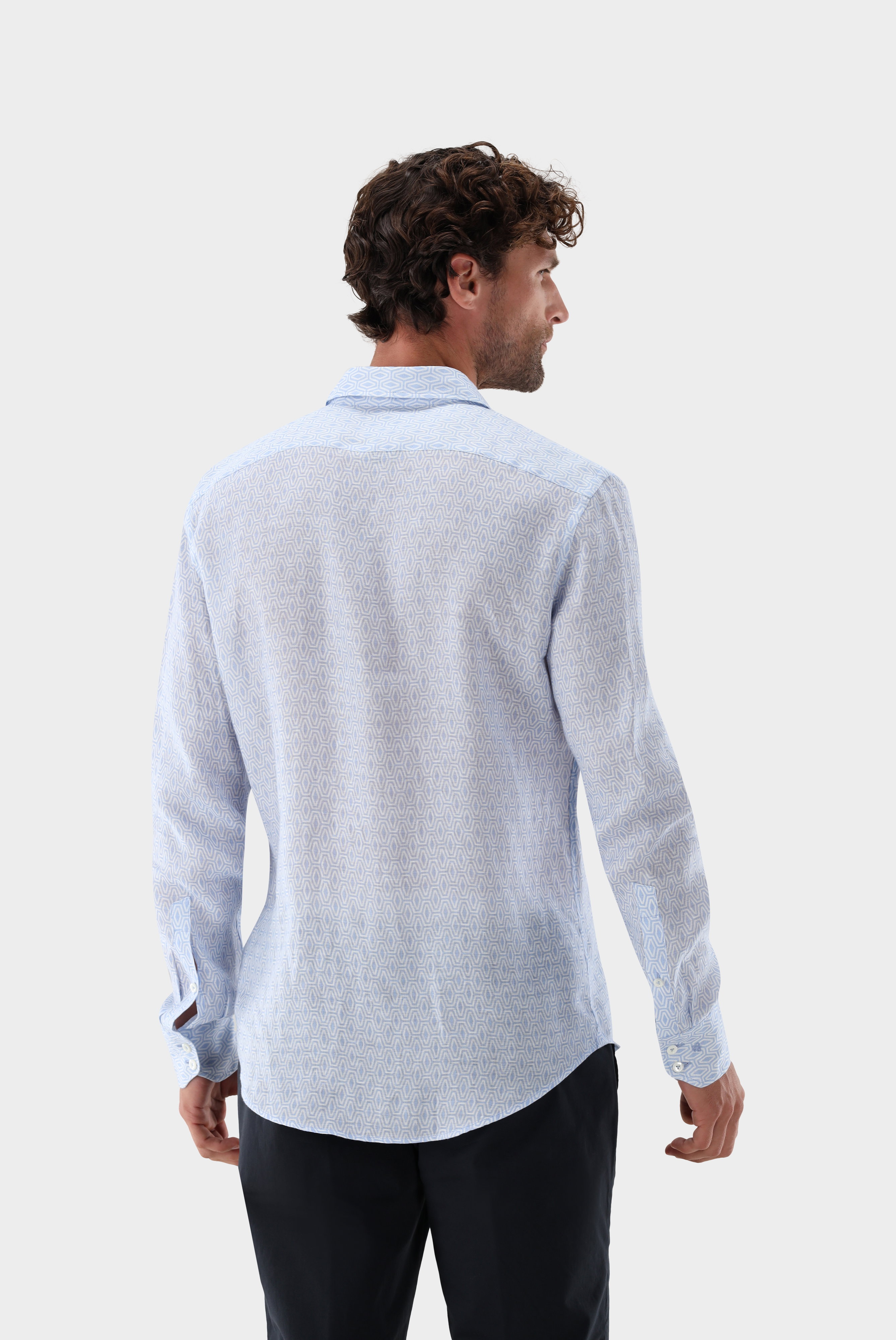 Dieses Tailor-Fit-Hemd aus superweichem Leinen überzeugt durch eine elegante, körpernahe Passform und hohen Tragekomfort. Der geometrische Print verleiht dem Modell eine moderne, stilvolle Optik, während markante Nähte mit dickerem Garn dezente Akzente setzen. Der Kentkragen und edle Perlmuttknöpfe unterstreichen die hochwertige Verarbeitung. Das atmungsaktive Material sorgt für angenehme Leichtigkeit und macht das Hemd ideal für sommerliche Casual- und Smart-Casual-Looks.