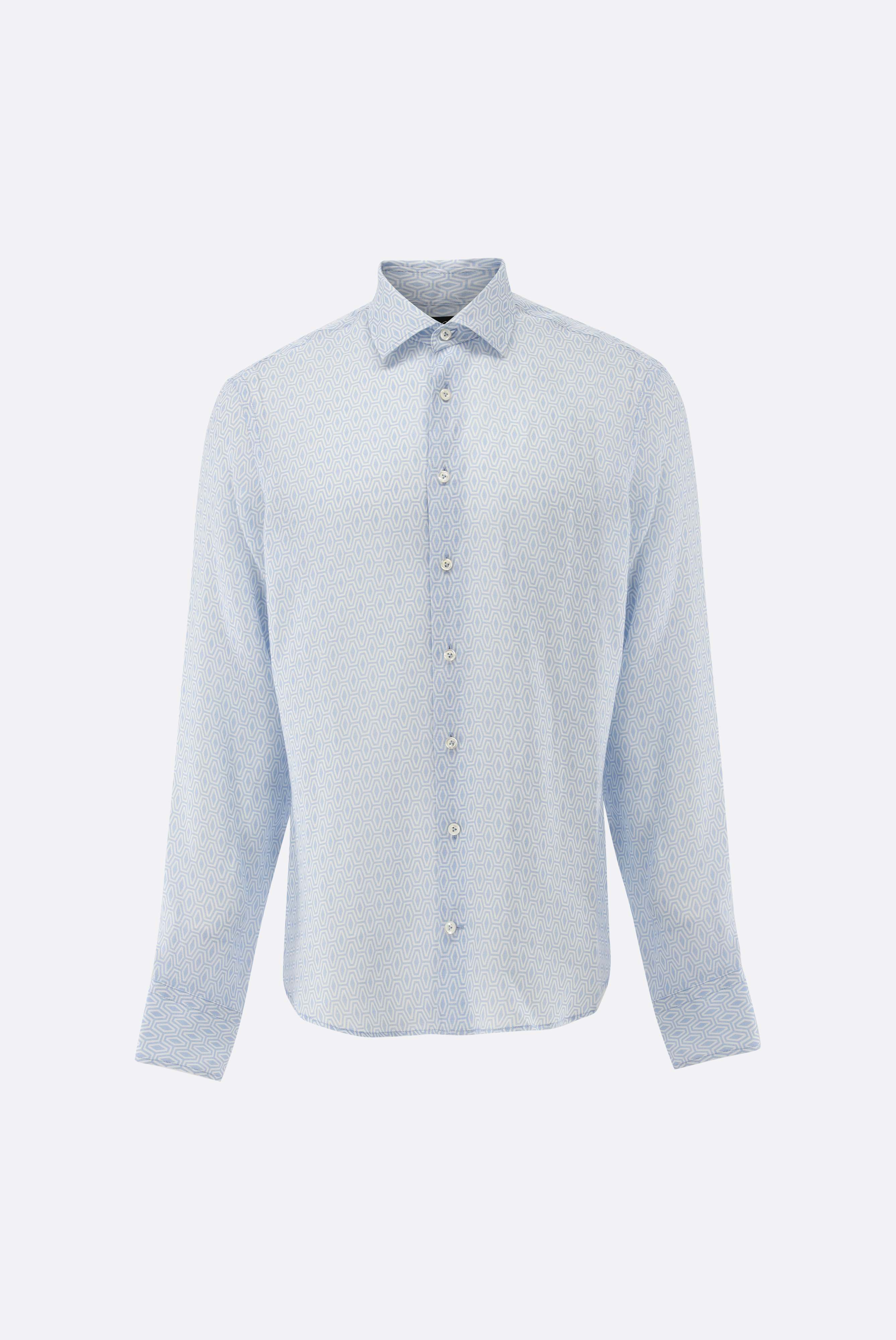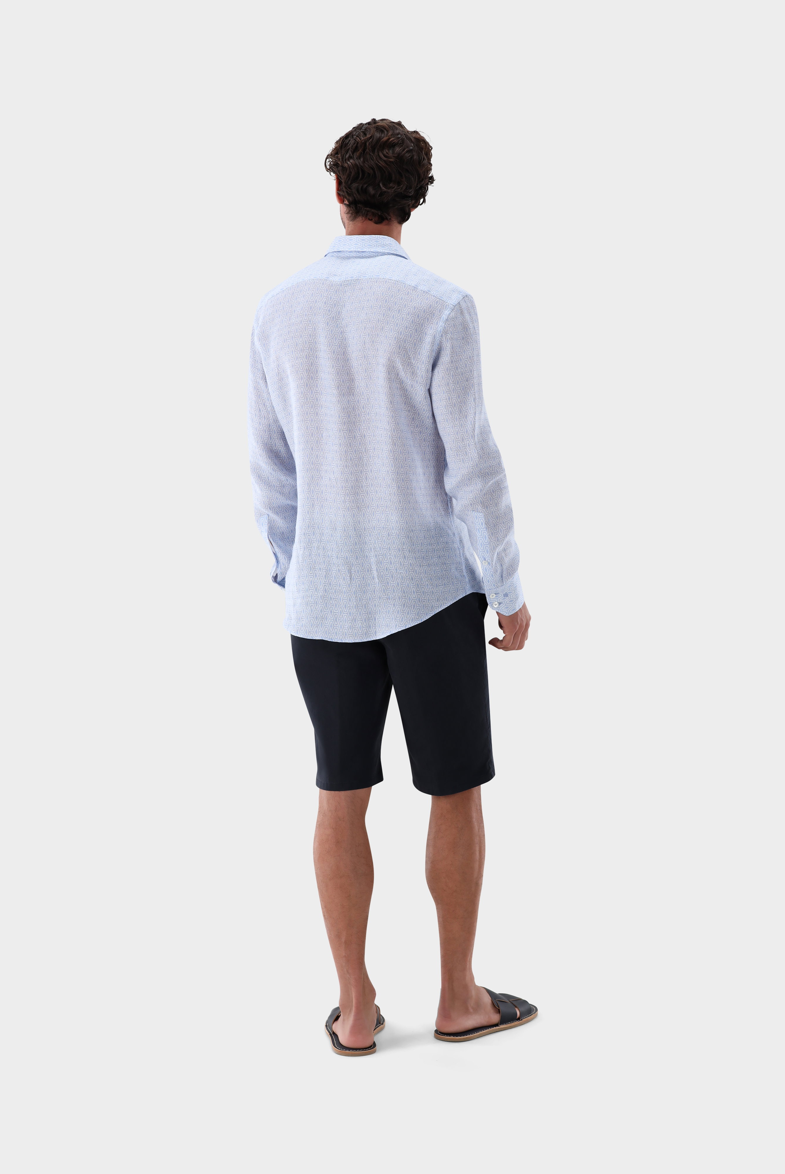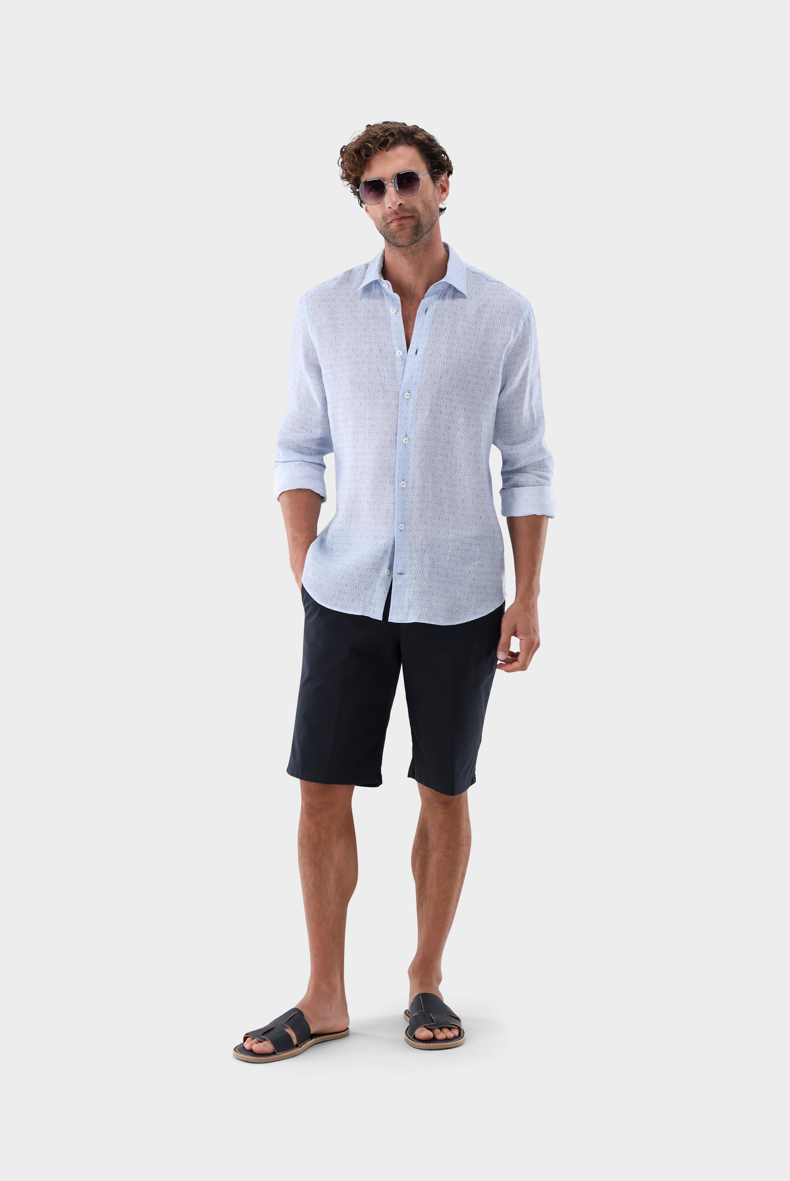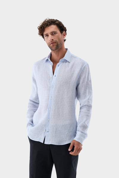 Dieses Tailor-Fit-Hemd aus superweichem Leinen überzeugt durch eine elegante, körpernahe Passform und hohen Tragekomfort. Der geometrische Print verleiht dem Modell eine moderne, stilvolle Optik, während markante Nähte mit dickerem Garn dezente Akzente setzen. Der Kentkragen und edle Perlmuttknöpfe unterstreichen die hochwertige Verarbeitung. Das atmungsaktive Material sorgt für angenehme Leichtigkeit und macht das Hemd ideal für sommerliche Casual- und Smart-Casual-Looks.
