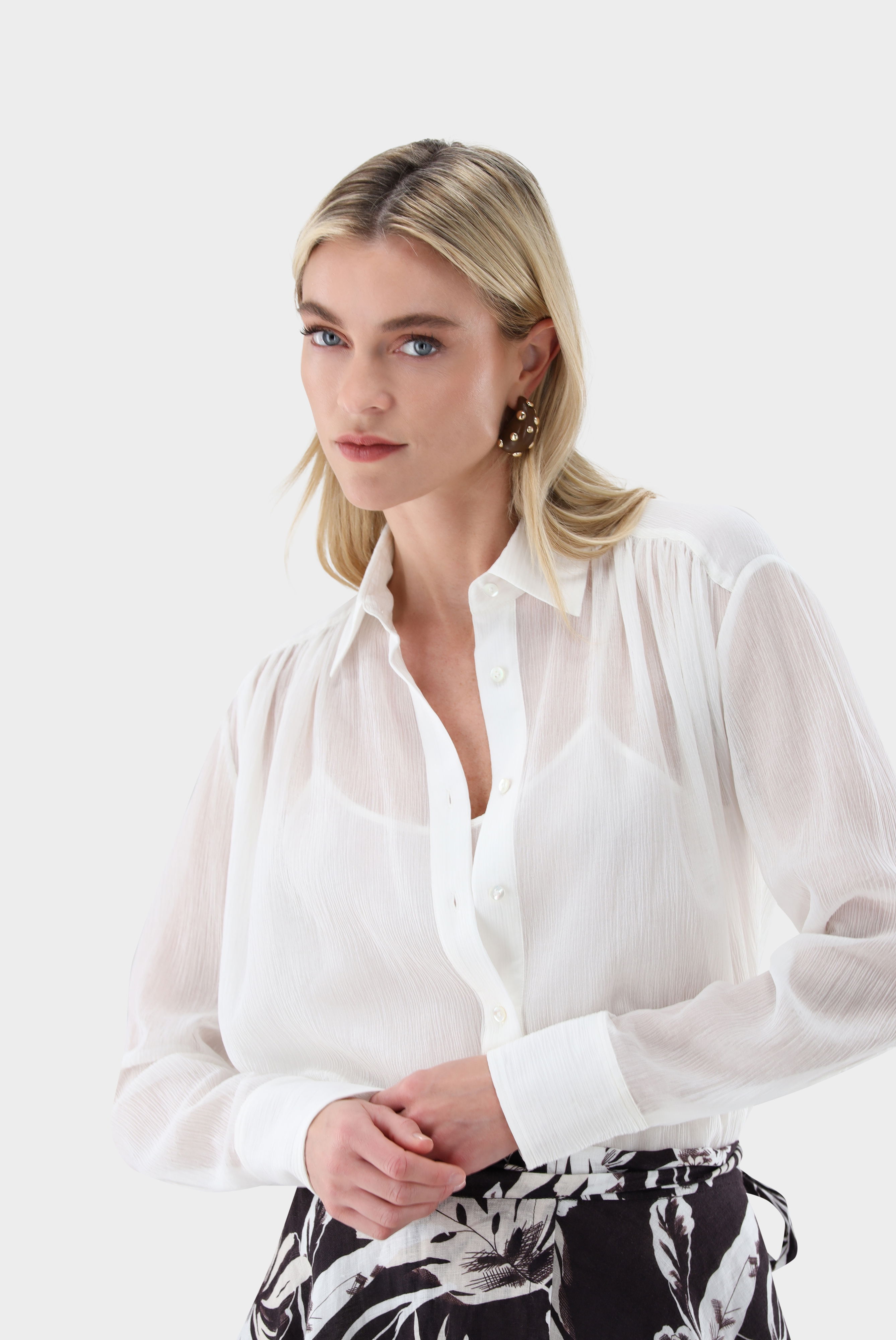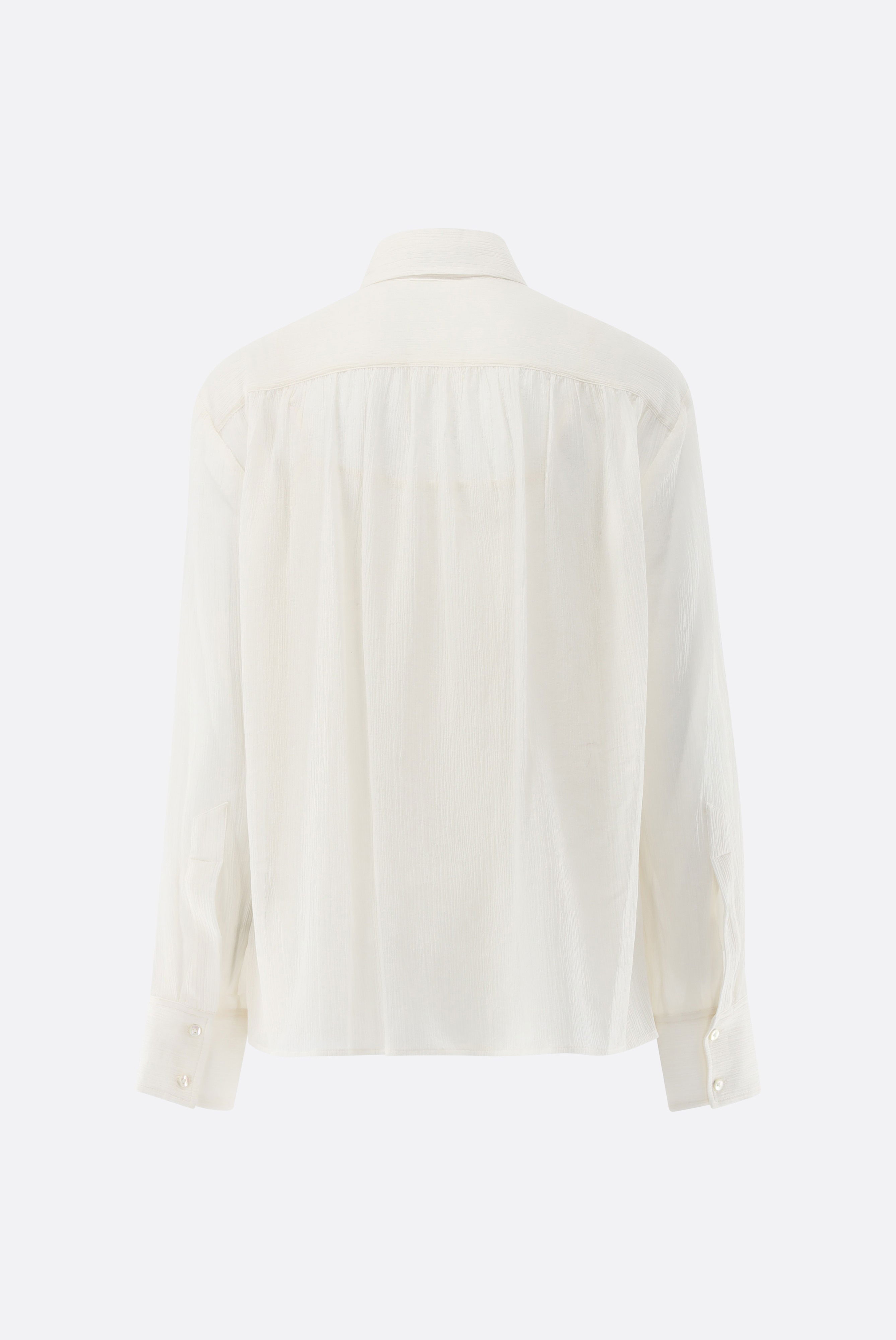 Diese locker geschnittene Hemdbluse aus einem Baumwoll-Seiden-Mix mit Crinkle-Effekt überzeugt durch einen eleganten, entspannten Look. Lange Ärmel, leicht überschnittene Schultern sowie Raffungen an Vorder- und Rückenpasse verleihen dem Modell Volumen und Komfort. Hochwertige Perlmuttknöpfe unterstreichen die edle Verarbeitung. Das weiche, atmungsaktive Material sorgt für angenehmes Tragegefühl und fließenden Fall. Vielseitig kombinierbar, eignet sich die Bluse ideal für stilvolle Freizeit-, Business- und sommerliche Casual-Looks.