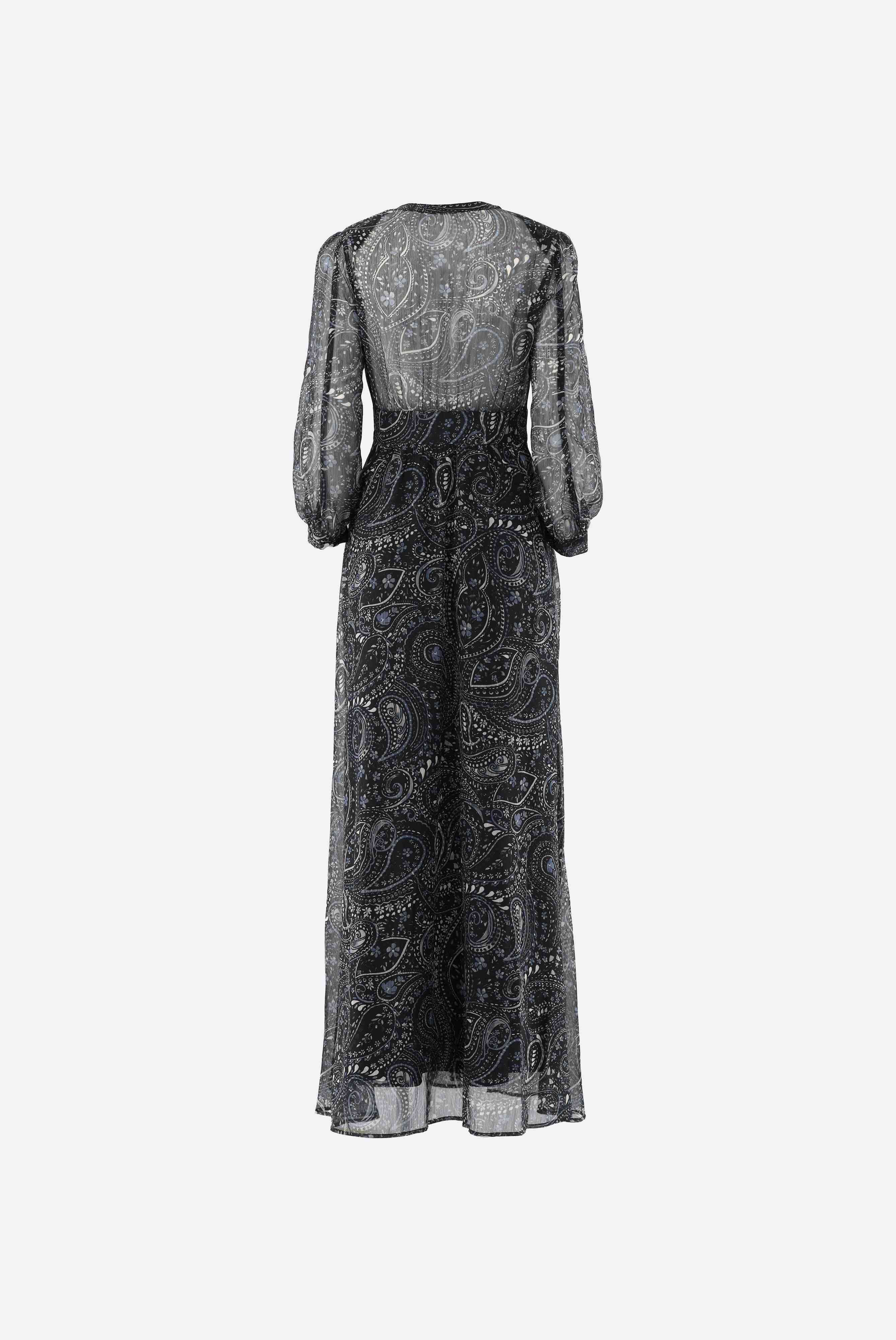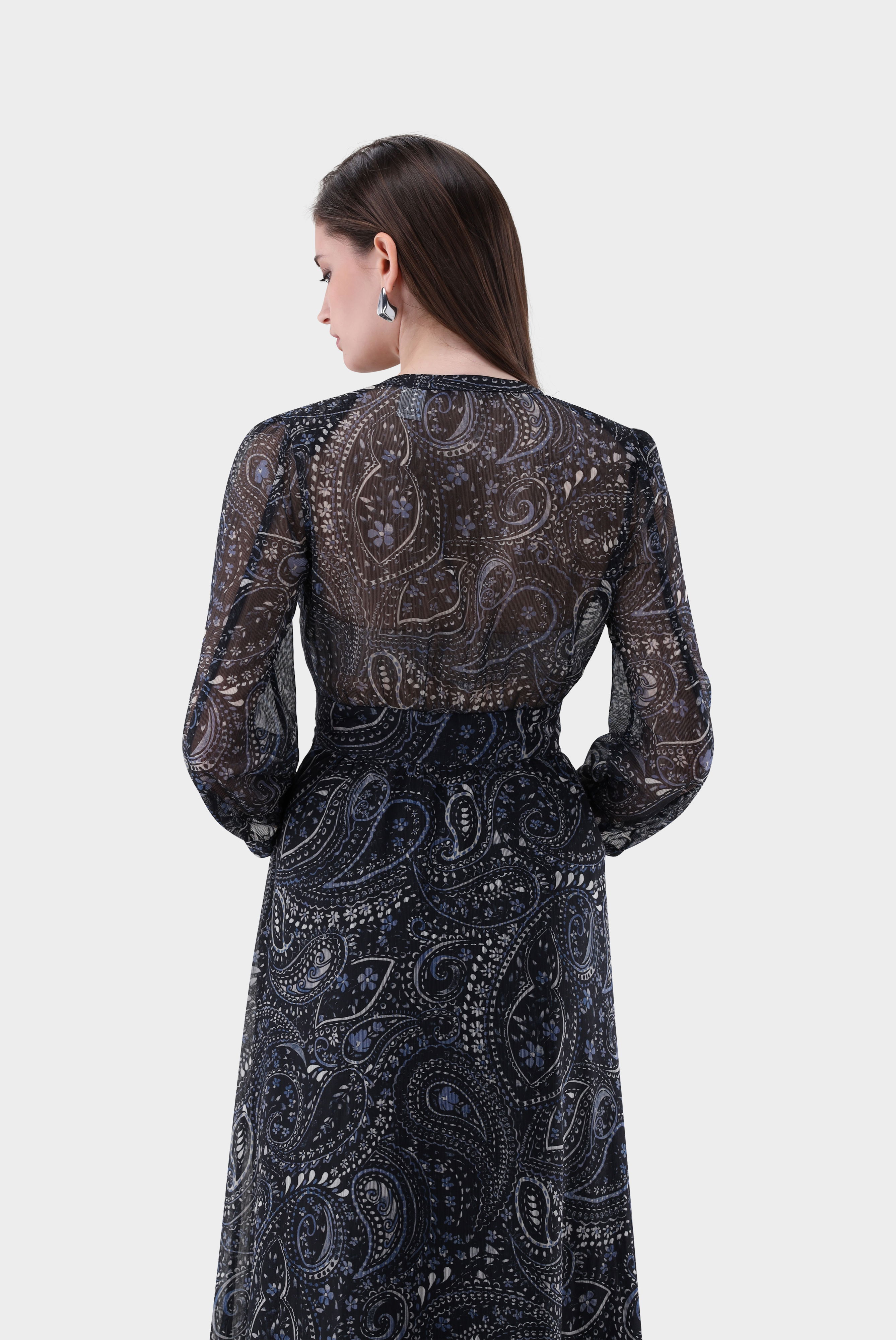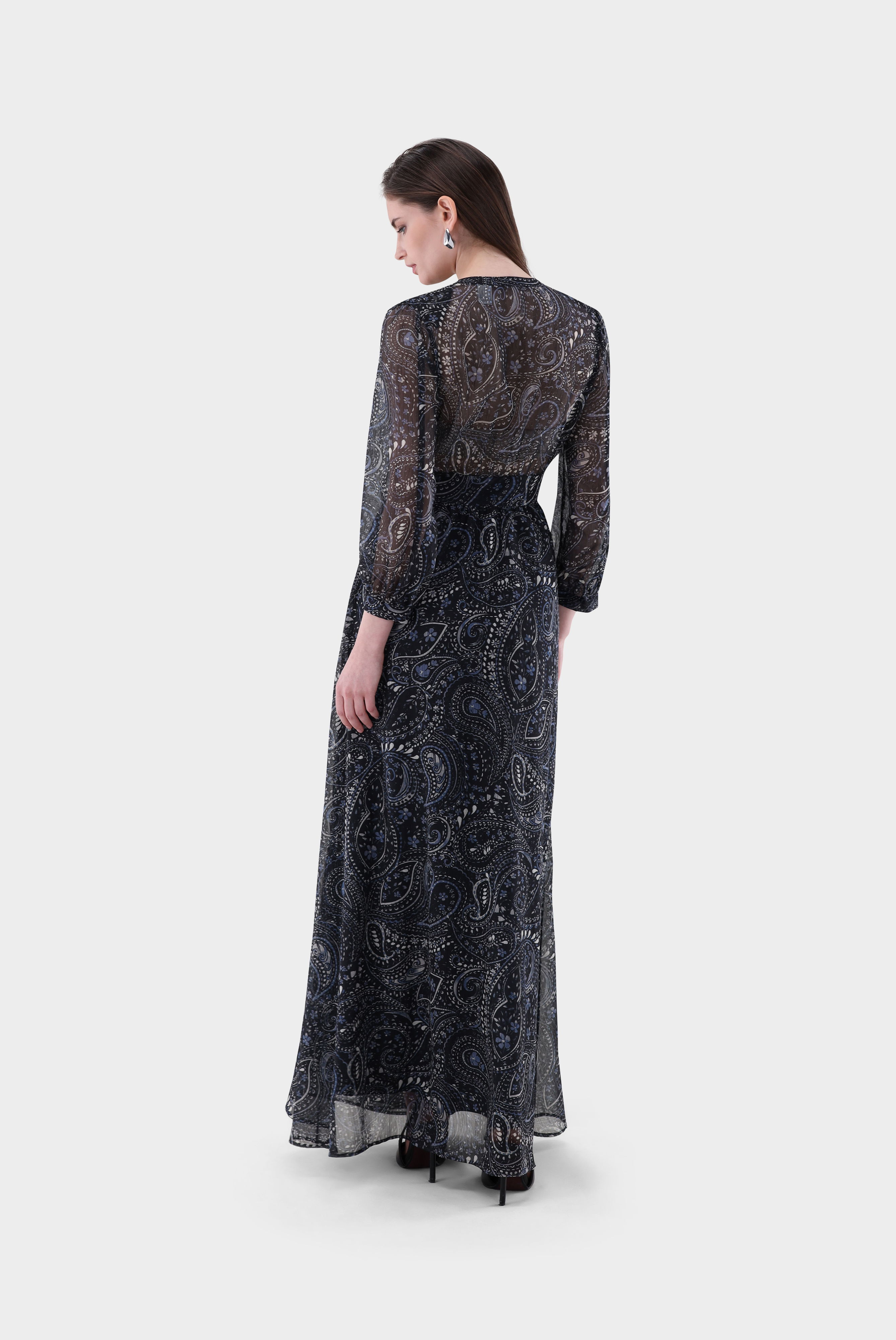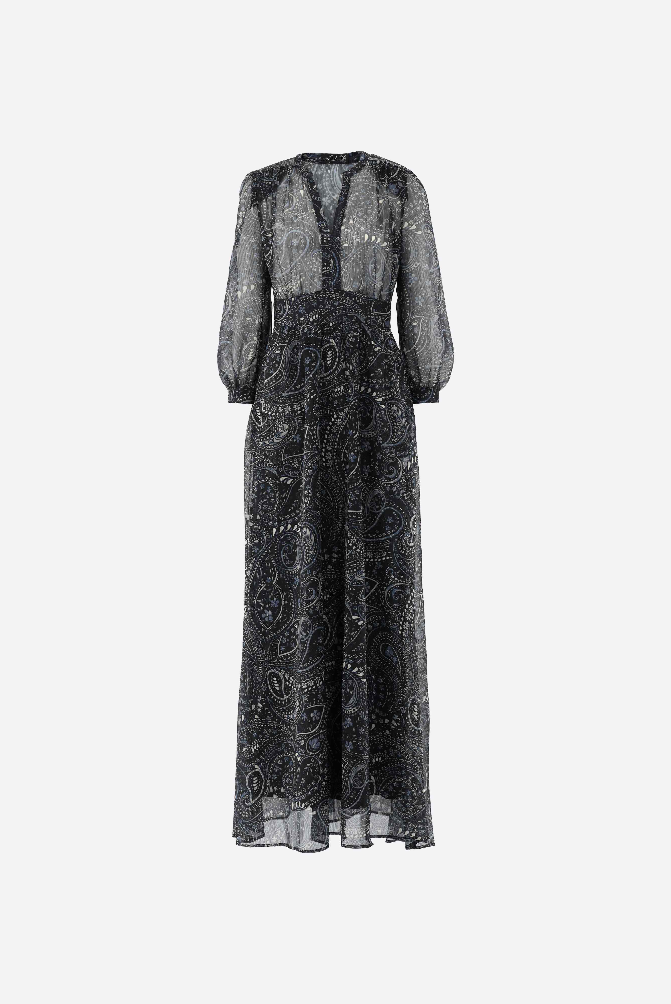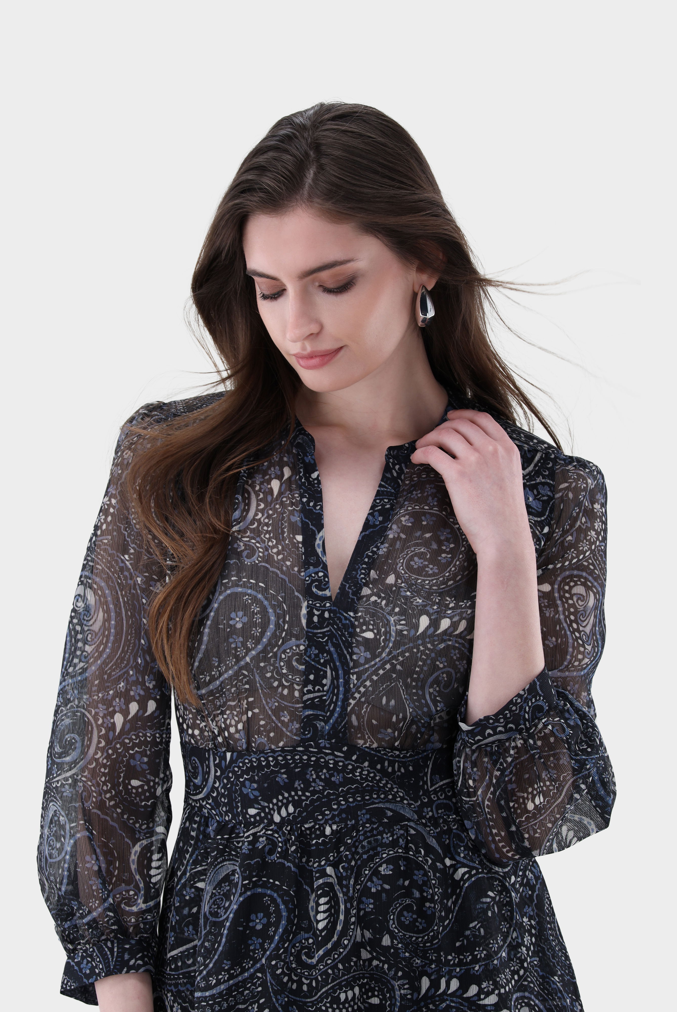 Das Maxi-Trägerkleid mit Paisley-Print besticht durch elegante Details und hohen Tragekomfort. 7/8-Ärmel mit Raffung an Manschetten, Taillenbund und Brustpasse sorgen für eine feminine Silhouette. Ein flacher Stehkragen und ein seitlicher Reißverschluss ergänzen das Design. Das halbtransparente Kleid ist gefüttert und mit praktischen Seitentaschen ausgestattet – ideal für stilvolle Auftritte zu besonderen oder festlichen Anlässen.