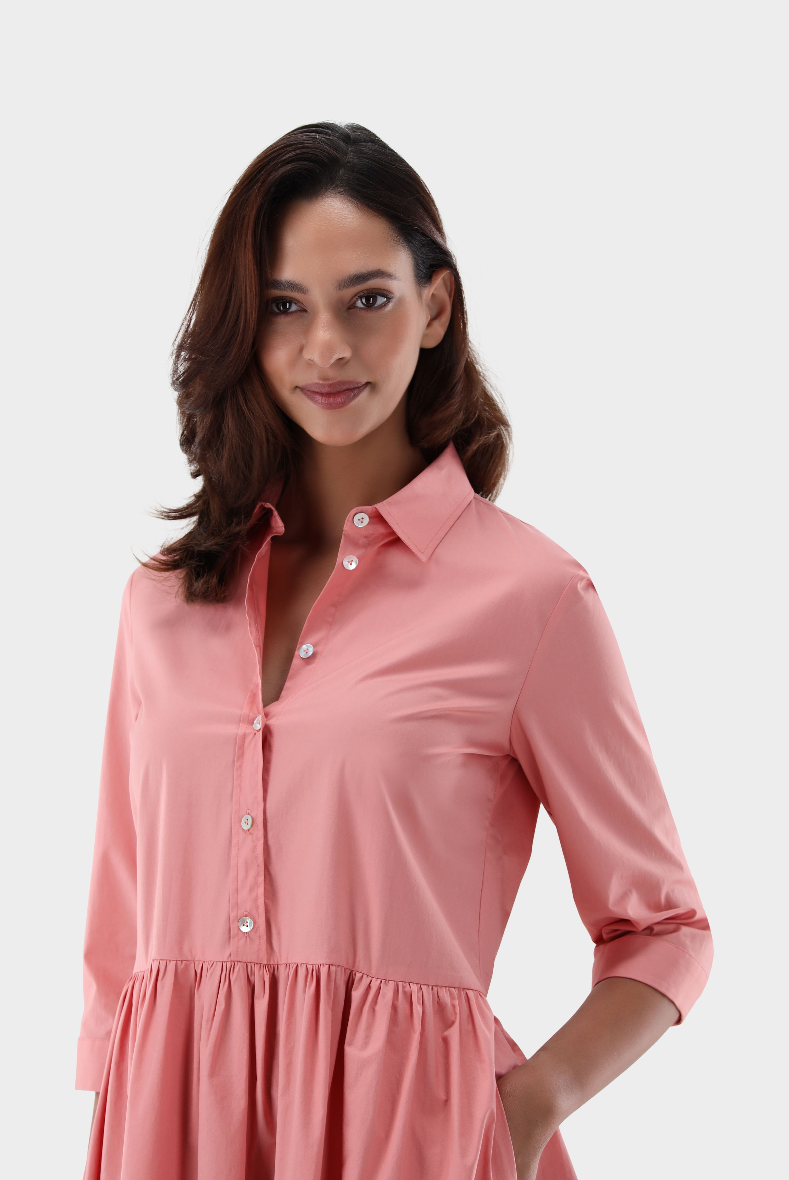 Dieses unkomplizierte Midi-Hängerkleid aus hochwertigem Baumwoll-Stretch mit „Paper Touch“-Oberfläche bietet sowohl Komfort als auch Stil. Der lockere Schnitt und die locker geraffte Taille sorgen für eine schmeichelhafte Passform, während die 7/8-Ärmel und die praktischen Seitentaschen dem Kleid eine lässige Note verleihen. Die eleganten Perlmuttknöpfe und der cleane Look machen es vielseitig einsetzbar für Casual- sowie Business-Looks. Perfekt für warme Tage oder den lässigen Büroauftritt.