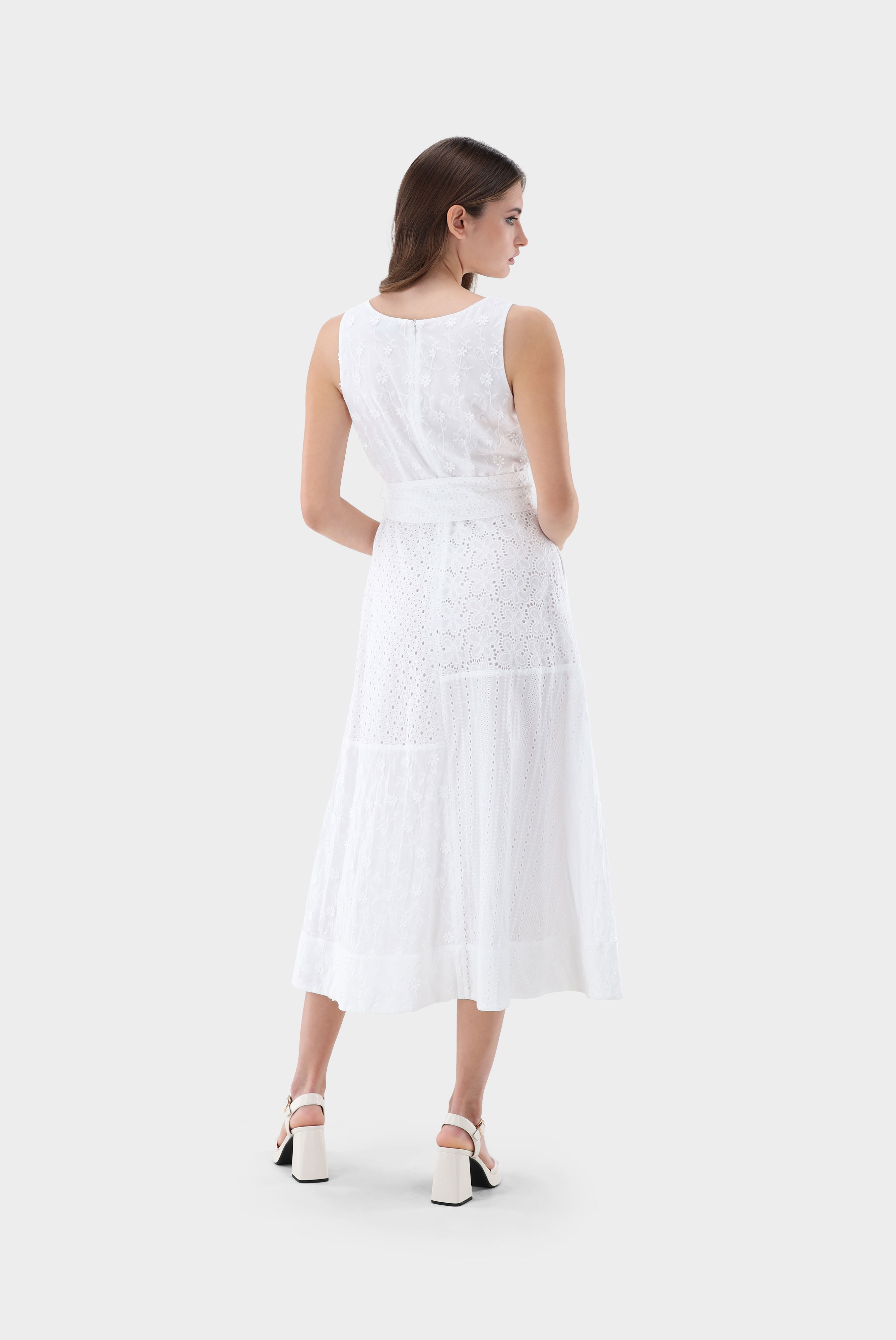 Dieses ärmellose Midi-Kleid aus hochwertiger Baumwolle überzeugt durch sein einzigartiges Patchwork-Design aus verschiedenen Lochstickereien. Der ausgestellte Rock, die taillierte Passform und der Rundhalsausschnitt schaffen eine elegante und feminine Silhouette. Das Kleid verfügt über seitliche Taschen für praktischen Komfort und einen selbstbindenden Gürtel, der die Taille betont. Der Reißverschluss am Rücken ermöglicht ein einfaches Anziehen, während das vollständig gefütterte Design für ein angenehmes Tragegefühl sorgt. Perfekt für sommerliche Partys oder legere Anlässe.