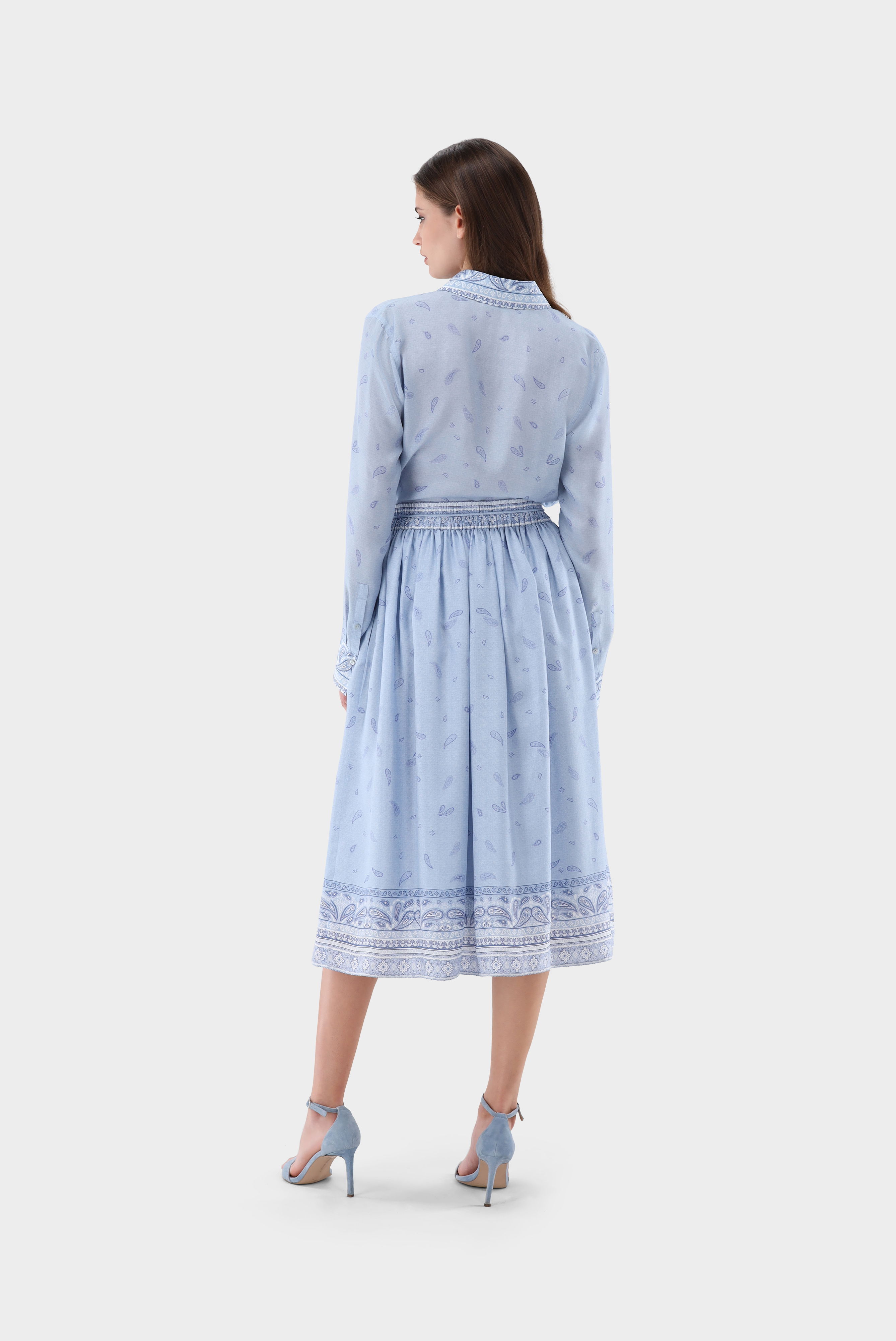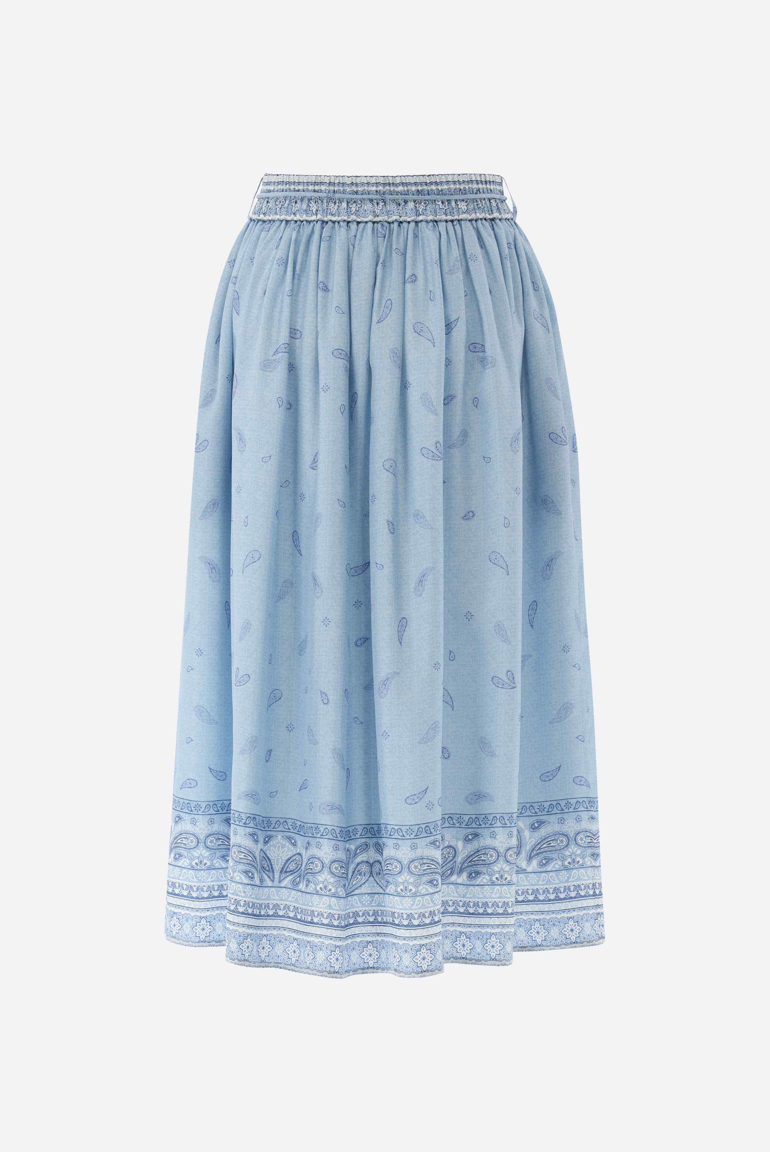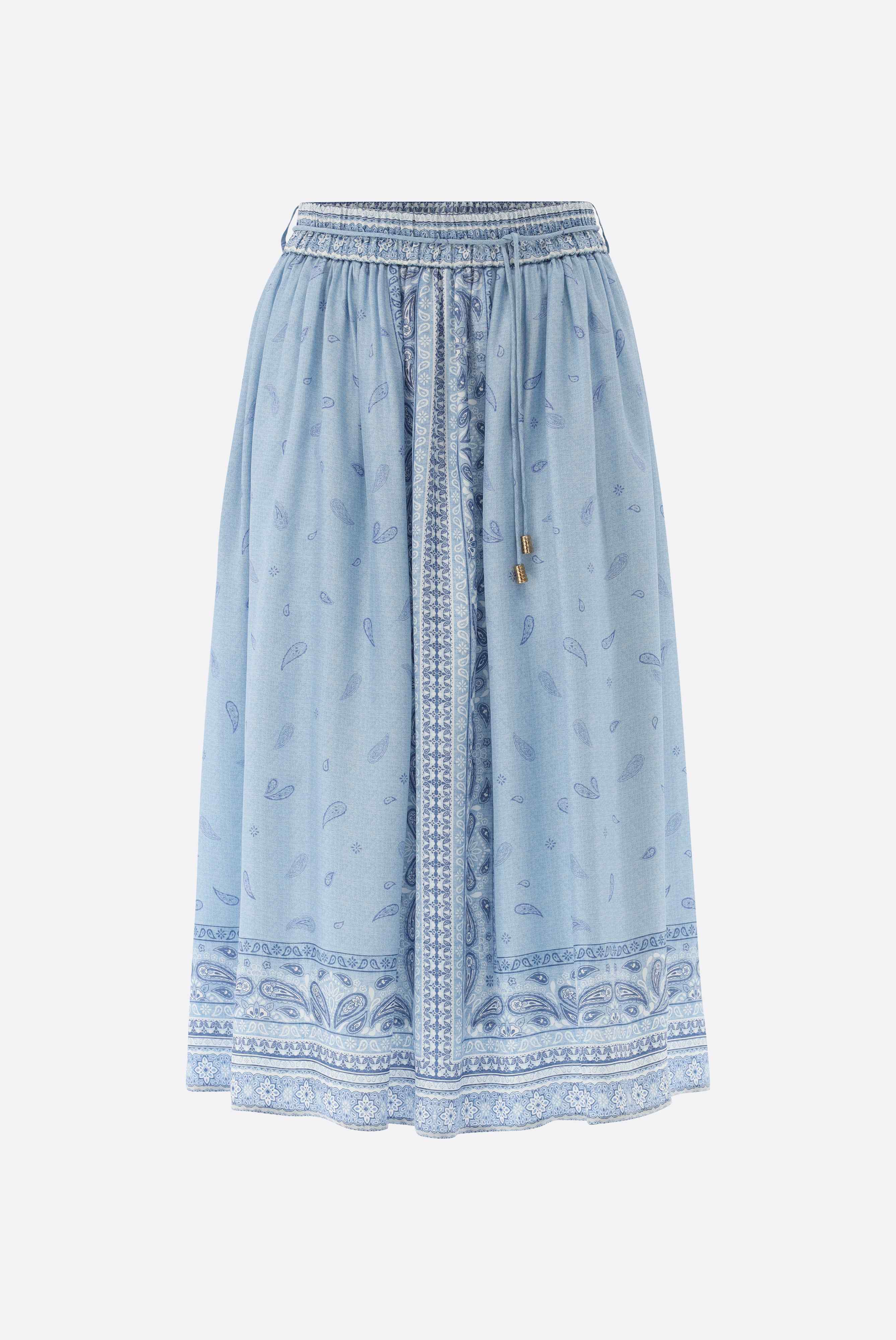Der ausgestellte Midi-Rock mit elastischem Bund verbindet elegantes Design mit einem platzierten TuchDruck in Jeansoptik. Gefertigt aus hochwertigem Habotai, einem leichten und weichen Seidenstoff, der ursprünglich für Kimonos verwendet wurde, bietet der Rock eine fließende Silhouette und luxuriösen Komfort. Ein loser Bindegürtel mit Schmuckelementen am Ende betont die Taille. Seitentaschen und der auffällige Bandana-Druck machen den Rock zu einem stilvollen Highlight – ideal für Sommerlooks, Strandoutfits oder besondere Anlässe. Als total Look lässt er sich ideal mit der Bluse CELLISA-PX kombinieren.