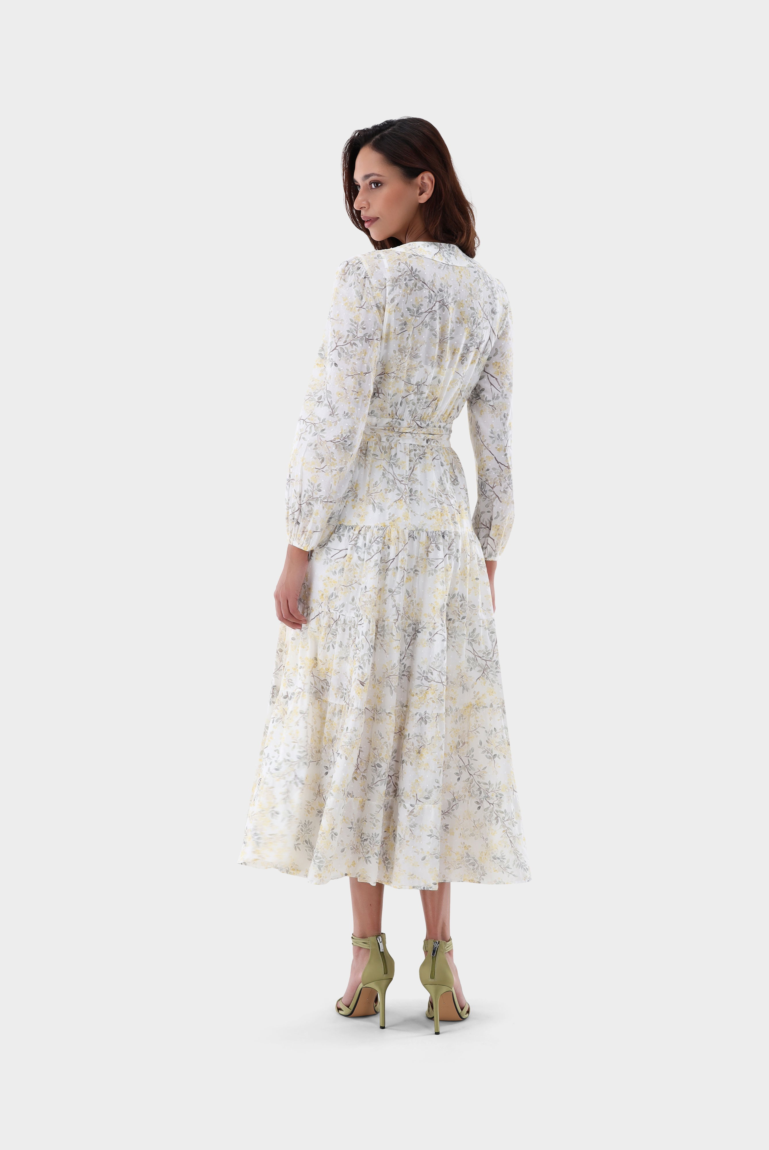 Das mittellange Sommerkleid ist aus einem besonder leichten Baumwoll-Plumetis gefertigt und ist ausgestellt geschnitten. Plumetis ist ein leichter Baumwoll Batist mit kleinen, erhabenen Punkten die an Federn oder Wolken erinnern. Das Kleid zeigt sich im Stufen-Look mit 5 Volants und ist somit besonder aufwändig in der Verarbeitung. Der V-Ausschnitt, die Ballonärmel und ein Wickelband runden den eleganten Look ab. Zudem verfügt es über einen dezenten Blumendruck. Ein auffallend schönes Sommerkleid – lässig elegant und mit dem luftig leichten Tragekomfort.