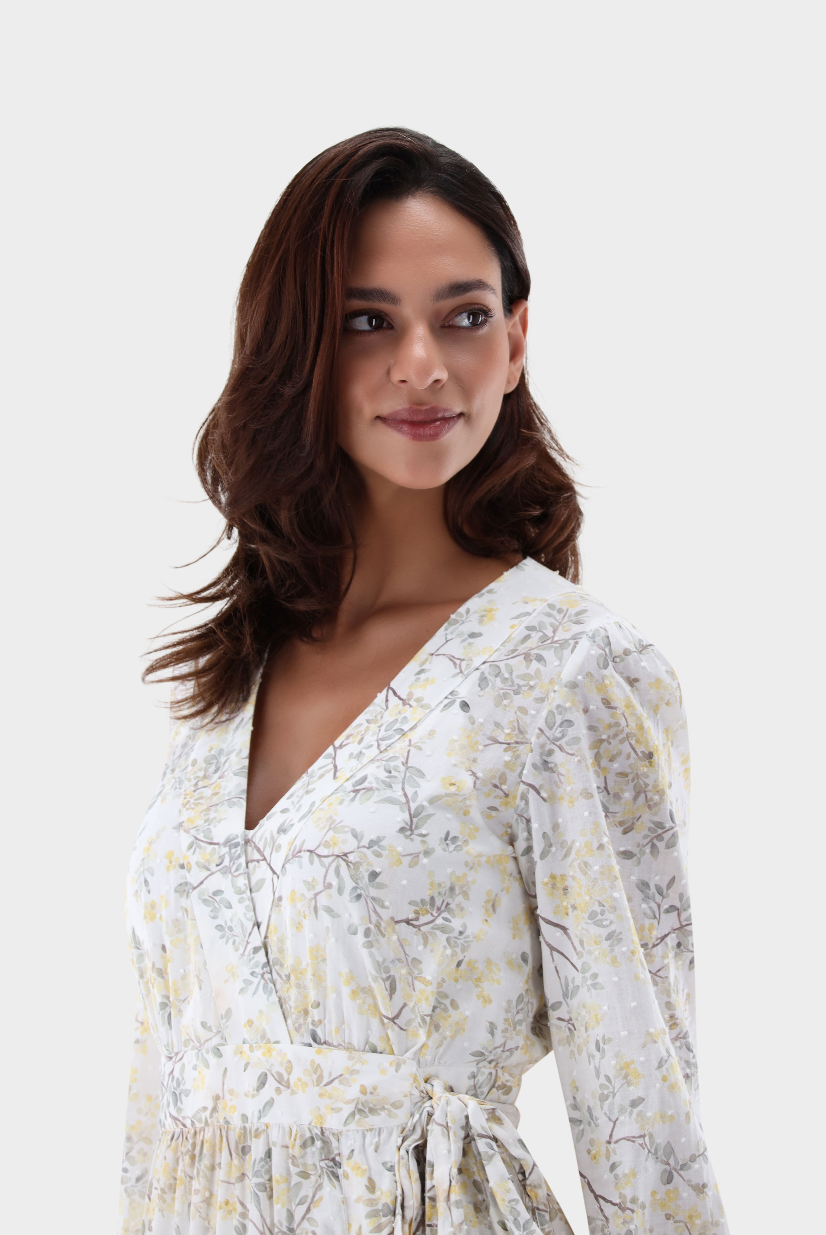 Look aus Midi-Wickelkleid mit Puffärmeln