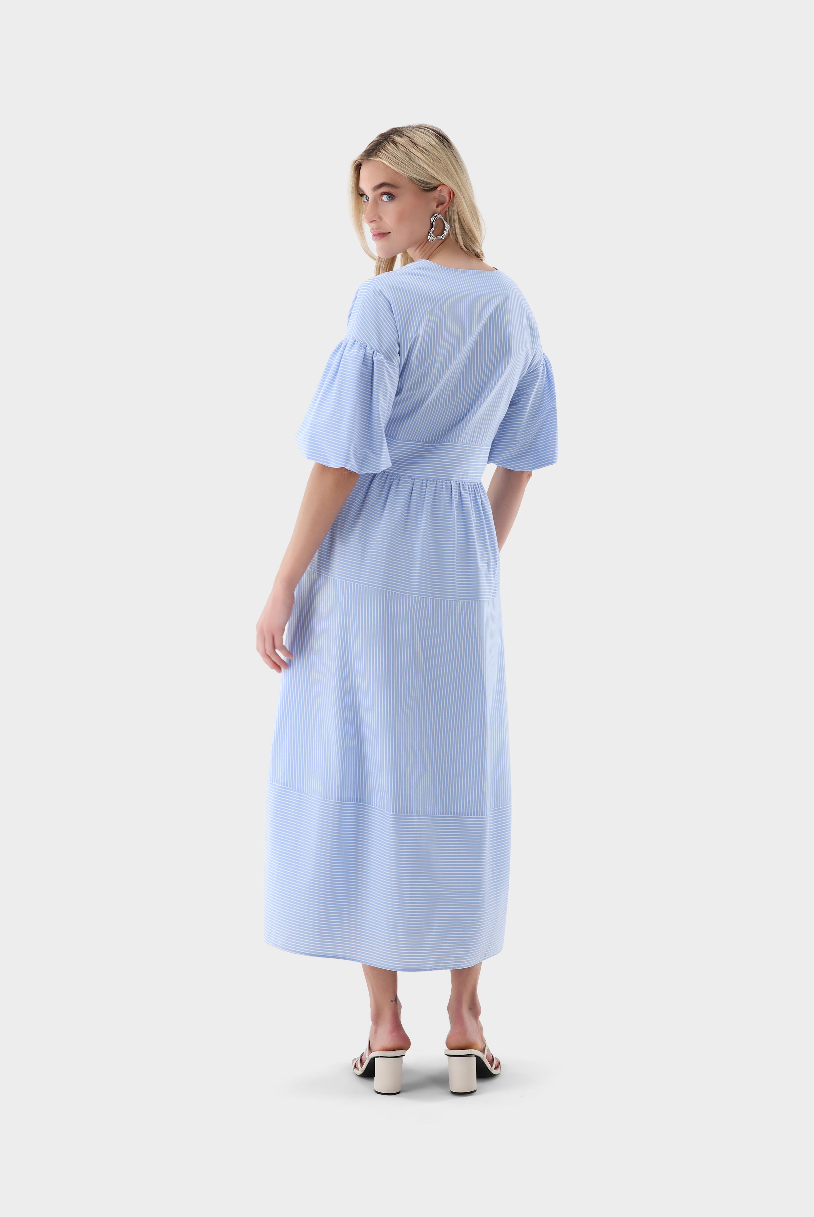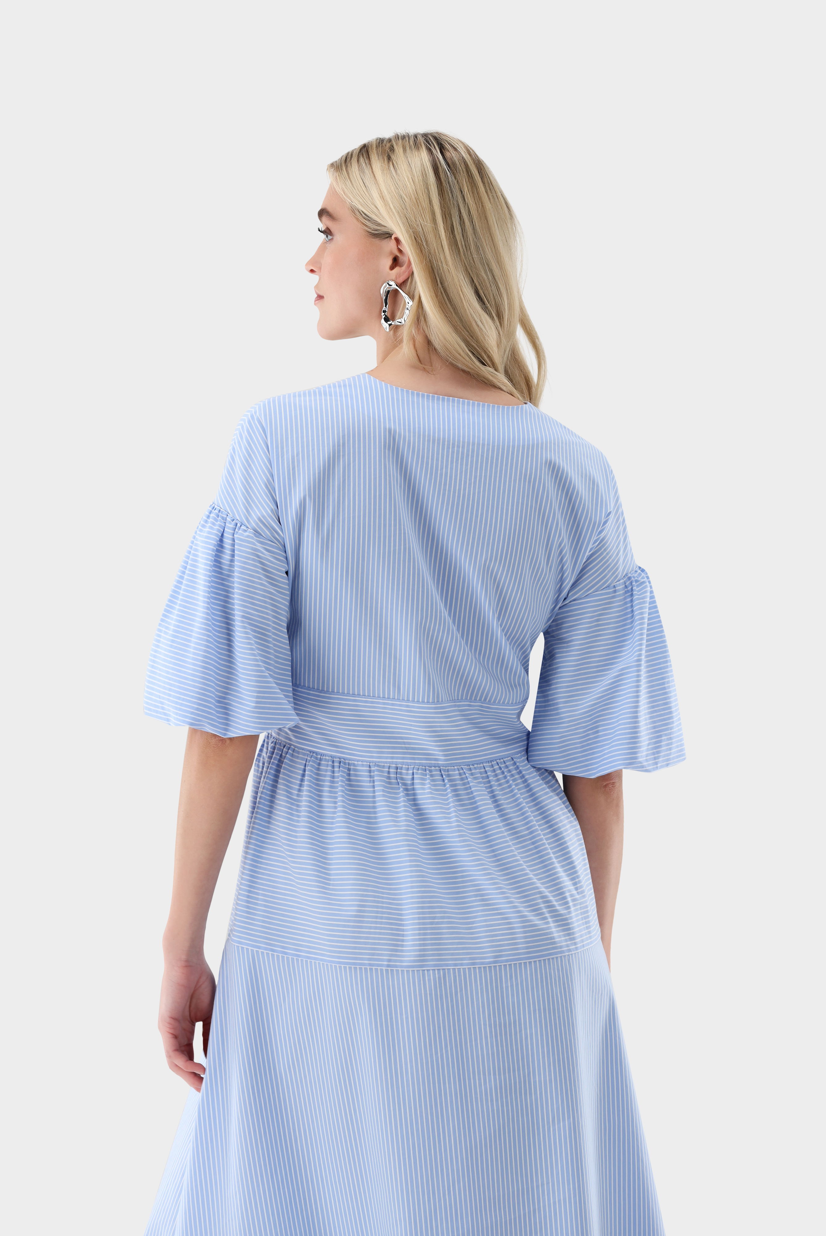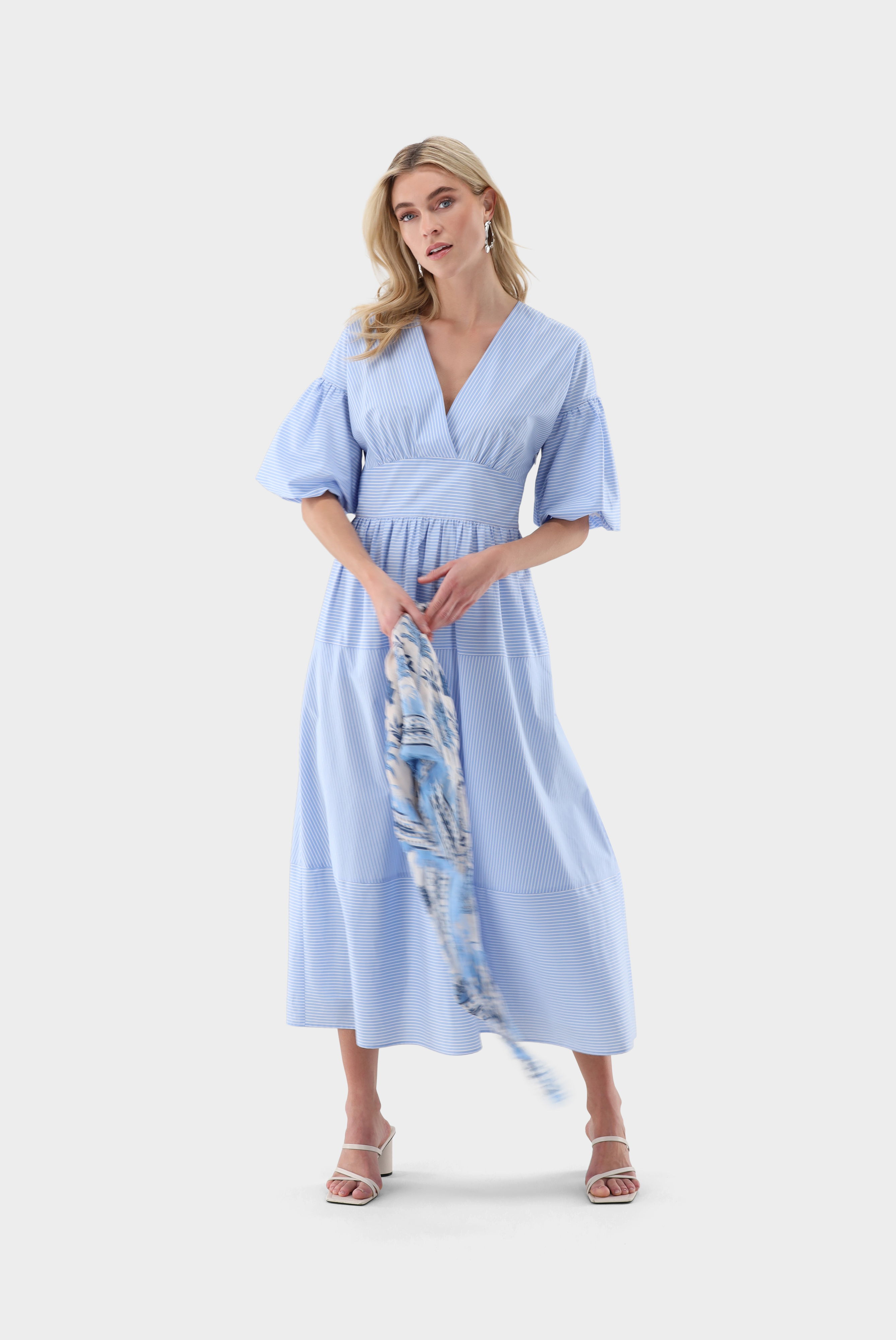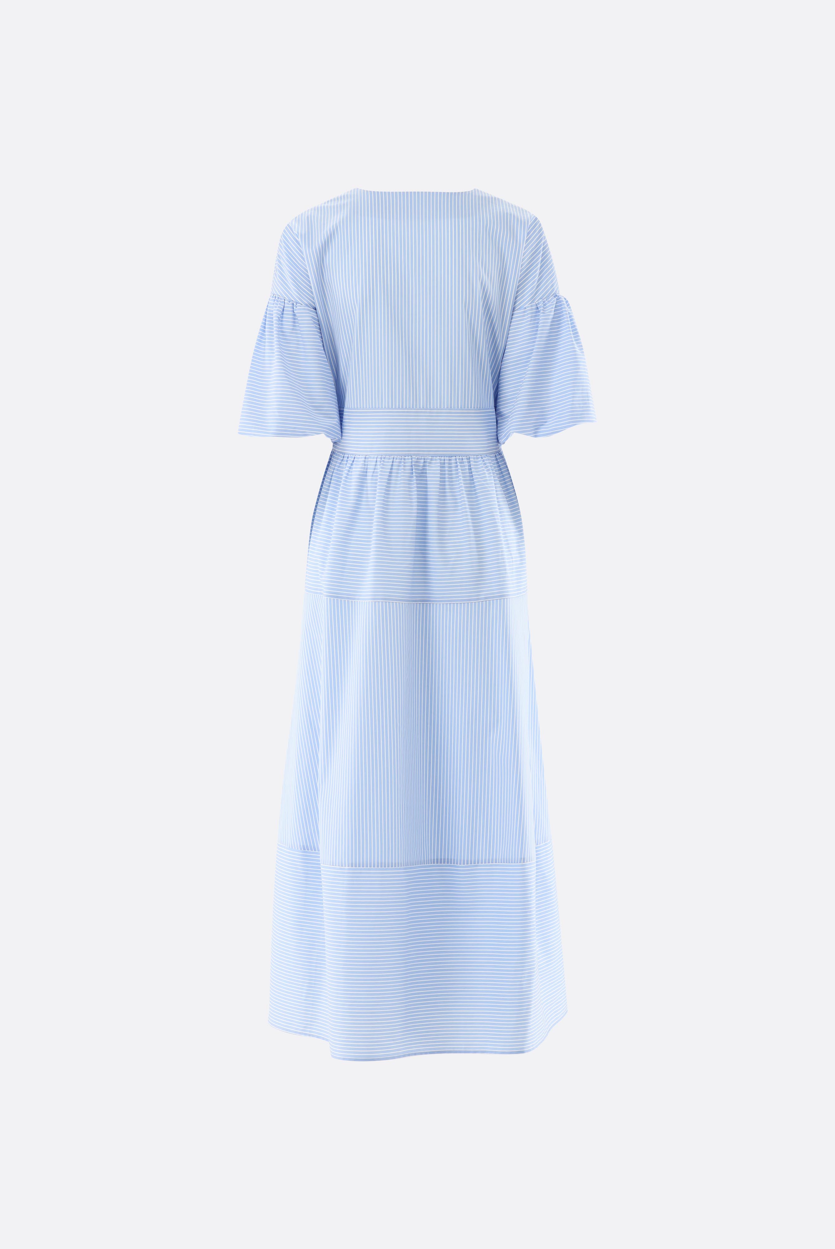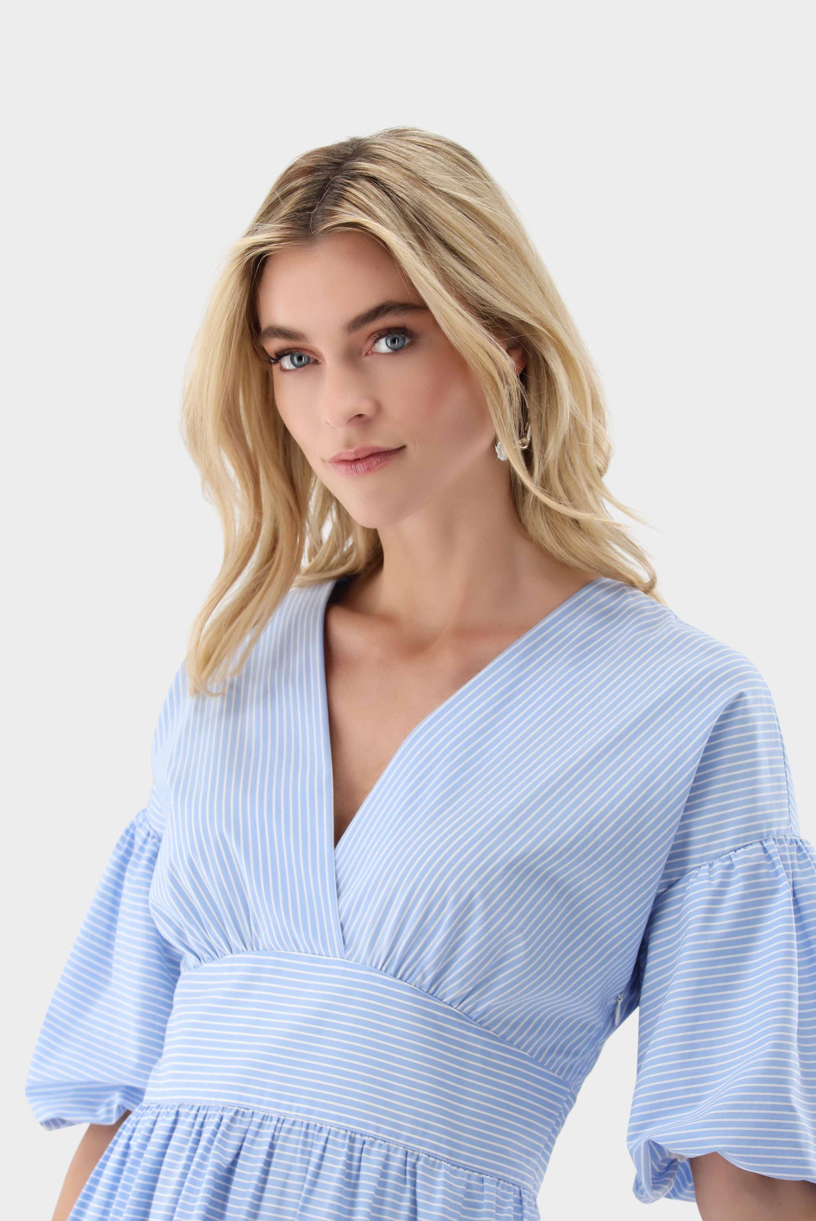 Dieses Midi-Schlupfkleid aus gestreifter Baumwollpopeline verbindet feminine Silhouette mit hohem Tragekomfort. Der V-Ausschnitt sorgt für eine elegante Linienführung, während der geraffte Taillenbund die Figur vorteilhaft betont. Voluminöse 3/4-Ärmel mit elastischen Bündchen setzen moderne Akzente. Der ausgestellte Rock fällt weich und schafft eine harmonische Bewegung. Das atmungsaktive, fein gewebte Material macht das Kleid ideal für stilvolle Alltags- und Sommerlooks.
