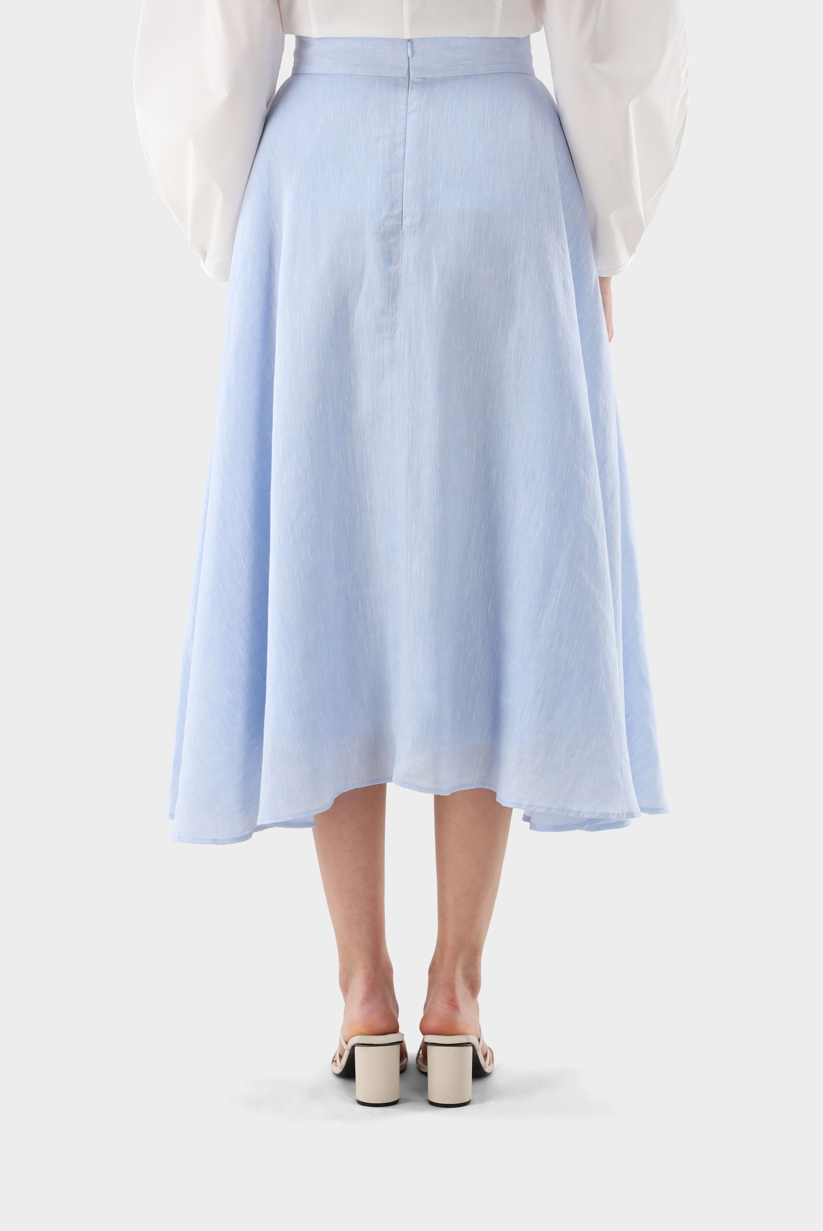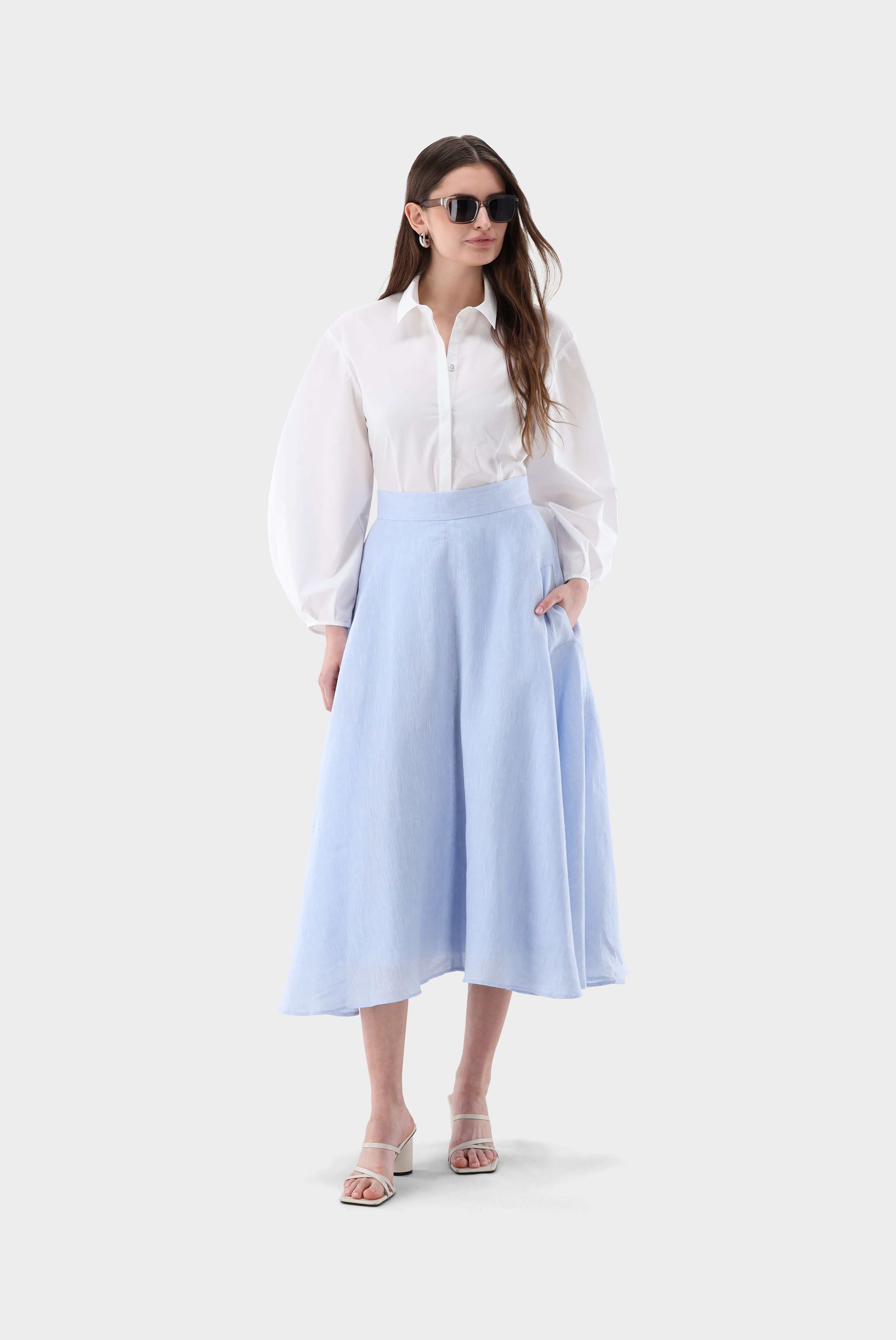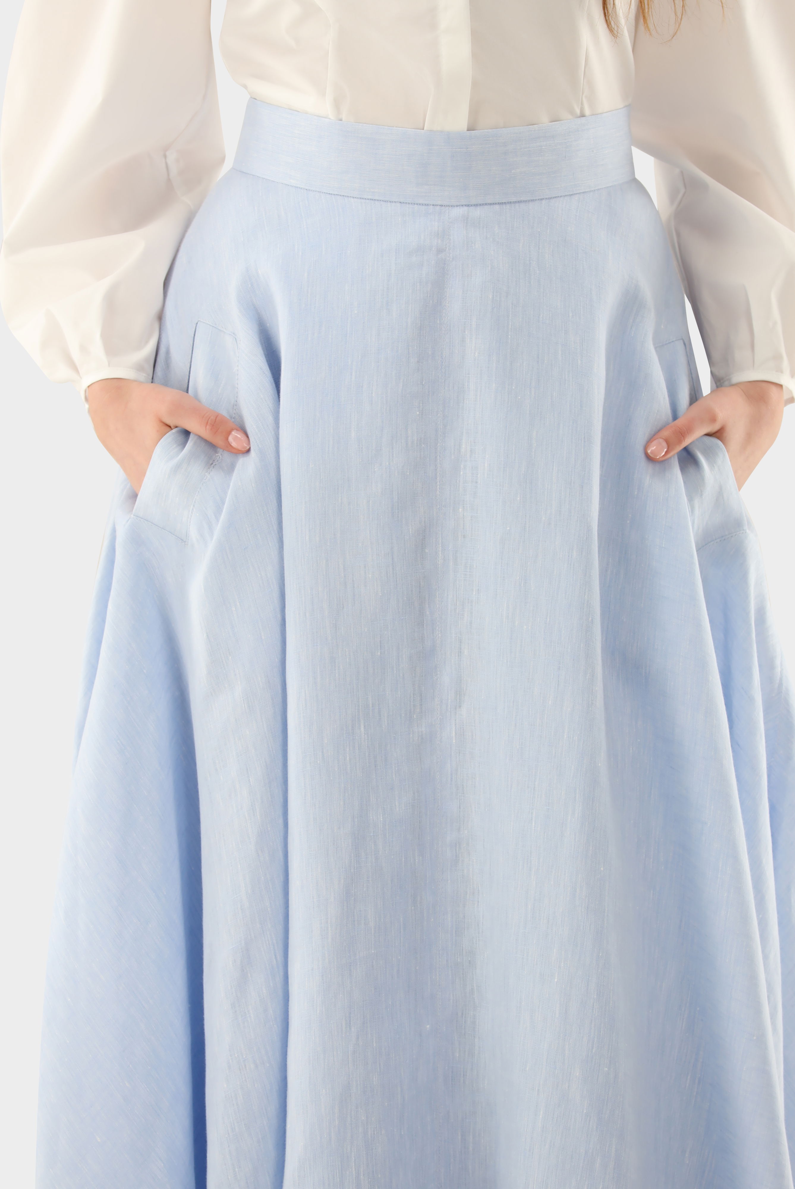 Dieser ausgestellte Midirock überzeugt durch seine feminine Silhouette und natürliche Leichtigkeit. Praktische Eingrifftaschen vorne sowie ein Reißverschluss im Rücken sorgen für Funktionalität und angenehmen Sitz. Gefertigt aus einfarbig gefärbtem Leinen bietet der Rock eine luftige, atmungsaktive Qualität und hohen Tragekomfort. Vielseitig kombinierbar, eignet er sich ideal für sommerliche Casual- und stilvolle Alltags-Looks mit entspannter, eleganter Ausstrahlung.