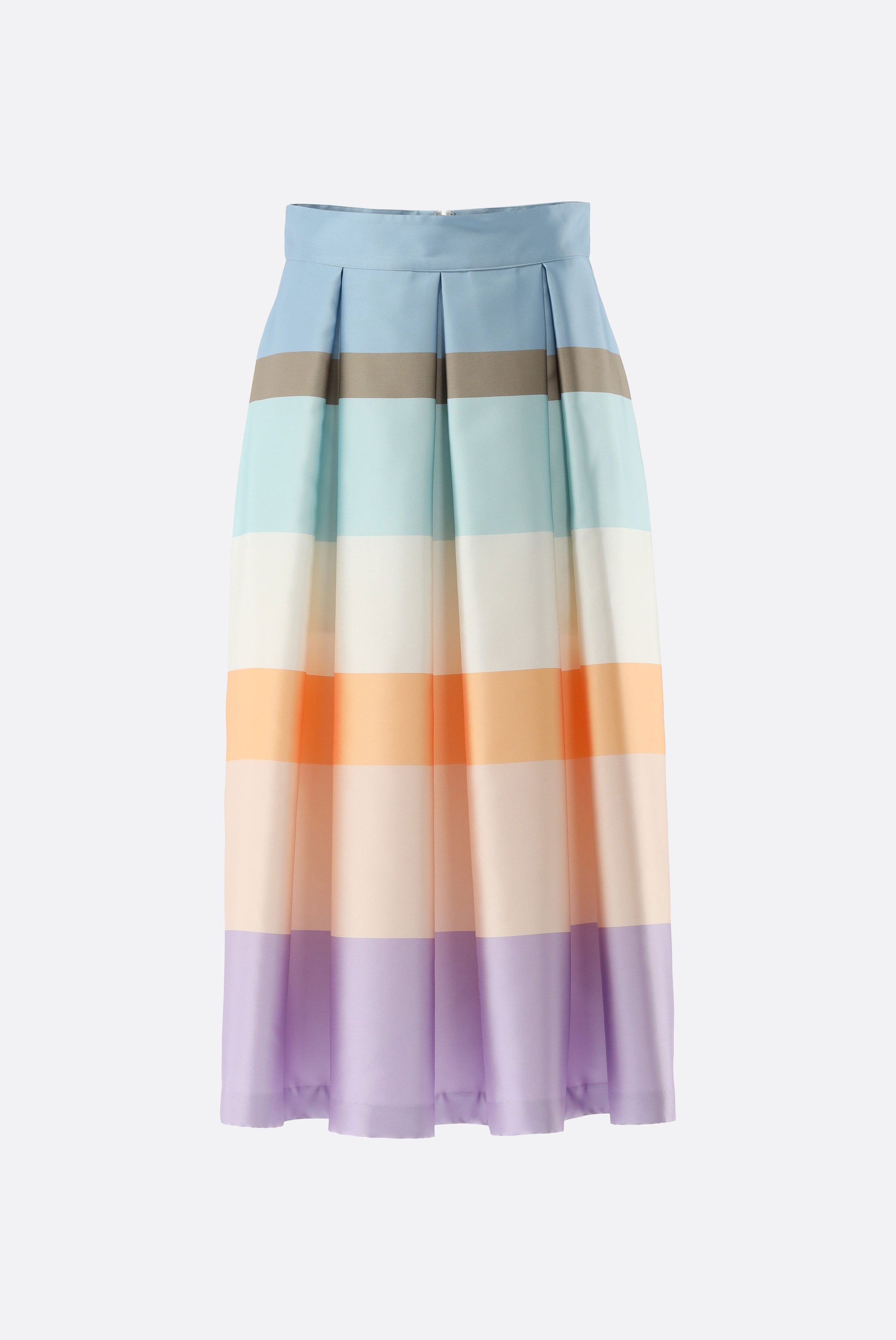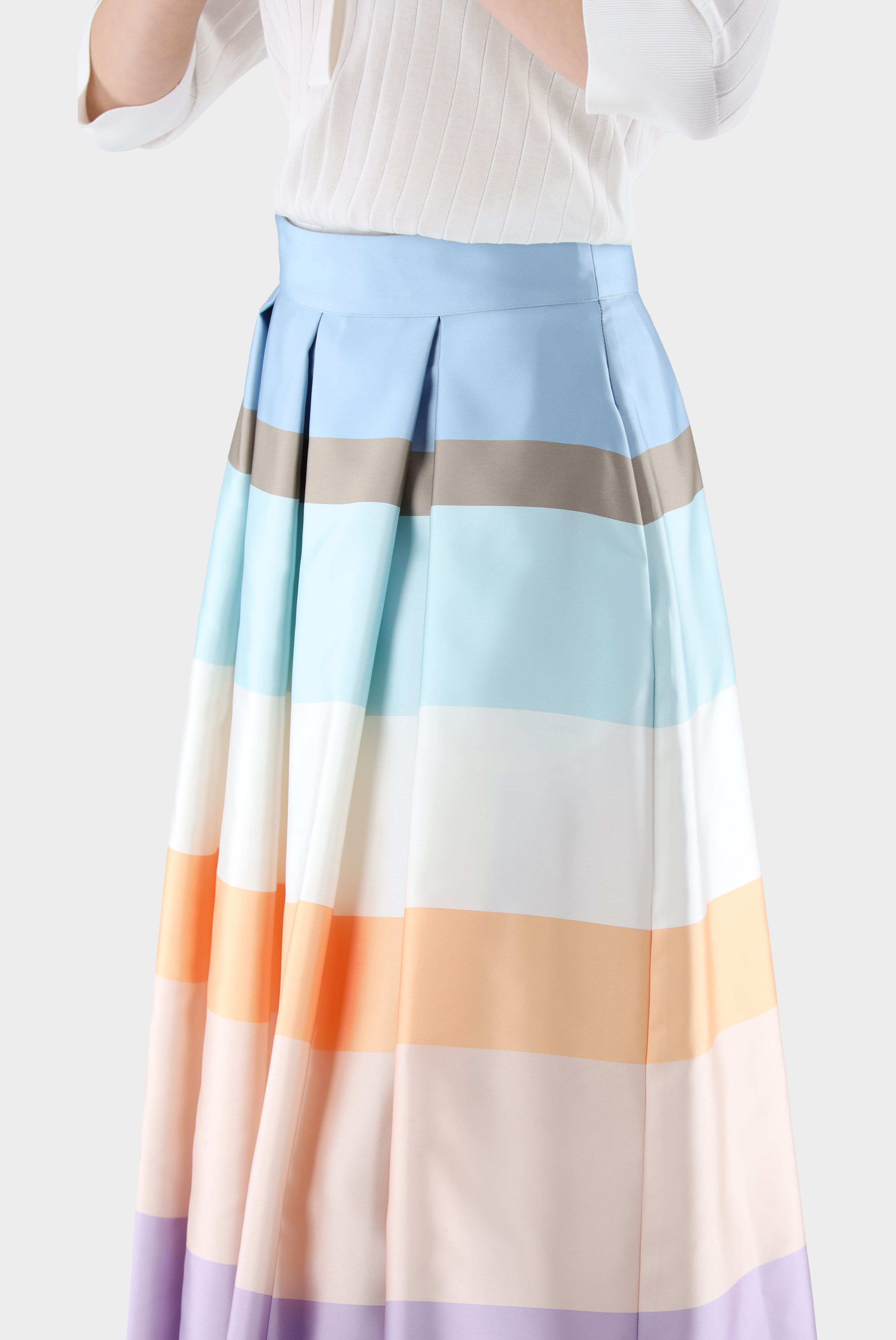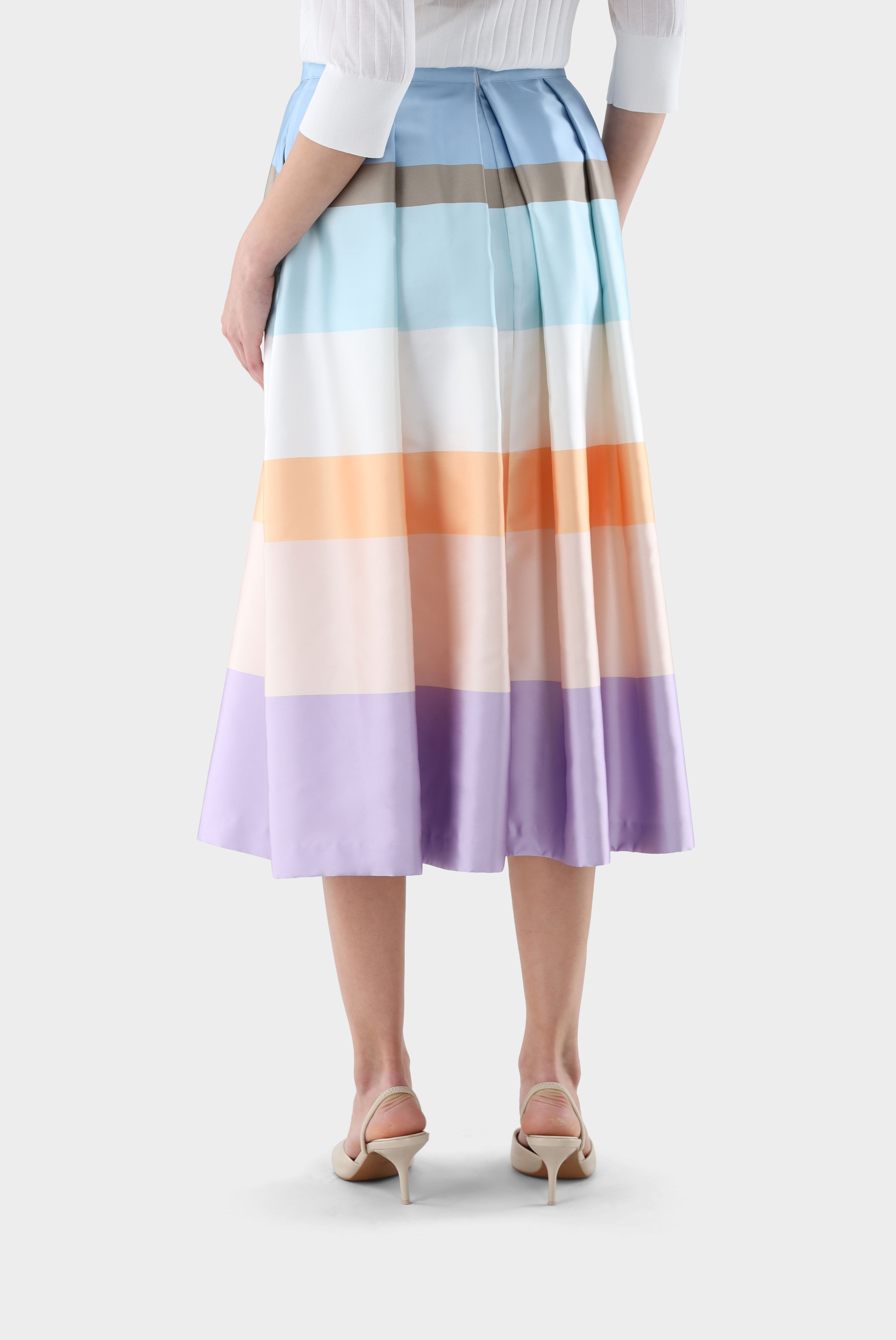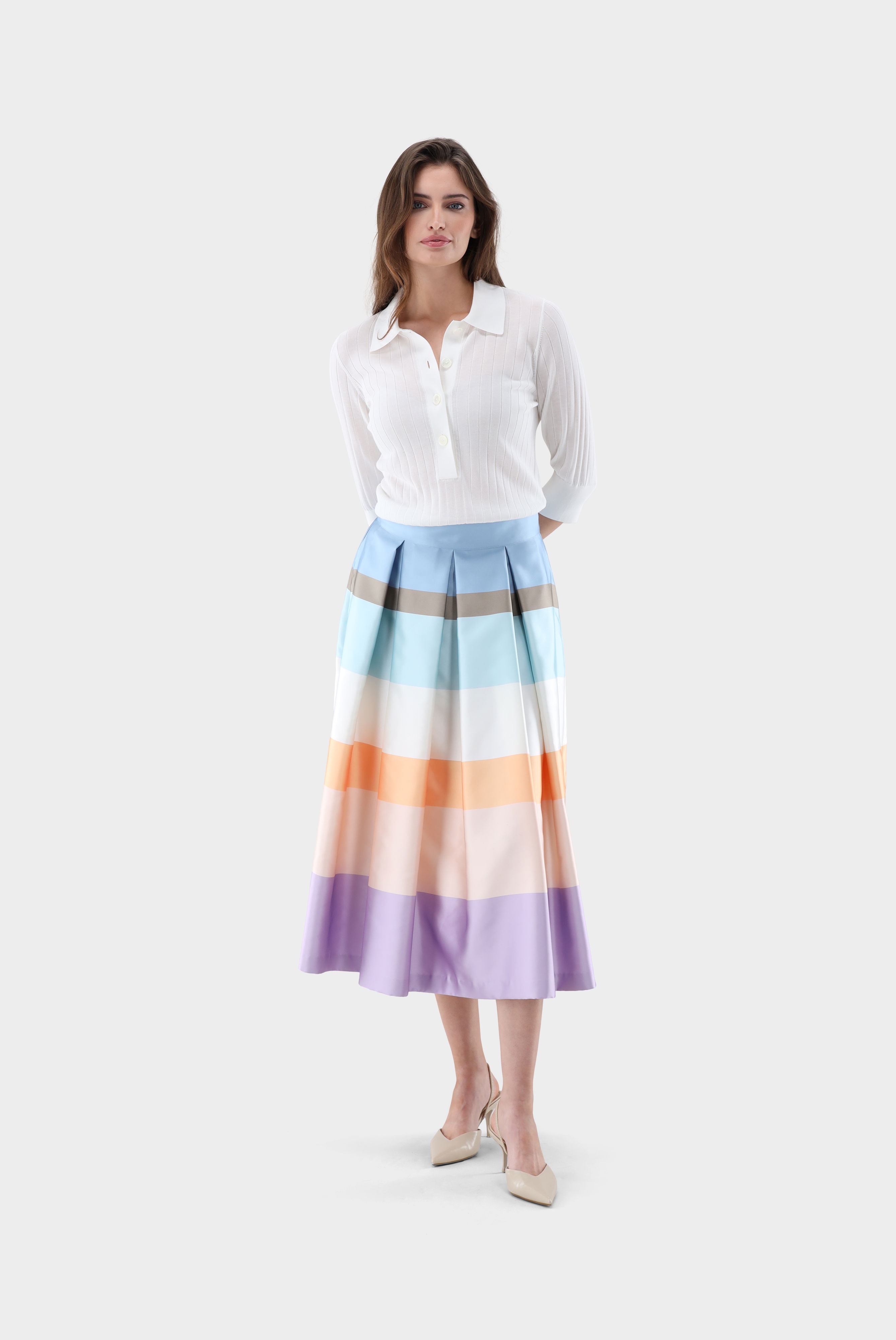 Moderner ausgestellter Midirock mit eleganter Passform und fließender Bewegung. Hinten sorgt ein unsichtbarer Reißverschluss für eine dezente, saubere Linie, während praktische Seitentaschen den Tragekomfort erhöhen. Das Modell begeistert mit einem bunten Streifenmuster, der jedem Outfit einen lebendigen und sommerlichen Look verleiht. Ungefüttert und vielseitig kombinierbar – ideal für stilvolle Anlässe oder als Eyecatcher im Alltag.