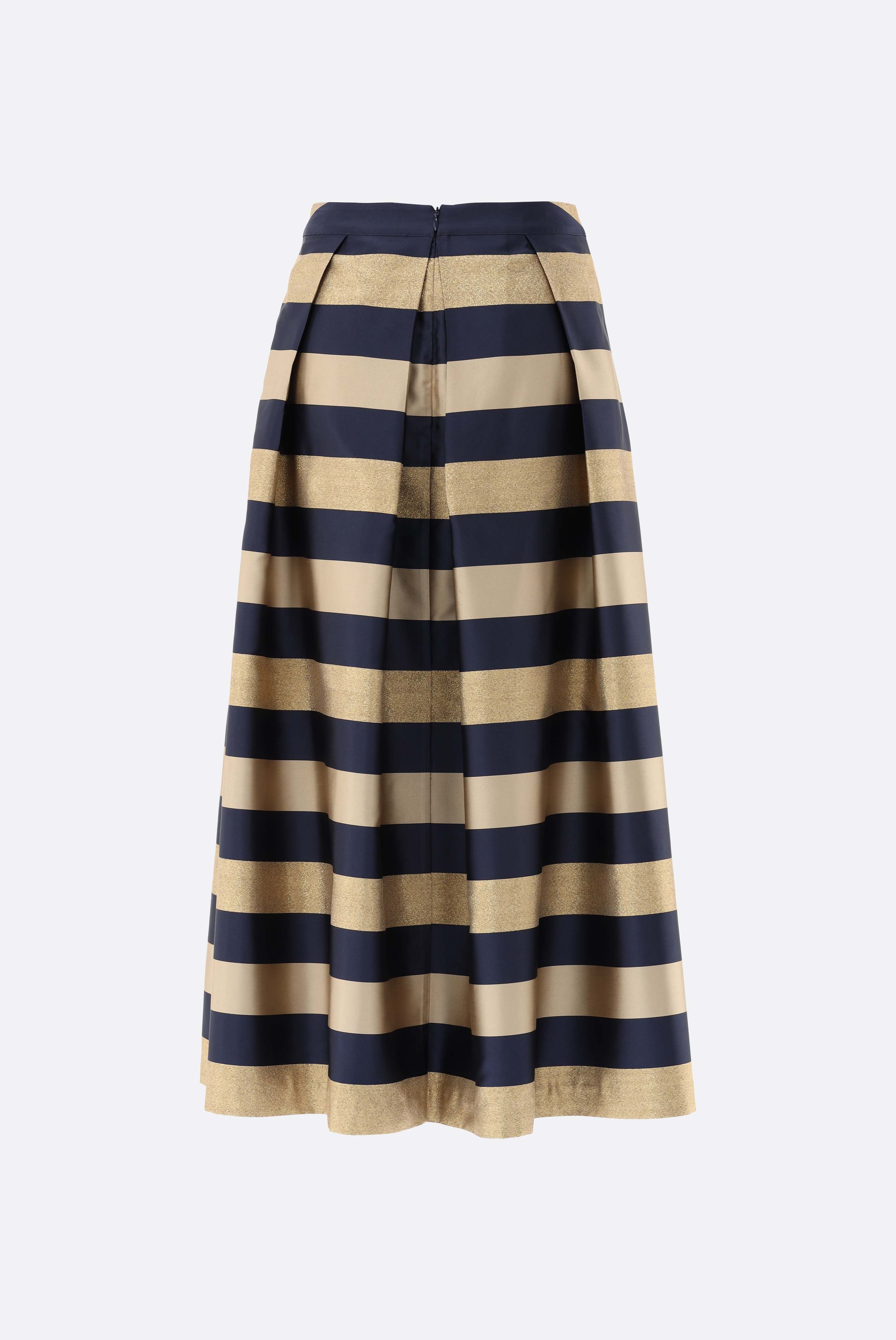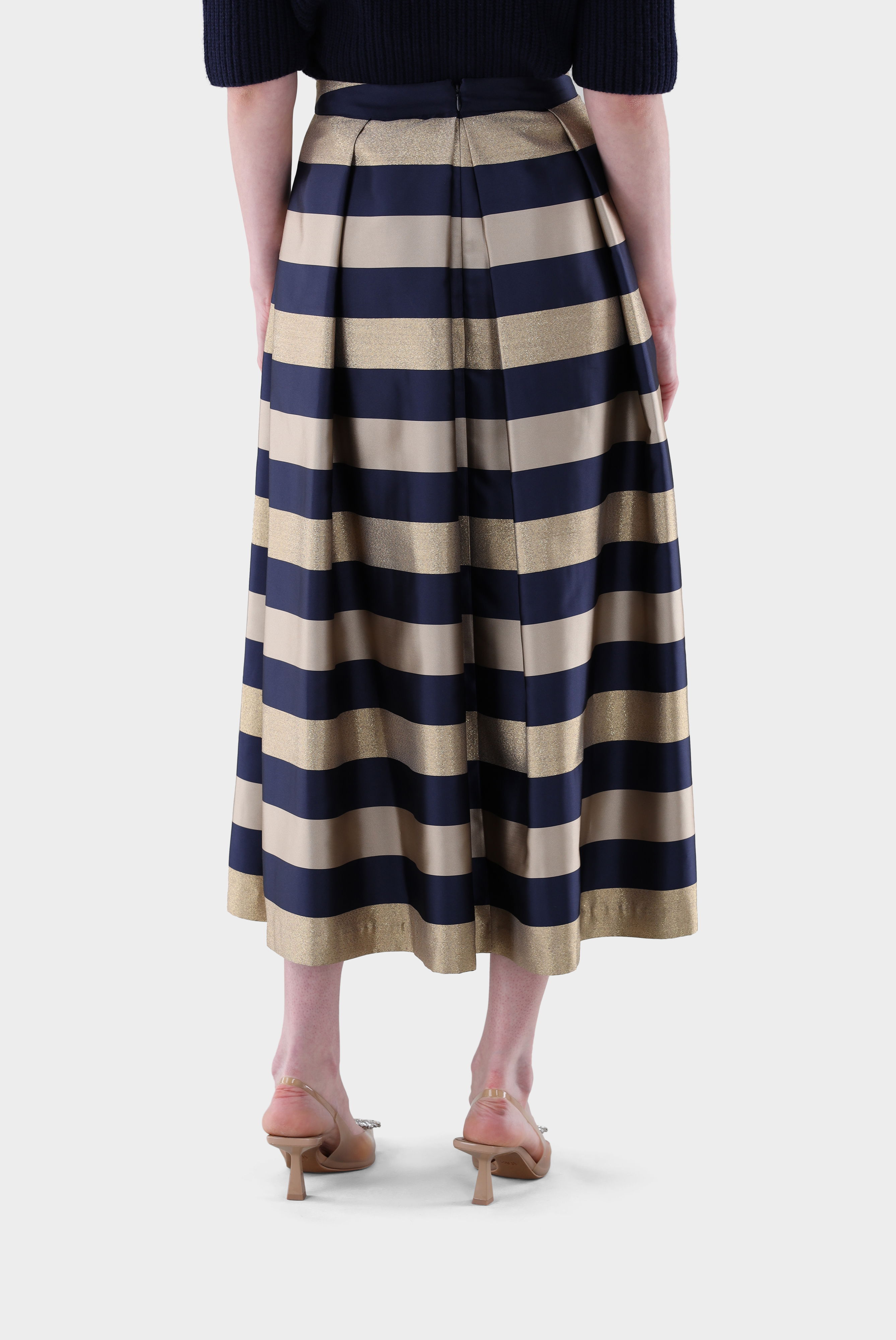 Moderner ausgestellter Midirock mit eleganter Passform und fließender Bewegung. Hinten sorgt ein unsichtbarer Reißverschluss für eine dezente, saubere Linie, während praktische Seitentaschen den Tragekomfort erhöhen. Gefertigt aus einer hochwertigen Polyester-Lurex-Mischung, begeistert das Modell mit glitzerndem Streifen-Jacquard, der jedem Outfit einen edlen Akzent verleiht. Ungefüttert und vielseitig kombinierbar – ideal für stilvolle Anlässe oder als Eyecatcher im Alltag.