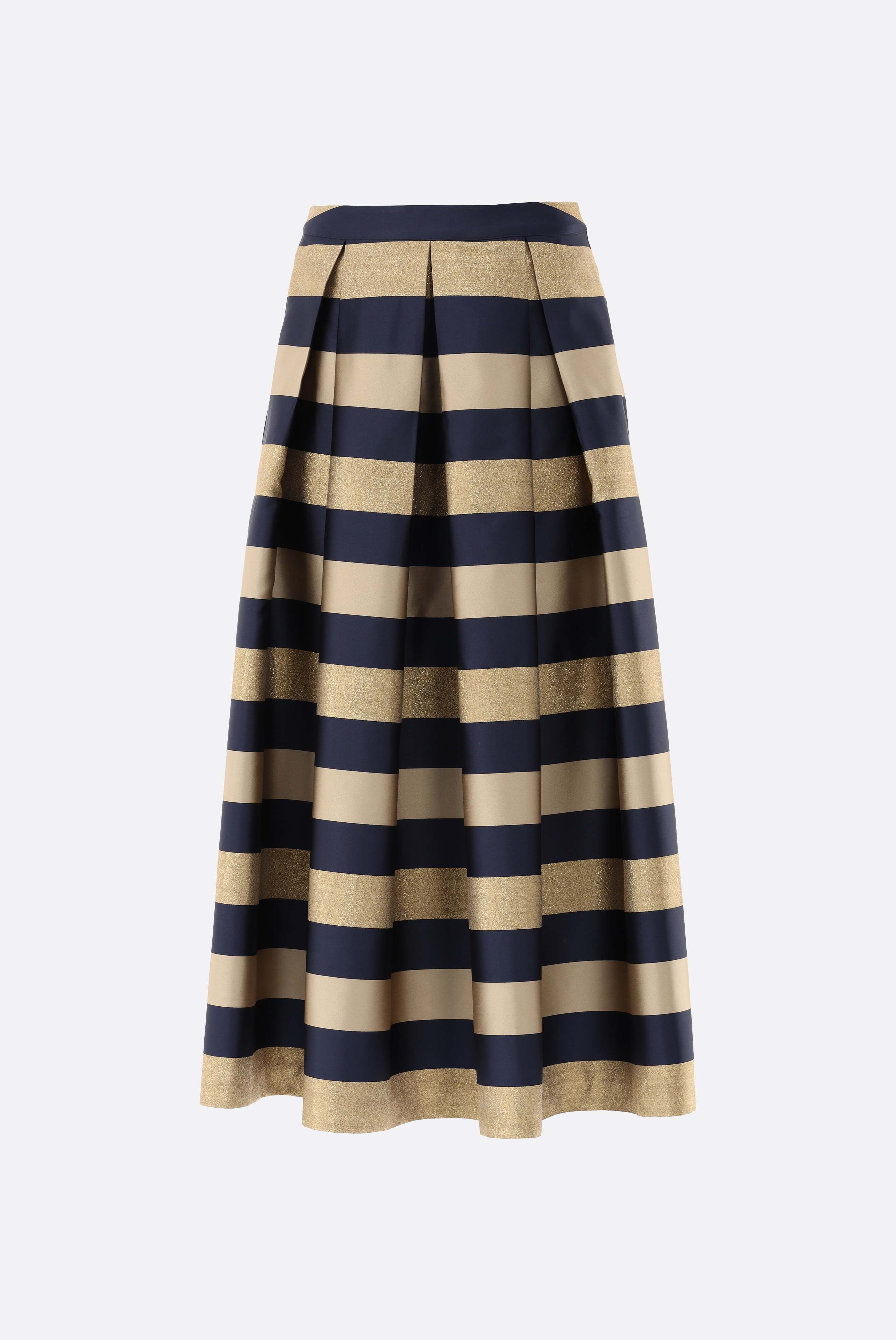 Look aus Midirock mit goldenem Jacquard-Streifen