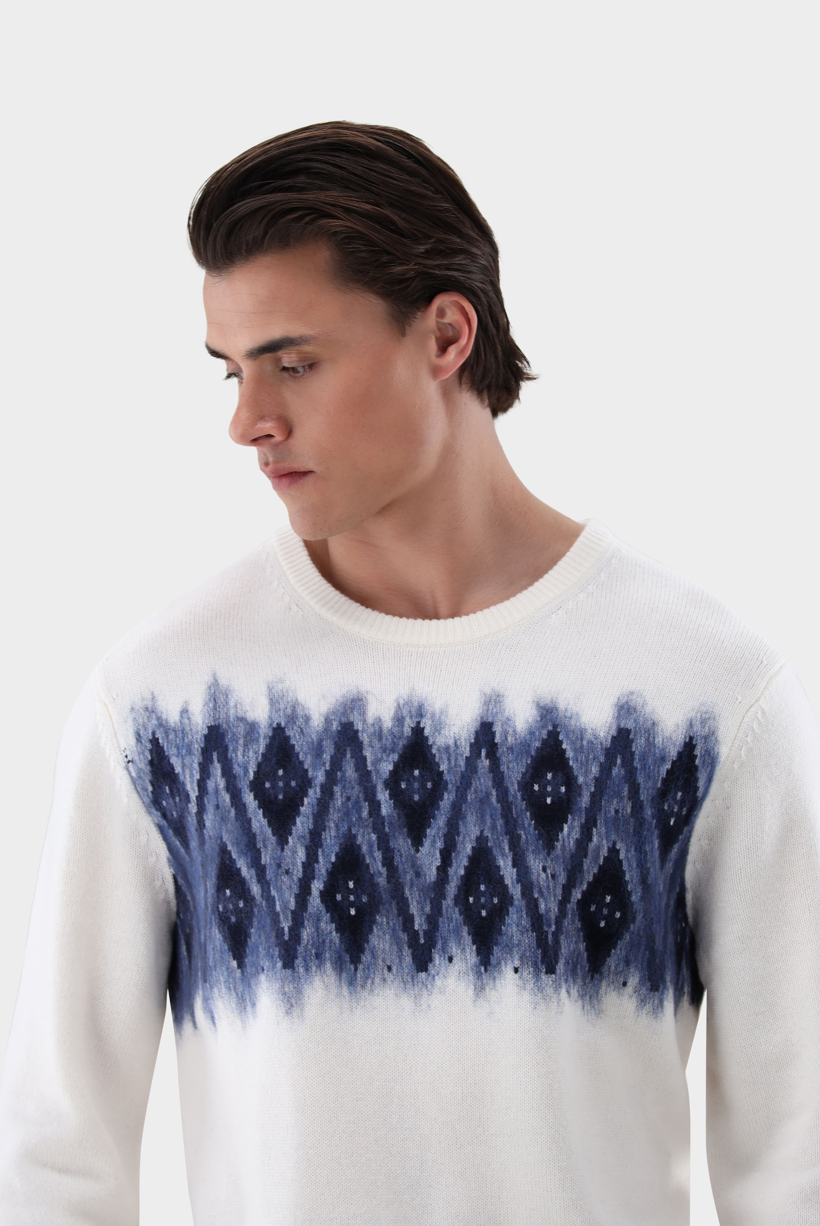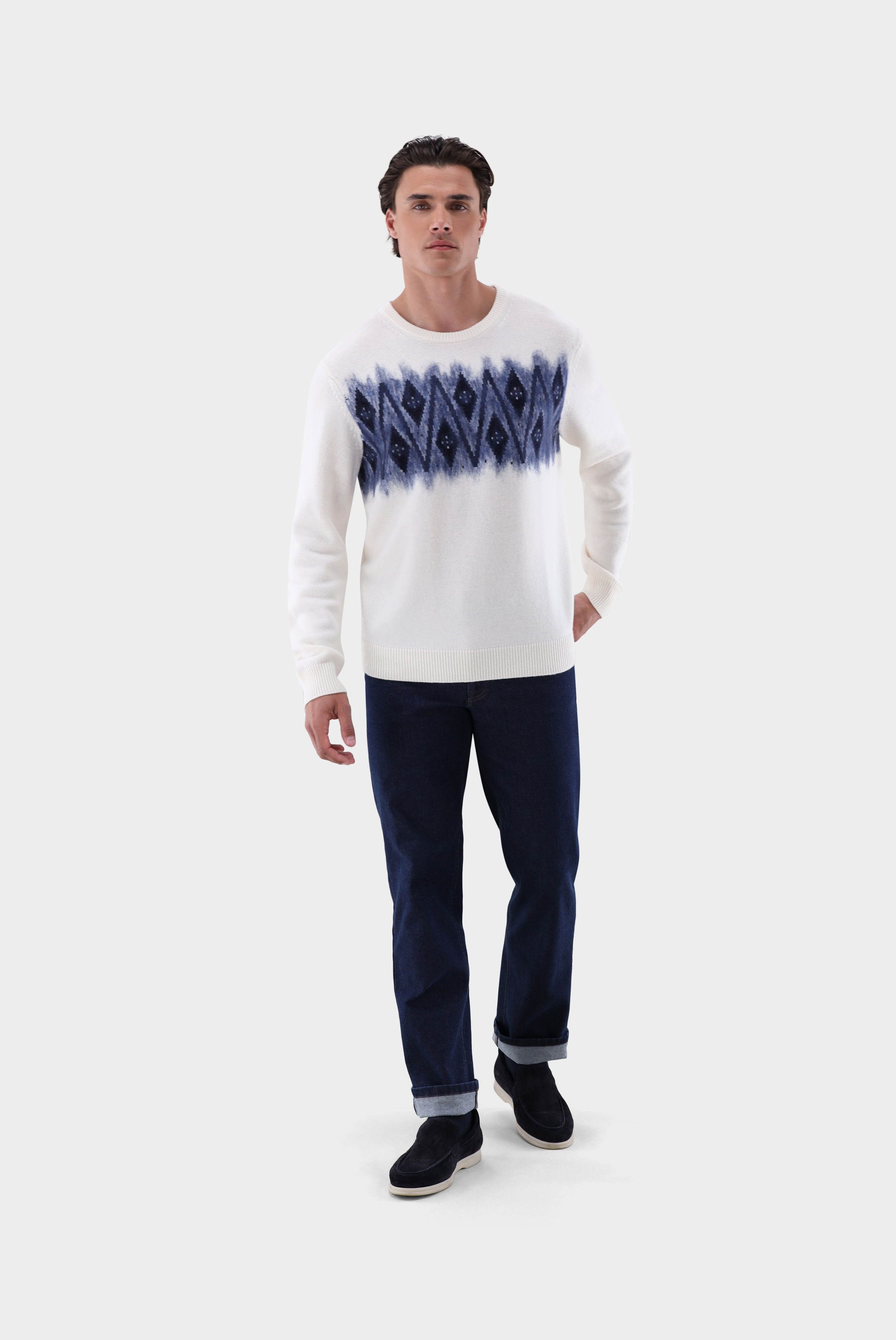 Ikonischer Norweger-Pullover mit kuscheligem Kaschmir-Anteil und aufwendig gearbeitetem Needle-Punch-Muster auf der Brust. Die weiche, wärmende Materialmischung bietet höchsten Tragekomfort und macht das Modell ideal für kühle Tage. Das traditionelle Design mit Rundhals erhält durch die besondere Strukturtechnik eine moderne Note. Perfekt für stilvolle Winter-Looks, die zeitlose Muster mit luxuriöser Haptik verbinden.