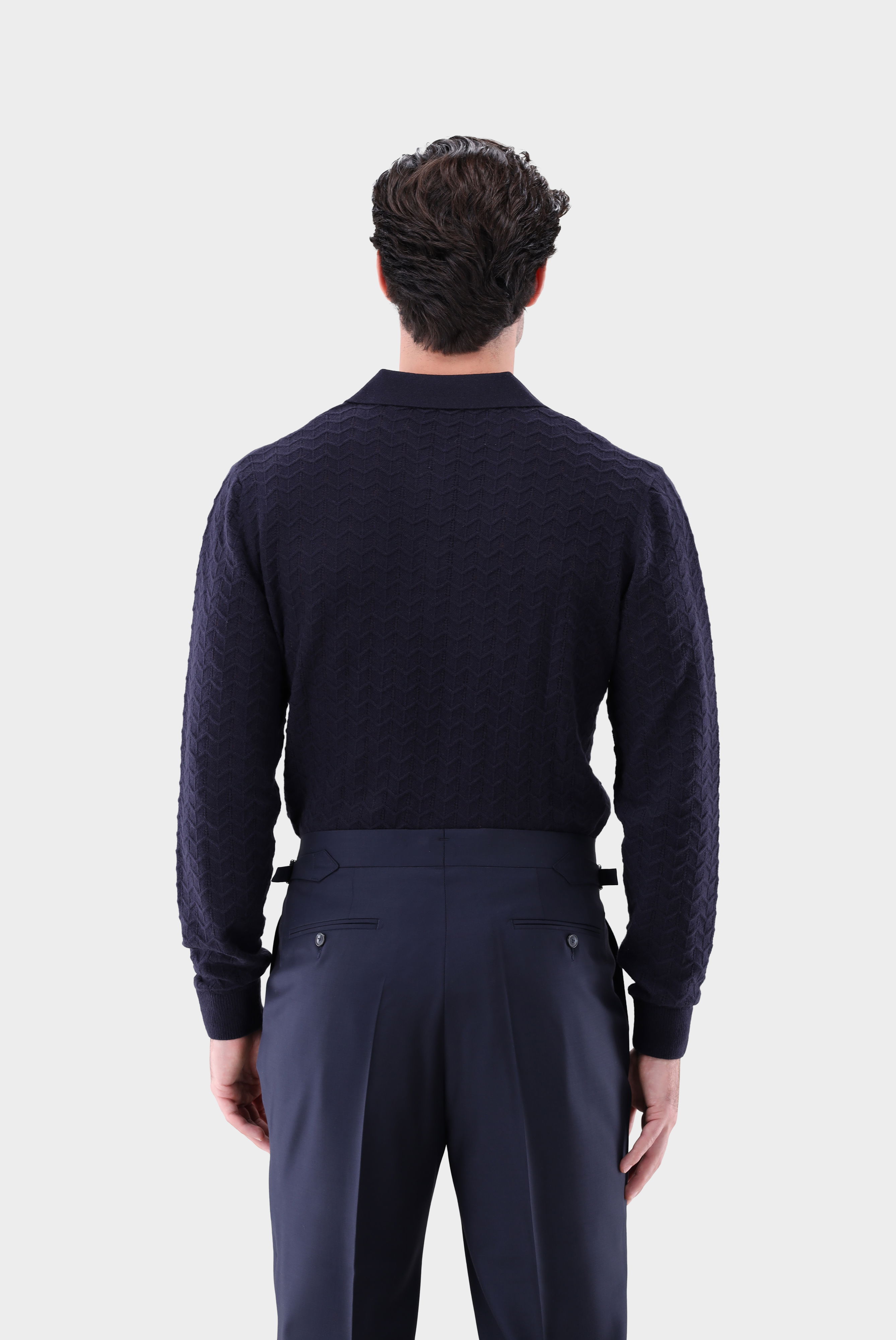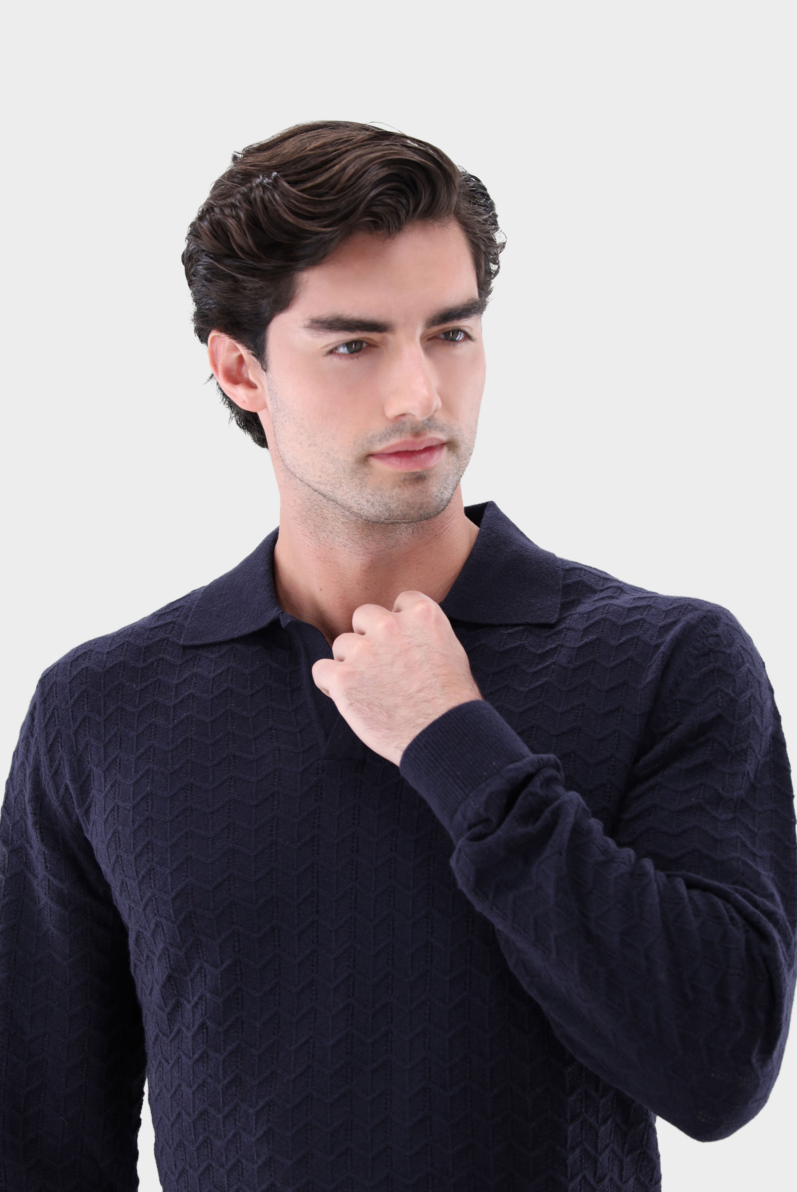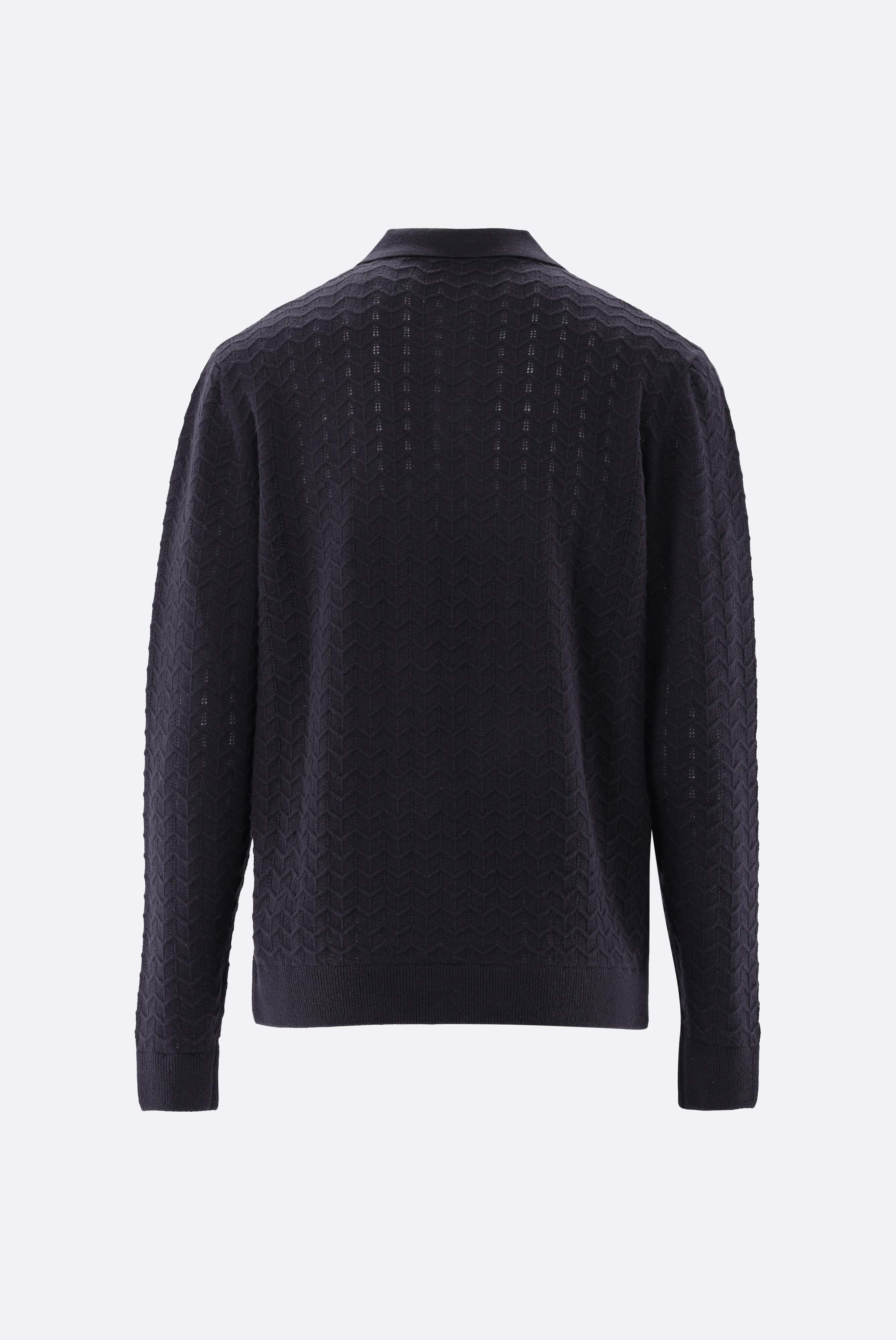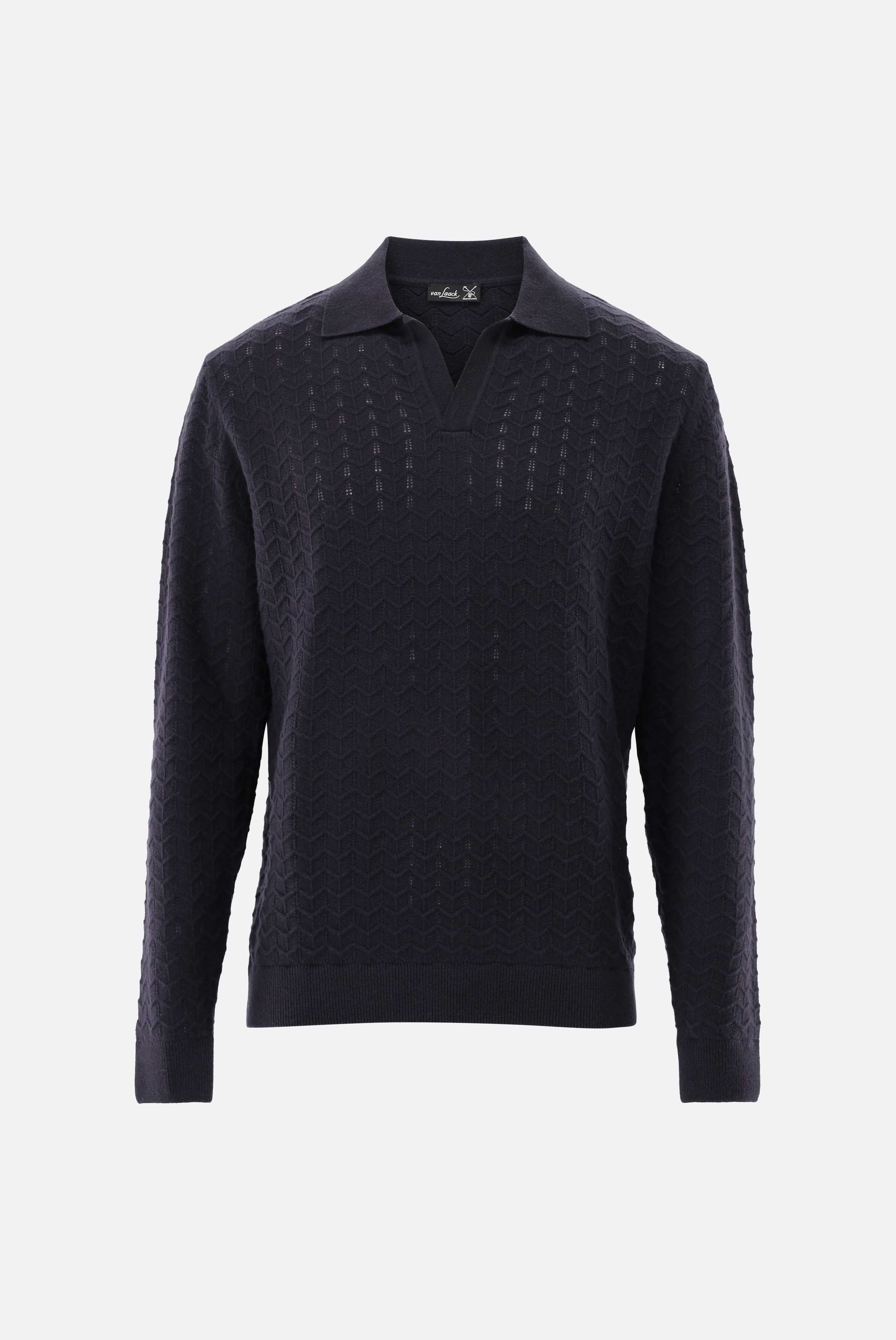 Dieses gestrickte V-Poloshirt verbindet modernen Stil mit luxuriöser Materialqualität. Gefertigt aus einer edlen Mischung mit Wolle und Kaschmir bietet es eine weiche Haptik, angenehme Wärme und hohen Tragekomfort. Die quer strukturierte Oberfläche mit 3D-Optik verleiht dem Design eine besondere Tiefe und unterstreicht den modernen Charakter. Mit seinem gemütlichen Schnitt eignet sich das Poloshirt ideal für stilvolle Freizeit-Looks und zeitgemäße Casual-Outfits.