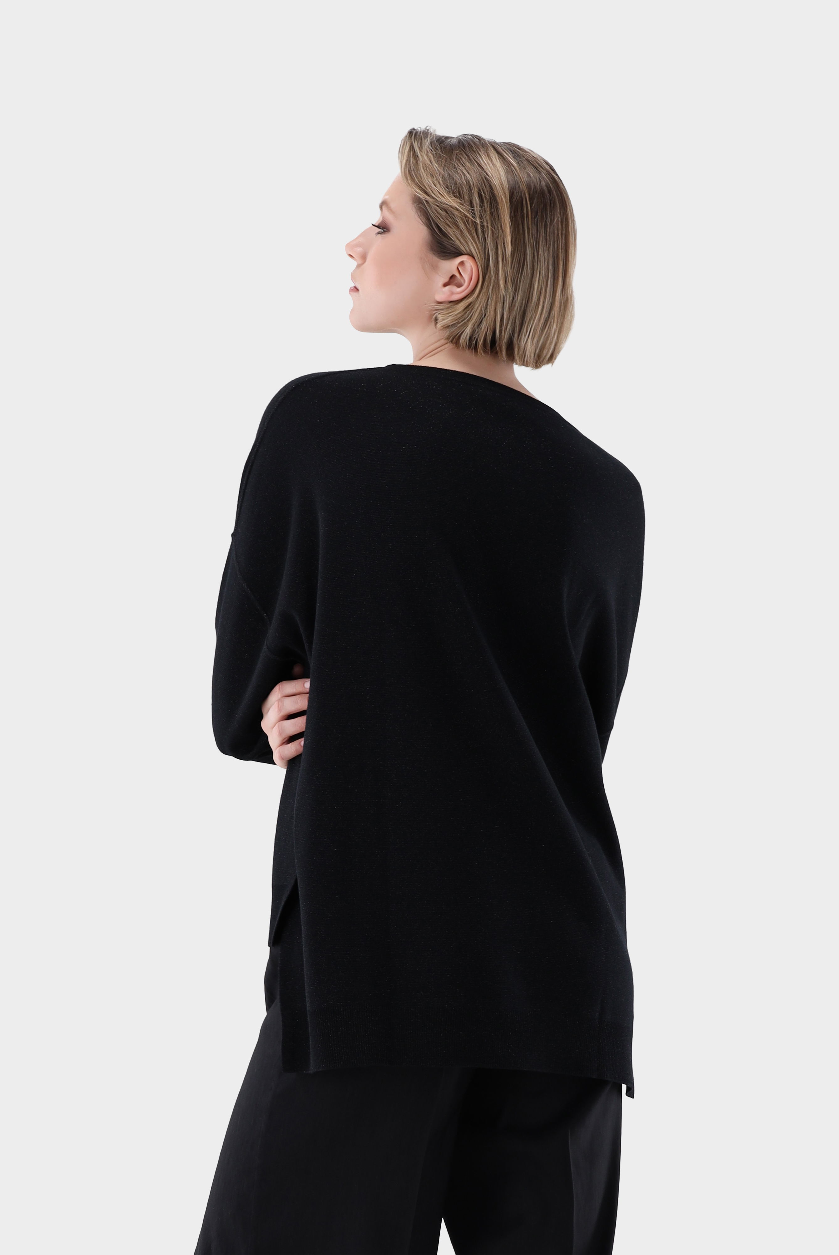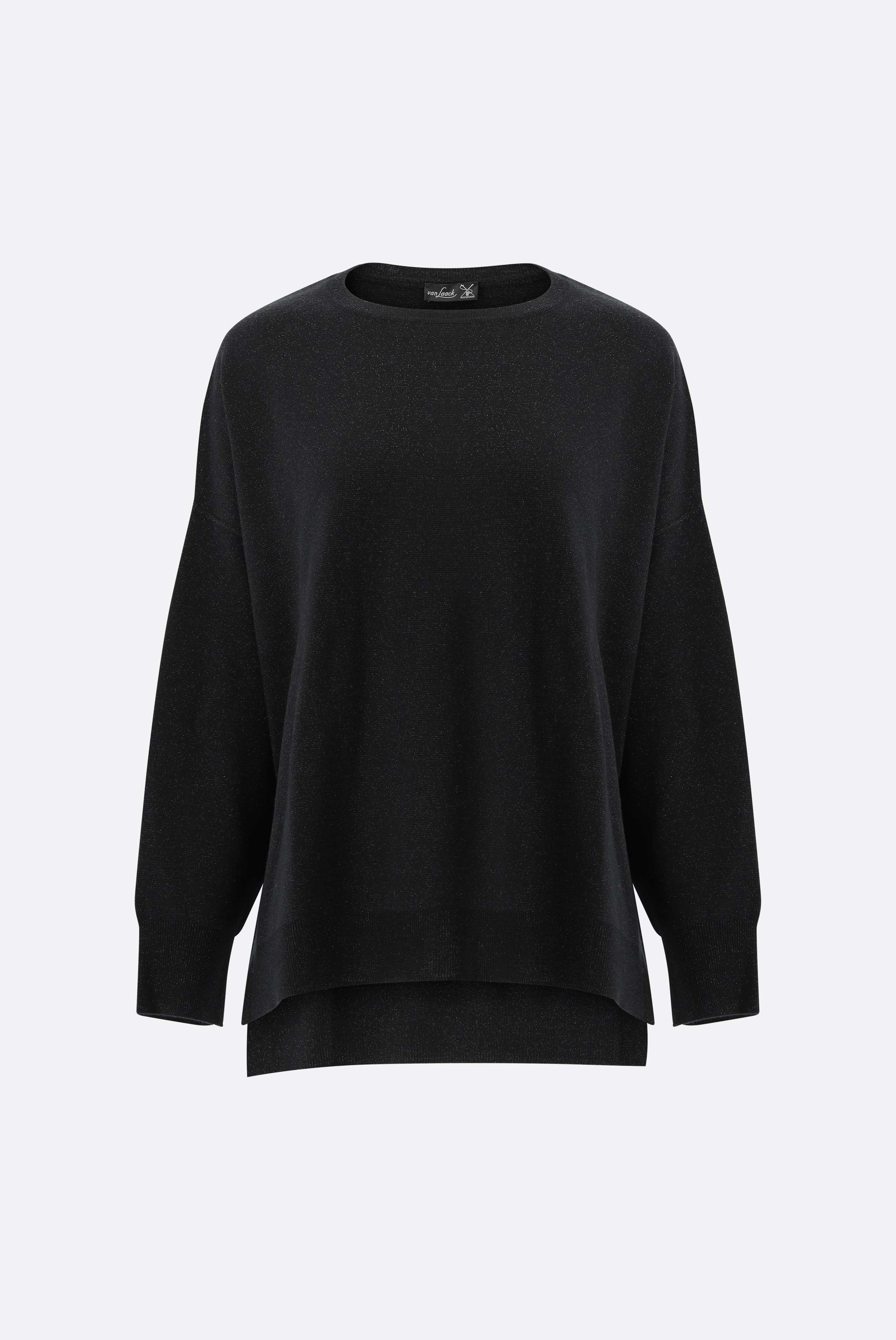 Der Rundhalspullover mit langen Schlitzen wird aus hochwertiger Merinowolle mit Glitzereffekt hergestellt. Die langen Schlitze an den Seiten verleihen dem Pullover einen modernen Look und bieten gleichzeitig Bewegungsfreiheit. Die Merinowolle sorgt für angenehme Leichtigkeit und Atmungsaktivität, wodurch Sie den Pullover das ganze Jahr über tragen können. Ob zu einer schmalen Hose oder einem Rock, dieser Pullover ist vielseitig einsetzbar.