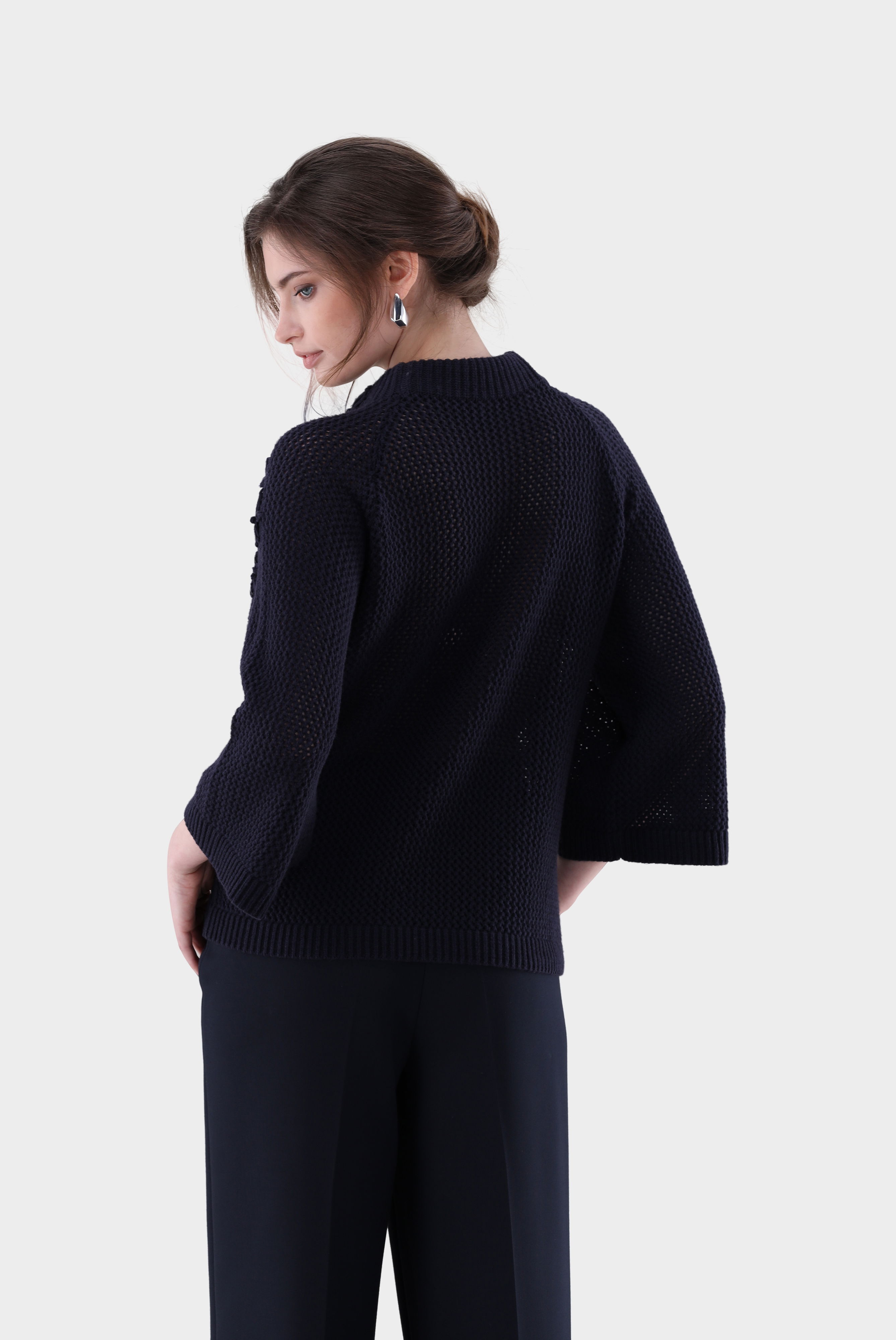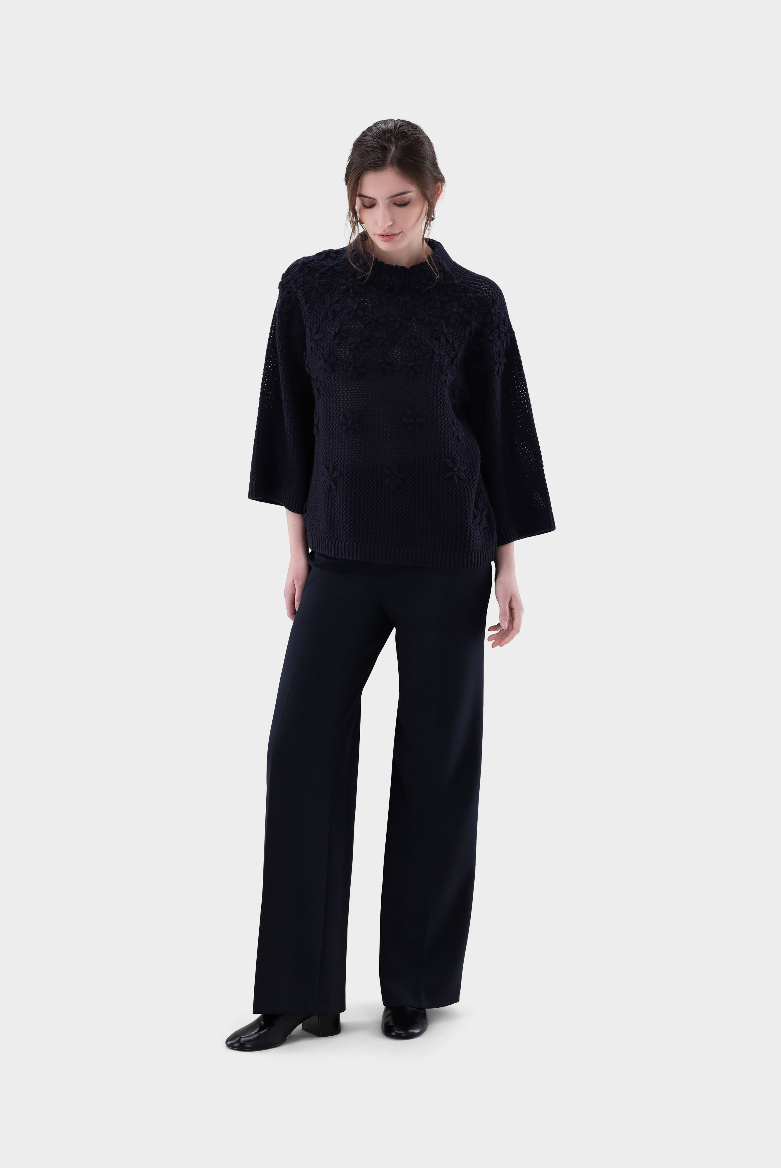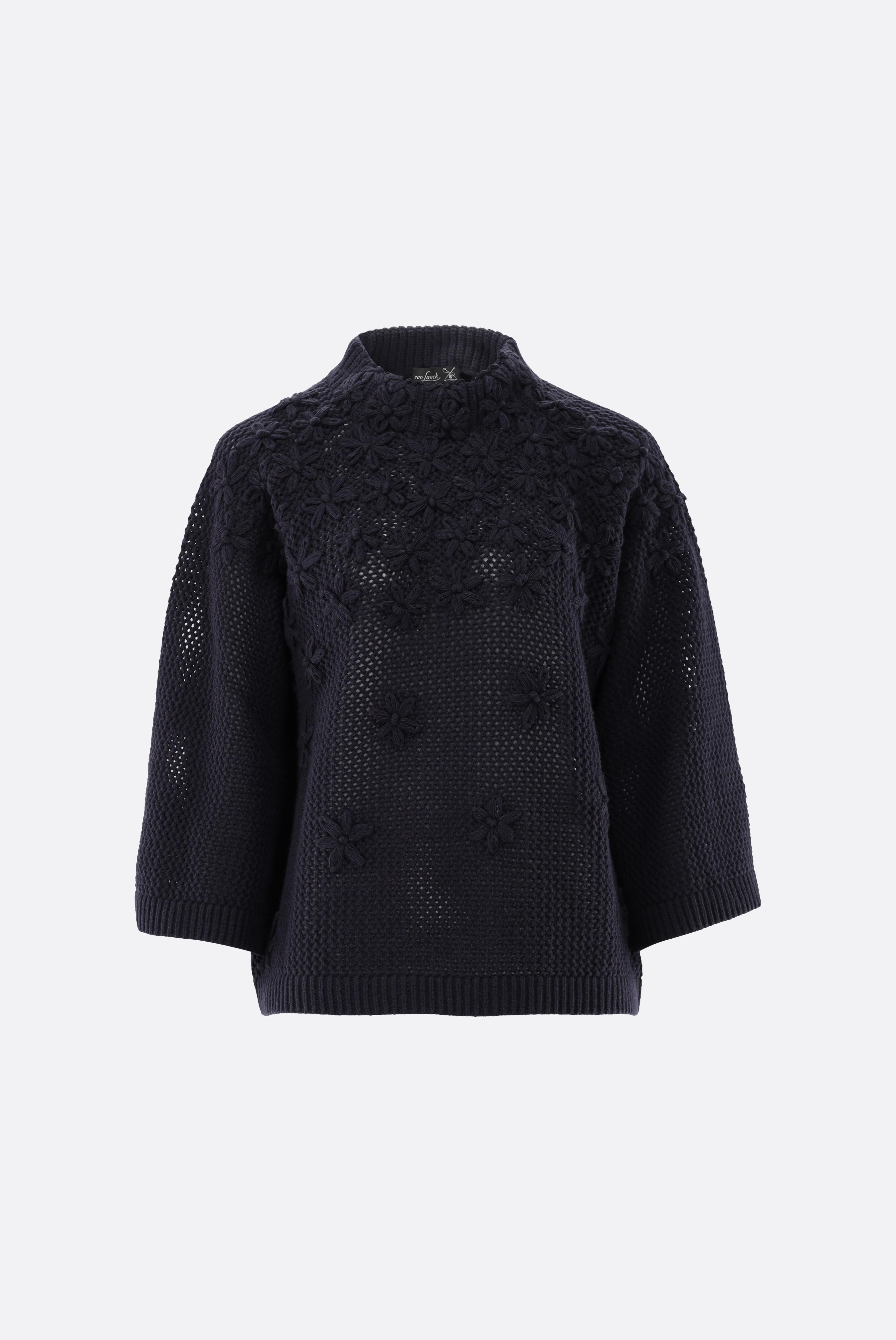 Dieser locker geschnittene Rollkragenpullover überzeugt durch feminine Eleganz und feine Details. Das Modell ist in A-Linie gearbeitet und besitzt moderne 7/8-Ärmel sowie einen hohen Stehkragen. Ein handgesticktes Blumenmotiv setzt edle Akzente und macht jeden Pullover zu einem besonderen Stück. Gefertigt aus einer weichen Mischung mit Wolle und Kaschmir, besticht der leichte Netzstrick durch angenehme Wärme, hohen Tragekomfort und stilvolle Optik.