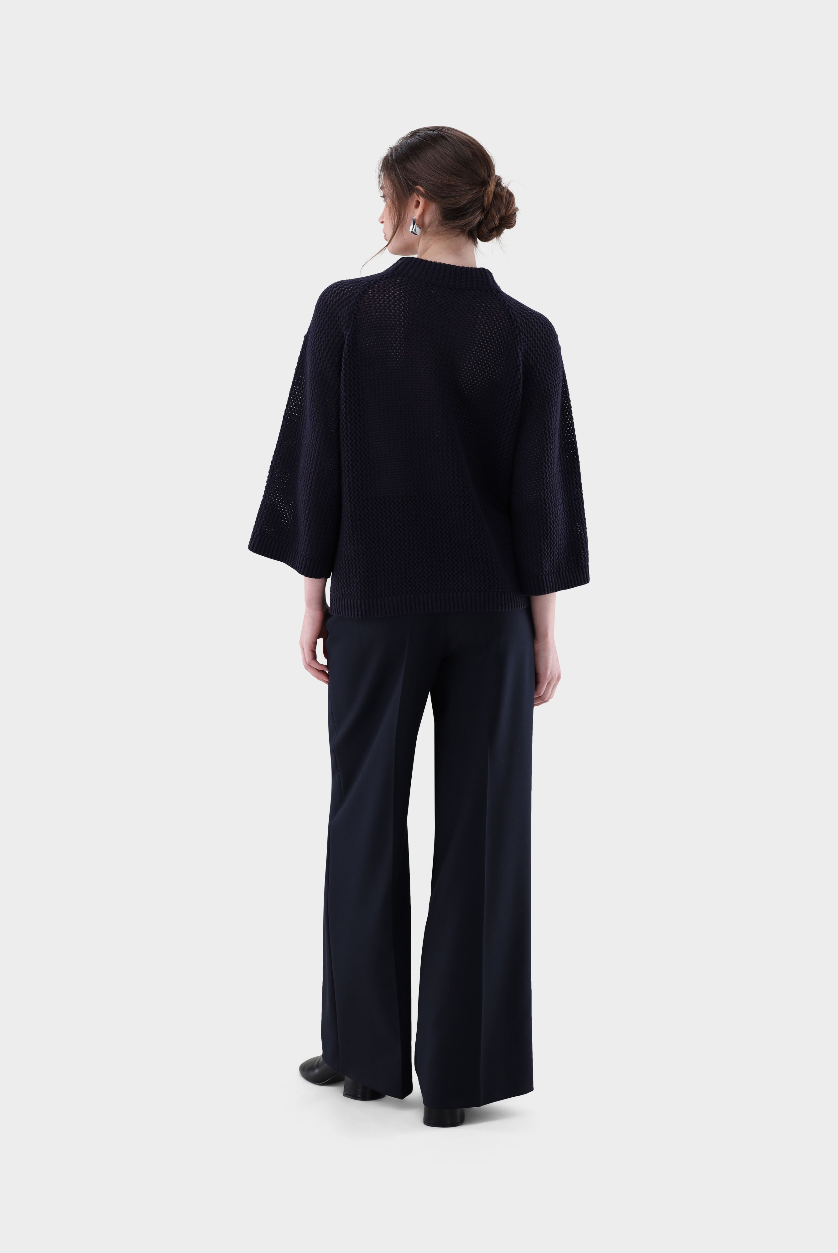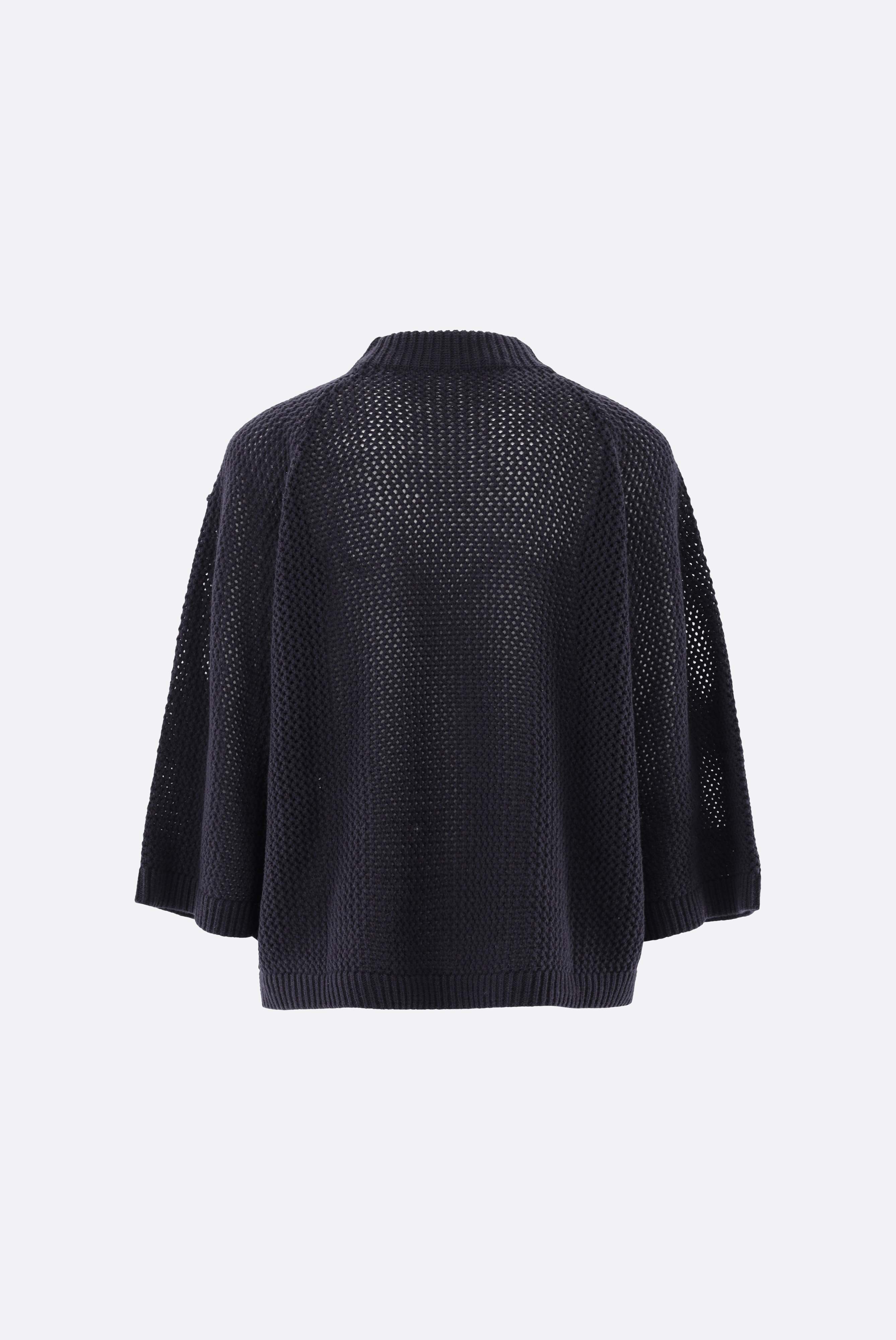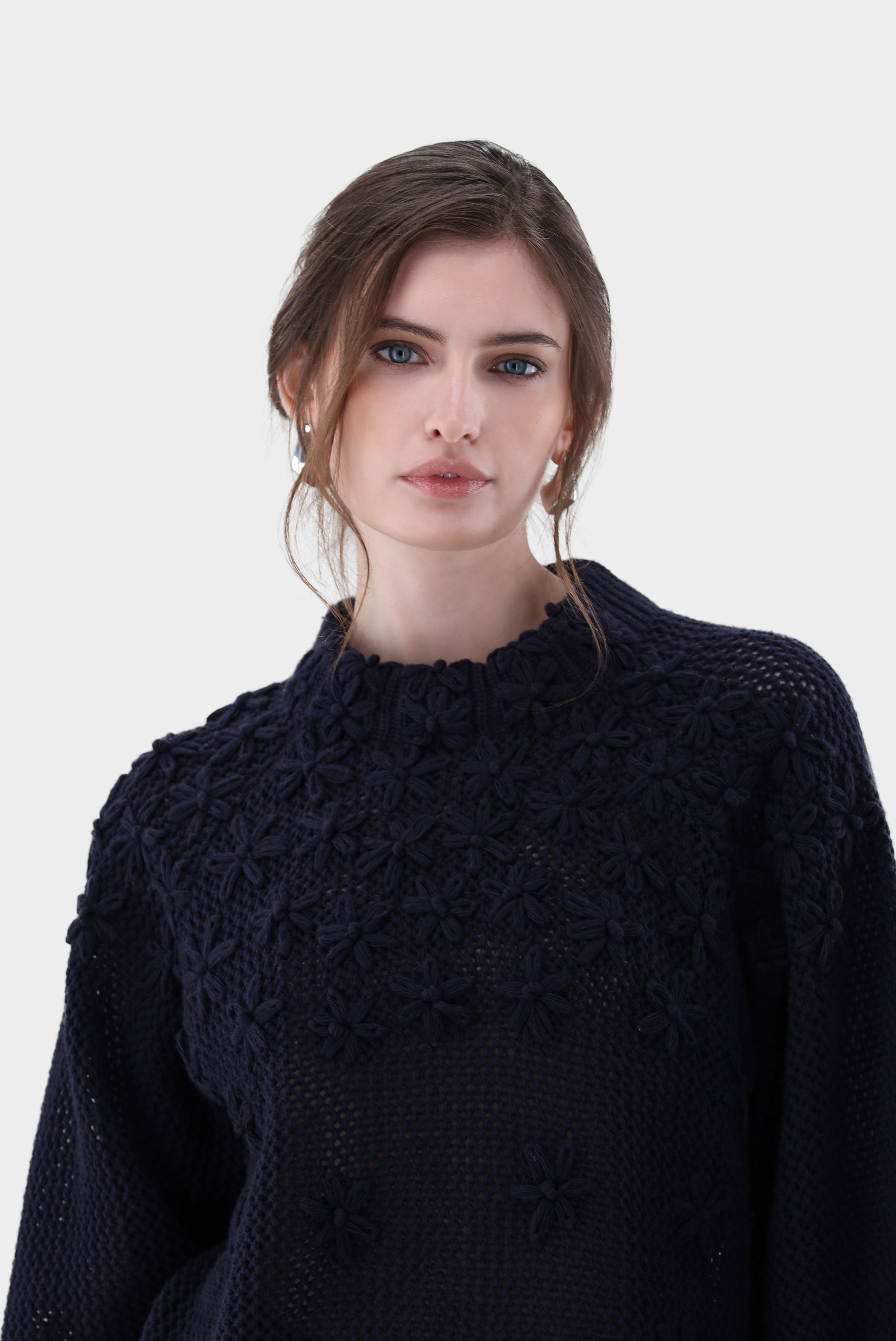 Dieser locker geschnittene Rollkragenpullover überzeugt durch feminine Eleganz und feine Details. Das Modell ist in A-Linie gearbeitet und besitzt moderne 7/8-Ärmel sowie einen hohen Stehkragen. Ein handgesticktes Blumenmotiv setzt edle Akzente und macht jeden Pullover zu einem besonderen Stück. Gefertigt aus einer weichen Mischung mit Wolle und Kaschmir, besticht der leichte Netzstrick durch angenehme Wärme, hohen Tragekomfort und stilvolle Optik.