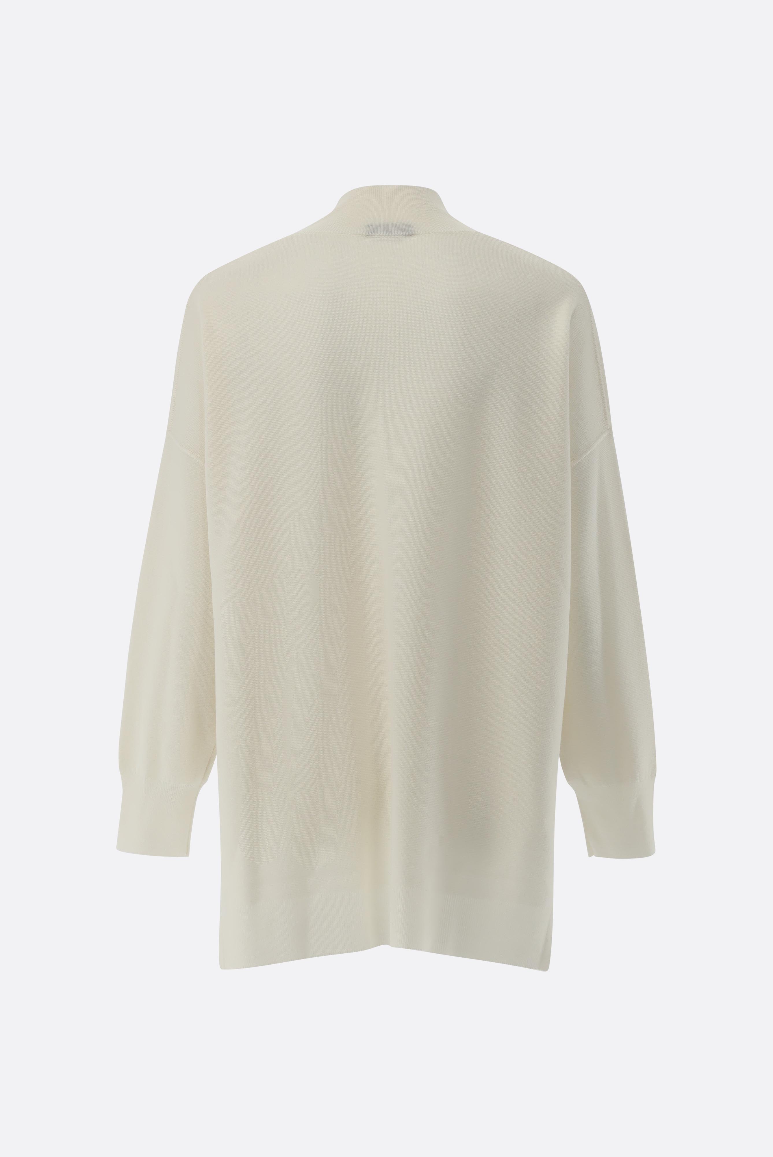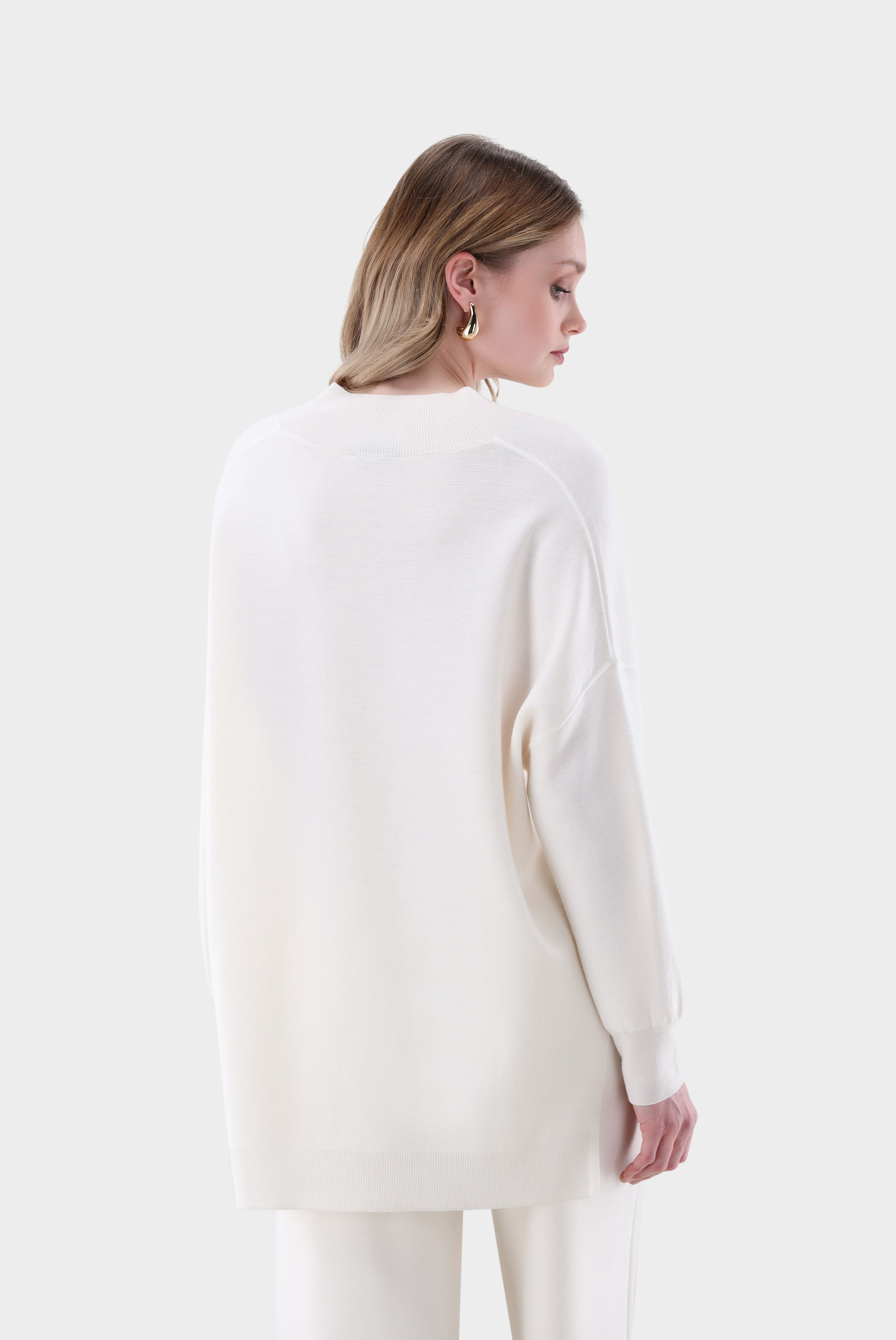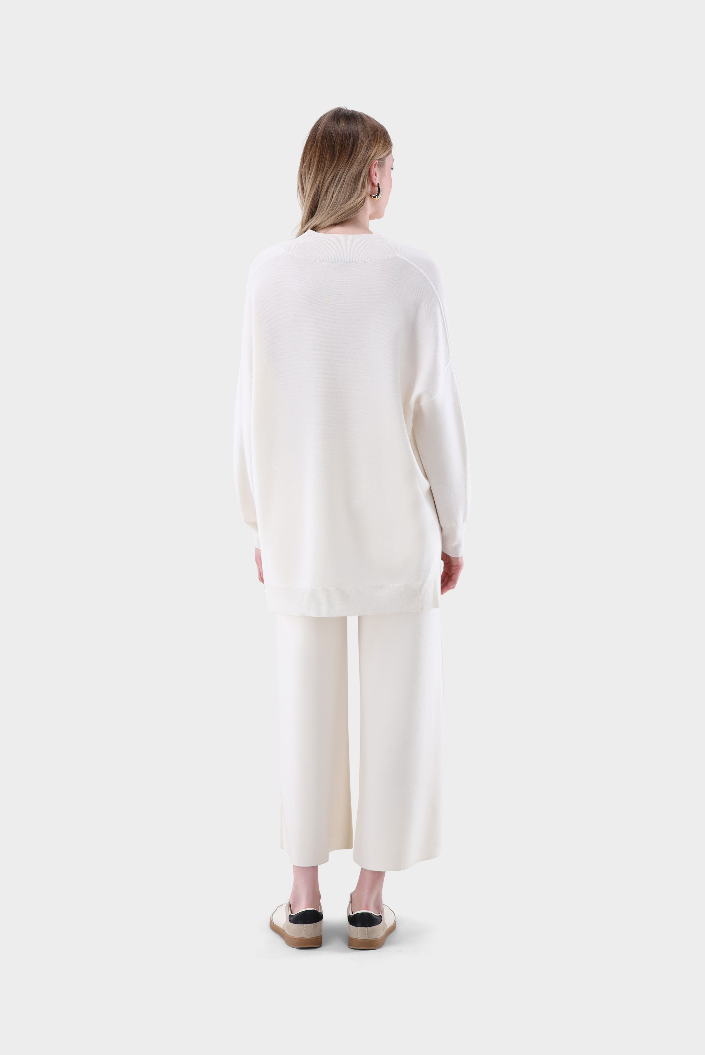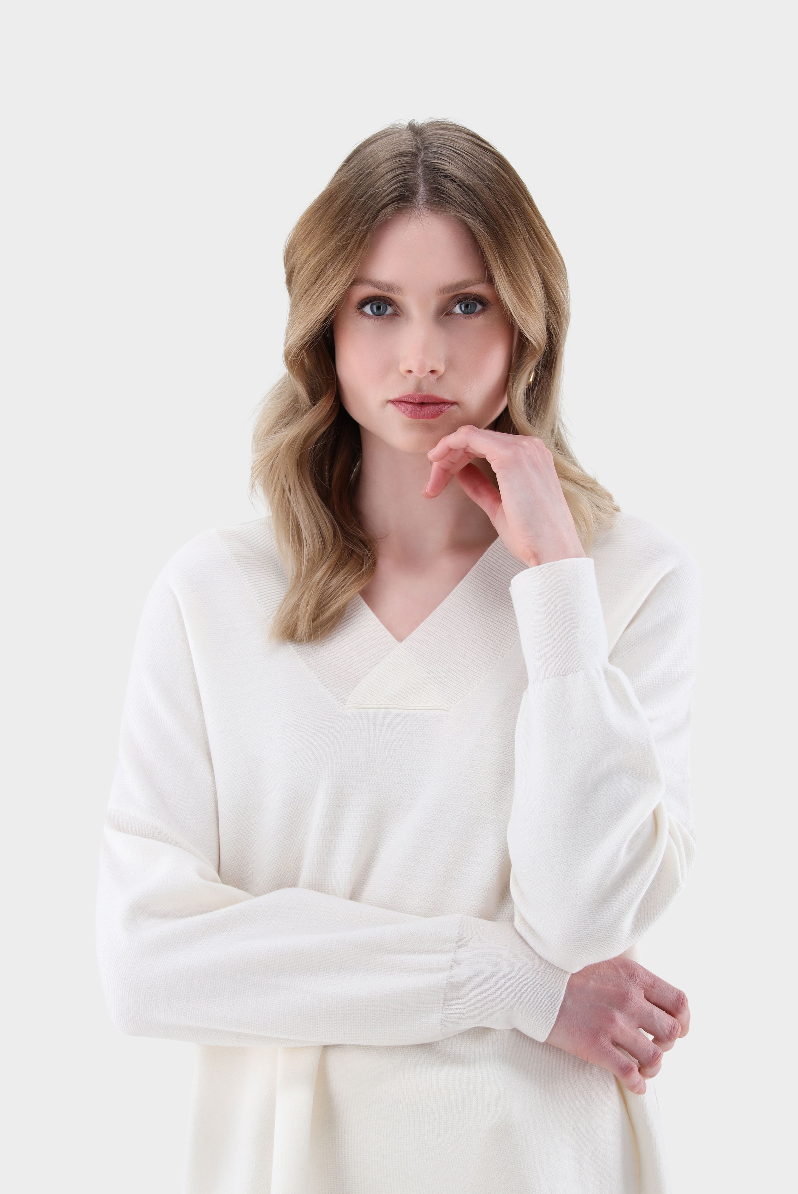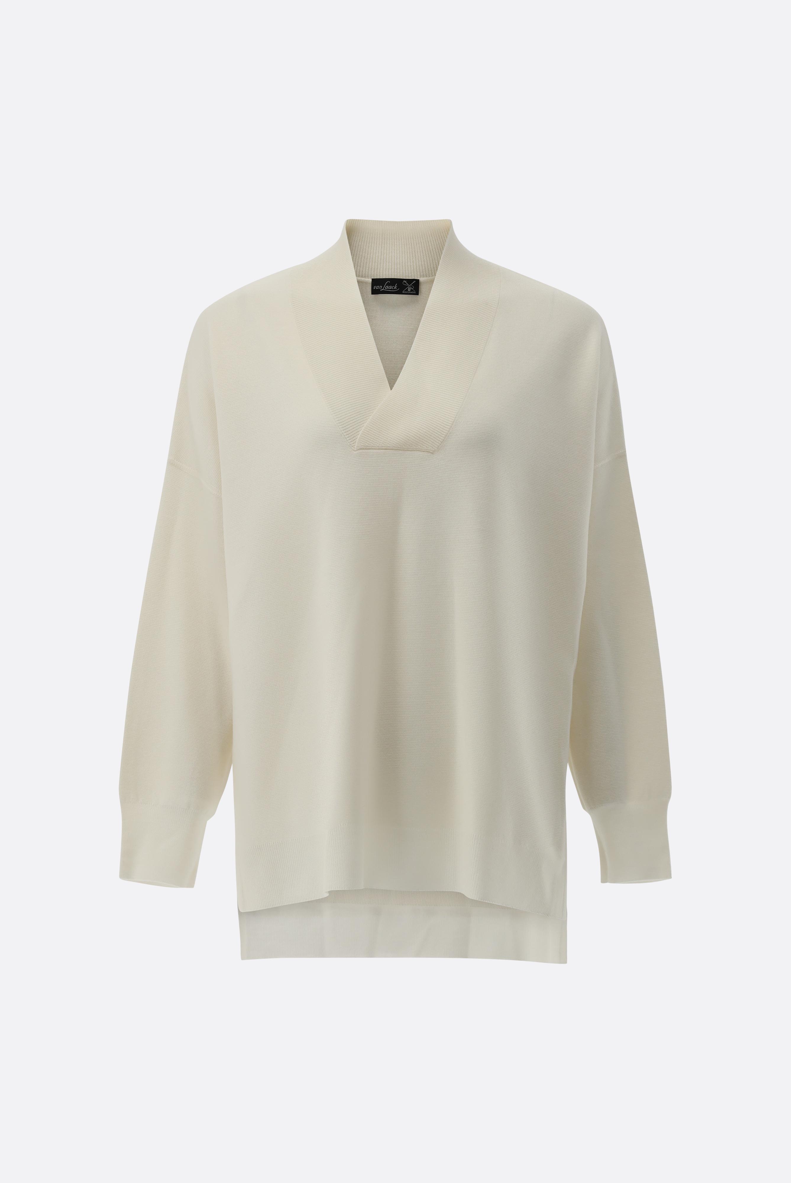 Dieser Oversize-Pullover überzeugt durch seinen modernen V-Ausschnitt und eine lockere Passform. Lange Ärmel und praktische Seitenschlitze sorgen für Komfort und Bewegungsfreiheit, während der verlängerte Rücken dem Design eine zeitgemäße Silhouette verleiht. Gefertigt aus ultrafeiner Merinowolle bietet der Strick ein besonders weiches Tragegefühl sowie atmungsaktive Eigenschaften. Ein vielseitiges Modell, das sich ideal für entspannte Alltags-Looks und stilvolles Layering eignet.