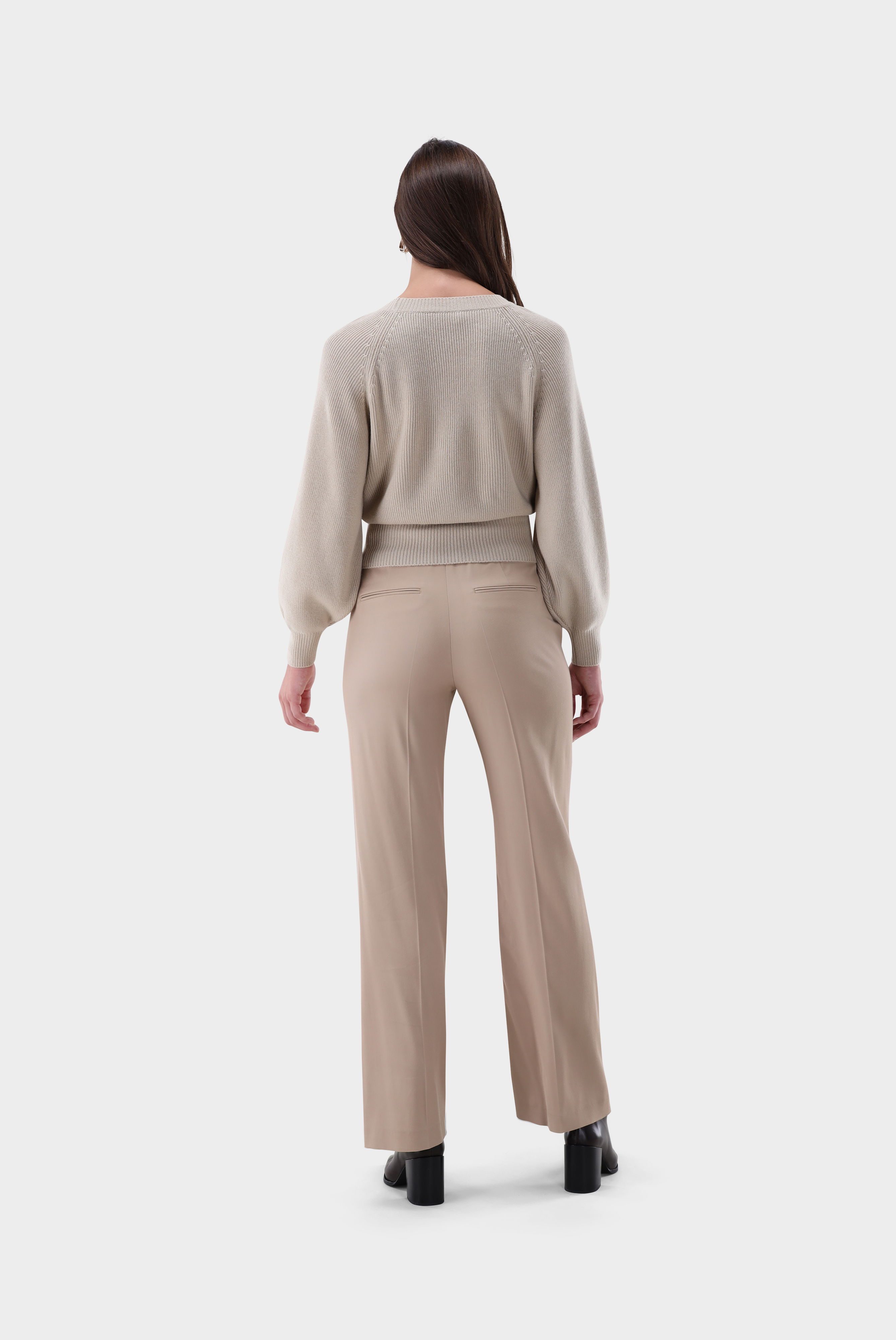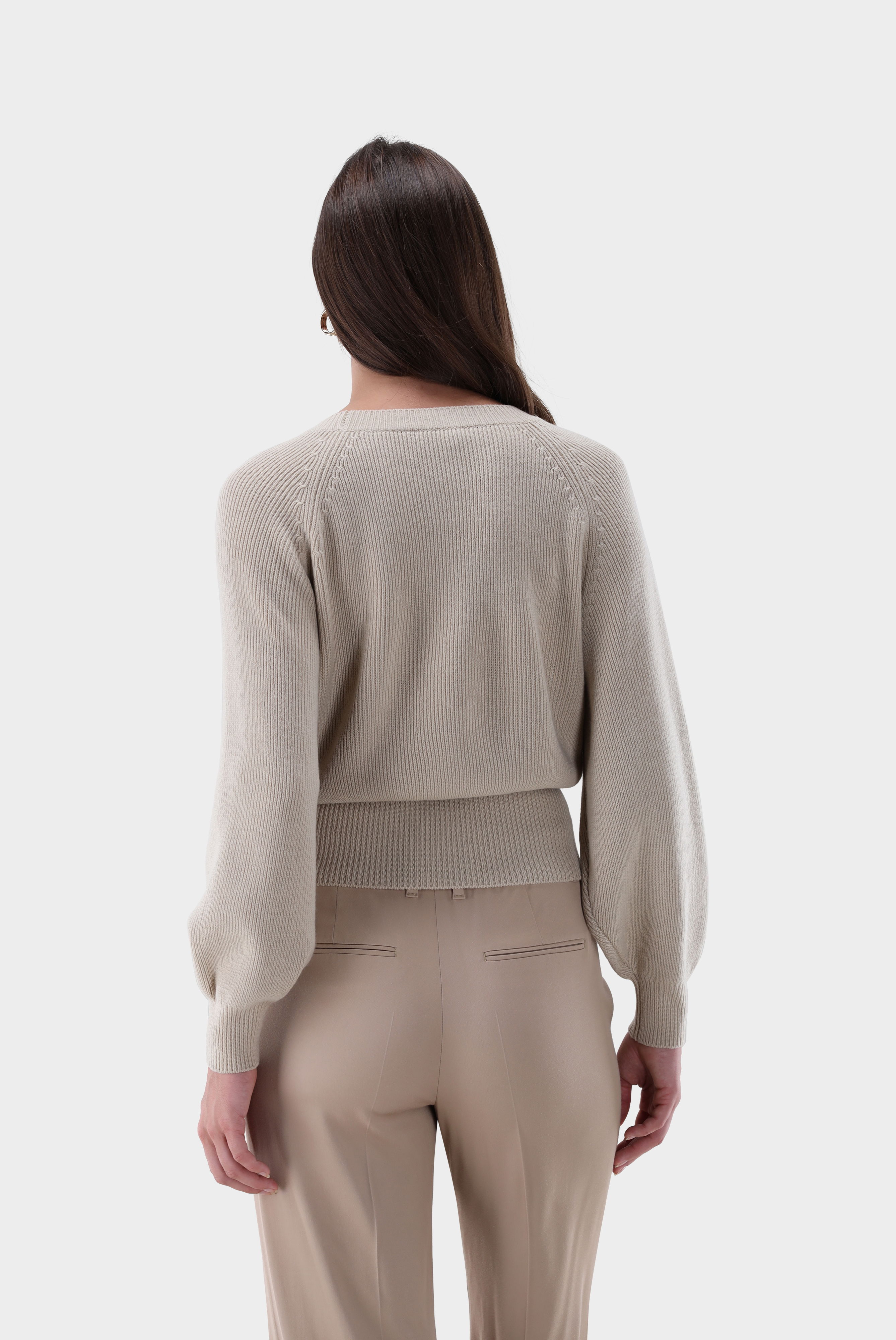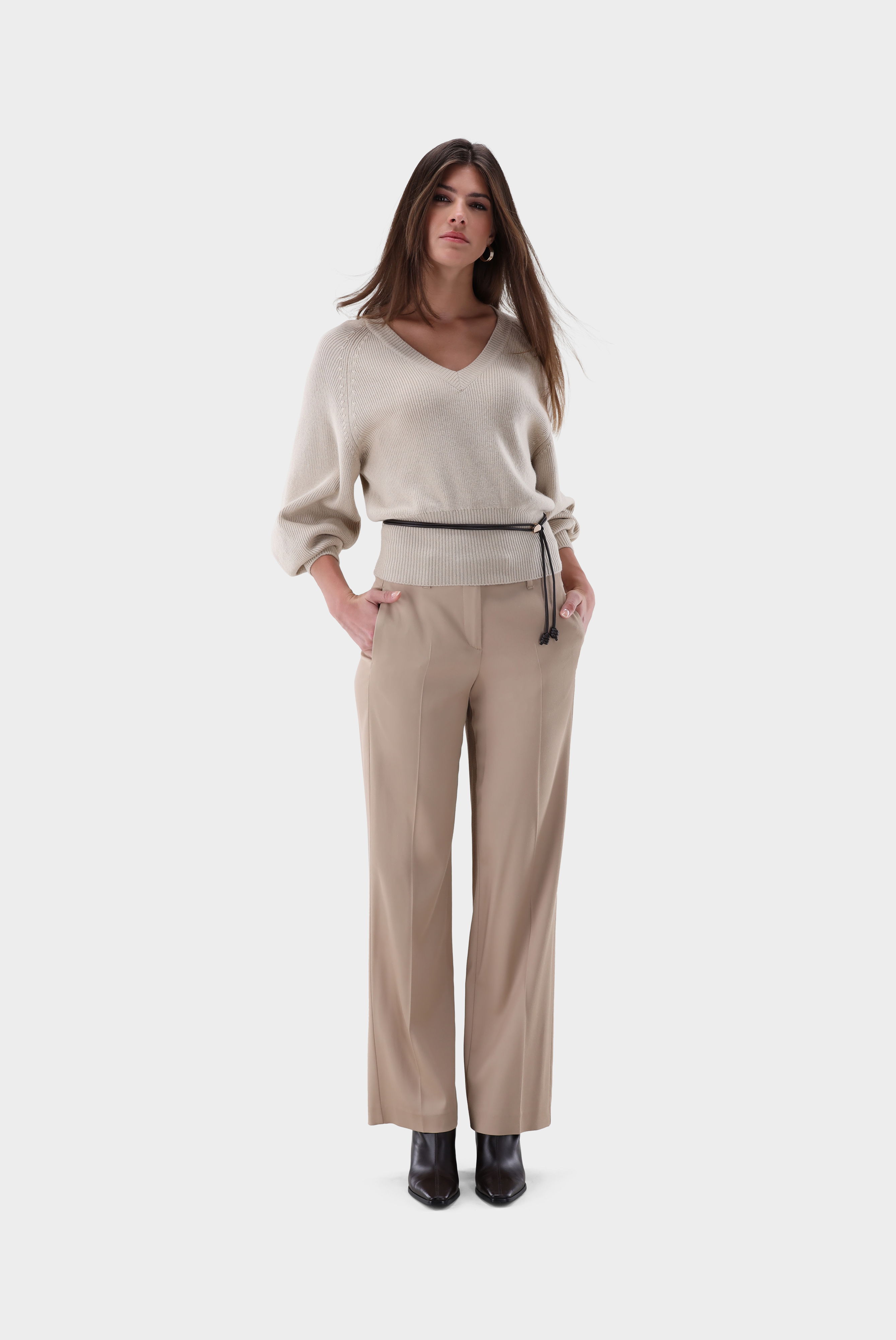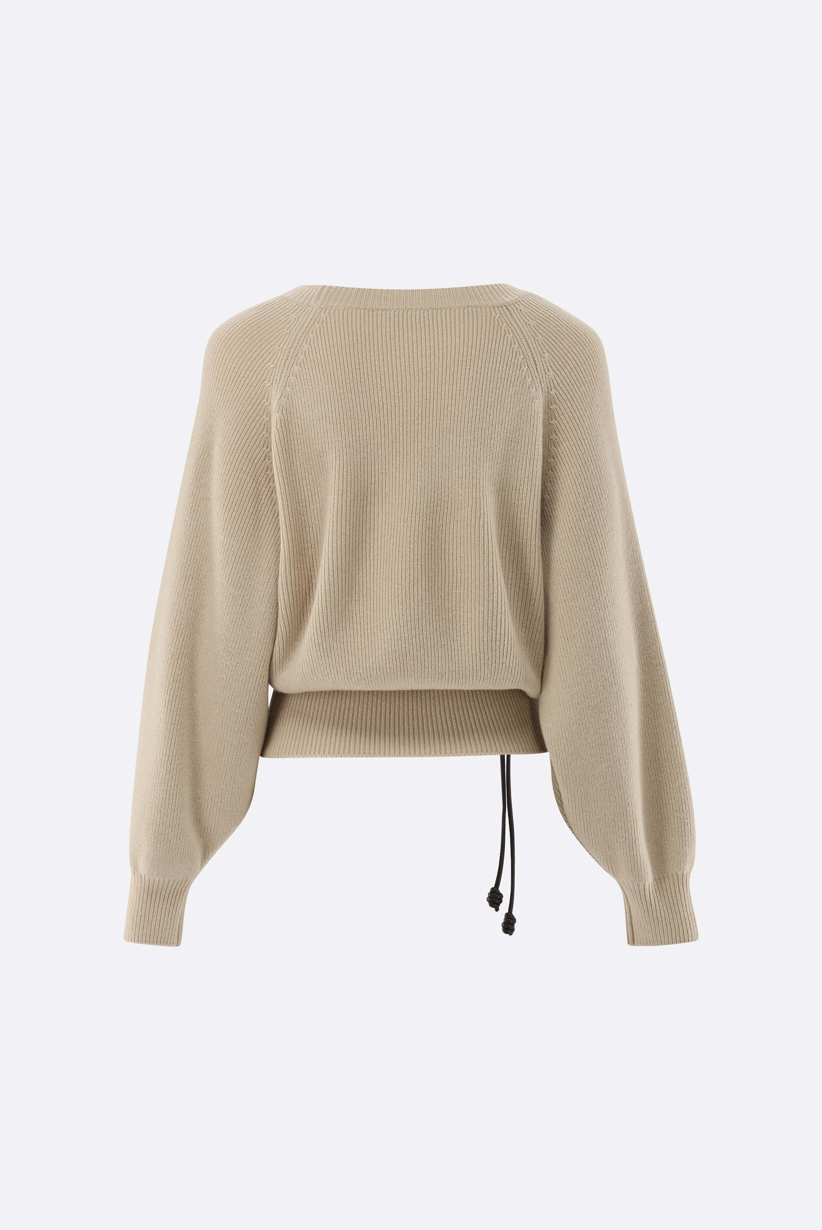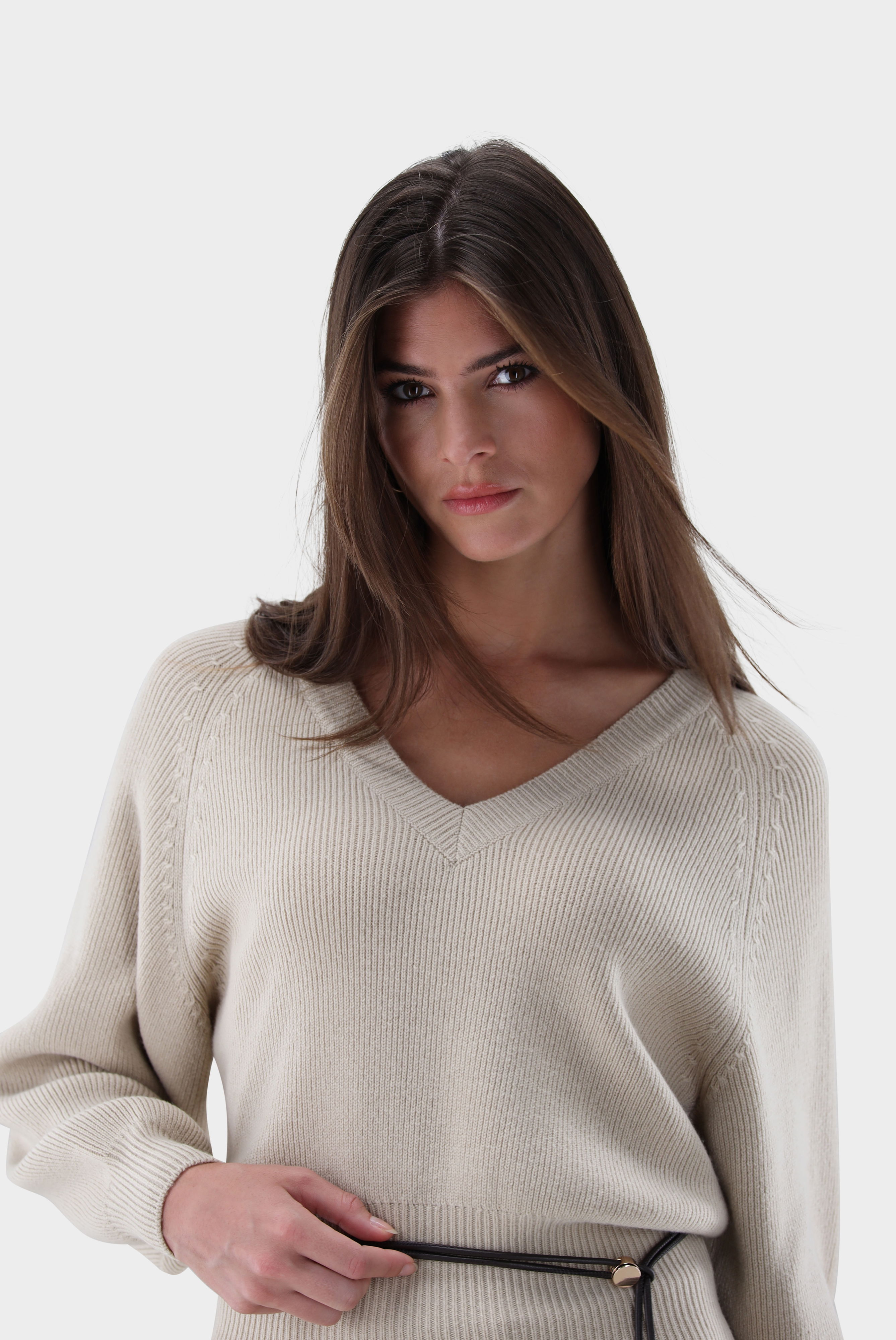 Dieser taillierte Pullover überzeugt mit tiefem V-Ausschnitt und langen Raglanärmeln, die eine feminine Silhouette unterstreichen. Ein breiter, gerippter Saum sowie praktische Gürtelschlaufen mit abnehmbarem Gürtel setzen modische Akzente und ermöglichen variable Stylingoptionen. Gefertigt aus merzerisiertem Mischgarn mit Wolle und Stretch, bietet das Modell angenehmen Tragekomfort, hohe Formbeständigkeit und edlen Glanz – perfekt für elegante Freizeit- und Business-Looks.