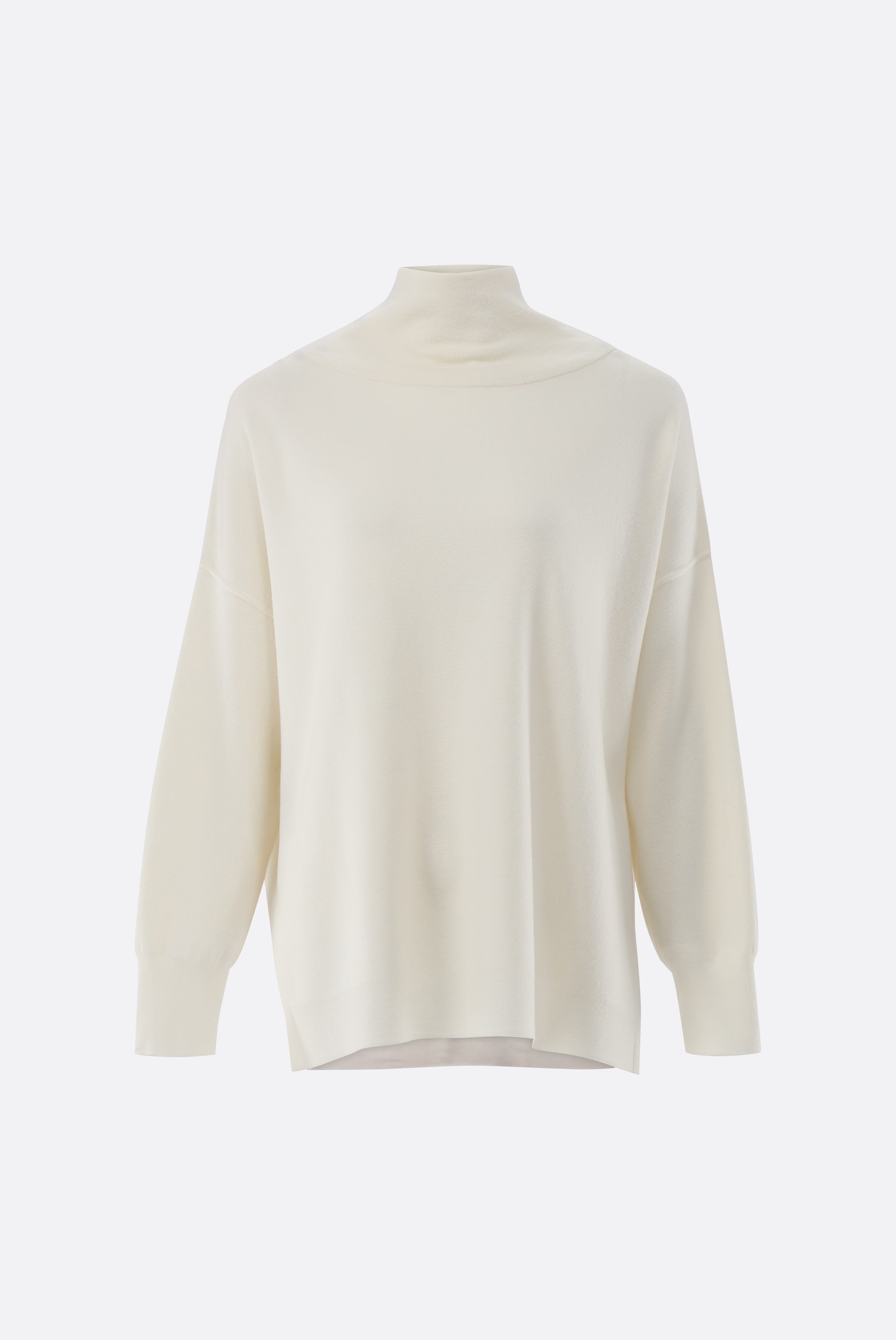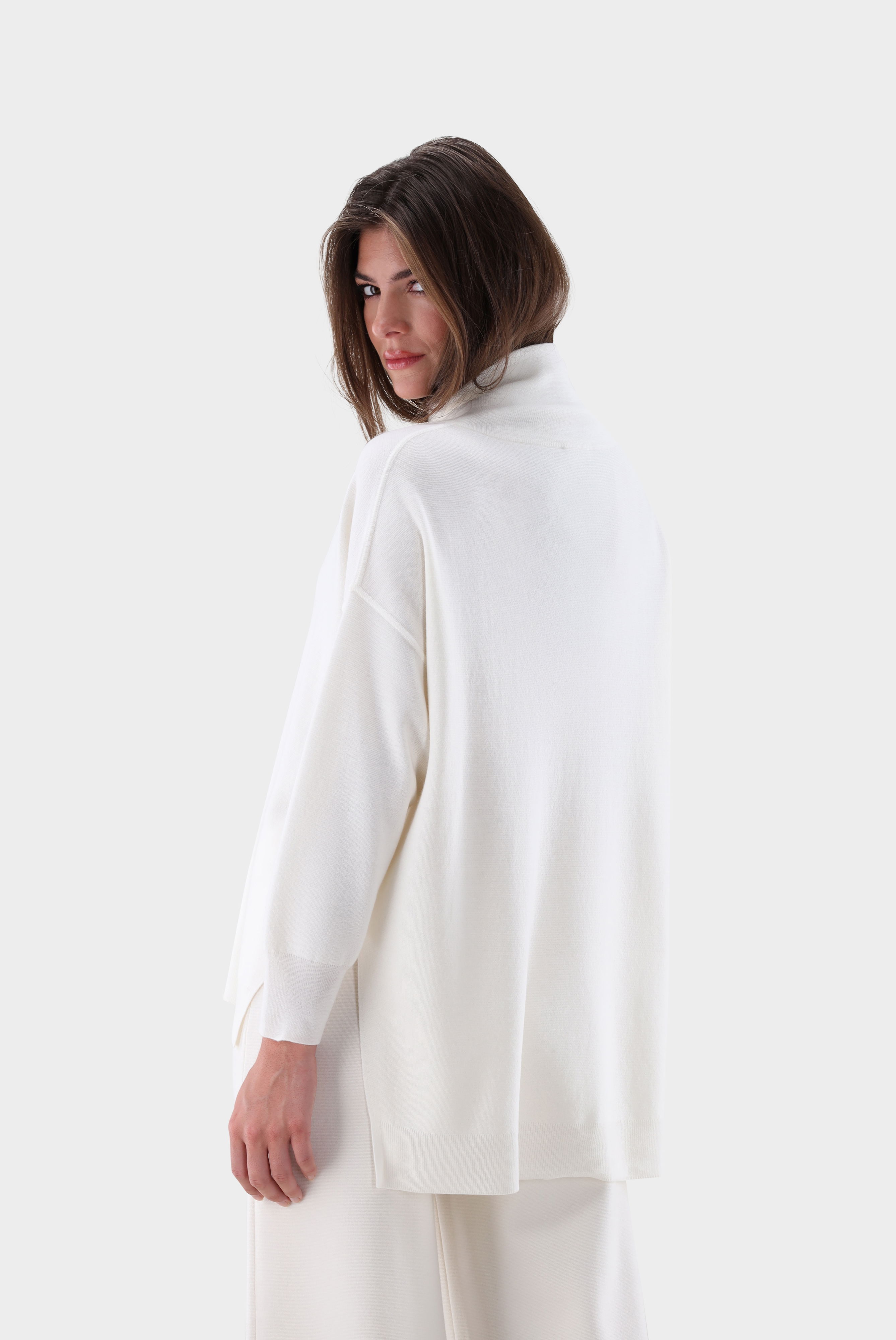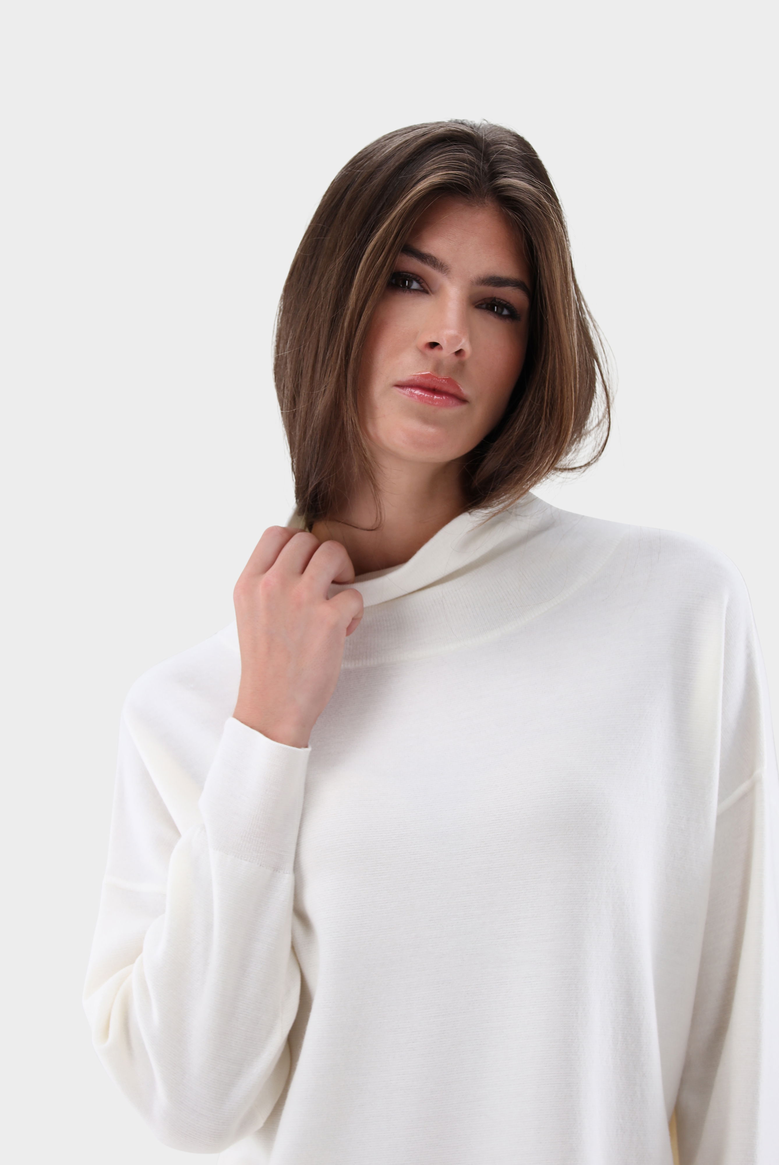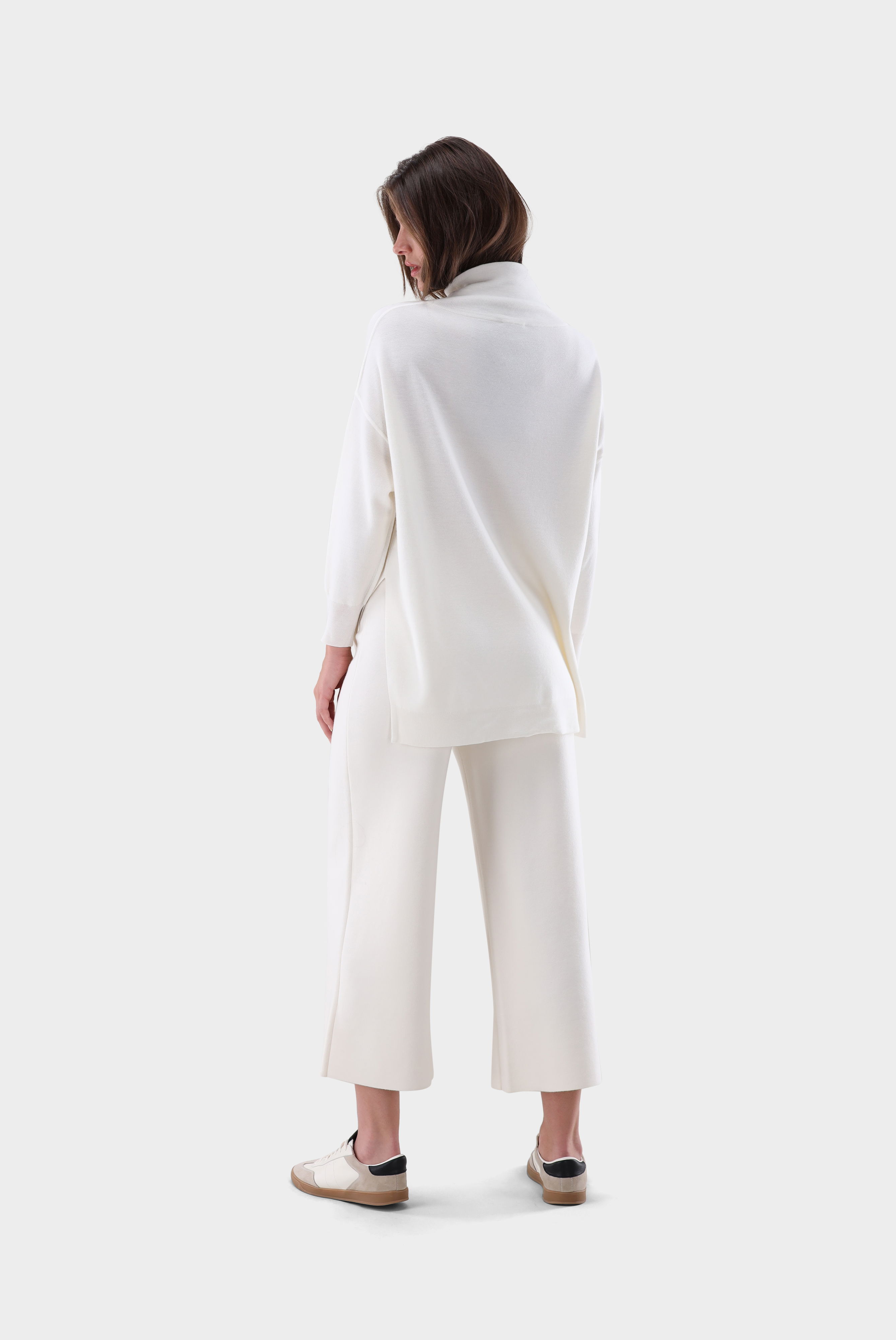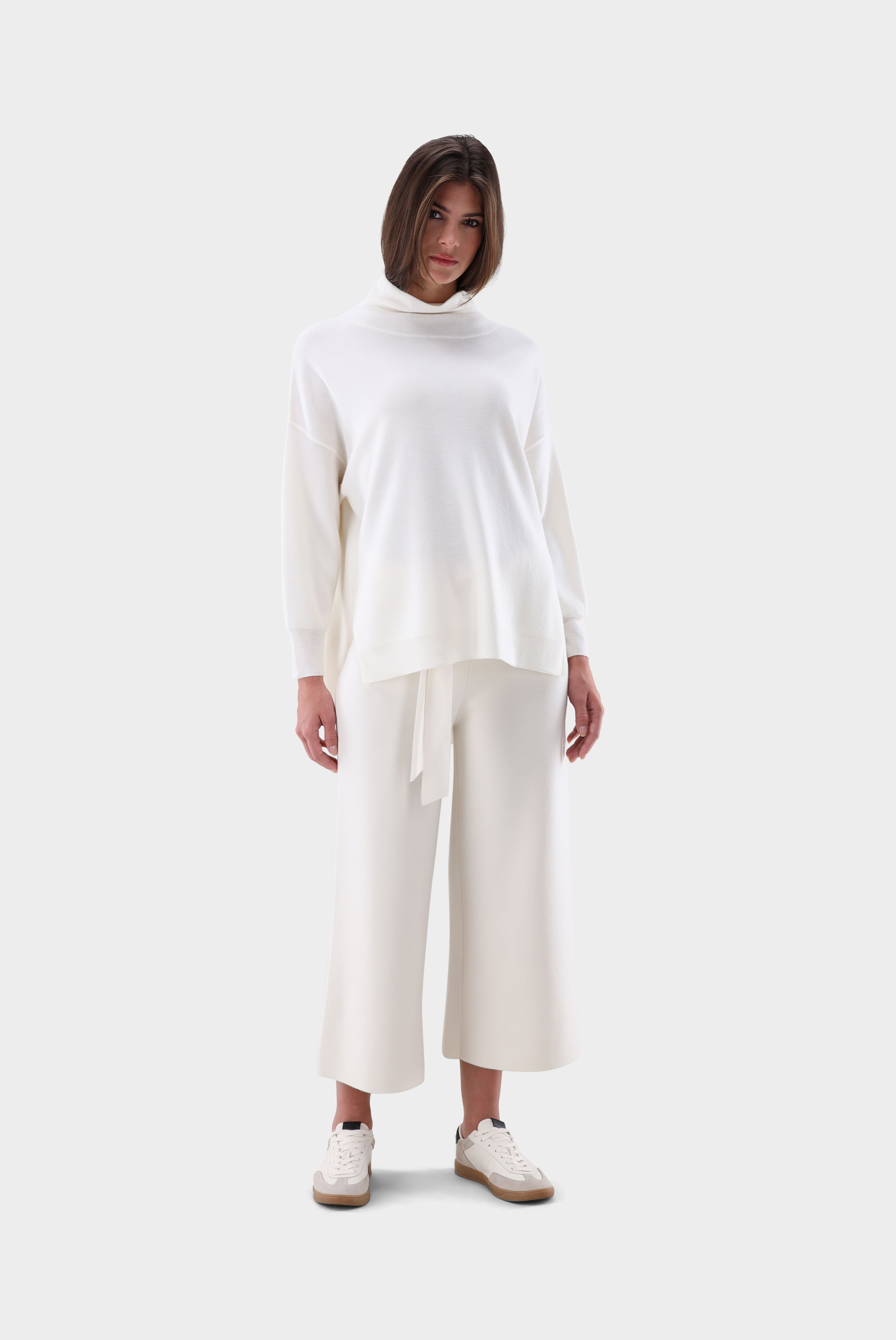 Der Oversized Rollkragenpullover mit langen Schlitzen ist aus hochwertiger Merinowolle gefertigt. Der großzügige Rollkragen verleiht dem Pullover eine elegante Note. Die langen Schlitze an den Seiten verleihen dem Pullover einen modernen Look und bieten gleichzeitig Bewegungsfreiheit. Die Merinowolle sorgt für angenehme Leichtigkeit und Atmungsaktivität, sodass Sie den Pullover das ganze Jahr über tragen können. Ob zu einer schmalen Hose oder einem Rock, dieser Oversized Rollkragenpullover verleiht Ihrem Outfit eine stilvolle und edle Ausstrahlung. Passend dazu ergänzt die Strickhose "Swala" oder "Swanya" mit ausgestelltem Bein das Ensemble perfekt.