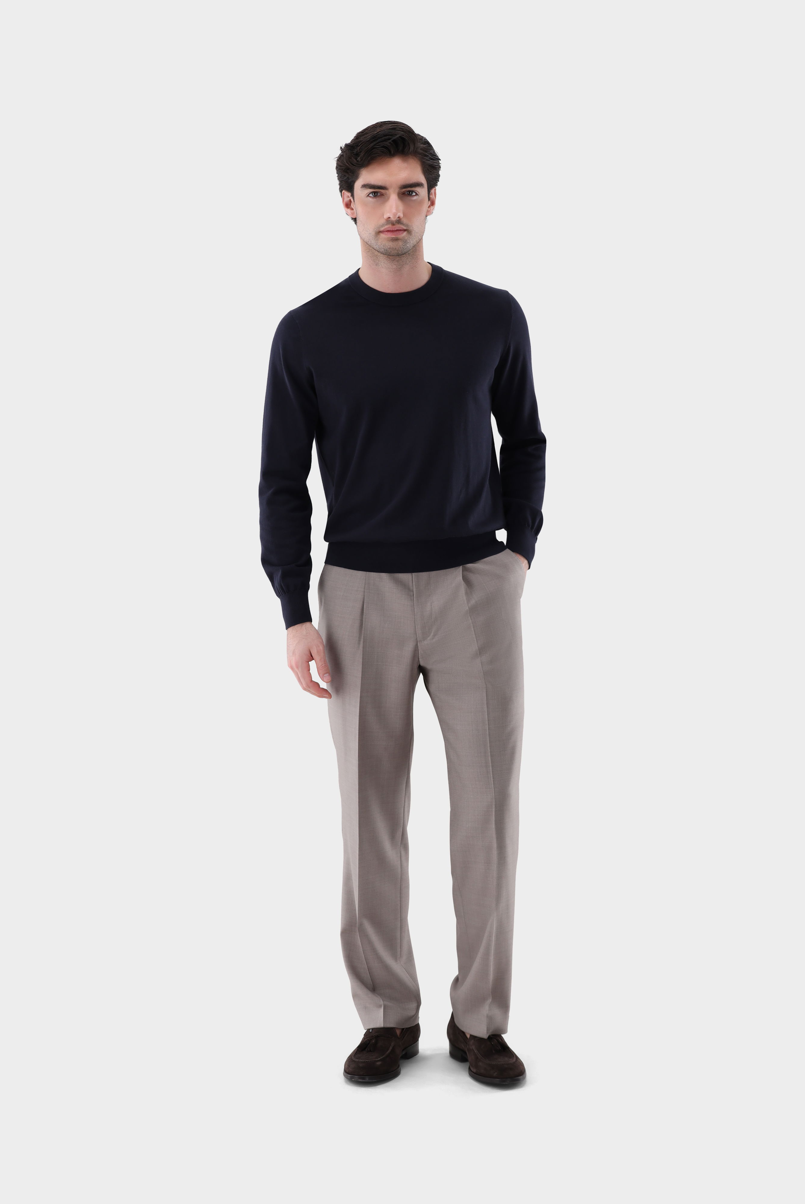 Look aus Rundhalspullover mit Baumwolle und Seide