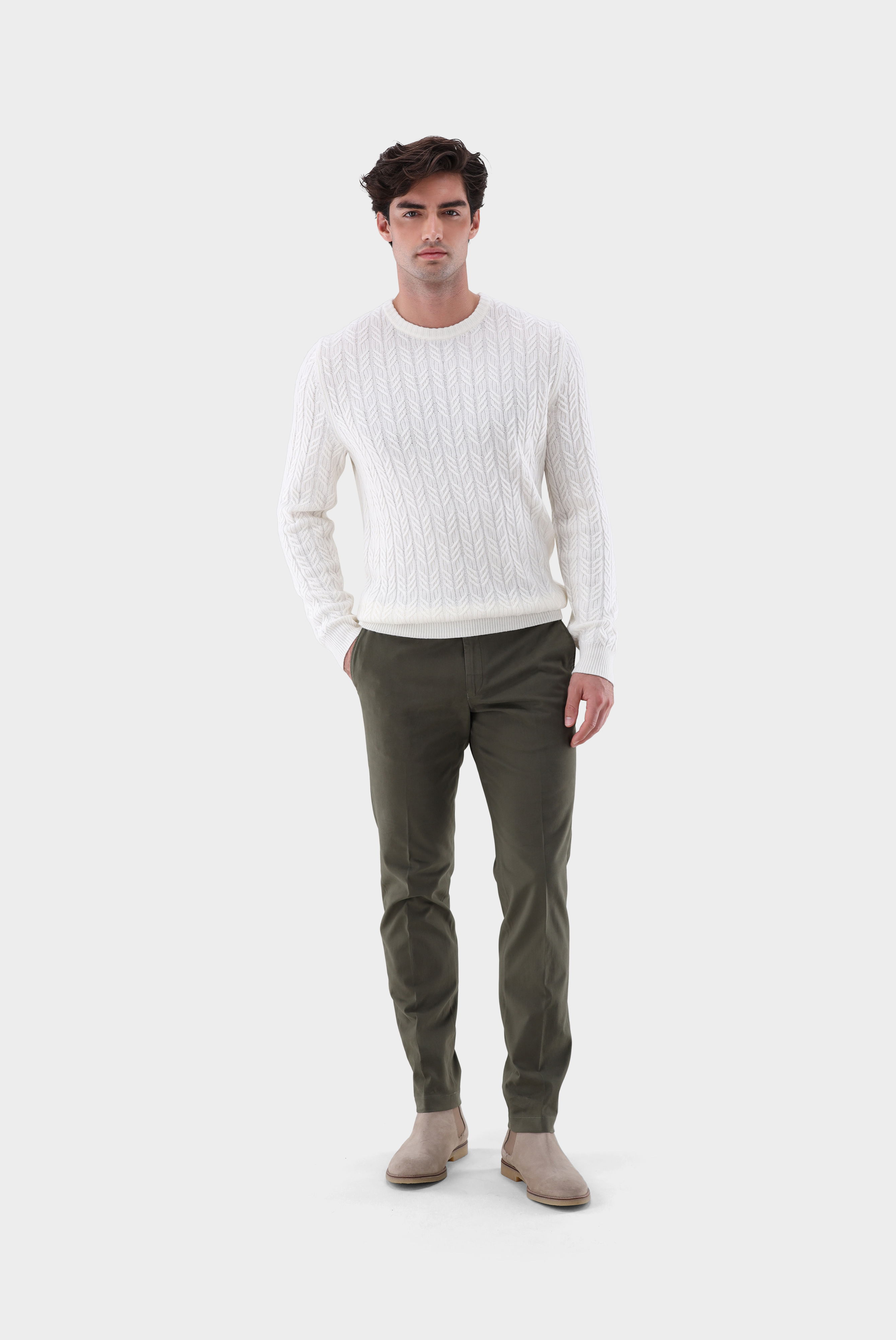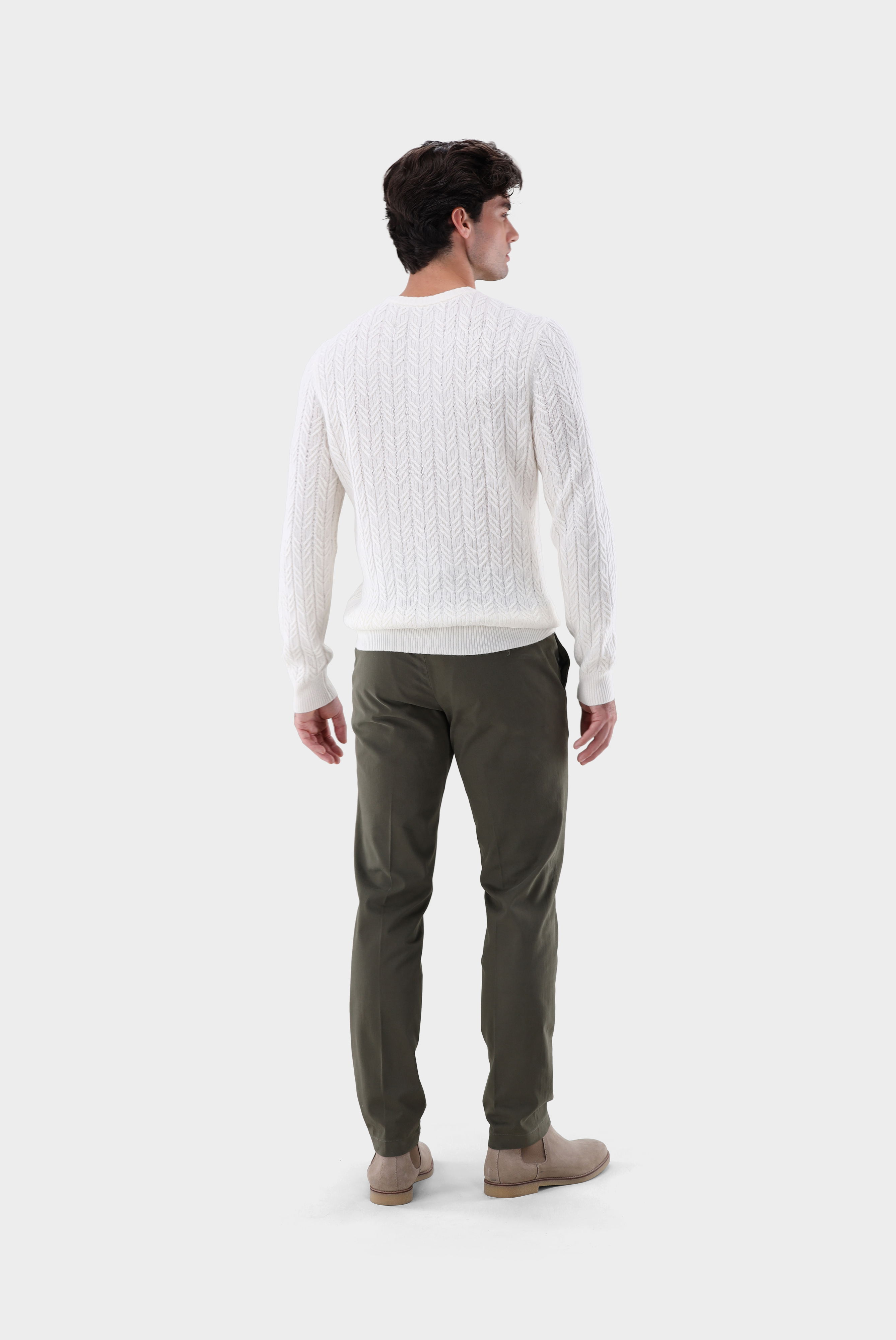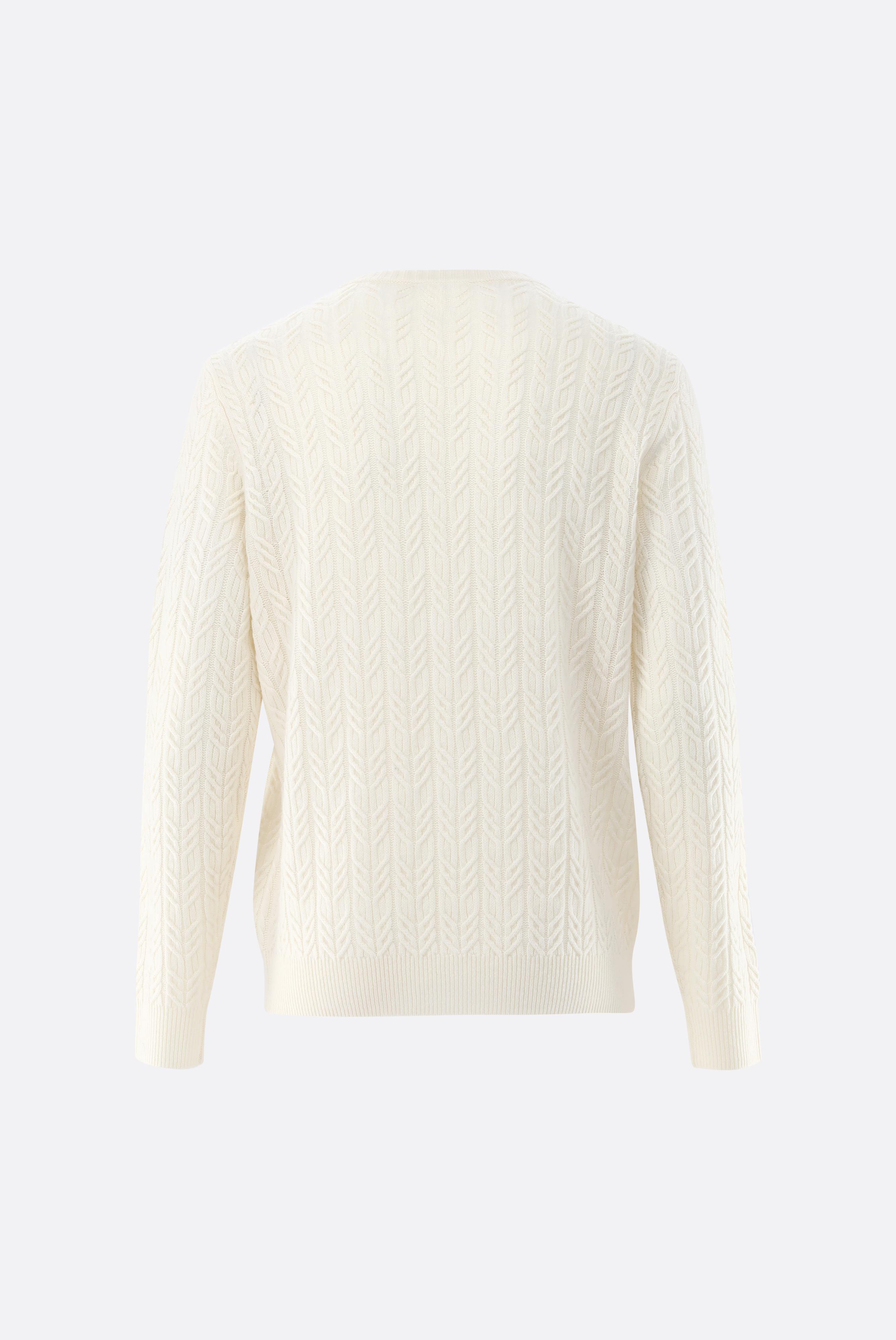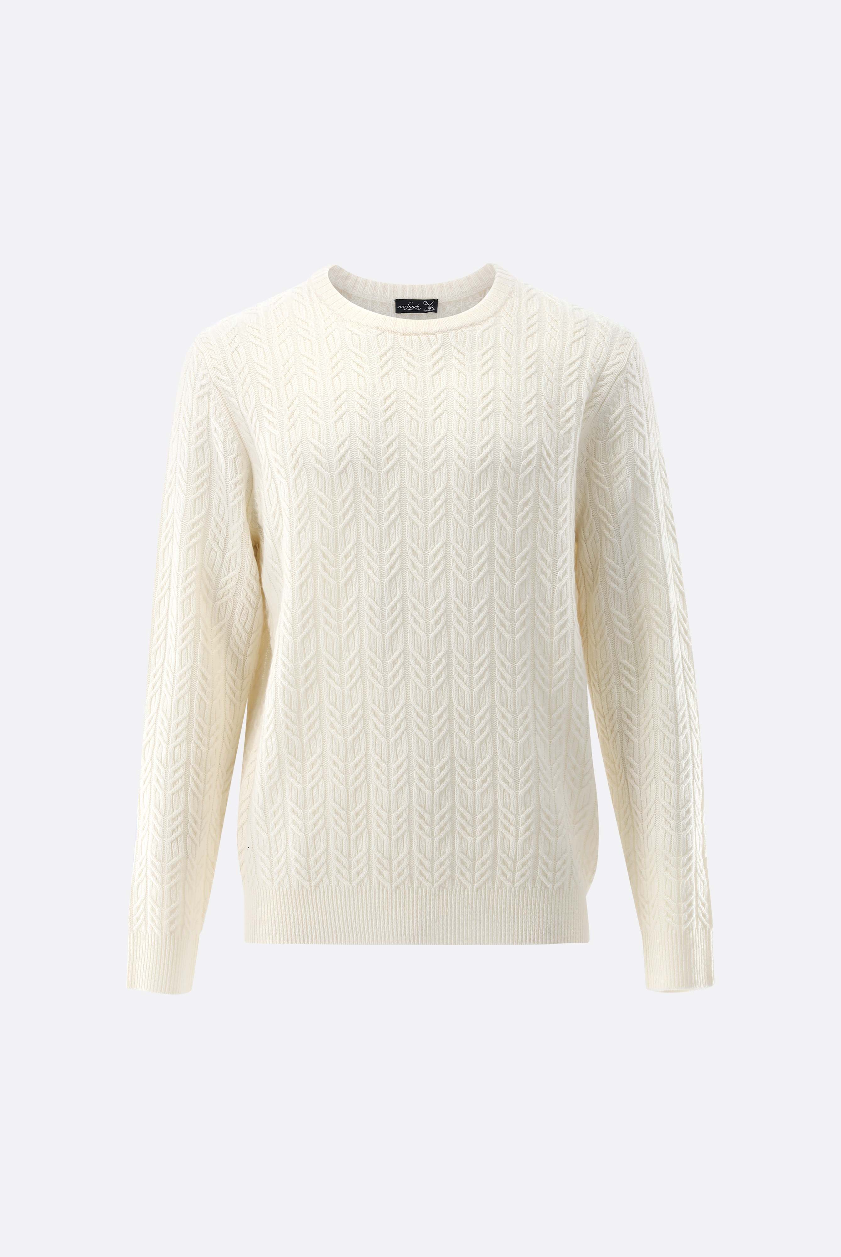 Look aus Rundhalspullover mit Zopfstrick und Kaschmir