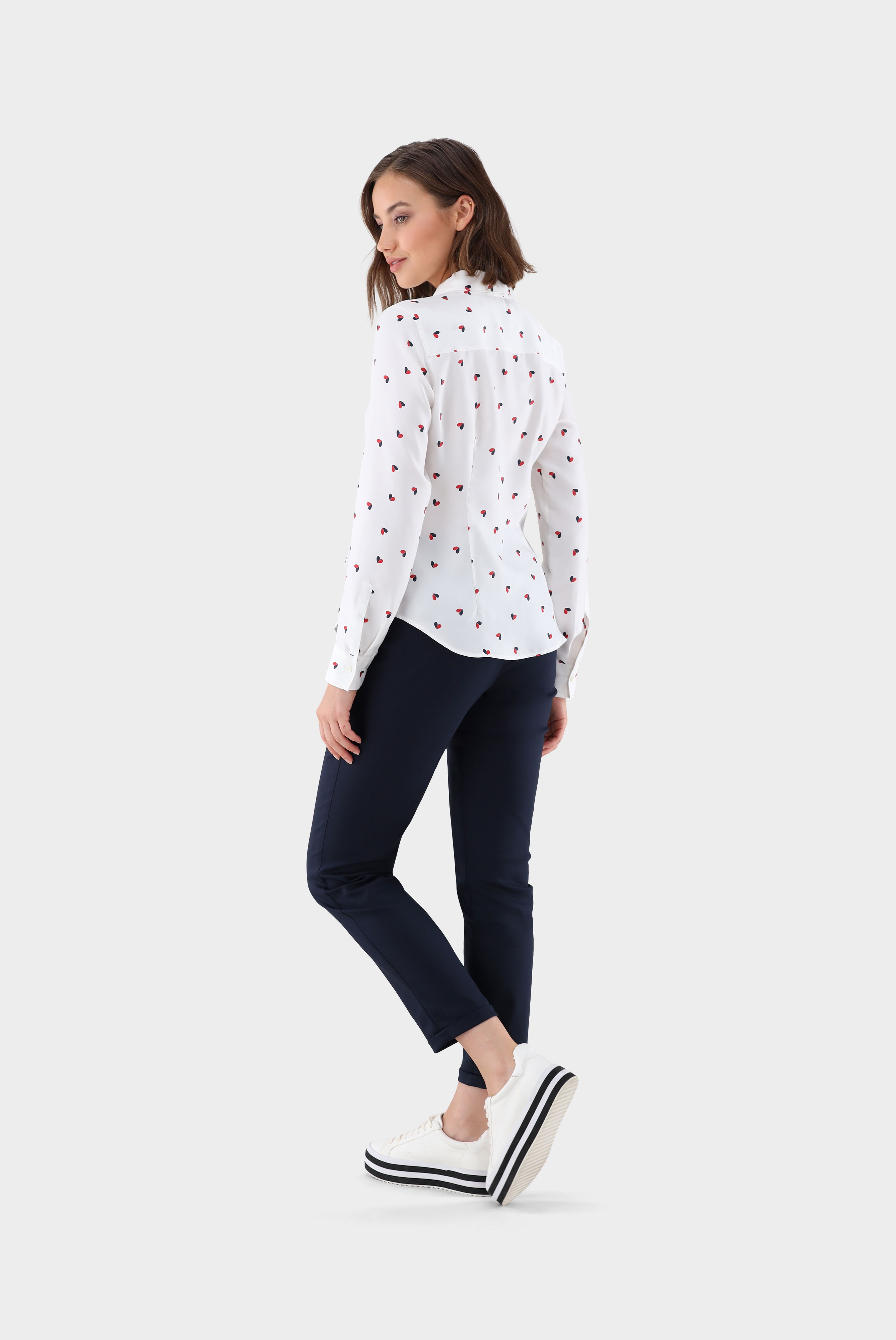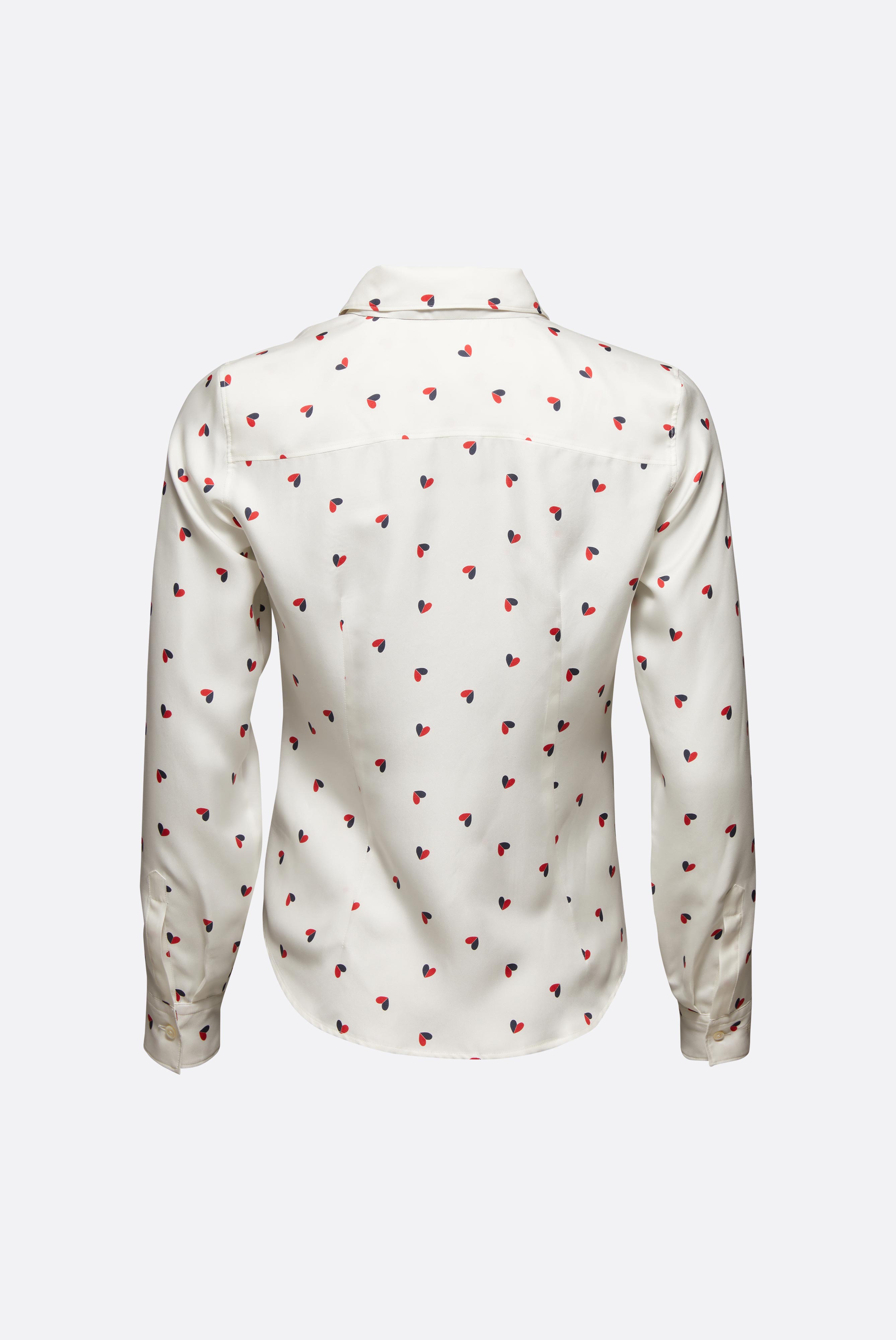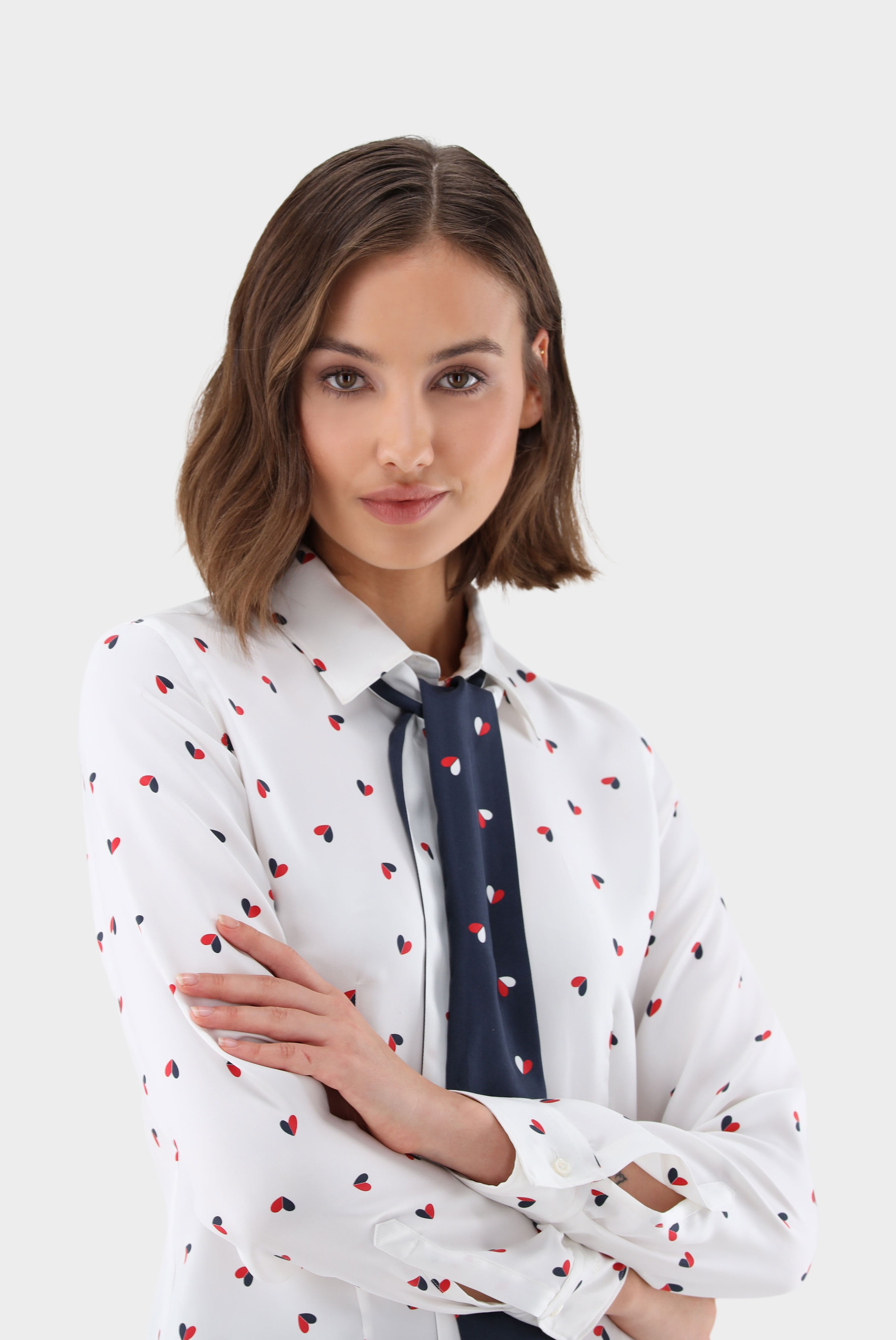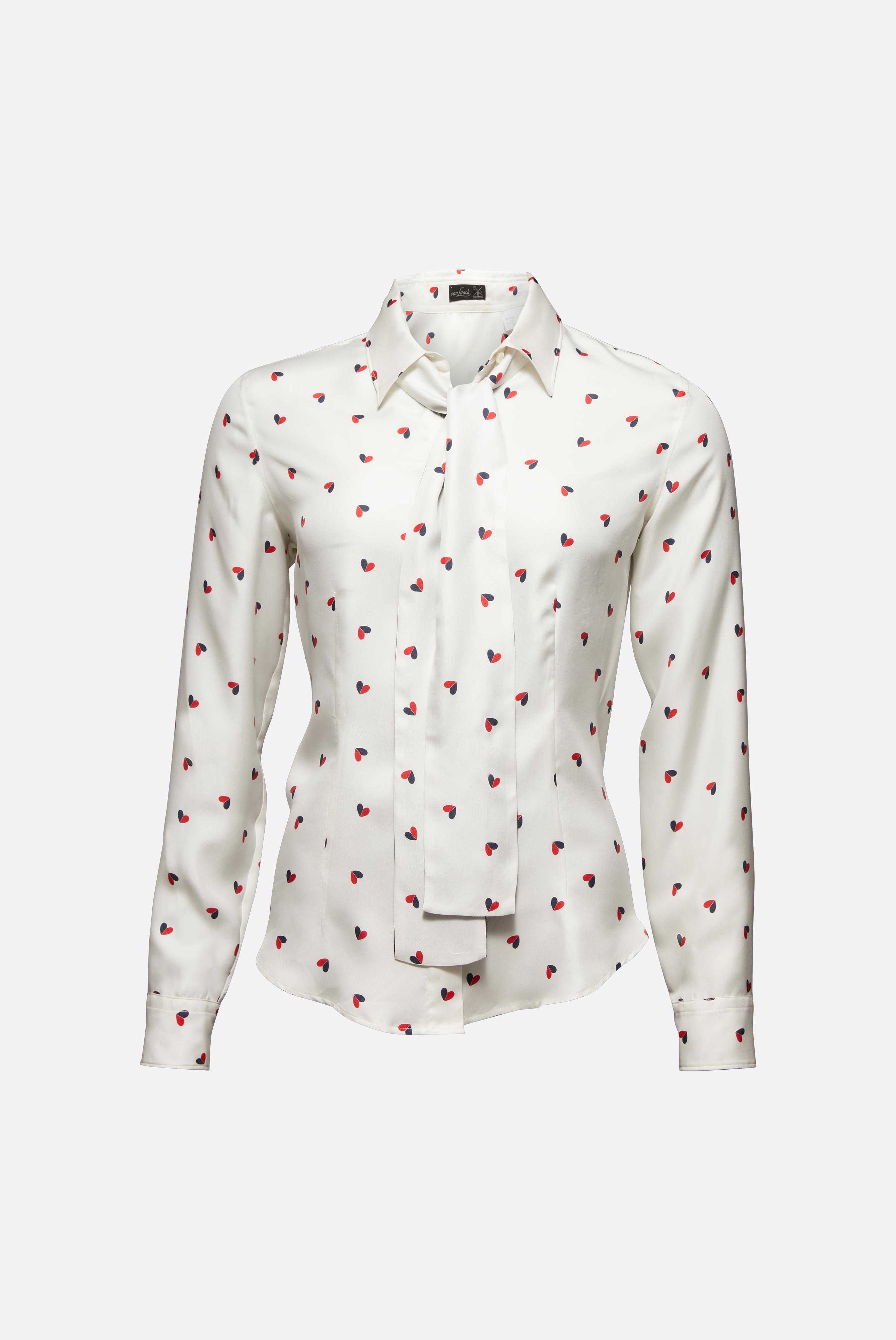 Die taillierte Bluse mit selbstbindender Schleife, aus Seide und dem Herzchen - Druck ist eine elegante Bluse mit Kentkragen und einer lockeren Schluppe. Sie verfügt über eine zweifarbige, lockere Schluppe mit dem gleichen Druck in zwei Farbvarianten und ist mit Perlmuttknöpfen verziert.