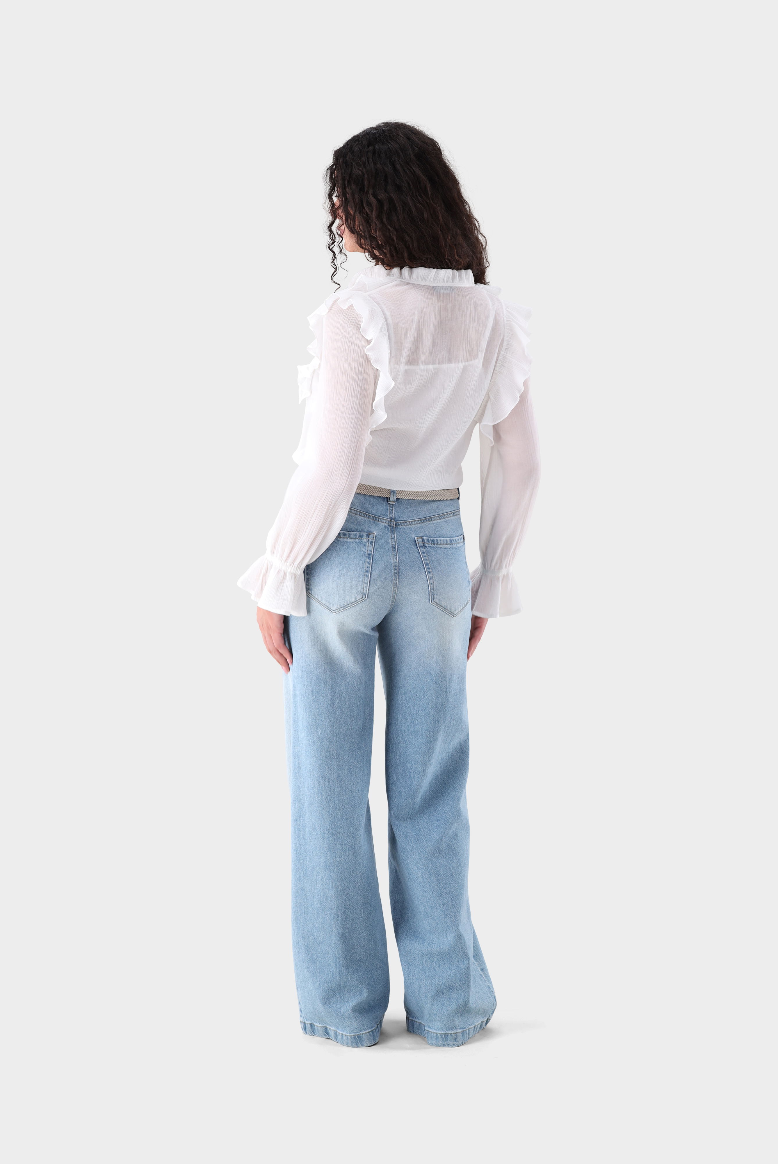 Look aus Schlupfbluse mit Rüschen