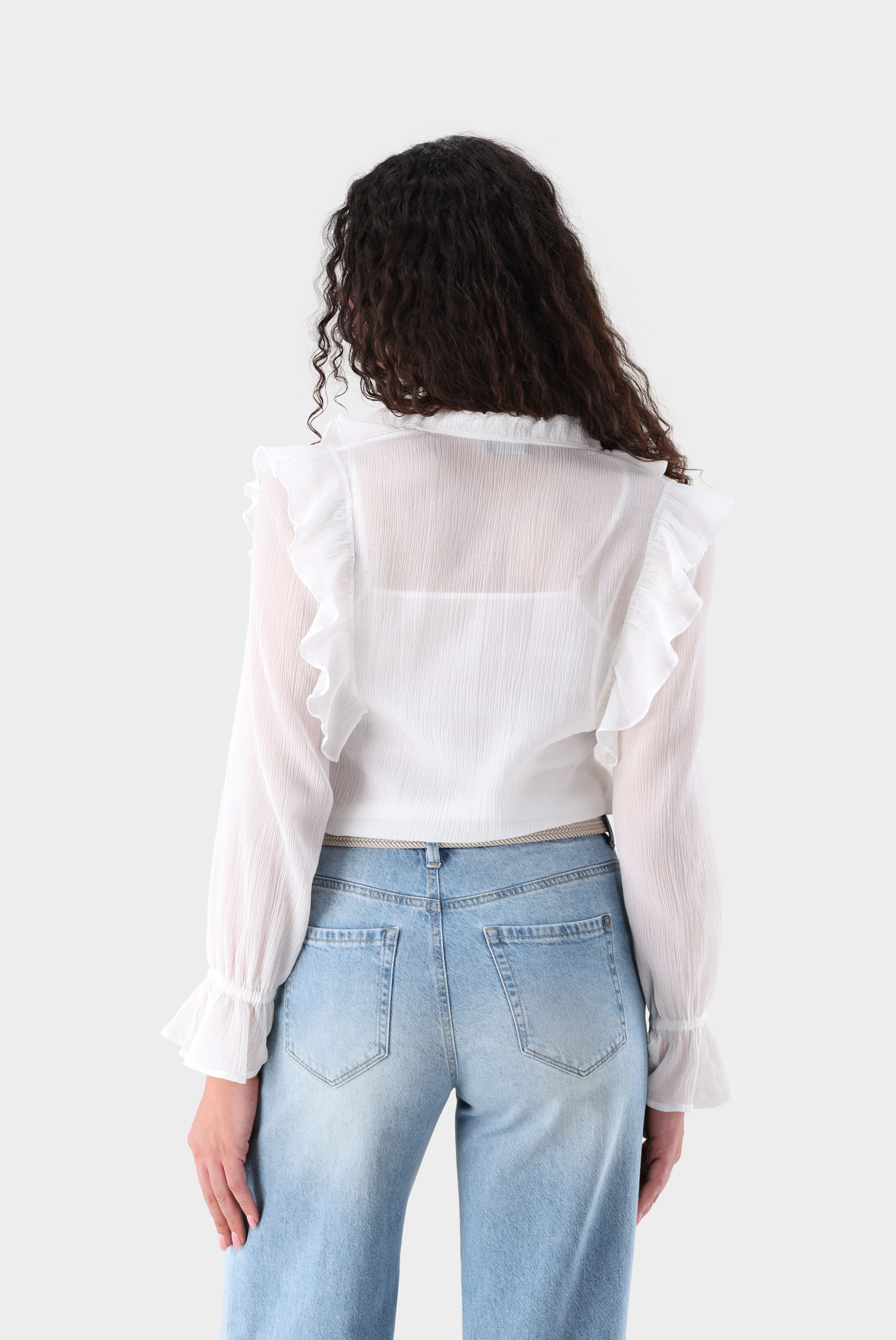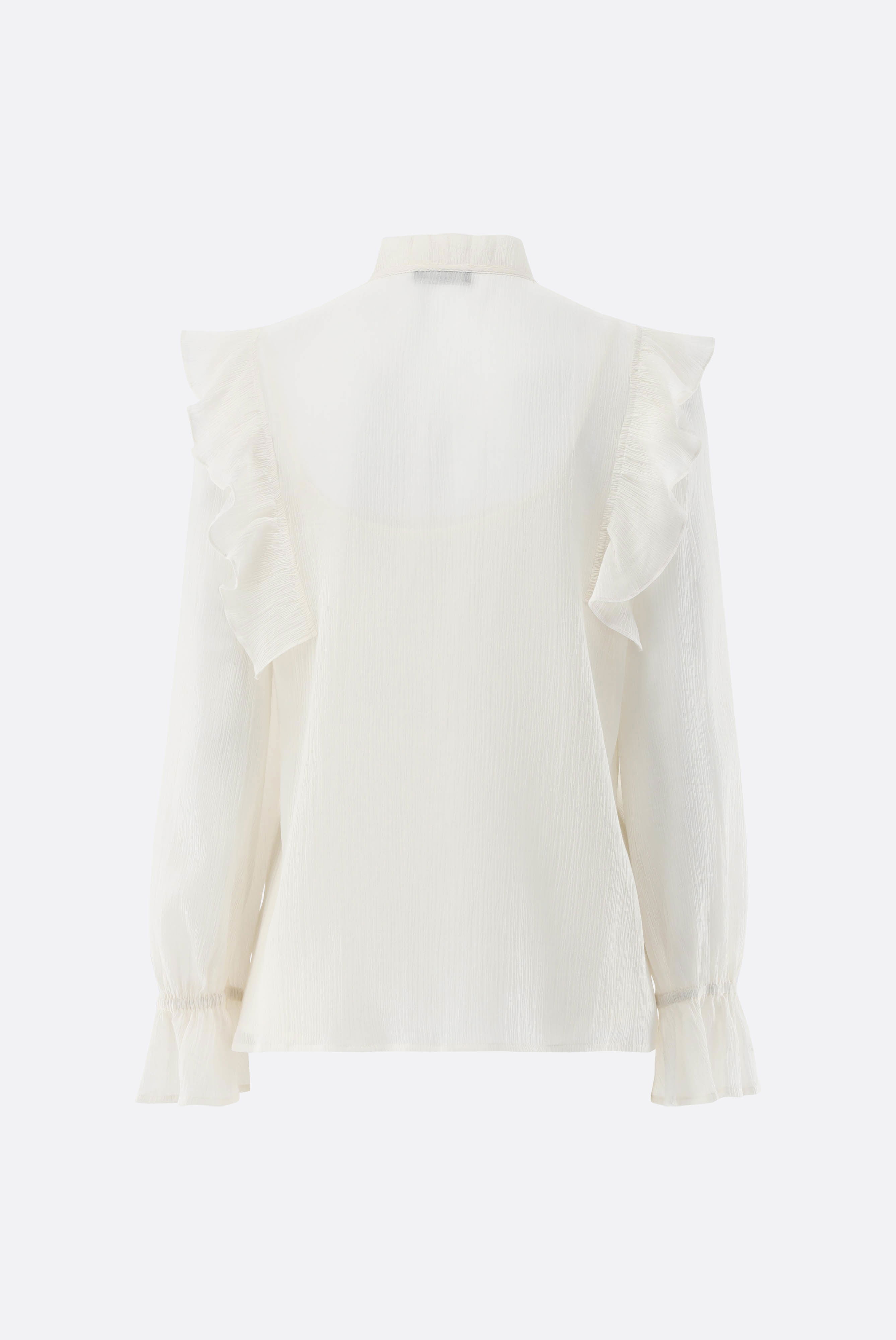 Diese locker sitzende Schlupfbluse aus einem hochwertigen Baumwoll-Seiden-Mischgewebe überzeugt durch fließende Leichtigkeit und besondere Details. Lange Ärmel mit ausgestellten elastischen Bündchen sorgen für Komfort und eine feminine Silhouette. Der gerüschte Rundhalsausschnitt sowie Kaskadenrüschen vorne und hinten verleihen dem Design Struktur und Eleganz. Knöpfe mit Schlaufenverschluss ergänzen die feine Verarbeitung. Der dezente Crinkle-Effekt unterstreicht die moderne Optik und macht die Bluse ideal für stilvolle Casual- und besondere Anlässe.
