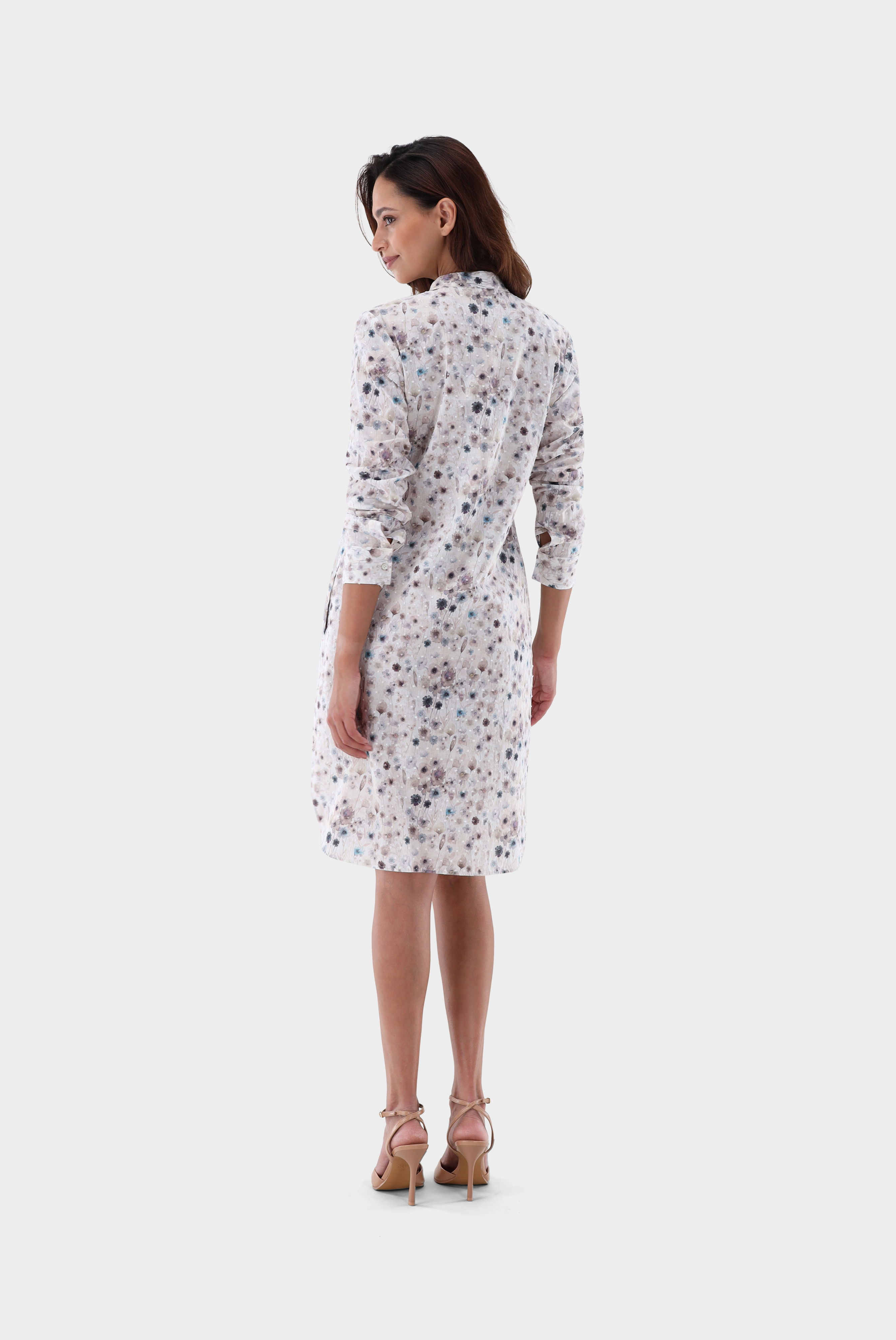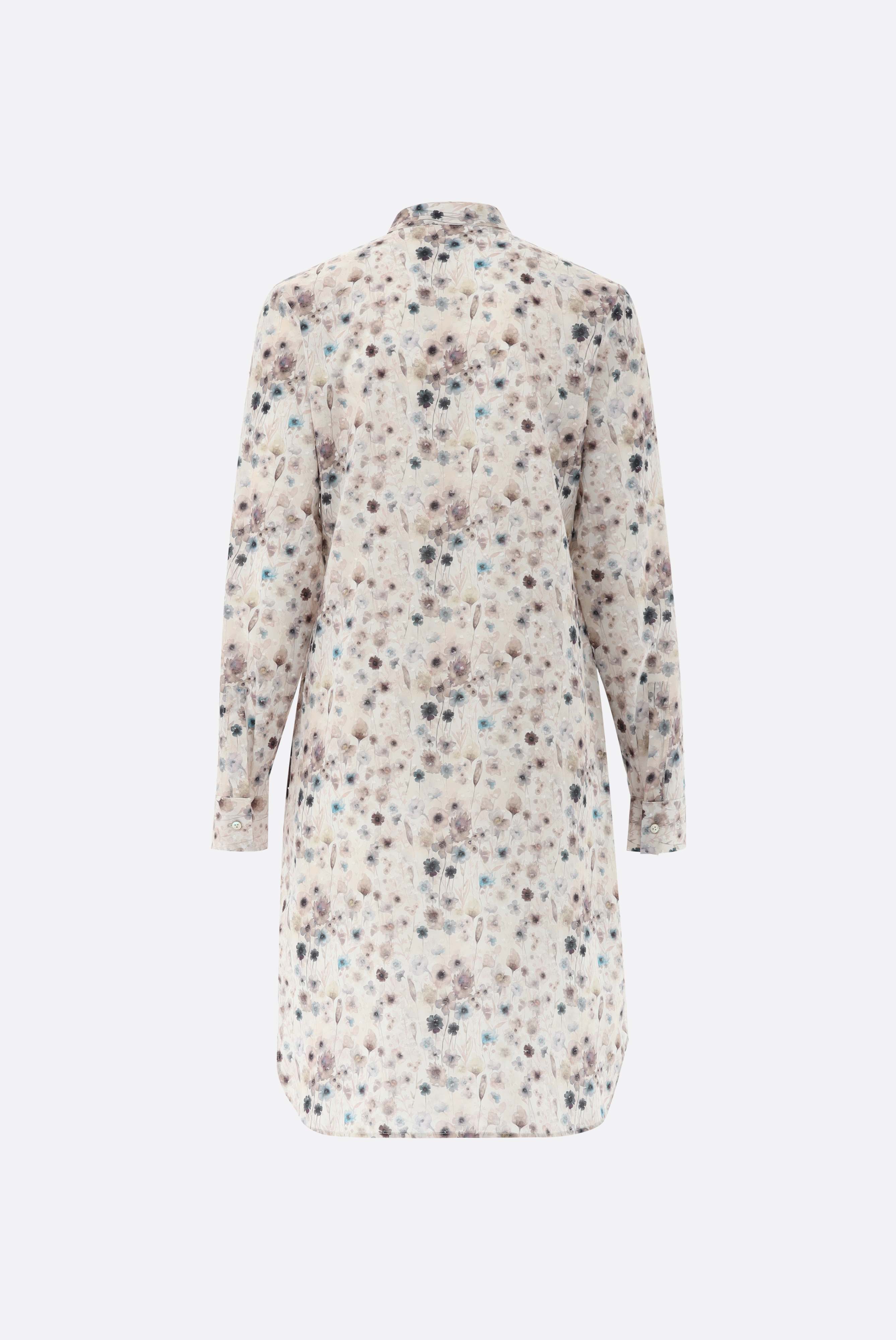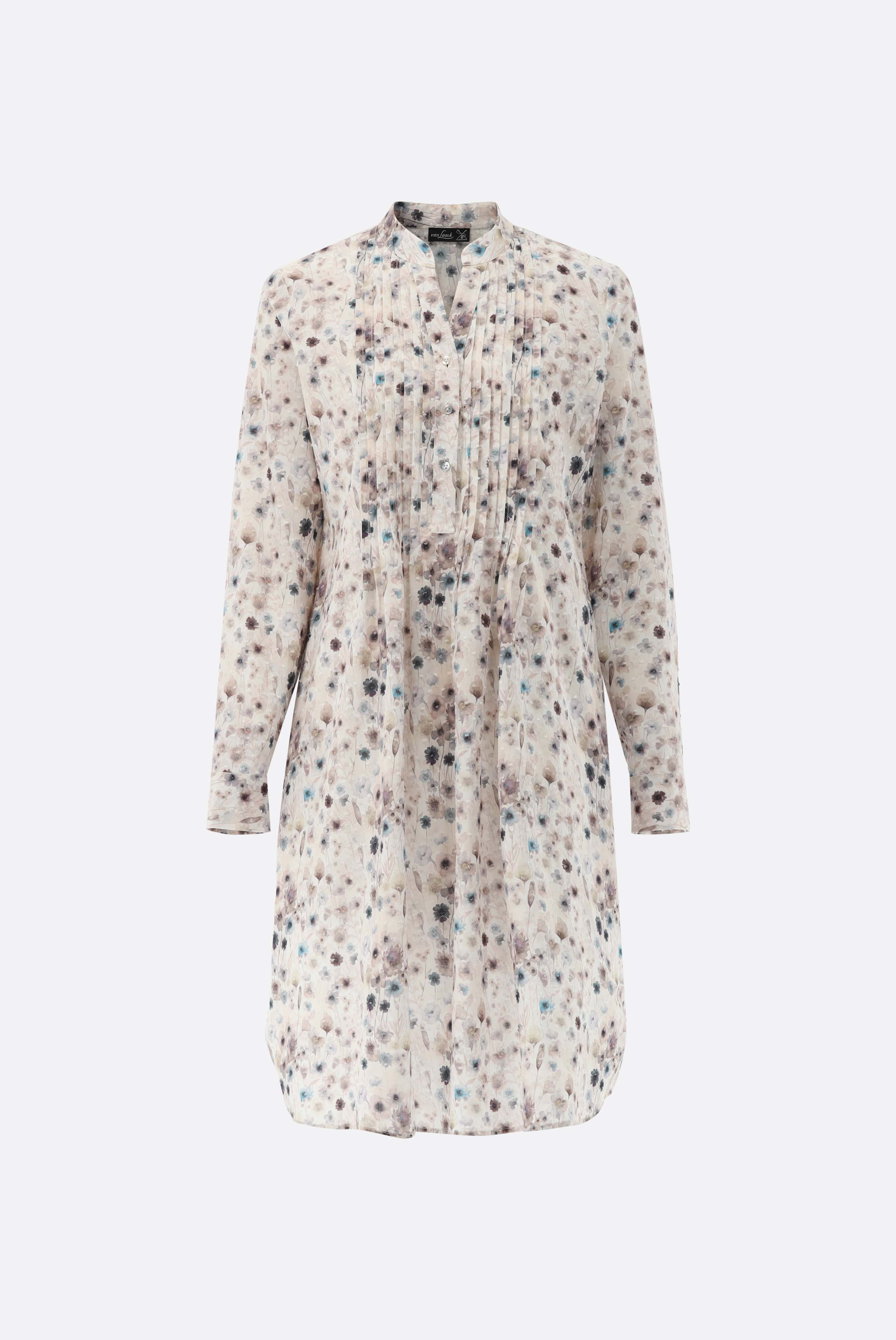 Das knielange Schlüpfkleid mit halblangen Ärmeln und Stehkragen präsentiert sich in einem BW Voile Plumetis mit einem bezaubernden Druck. Plumetis ist ein Gewebe mit kleinen erhabenen Punkten, die an Wattebäusche oder Schneeflocken erinnern. Das Tunika-Kleid ist halbtailliert, hat einen flachen Stehkragen, Biesen auf beiden Seiten der Leiste und praktische Seitennahttaschen. Es ist komplett gefüttert und wird mit Perlmuttknöpfen geschlossen.