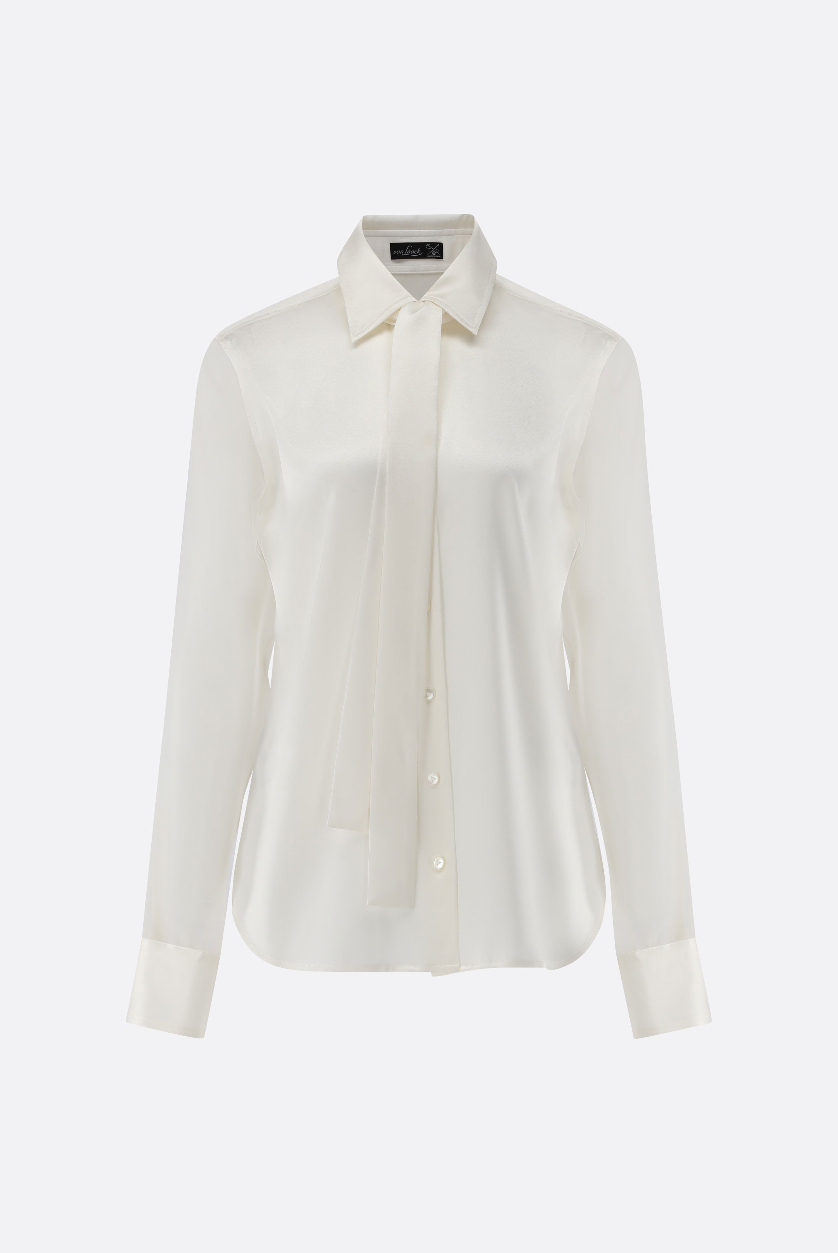 Klassische Hemdbluse mit halb tailliertem Schnitt, gefertigt aus Seide. Die transparenten Ärmel aus Organza und die abnehmbare Schluppe verleihen der Bluse einen eleganten Touch. Sie hat einen figurnahen Schnitt, lange Ärmel mit Manschette und einen leicht geschwungenen Saumverlauf.