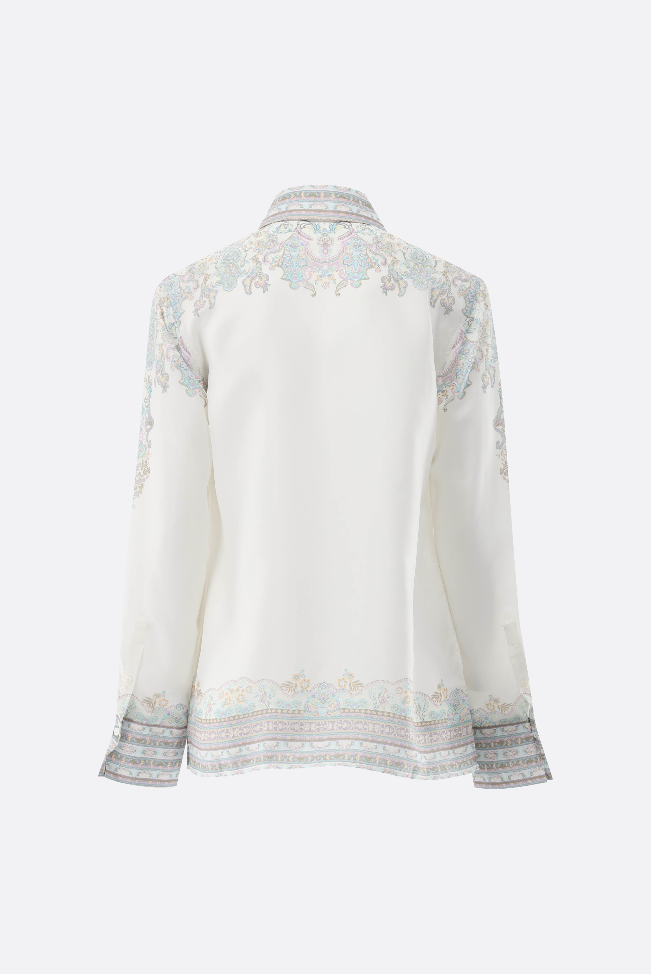 Diese taillierte Hemdbluse aus feinem Seiden-Habotai besticht durch ihren platzierten Paisley-Druck. Der leichte, weiche Stoff sorgt für luxuriösen Tragekomfort, während eine verdeckte Knopfleiste und Perlmuttknöpfe das Design abrunden. Ideal für elegante Business- und Casual-Looks. Zusammen mit dem Rock REJA-PX, kann die Bluse als total Look kombiniert werden.