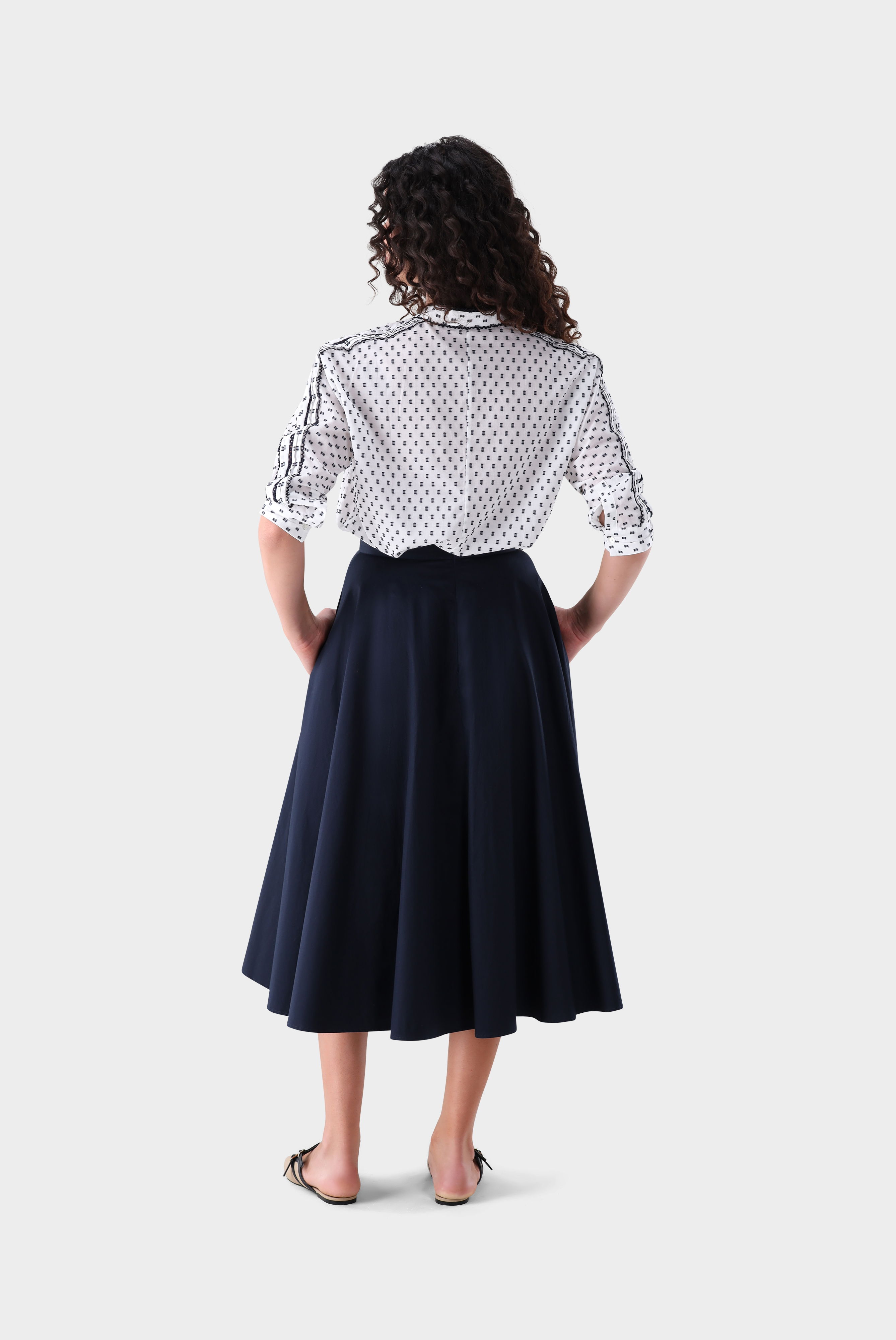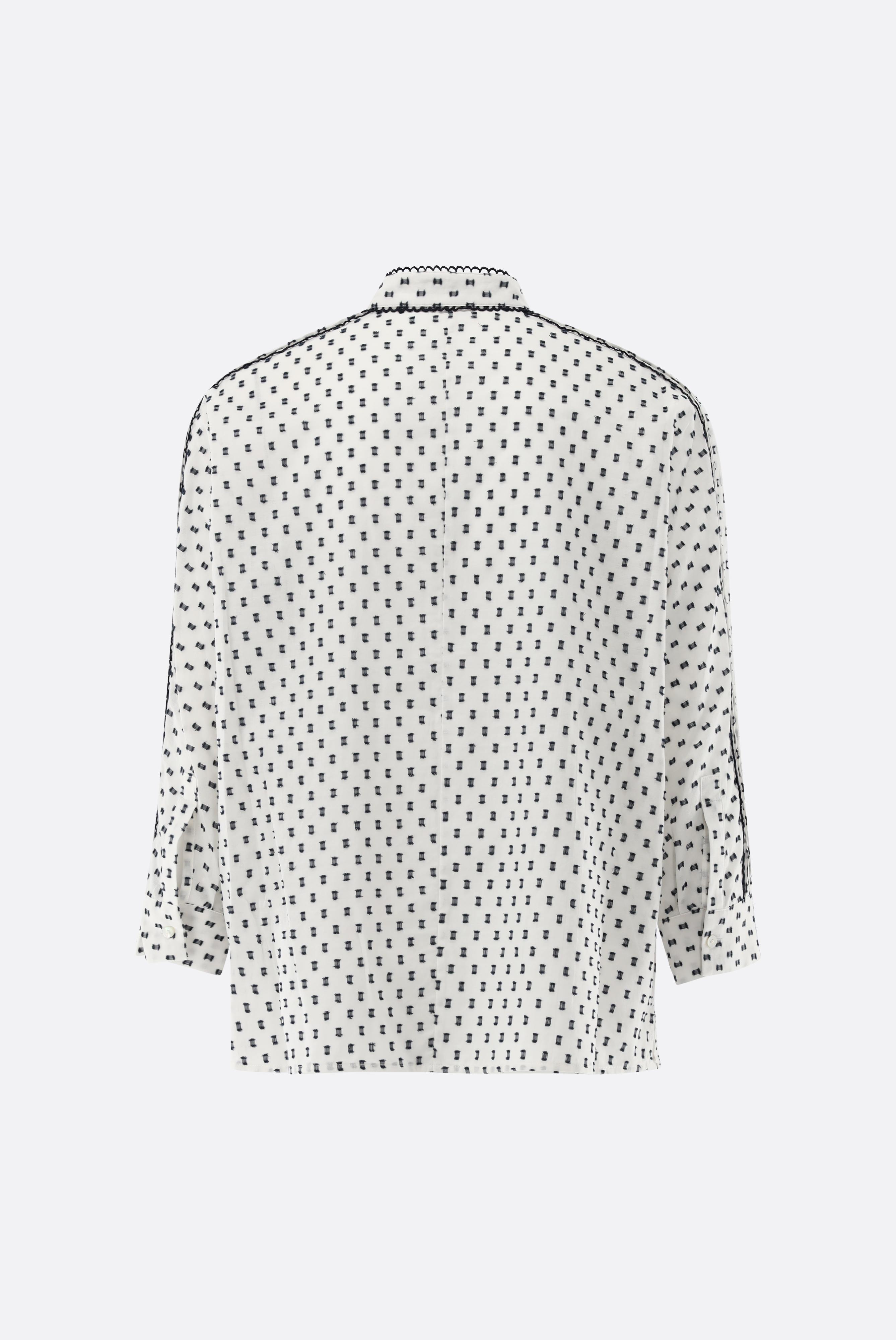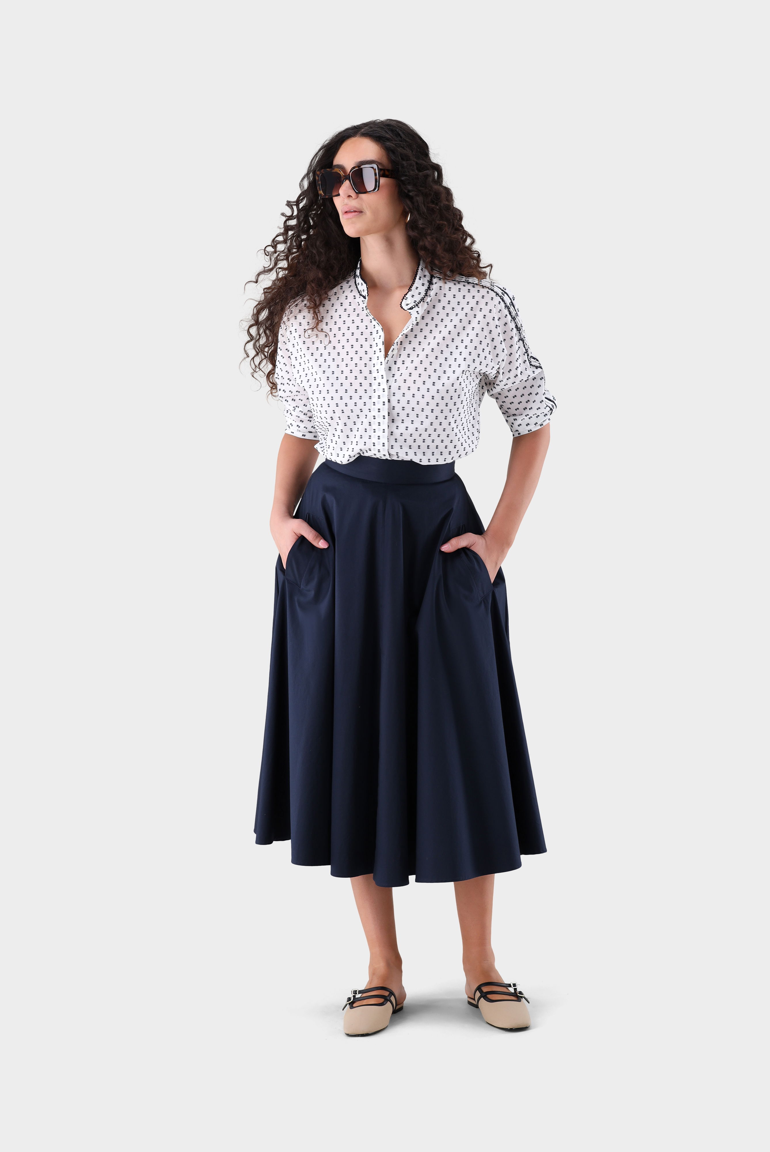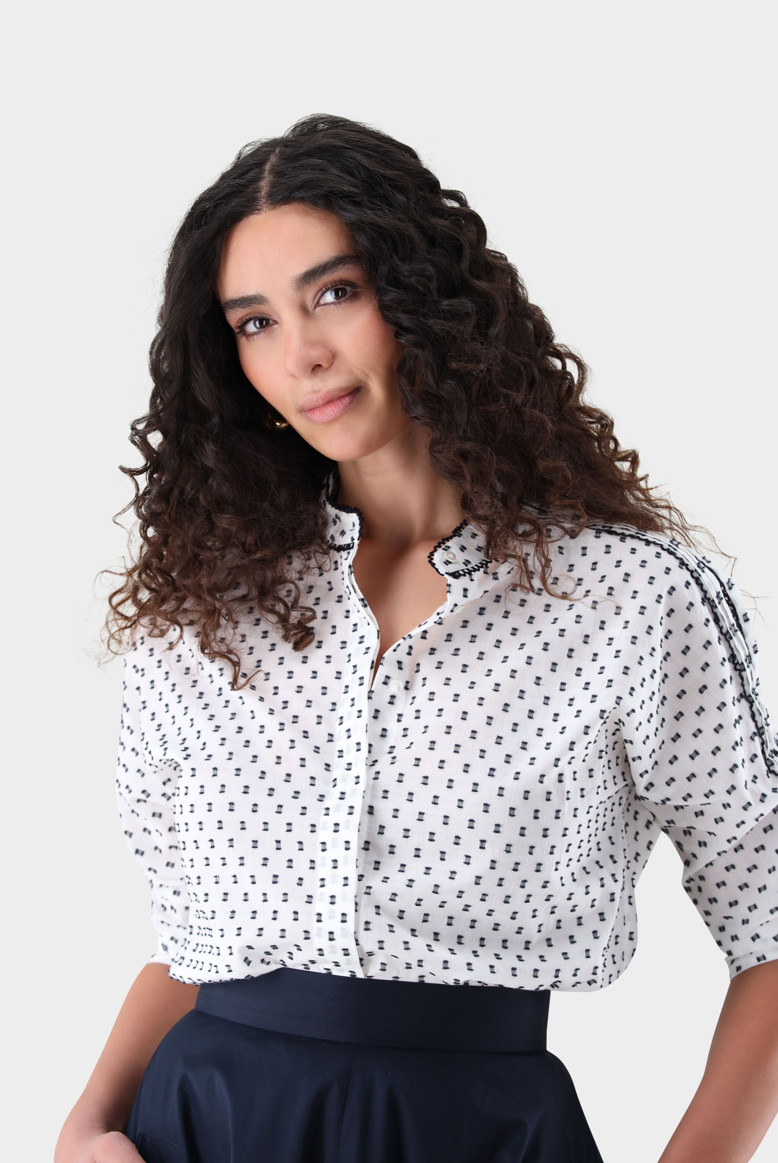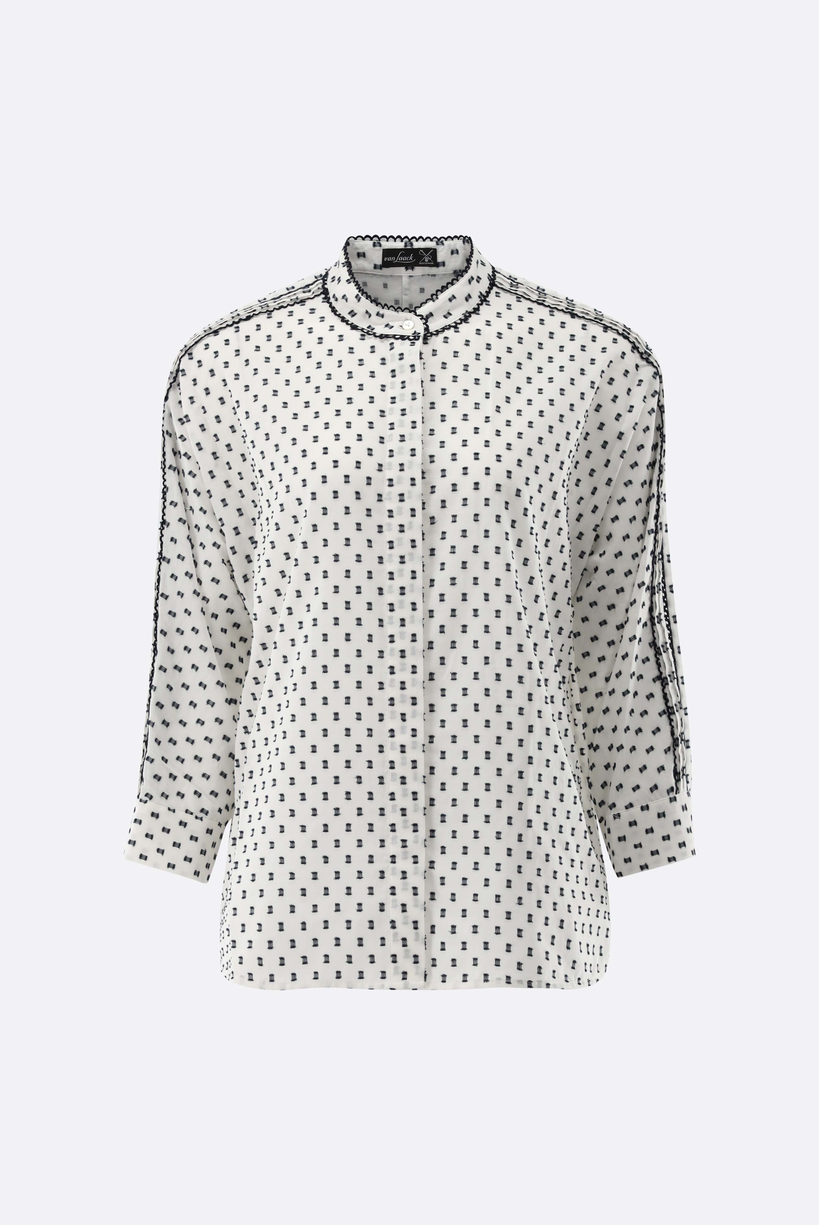 Look aus Stehkragen-Bluse aus Bauwoll-Plumetis