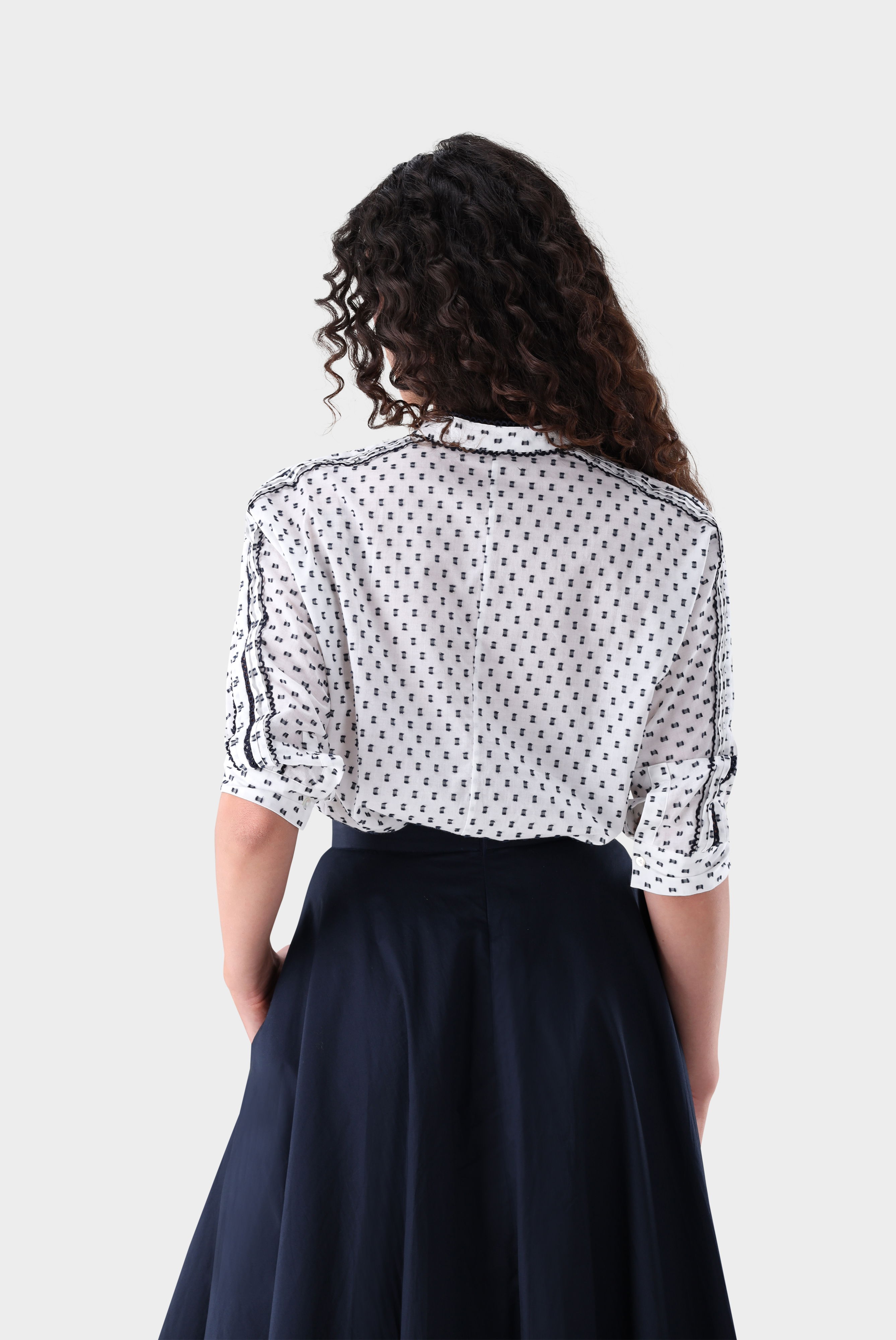 Dieses Boxy-Shirt aus Baumwollbatist überzeugt durch moderne, lockere Silhouette und hochwertige Details. 7/8-angesetzte Ärmel und Seitenschlitze sorgen für Bewegungsfreiheit, während der Stehkragen und die verdeckte Knopfleiste eine klare Linie schaffen. Feine Spitzeneinsätze an den Ärmeln und dezente Faltenapplikationen setzen elegante Akzente. Das kontrastierende Plumetis-Material unterstreicht die edle Verarbeitung. Vielseitig kombinierbar, eignet sich das Shirt ideal für stilvolle Casual- und Freizeit-Looks mit femininer, zeitgemäßer Ausstrahlung.