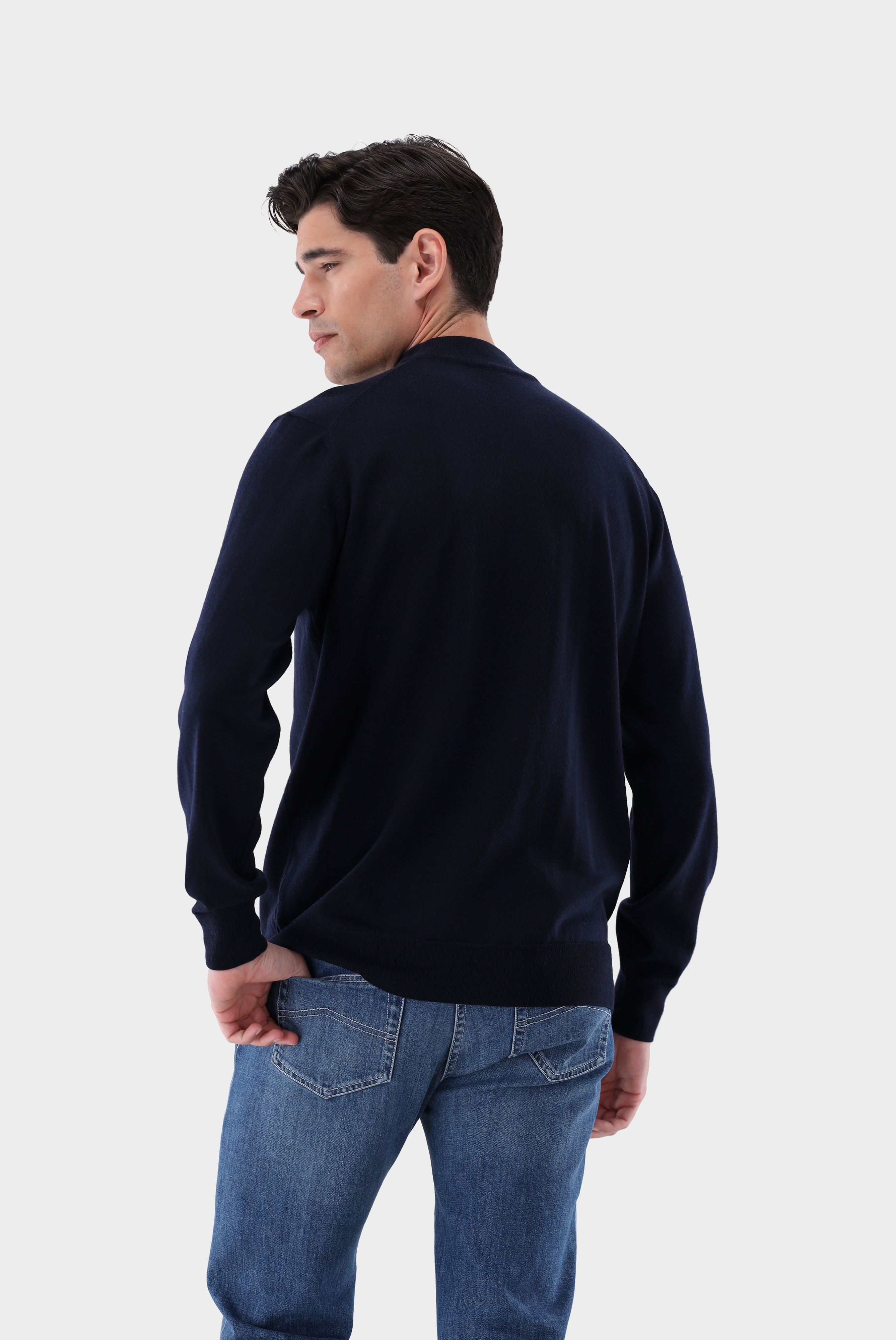 Der Stehkragenpullover aus exklusiver merzerisierter Merinowolle ist ein klassisches und hochwertiges Kleidungsstück. Hergestellt aus feinster merzerisierter Merinowolle, bietet dieser Pullover ein angenehmes Tragegefühl und eine edle Optik. Der Stehkragen verleiht dem Pullover eine zeitlose Eleganz und unterstreicht den modernen Stil. Dieser Pullover ist vielseitig kombinierbar und eignet sich sowohl für formelle Anlässe als auch für den lässigen Freizeitlook. Die merzerisierte Merinowolle sorgt für eine angenehme Wärmeisolierung und Atmungsaktivität, wodurch der Pullover das ganze Jahr über getragen werden kann. Die Passform ist schlank und schmeichelhaft, was dem Pullover eine moderne Silhouette verleiht.