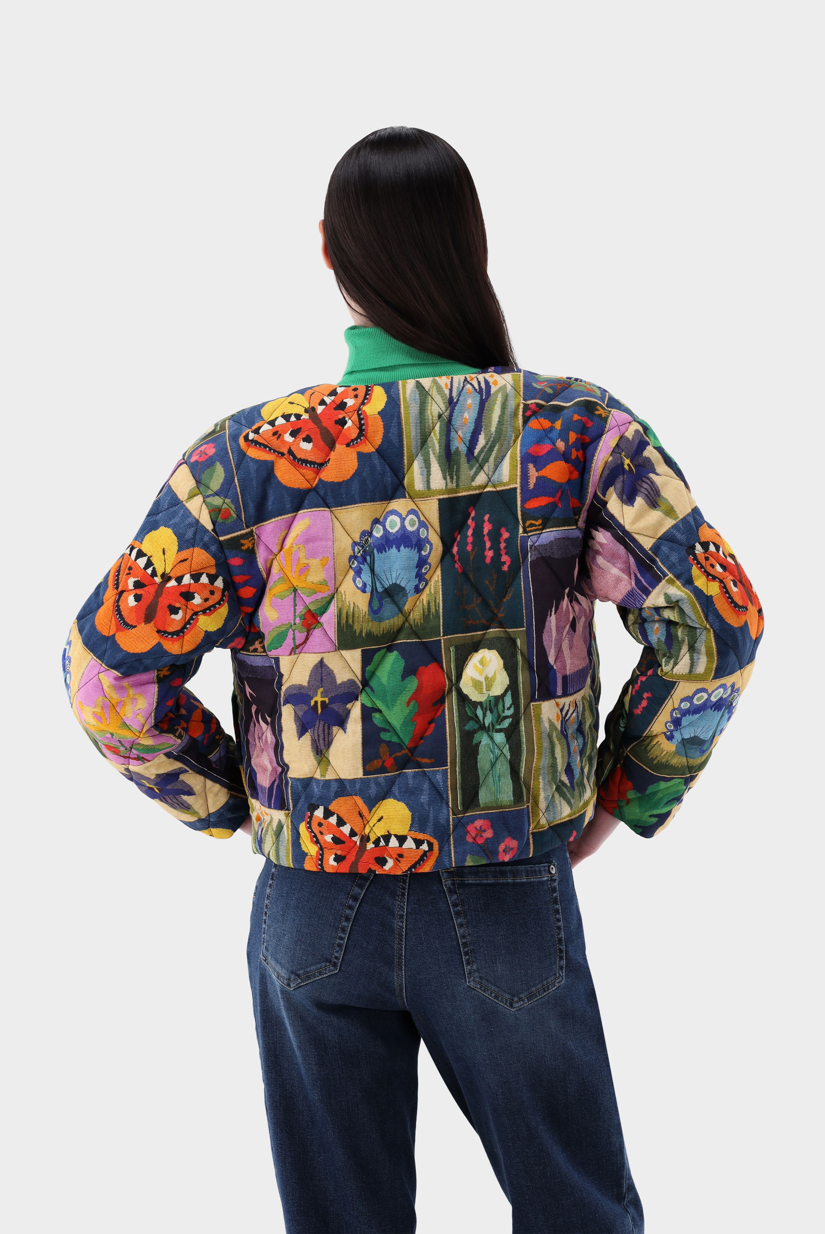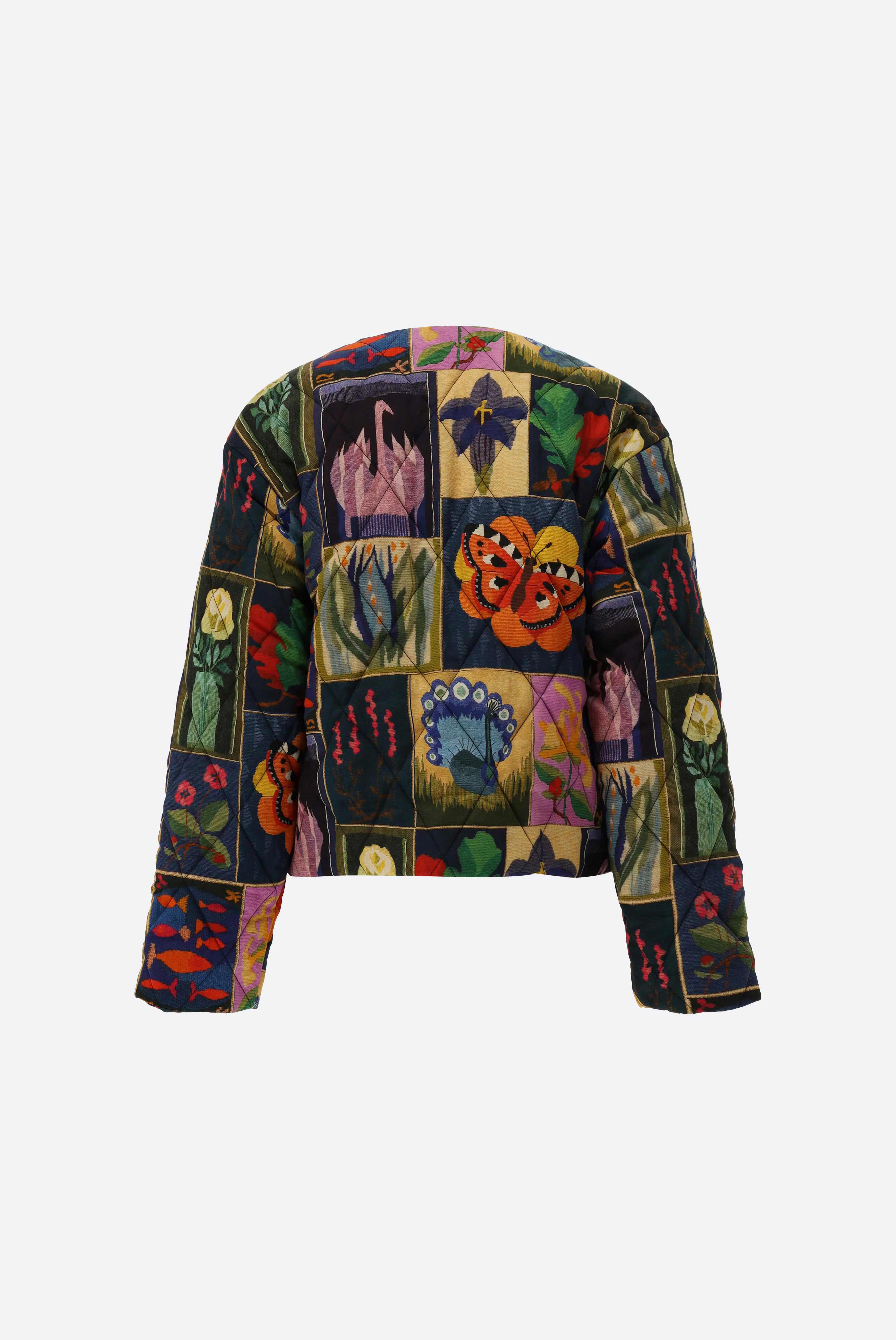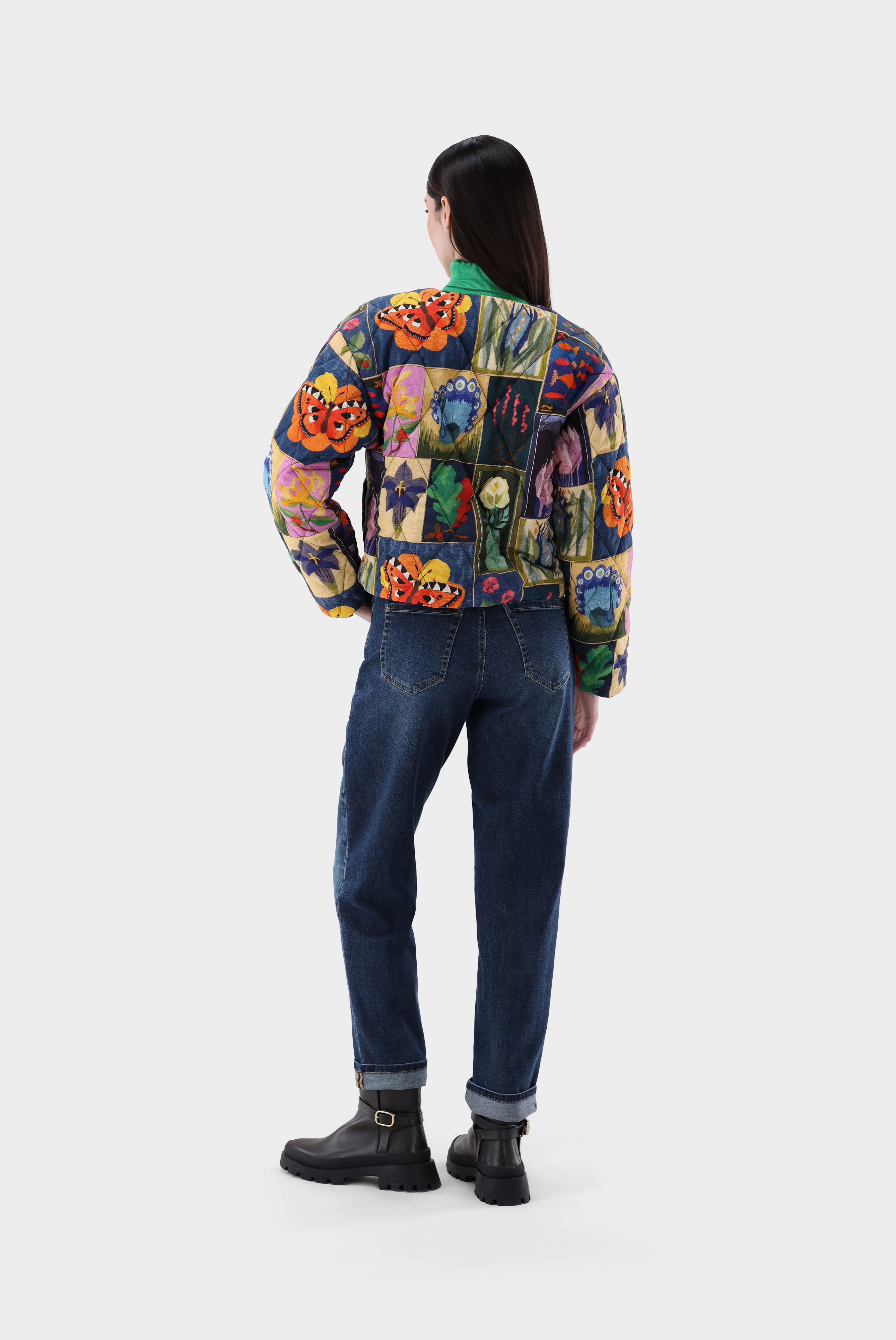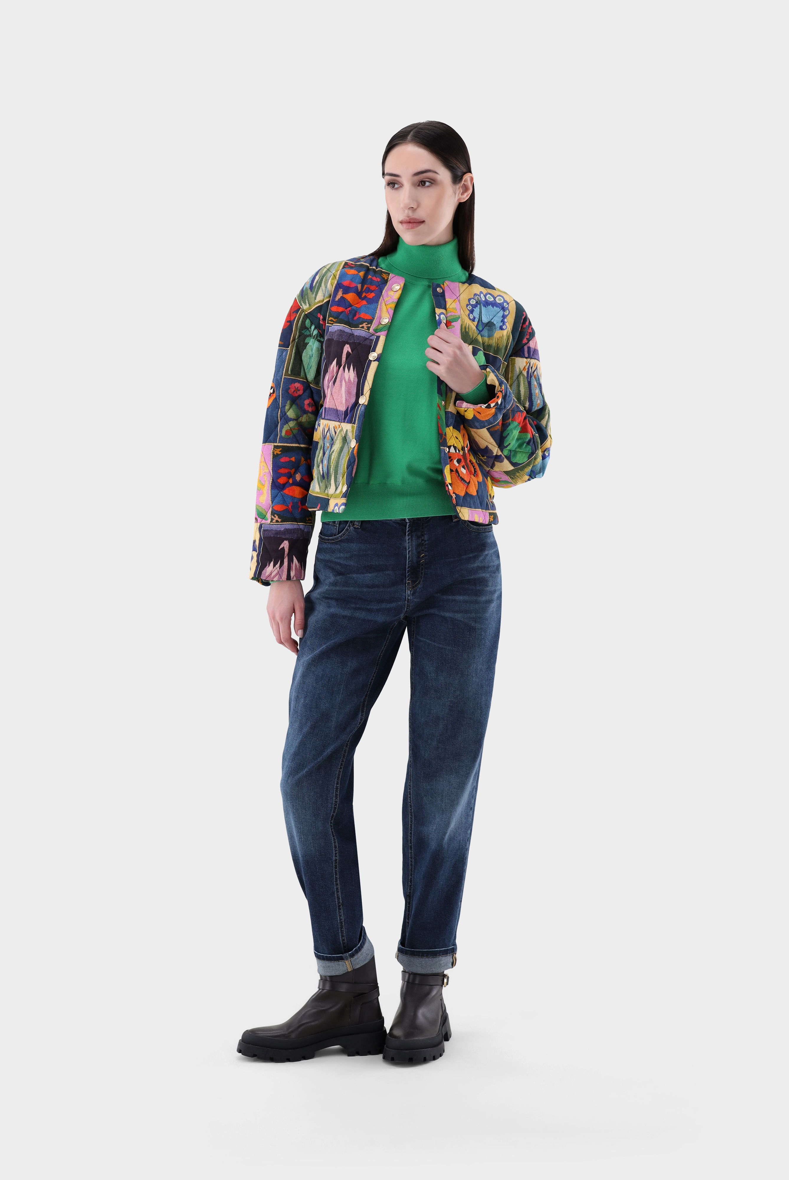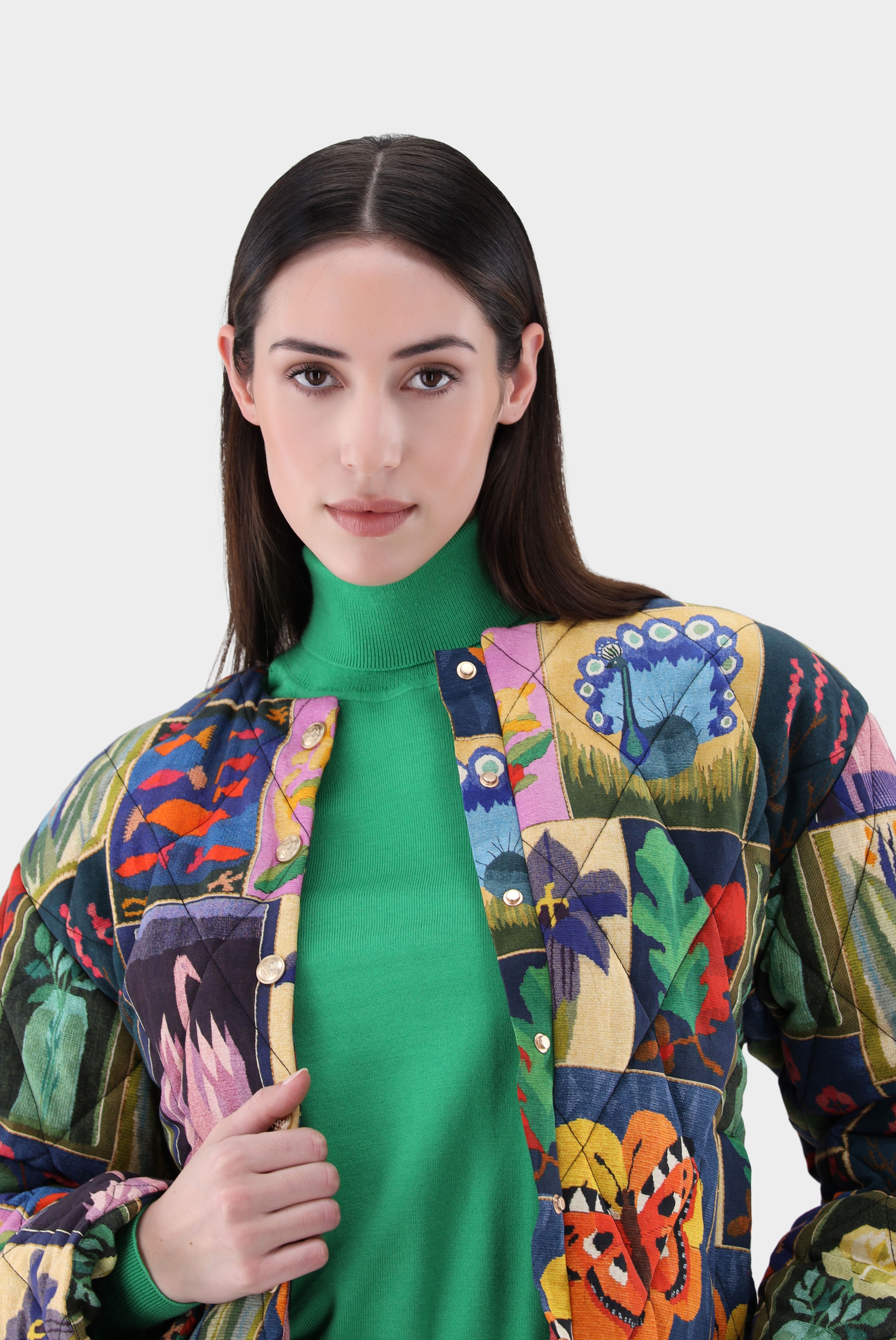 Kurze gesteppte Jacke ohne Kragen mit langen Ärmeln, aus einem Gemisch aus Viskose und Leinen mit buntem Druck. Diese Jacke ist mit goldenen Druckknöpfen versehen, gefüttert und zeigt ein gestepptes Rautenmuster. Vorne befinden sich Leistentaschen. Geeignet für casual und business Anlässe.