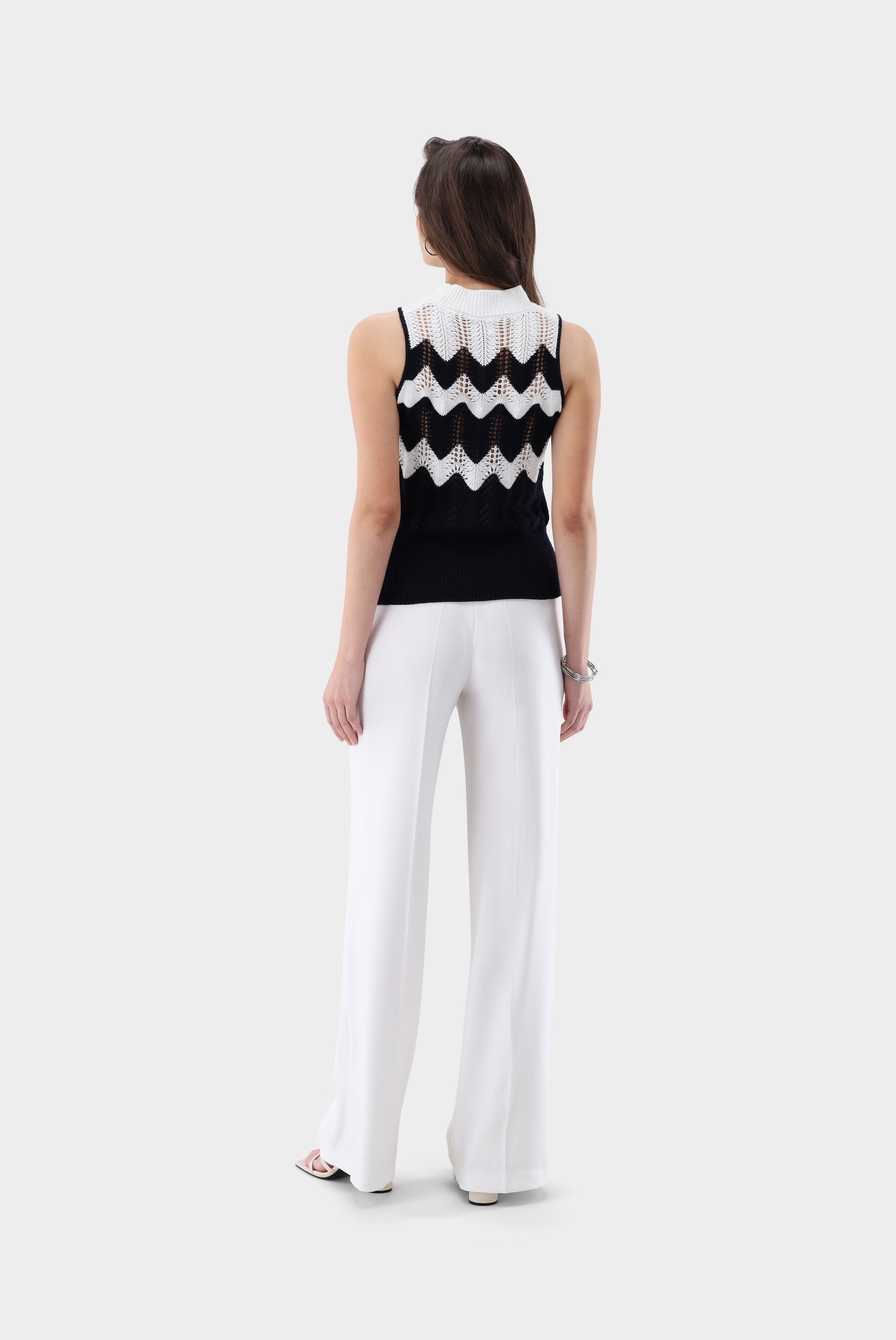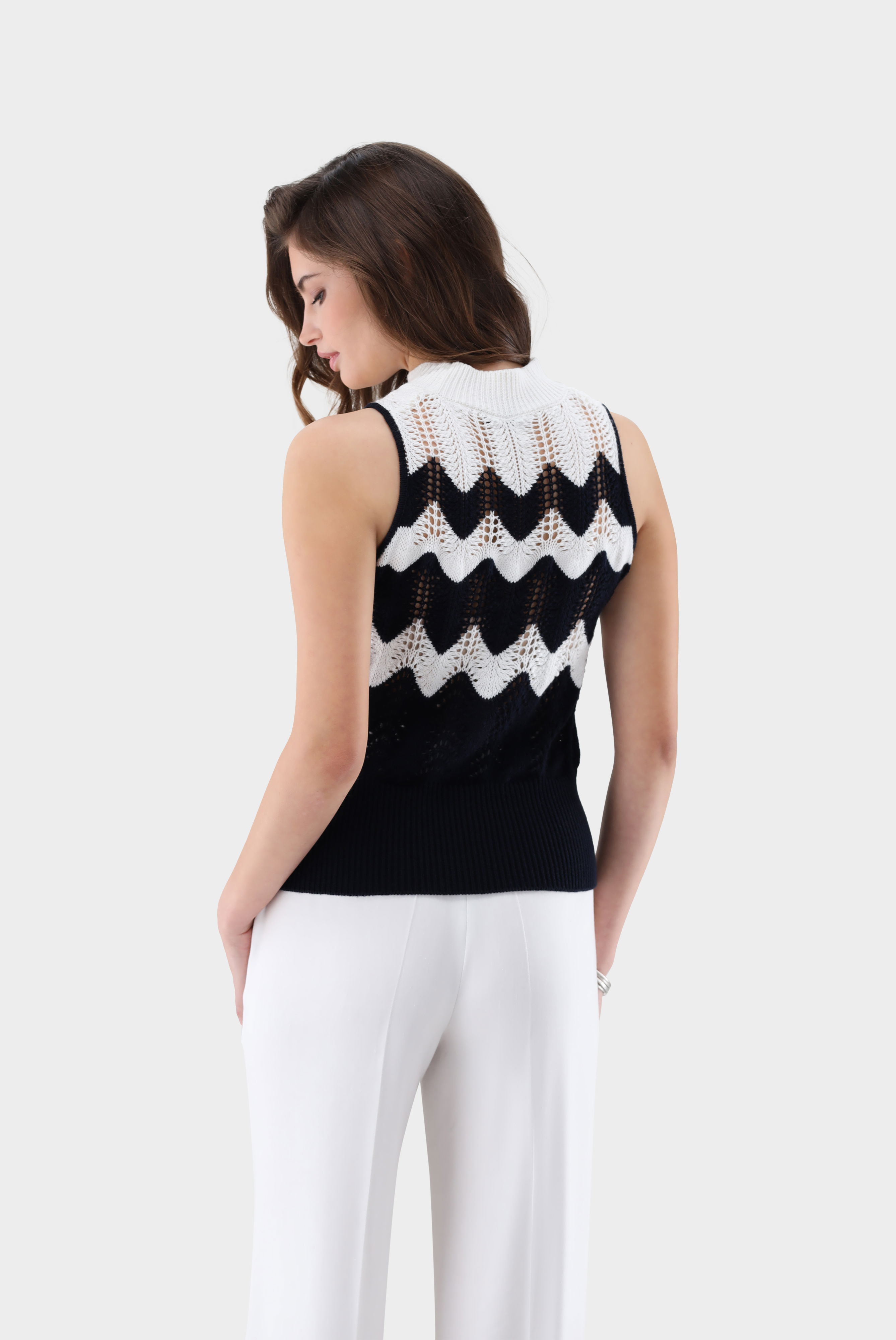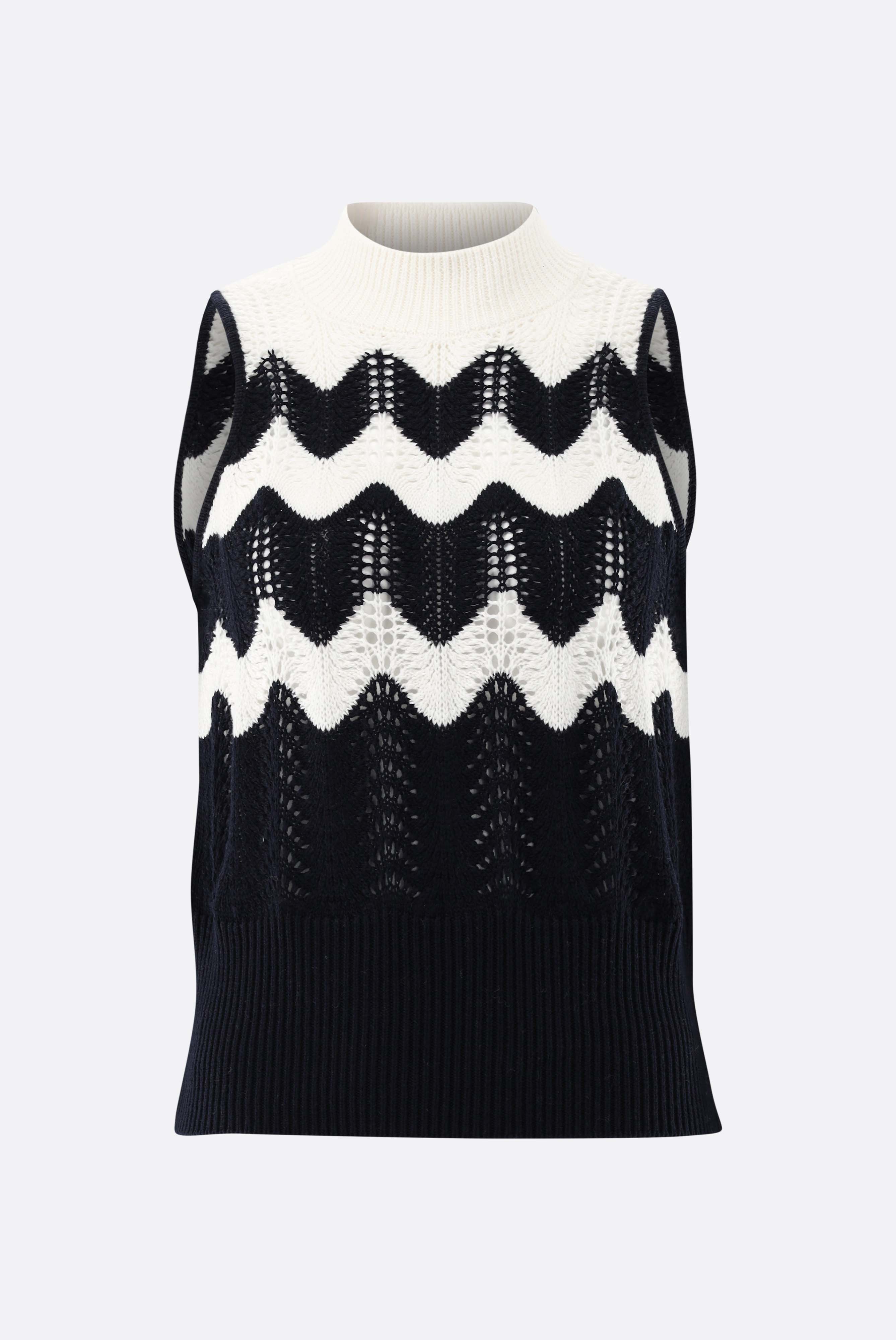 Dieses leicht taillierte Stricktop ohne Ärmel überzeugt durch eine edle Mischung mit Baumwolle und Kaschmir in zweifarbiger Ajour-Strickstruktur. Der Stehkragen verleiht dem Modell eine elegante, moderne Silhouette, während der feine, luftige Strick für angenehmen Tragekomfort sorgt. Dank der hochwertigen Verarbeitung fällt das Top weich und formstabil. Vielseitig kombinierbar eignet es sich ideal für stilvolle Casual- und Smart-Casual-Looks mit femininer, luxuriöser Ausstrahlung.
